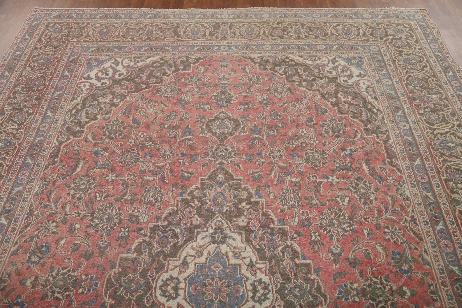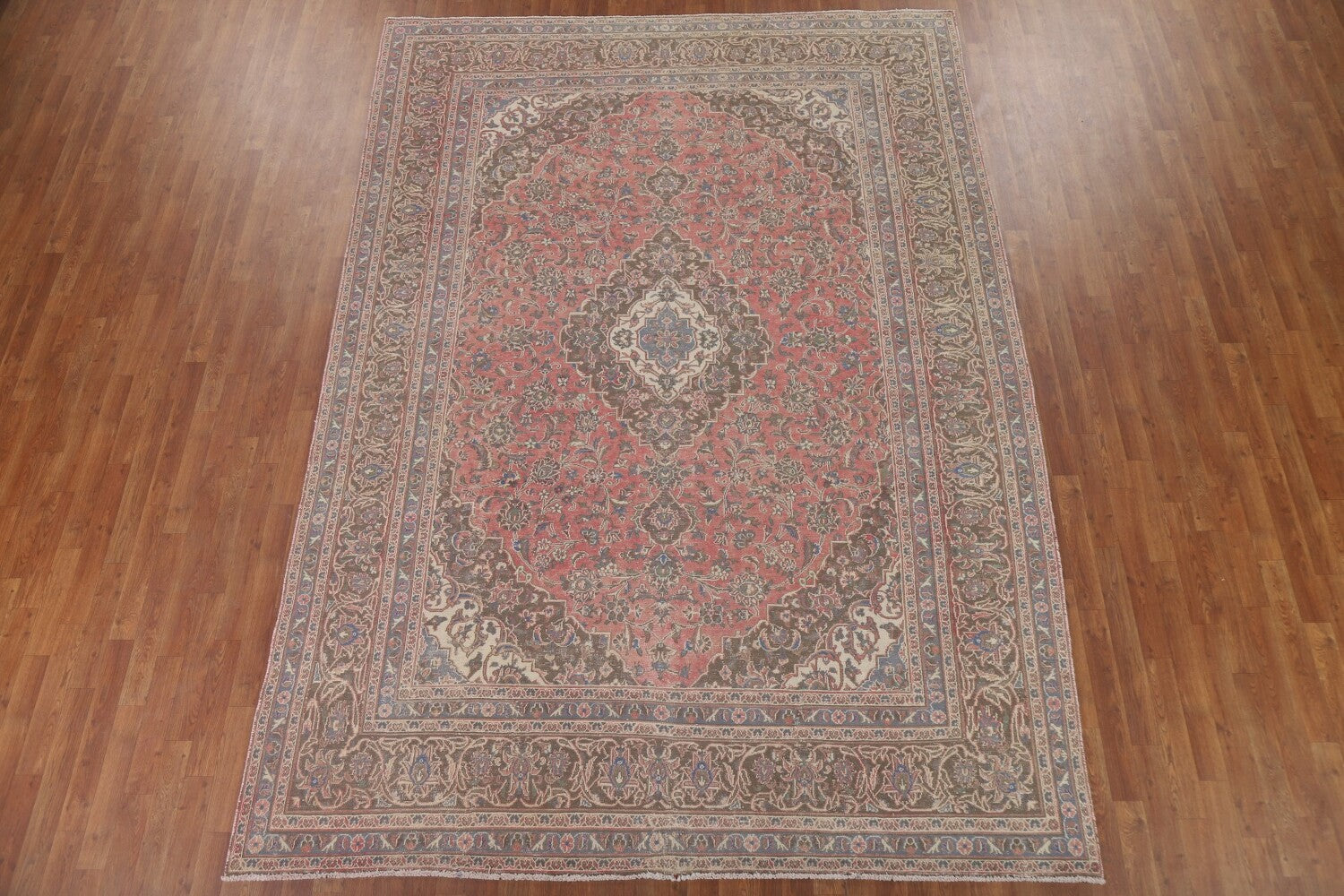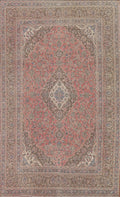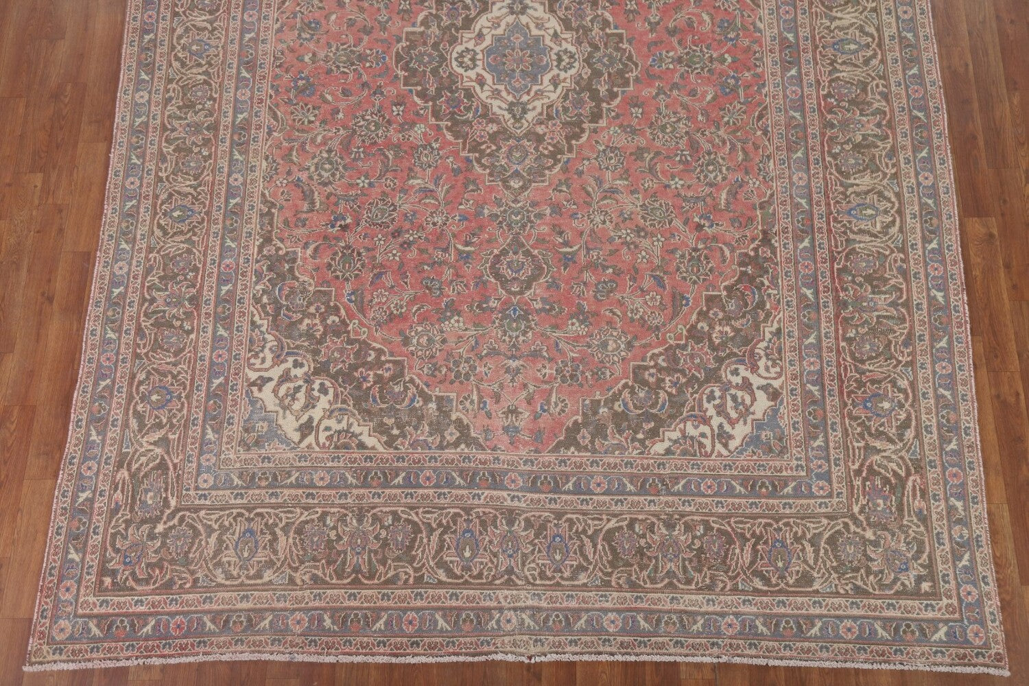 A Beautiful Genuine Persia ( Persia ) Kashan rug is Hand Knotted by skillful weavers in Persia ( Persia ) with 100% Wool Material. This rug is in Very Good (Low Pile) condition. dimensions are 11' 1'' X 7' 9'' in foot and 338 X 236 in centimeter. the primary color is Pink.