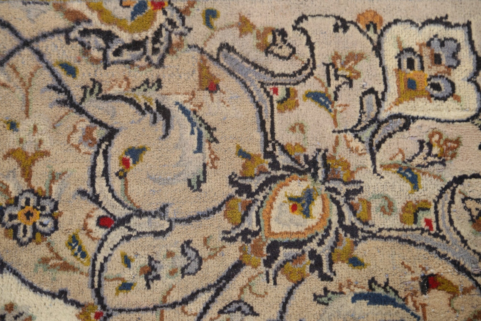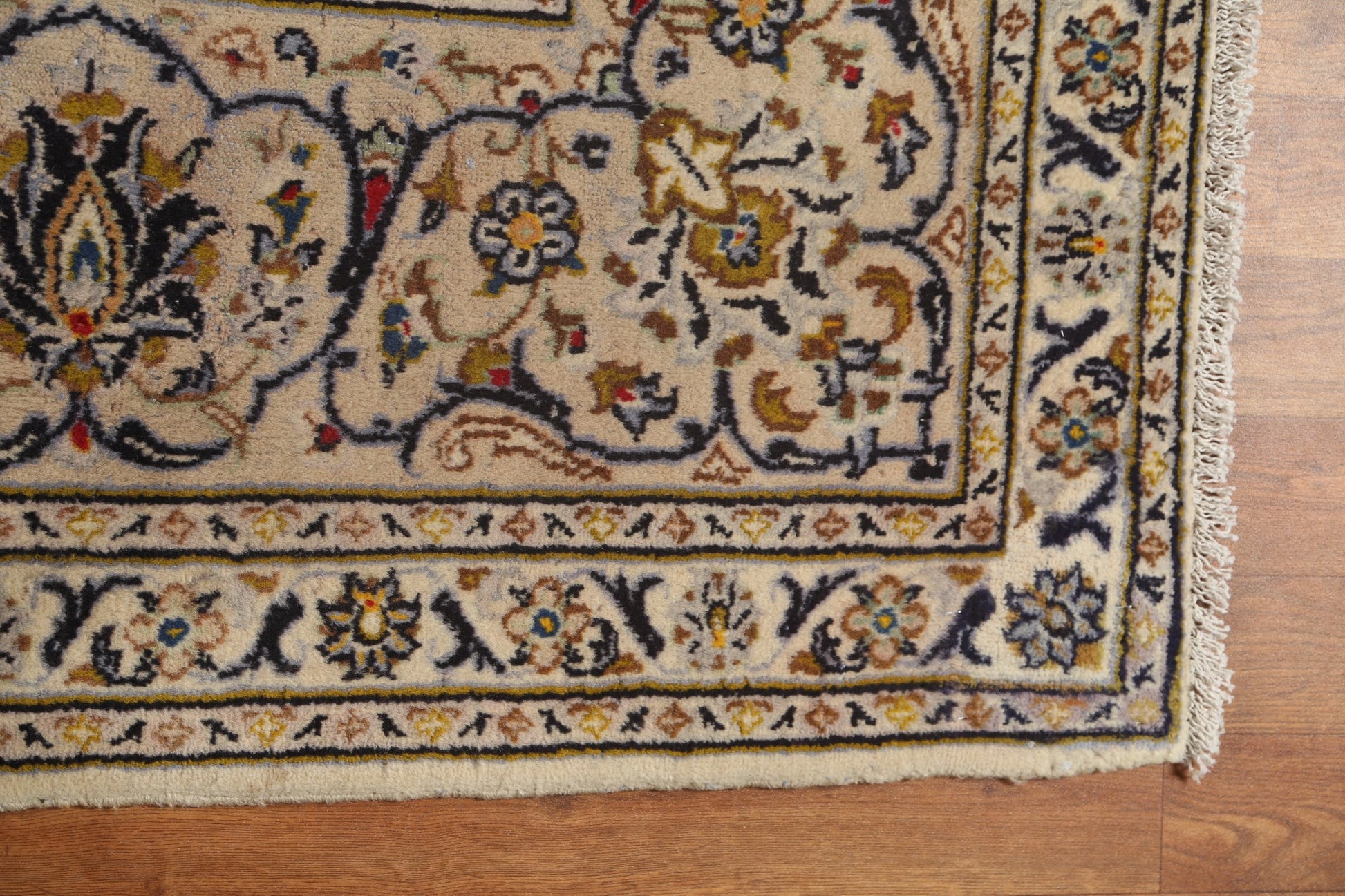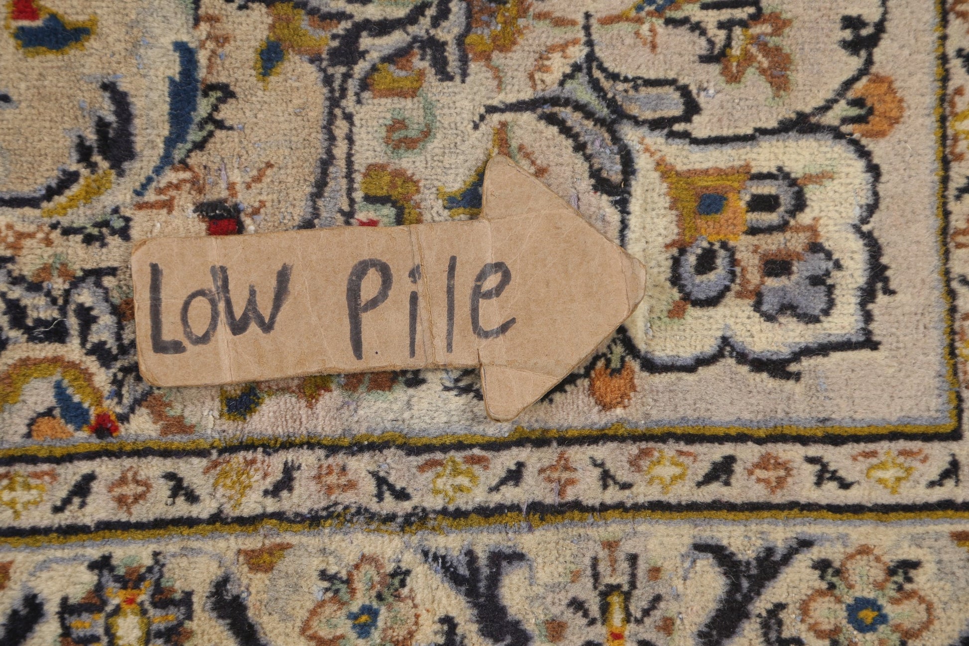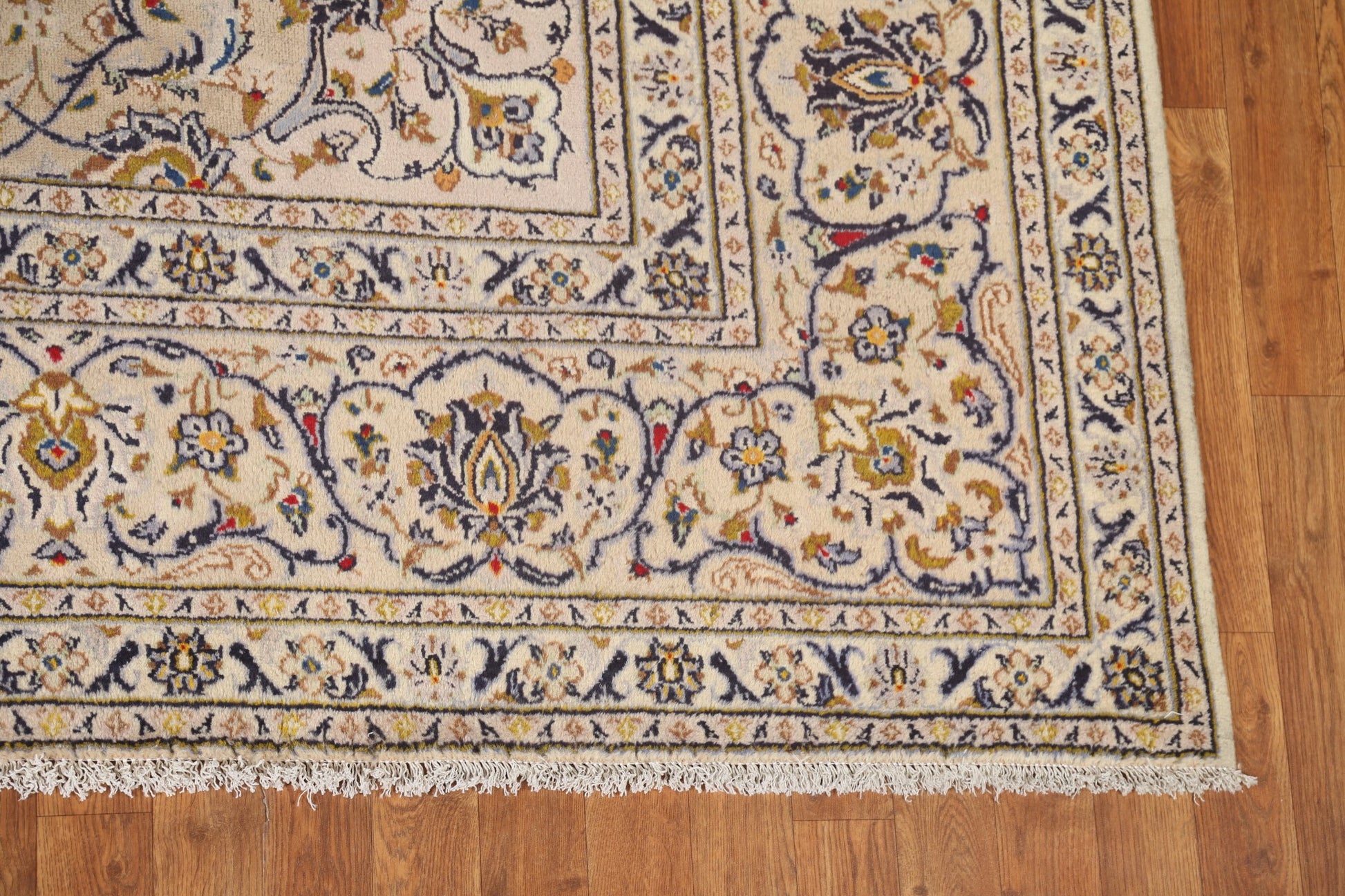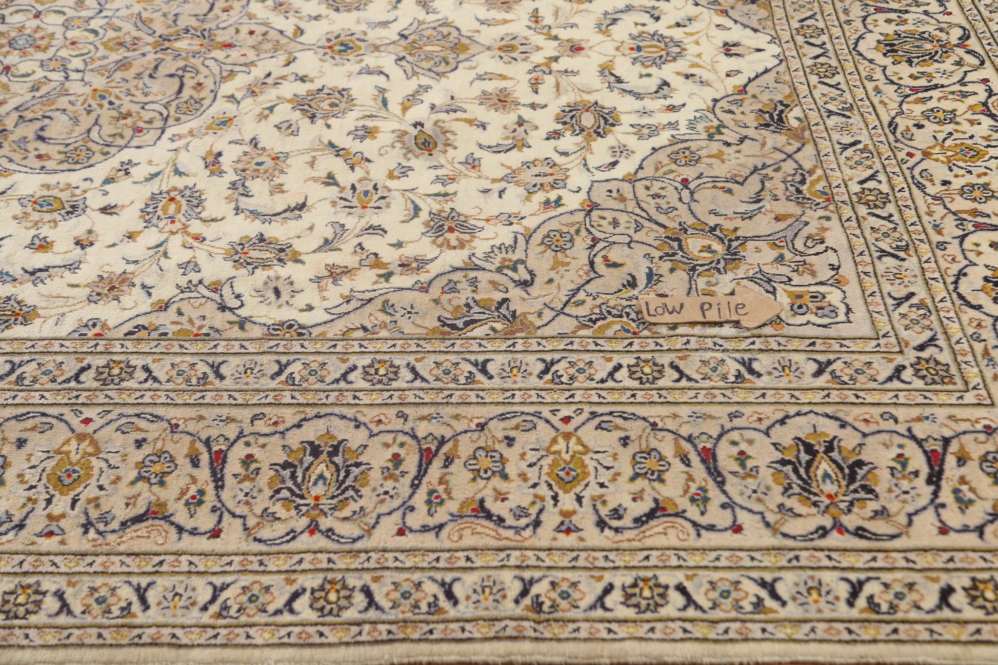 A Beautiful Genuine Persia ( Persia ) Kashan rug is Hand Knotted by skillful weavers in Persia ( Persia ) with 100% Wool Material. This rug is in Very Good ( Low Pile ) condition. dimensions are 11' 4'' X 8' 1'' in foot and 345 X 246 in centimeter. the primary color is Beige & Ivories.