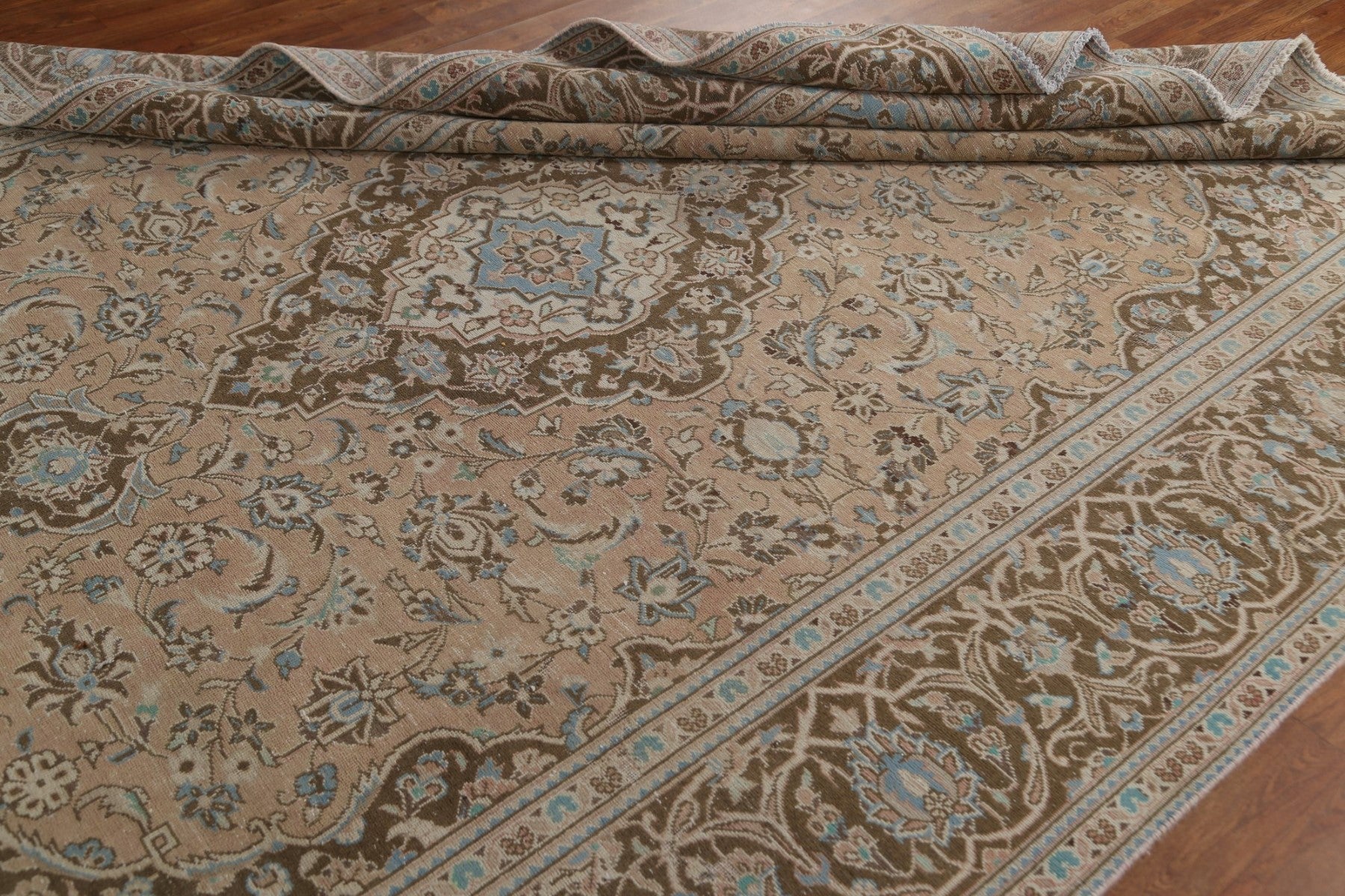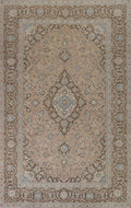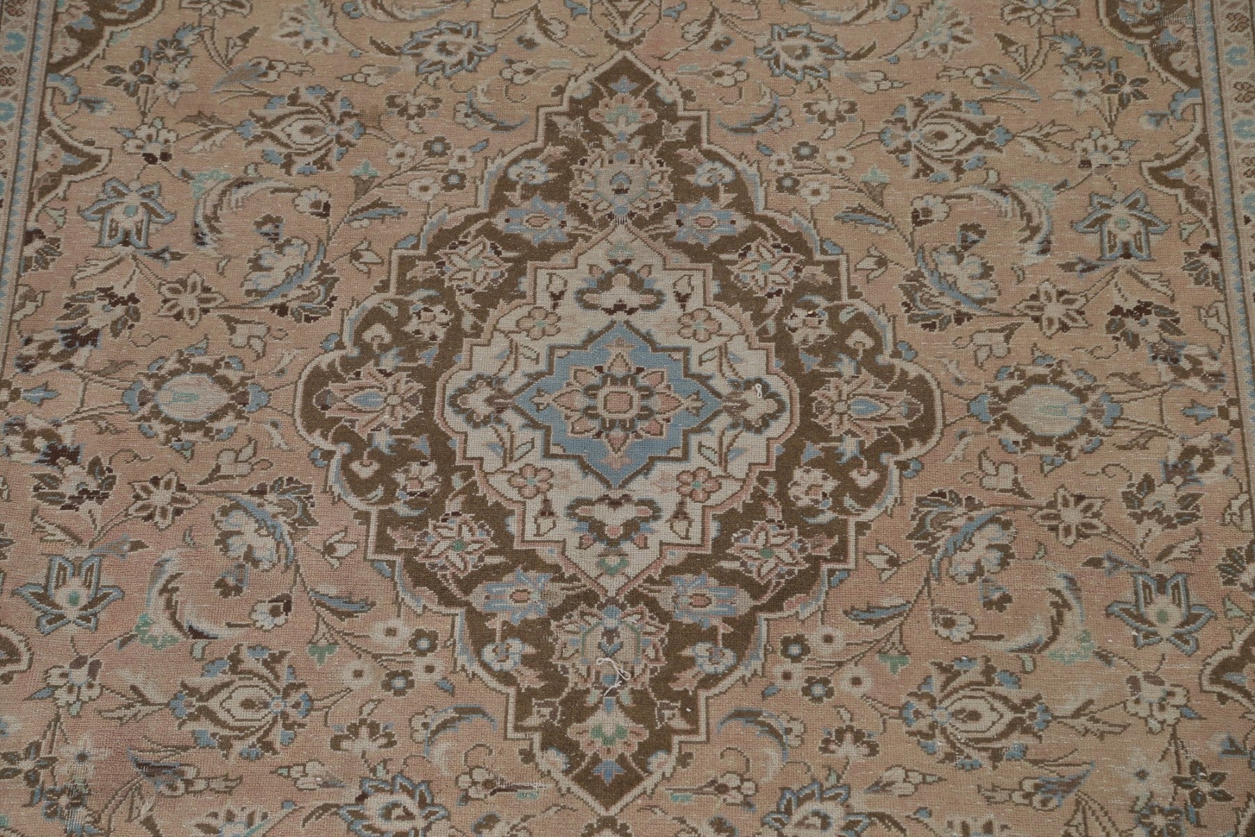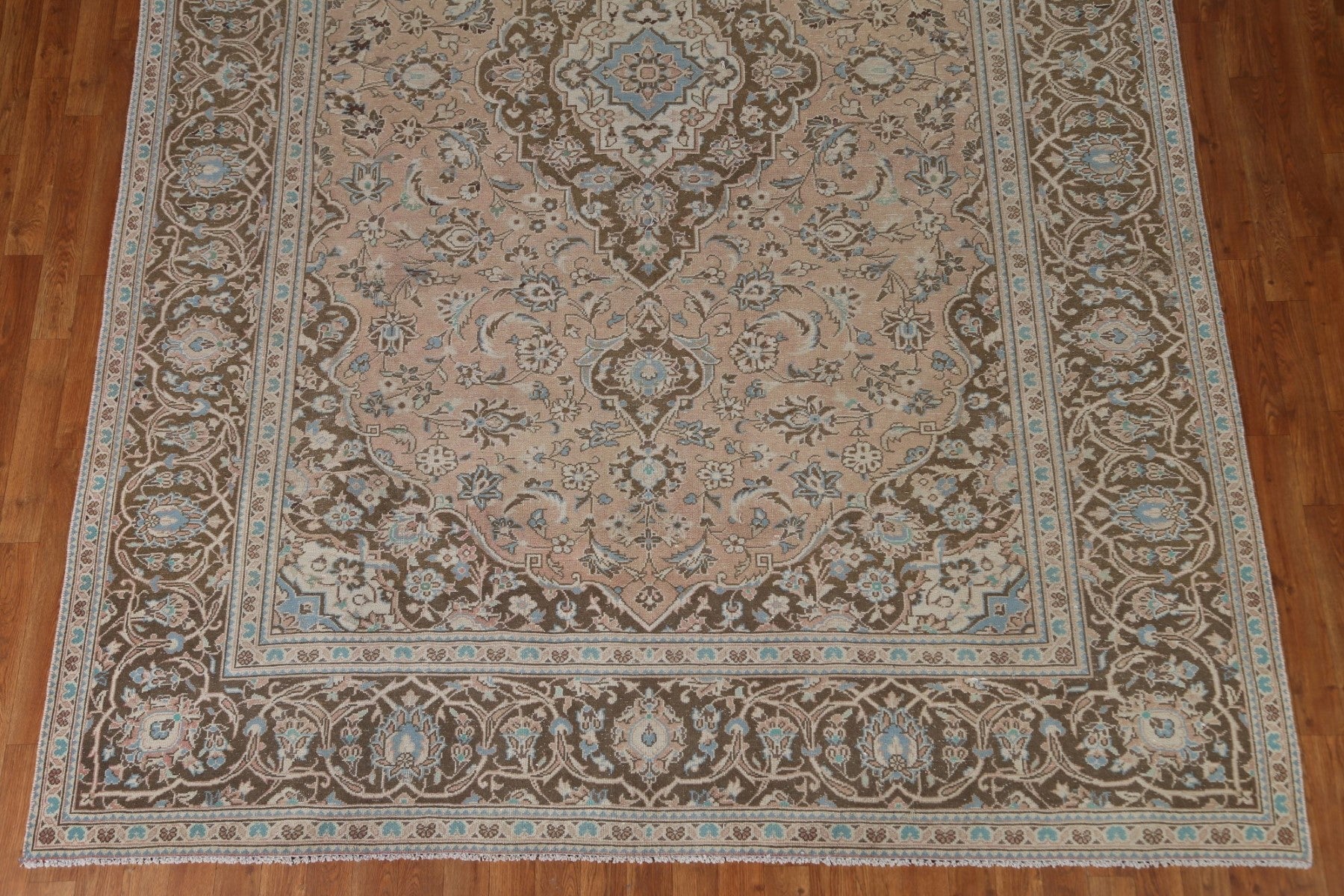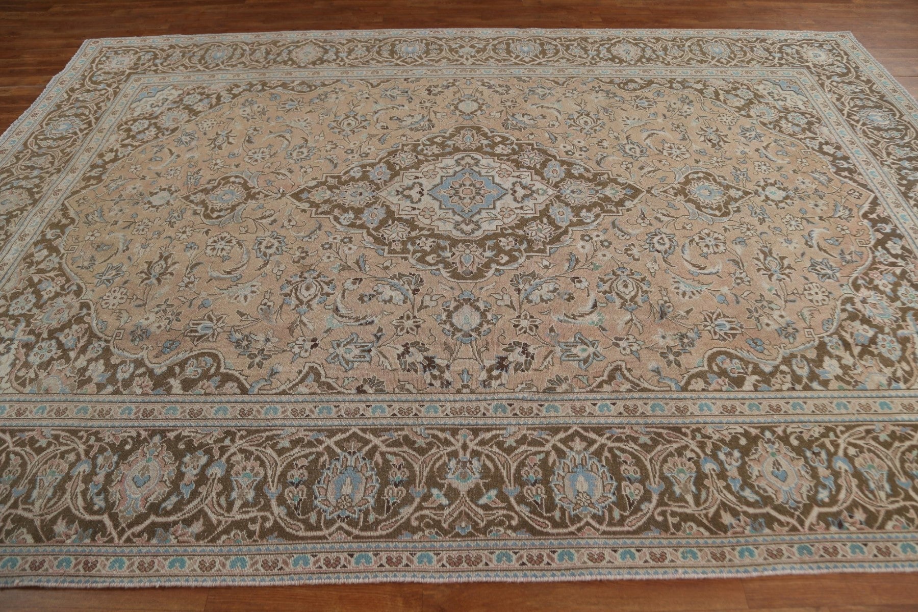 A Beautiful Genuine Persia ( Persia ) Kashan rug is Hand Knotted by skillful weavers in Persia ( Persia ) with 100% Wool Material. This rug is in Very Good (Evenly Low Pile) condition. dimensions are 11' 3'' X 7' 9'' in foot and 343 X 236 in centimeter. the primary color is Peach.