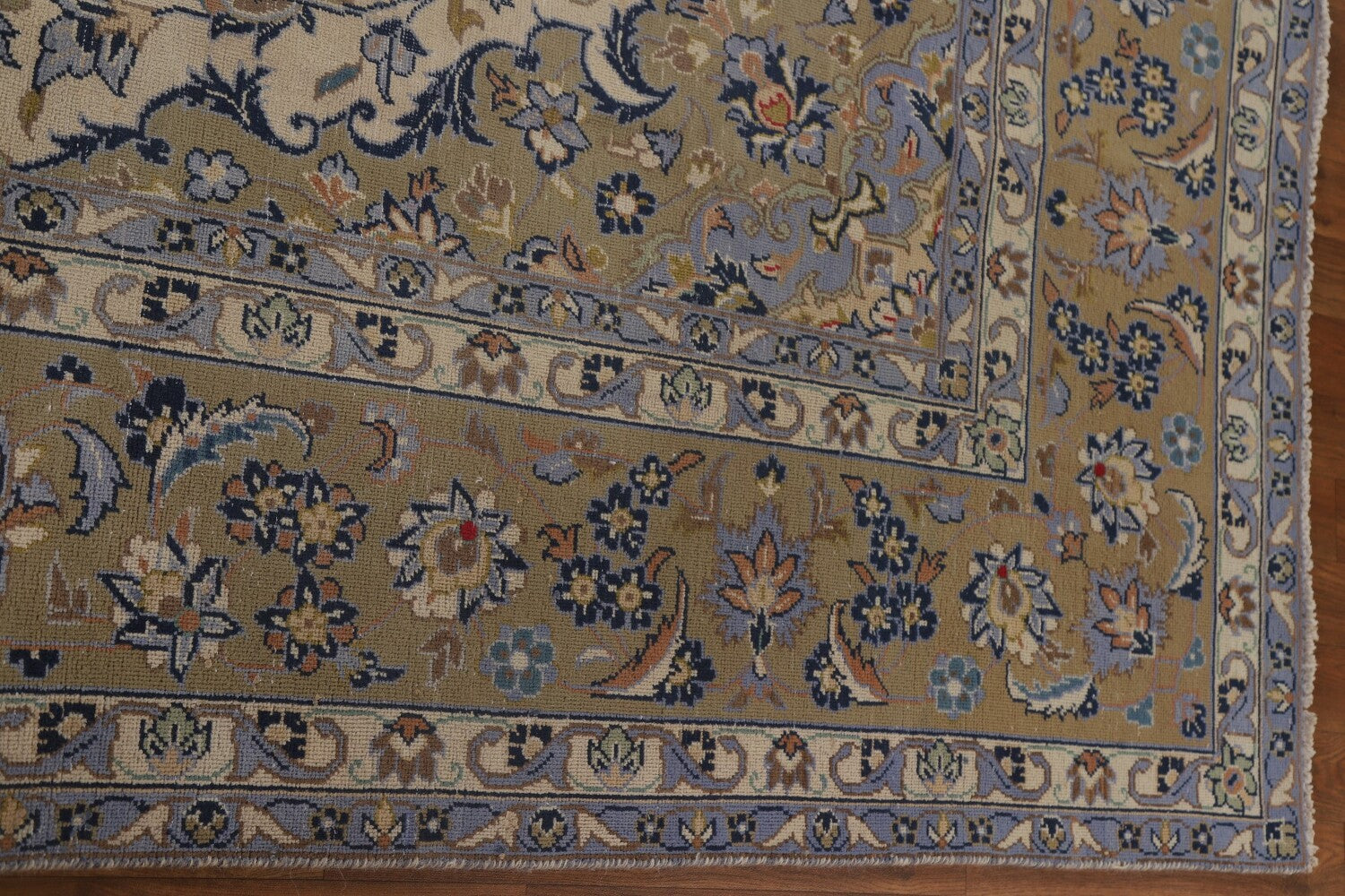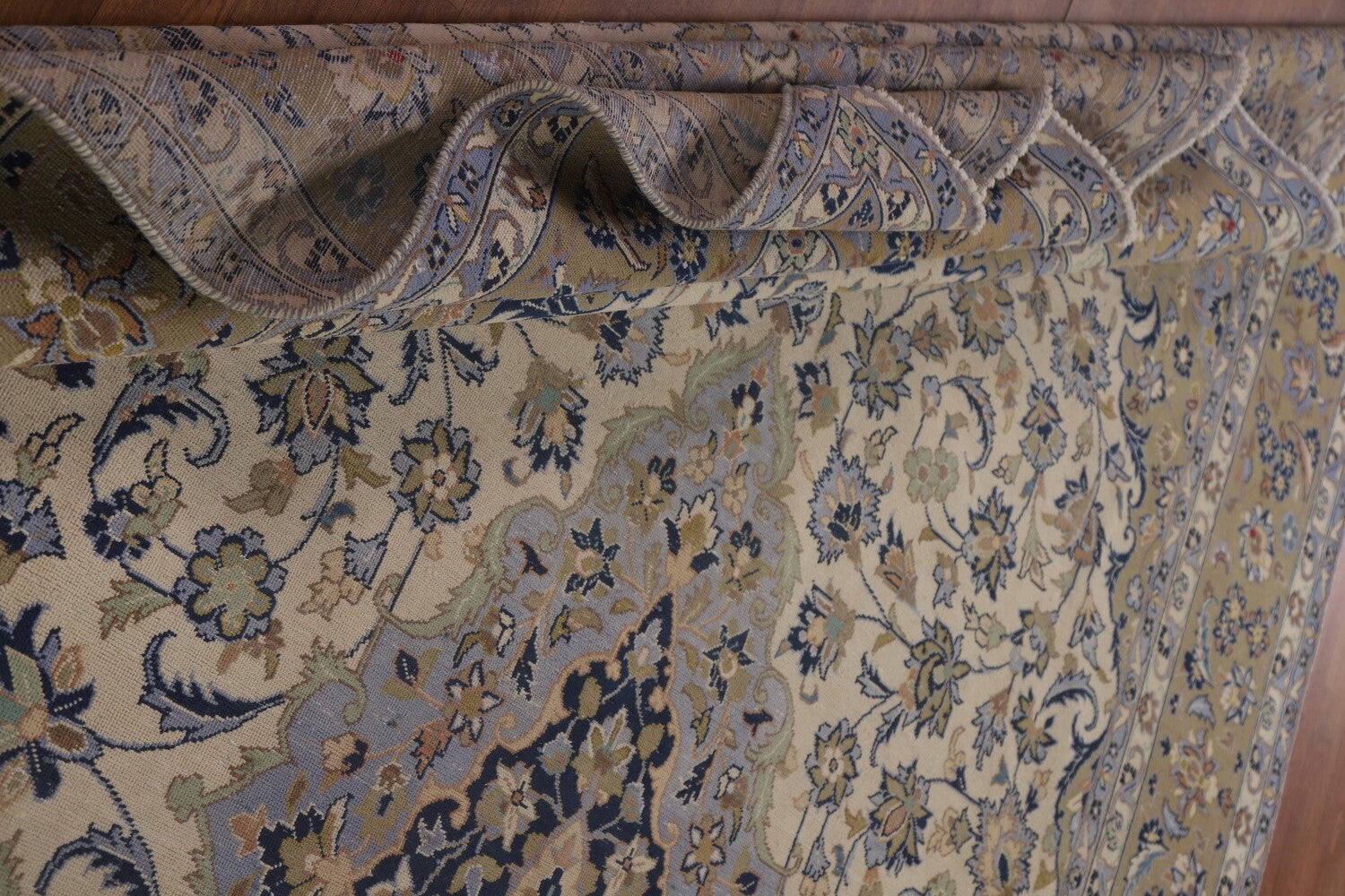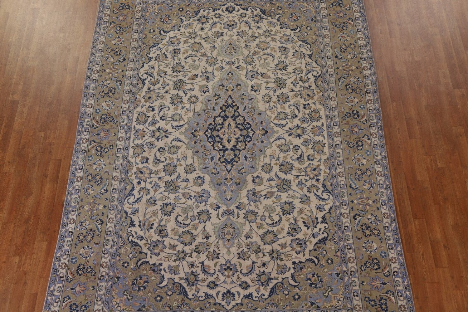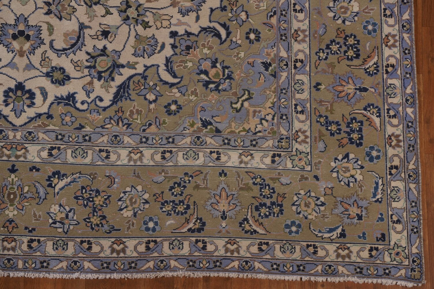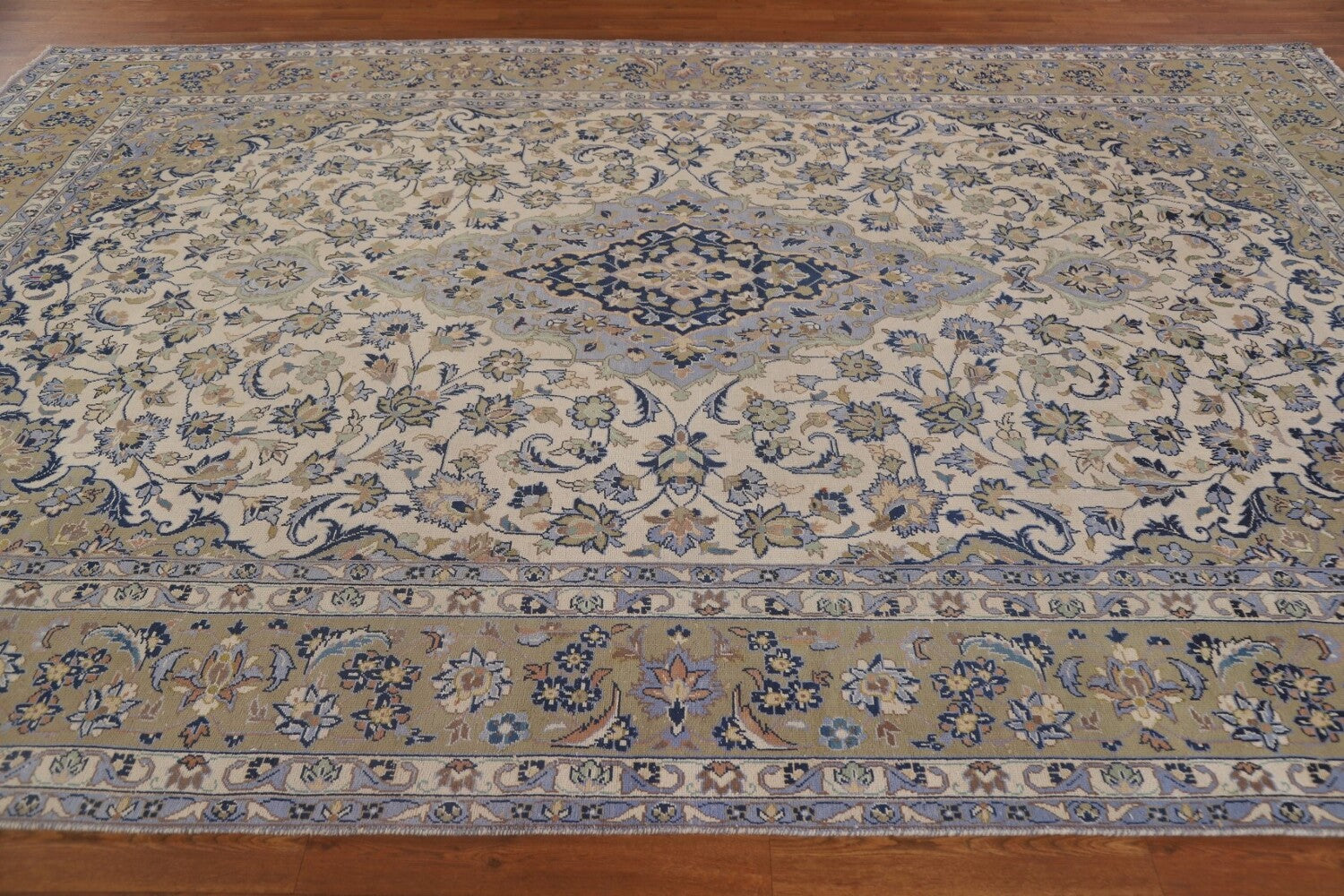 A Beautiful Genuine Persia ( Persia ) Kashan rug is Hand Knotted by skillful weavers in Persia ( Persia ) with 100% Wool Material. This rug is in Very Good (Evenly Low Pile) condition. dimensions are 11' 11'' X 7' 9'' in foot and 363 X 236 in centimeter. the primary color is Beige & Ivories.
