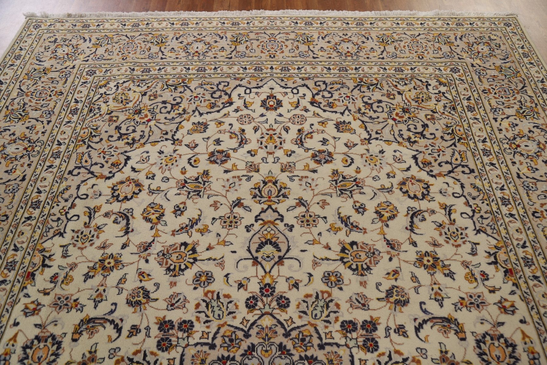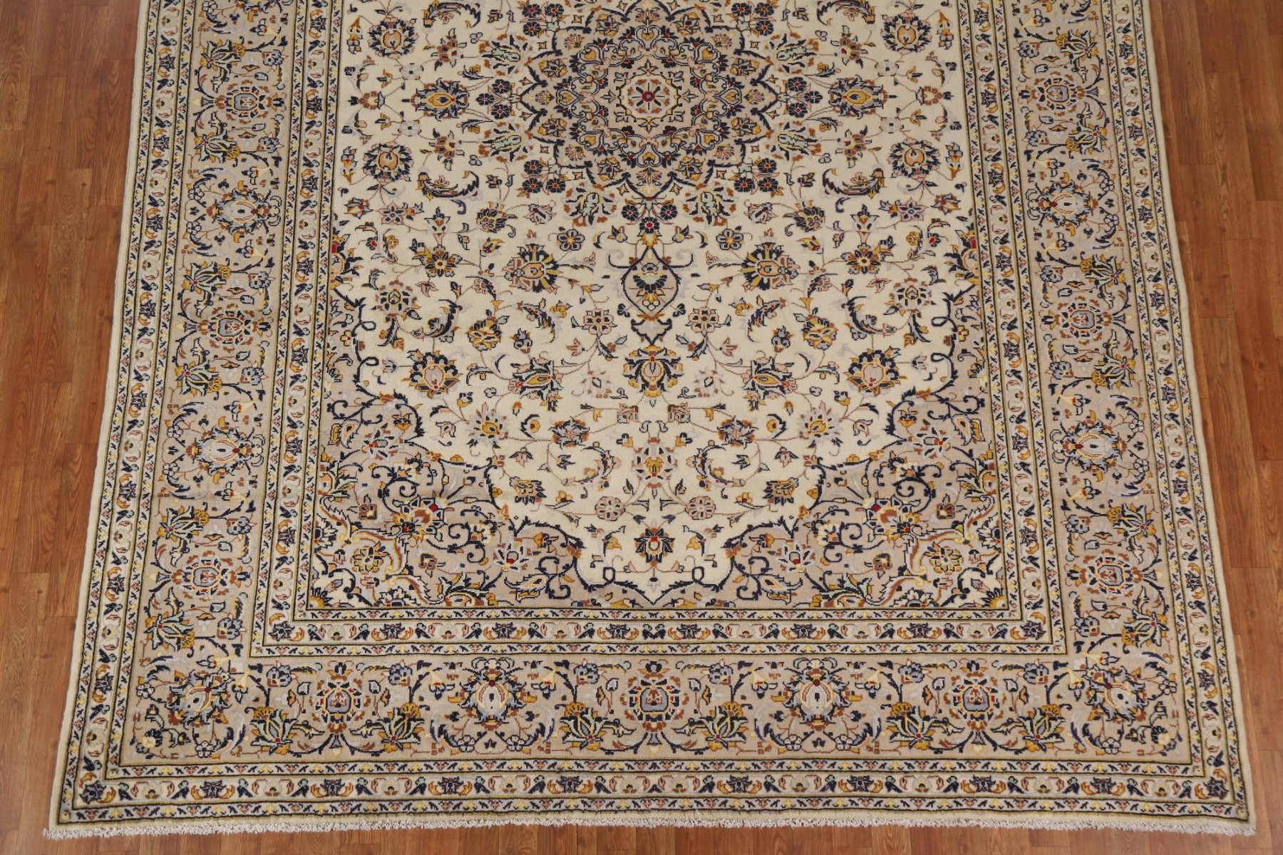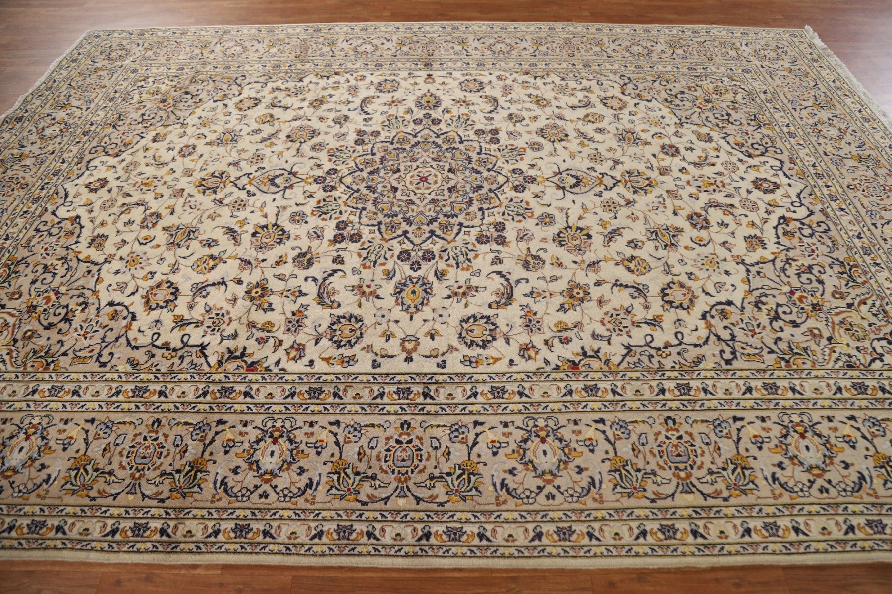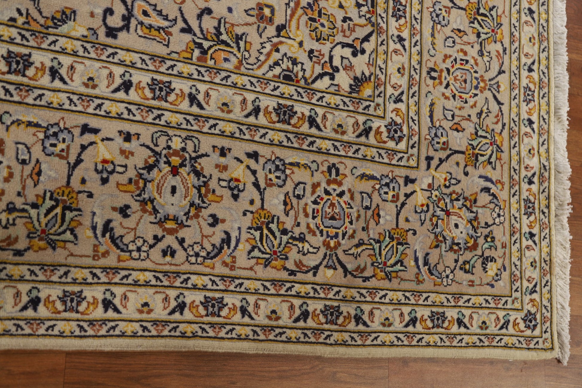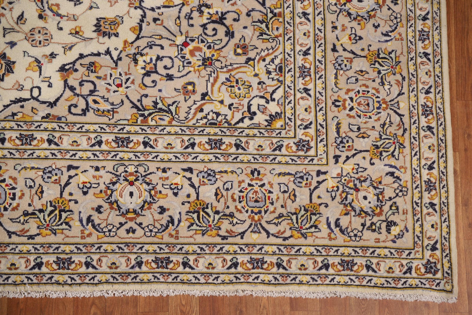 A Beautiful Genuine Persia ( Persia ) Kashan rug is Hand Knotted by skillful weavers in Persia ( Persia ) with 100% Wool Material. This rug is in Very Good condition. dimensions are 11' 9'' X 8' 4'' in foot and 358 X 254 in centimeter. the primary color is Beige & Ivories.