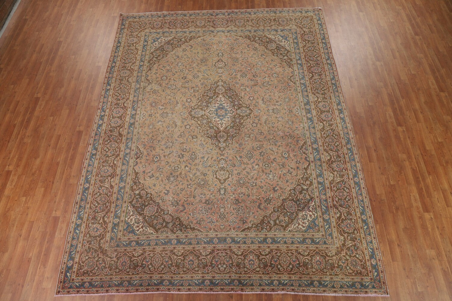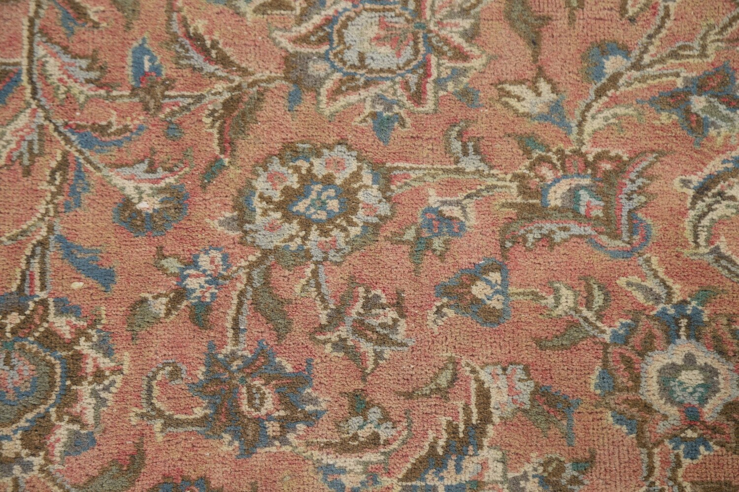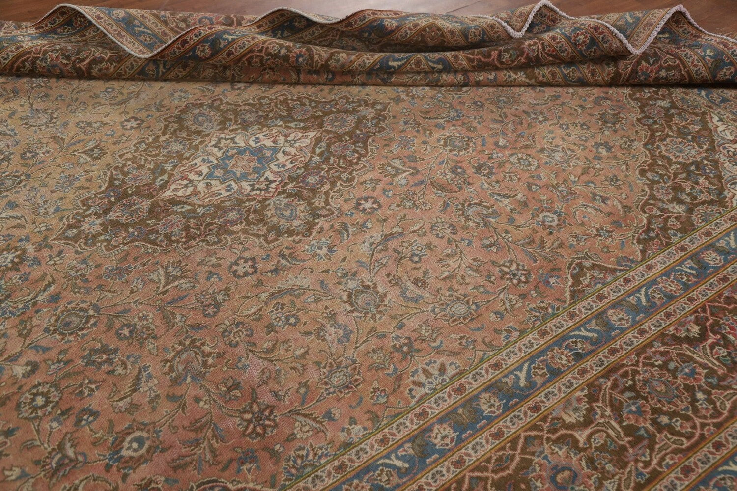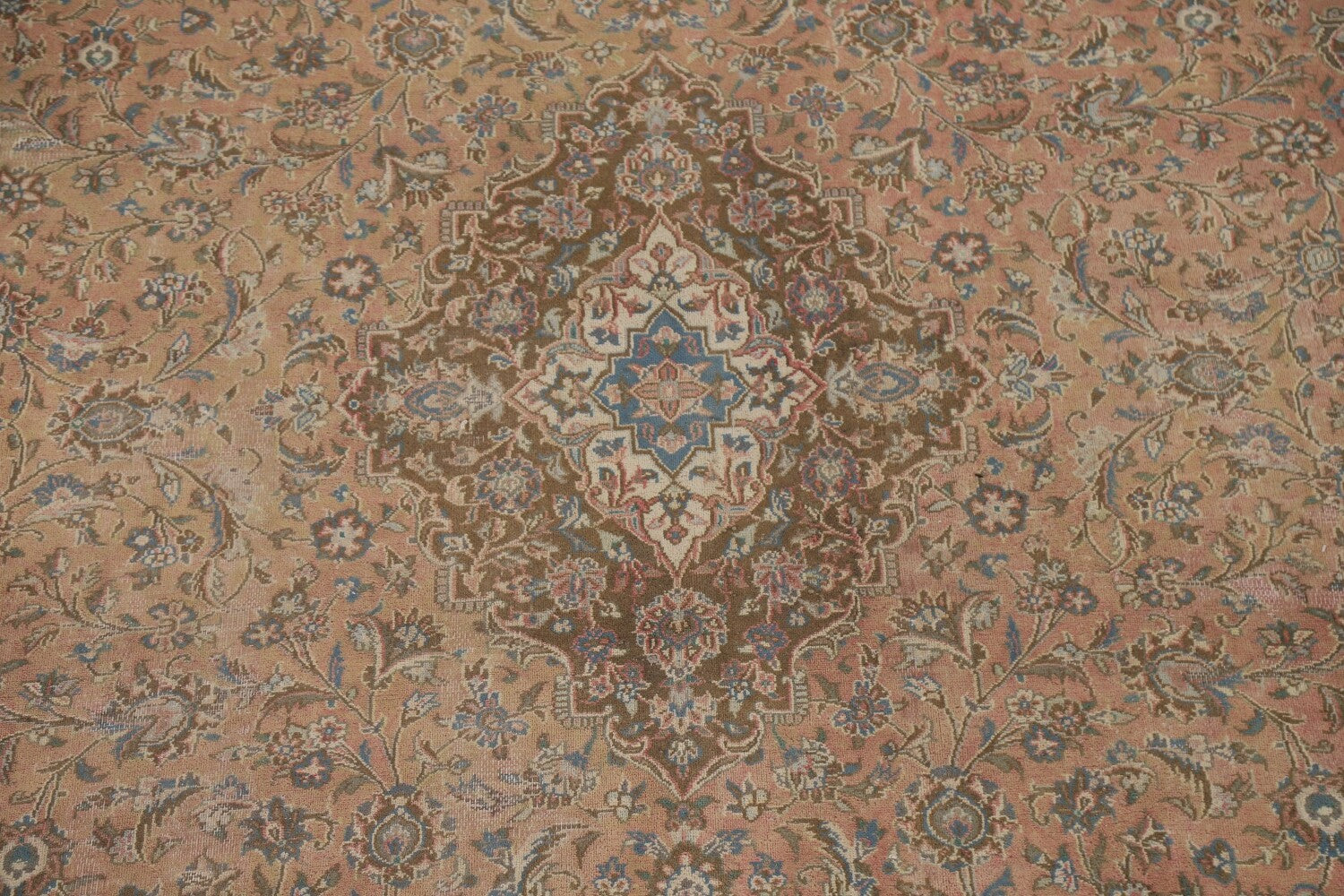 A Beautiful Genuine Persia ( Persia ) Kashan rug is Hand Knotted by skillful weavers in Persia ( Persia ) with 100% Wool Material. This rug is in Very Good (Low Pile) condition. dimensions are 12' 3'' X 9' 5'' in foot and 373 X 287 in centimeter. the primary color is Pink.