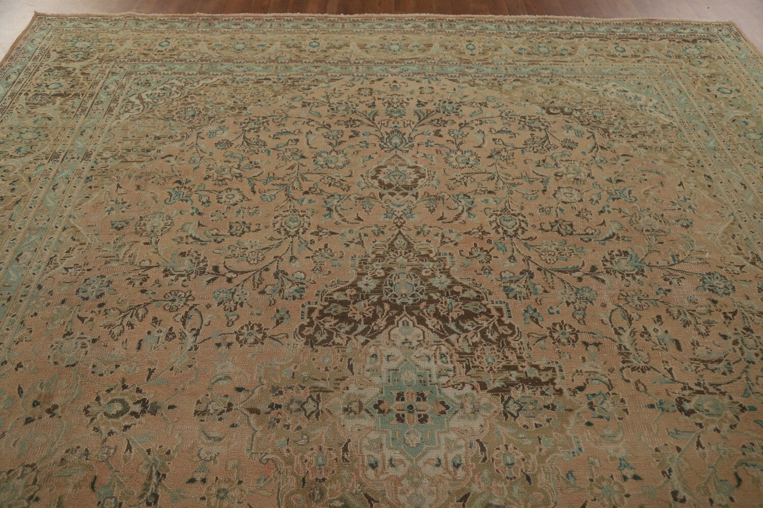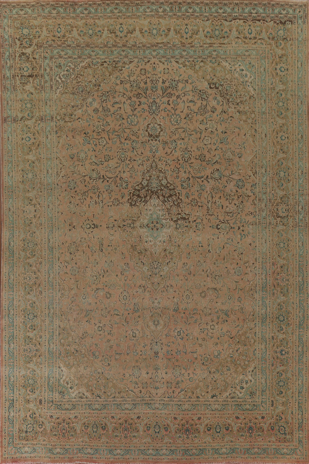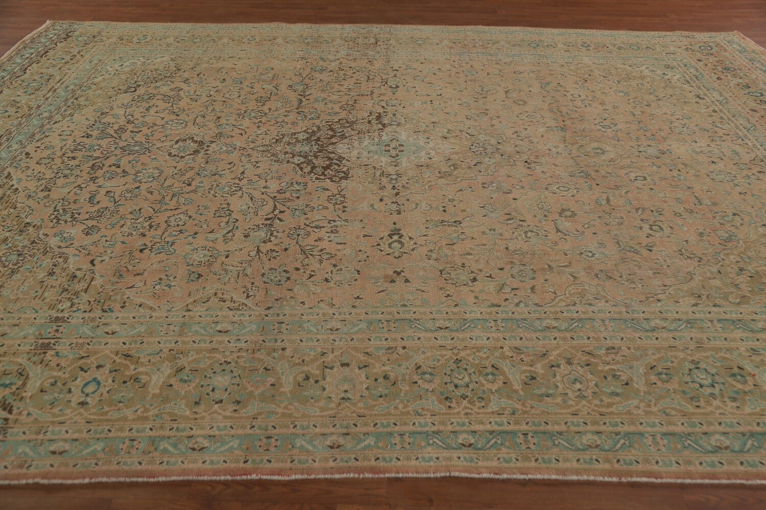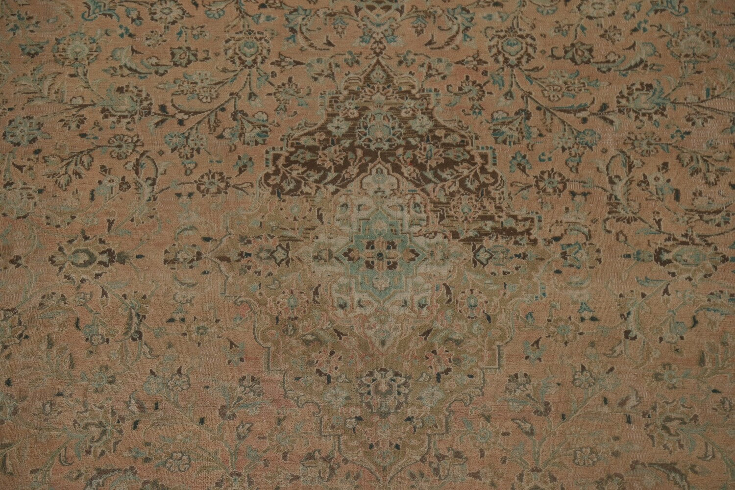 A Beautiful Genuine Persia ( Persia ) Kashan rug is Hand Knotted by skillful weavers in Persia ( Persia ) with 100% Wool Material. This rug is in Very Good (Low Pile-Abrash) condition. dimensions are 12' 5'' X 9' 5'' in foot and 378 X 287 in centimeter. the primary color is Peach.