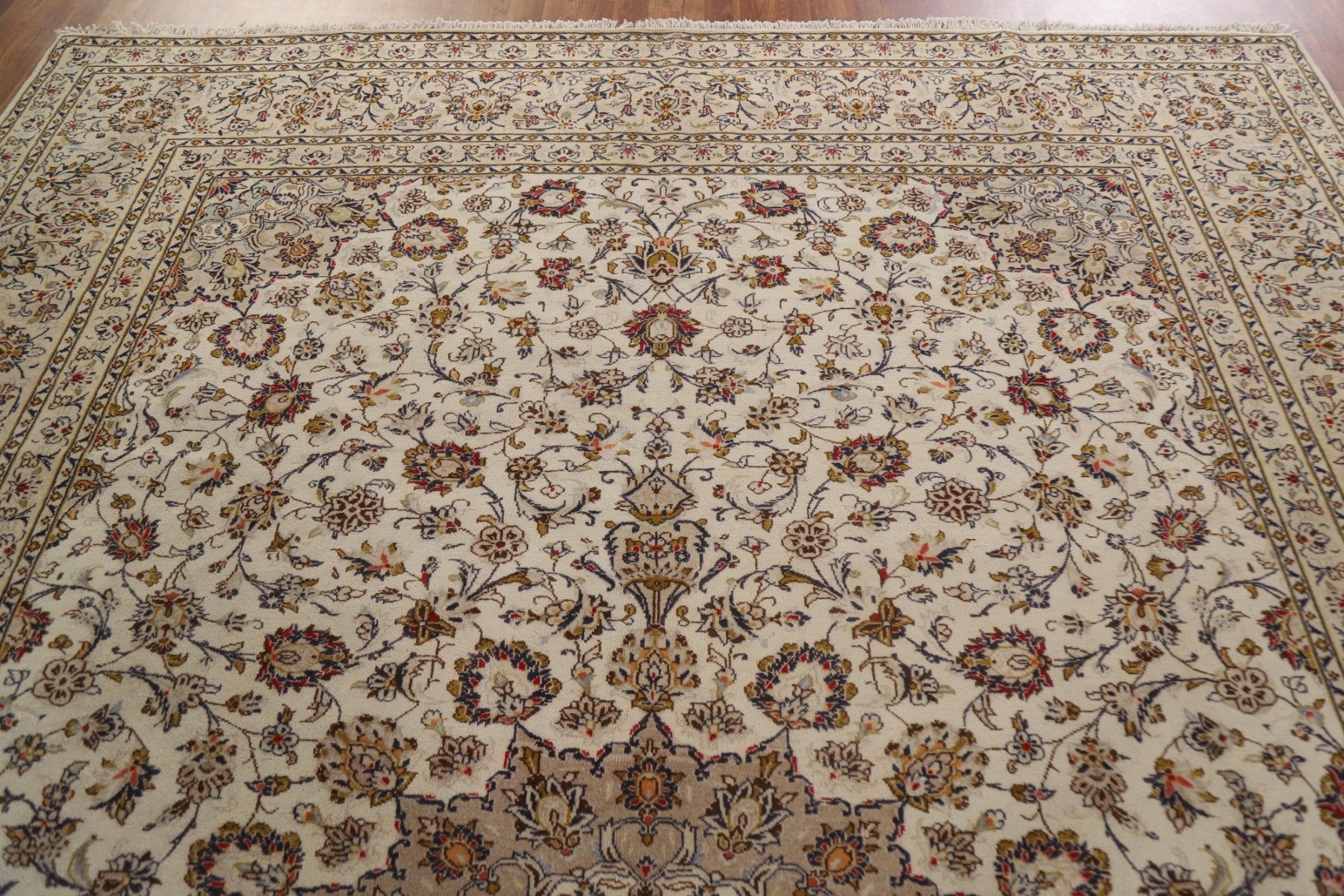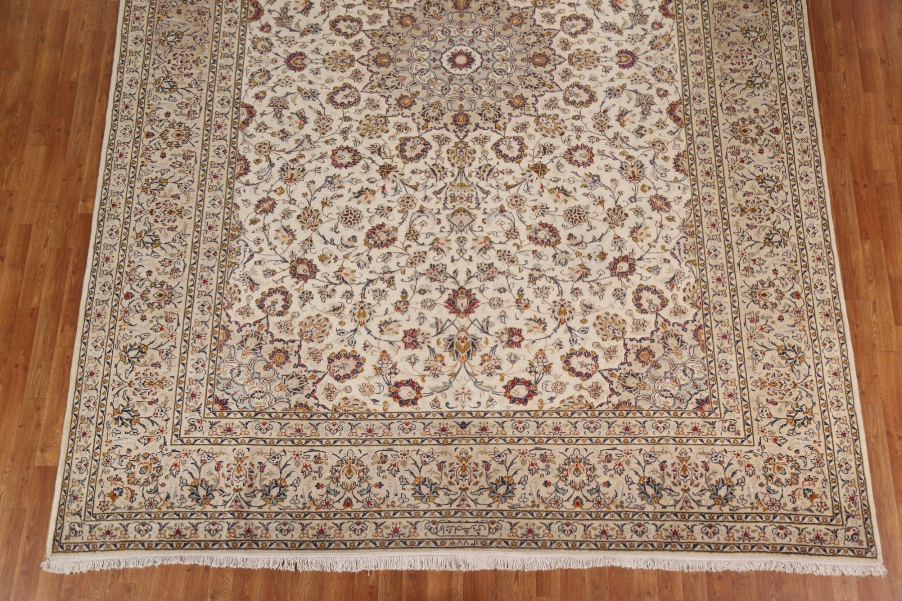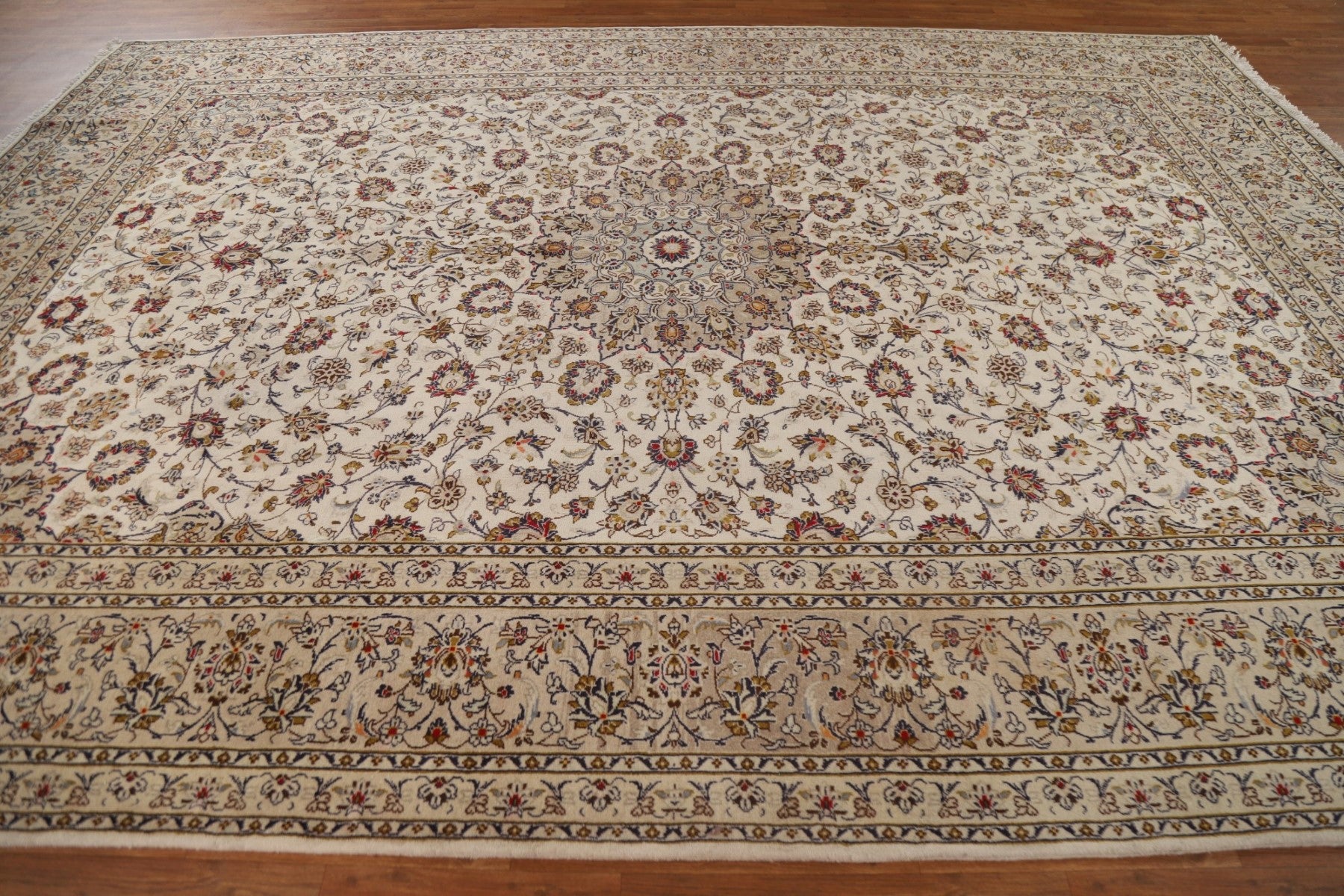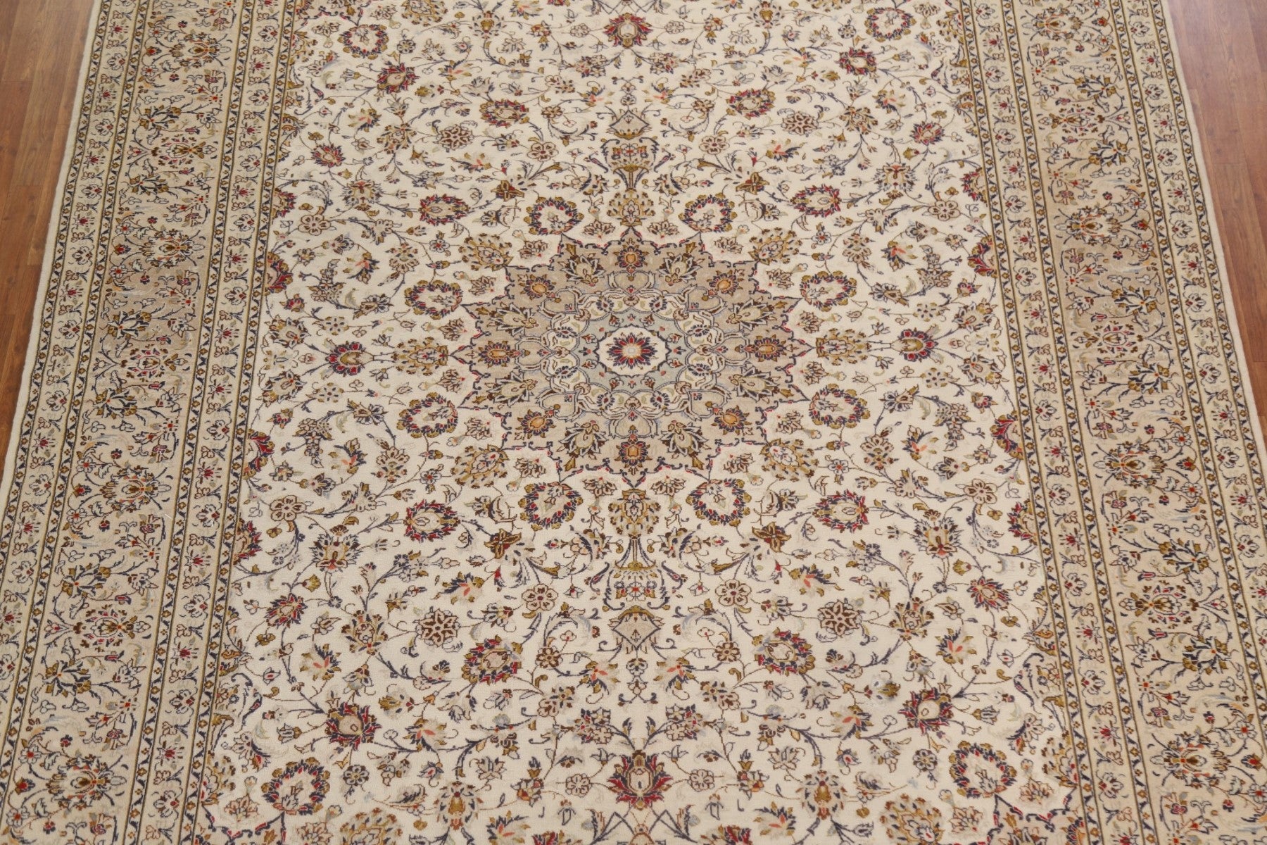 A Beautiful Genuine Persia ( Persia ) Kashan rug is Hand Knotted by skillful weavers in Persia ( Persia ) with 100% Wool Material. This rug is in Very Good condition. dimensions are 13' 1'' X 9' 5'' in foot and 399 X 287 in centimeter. the primary color is Beige & Ivories.