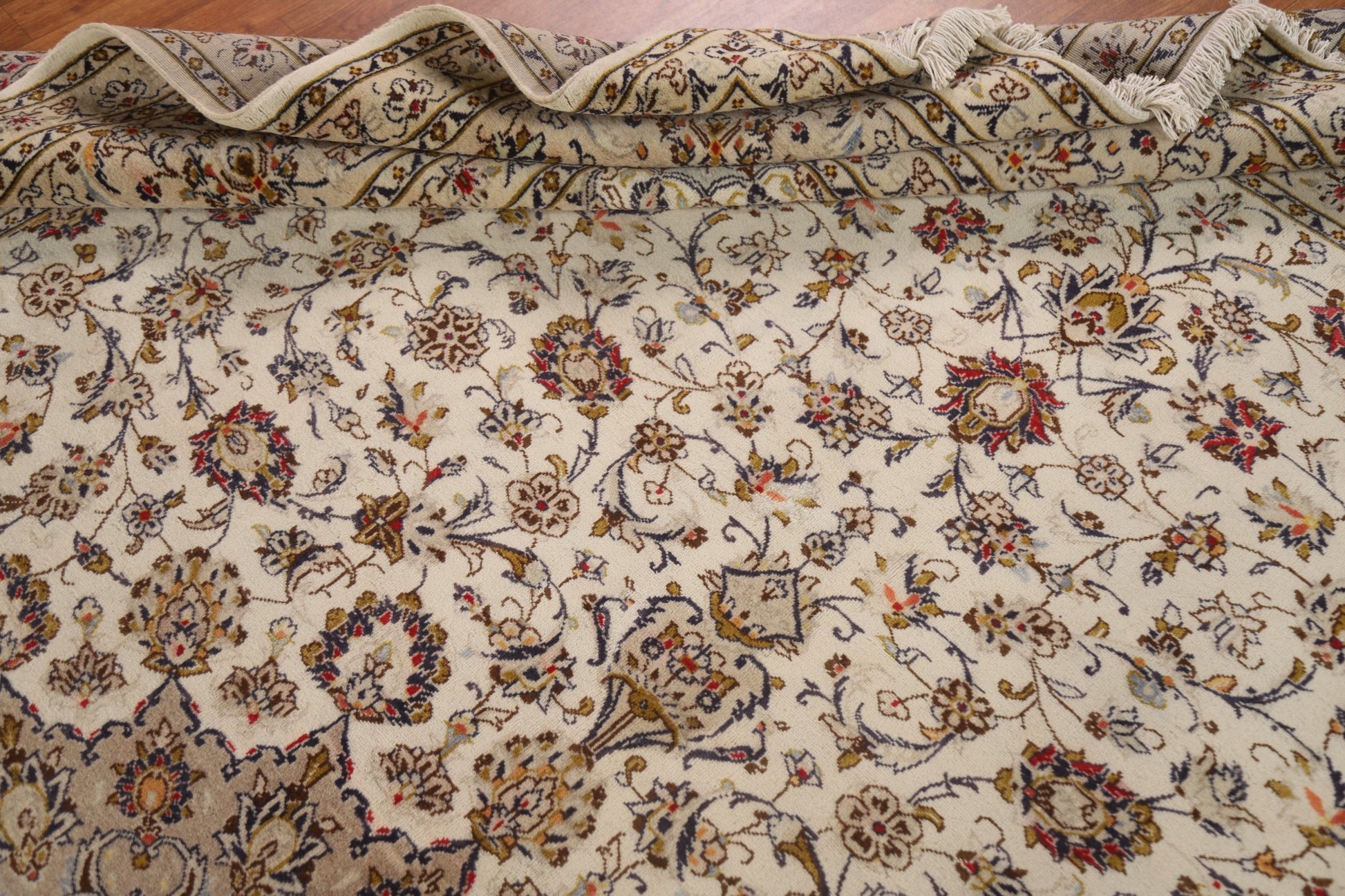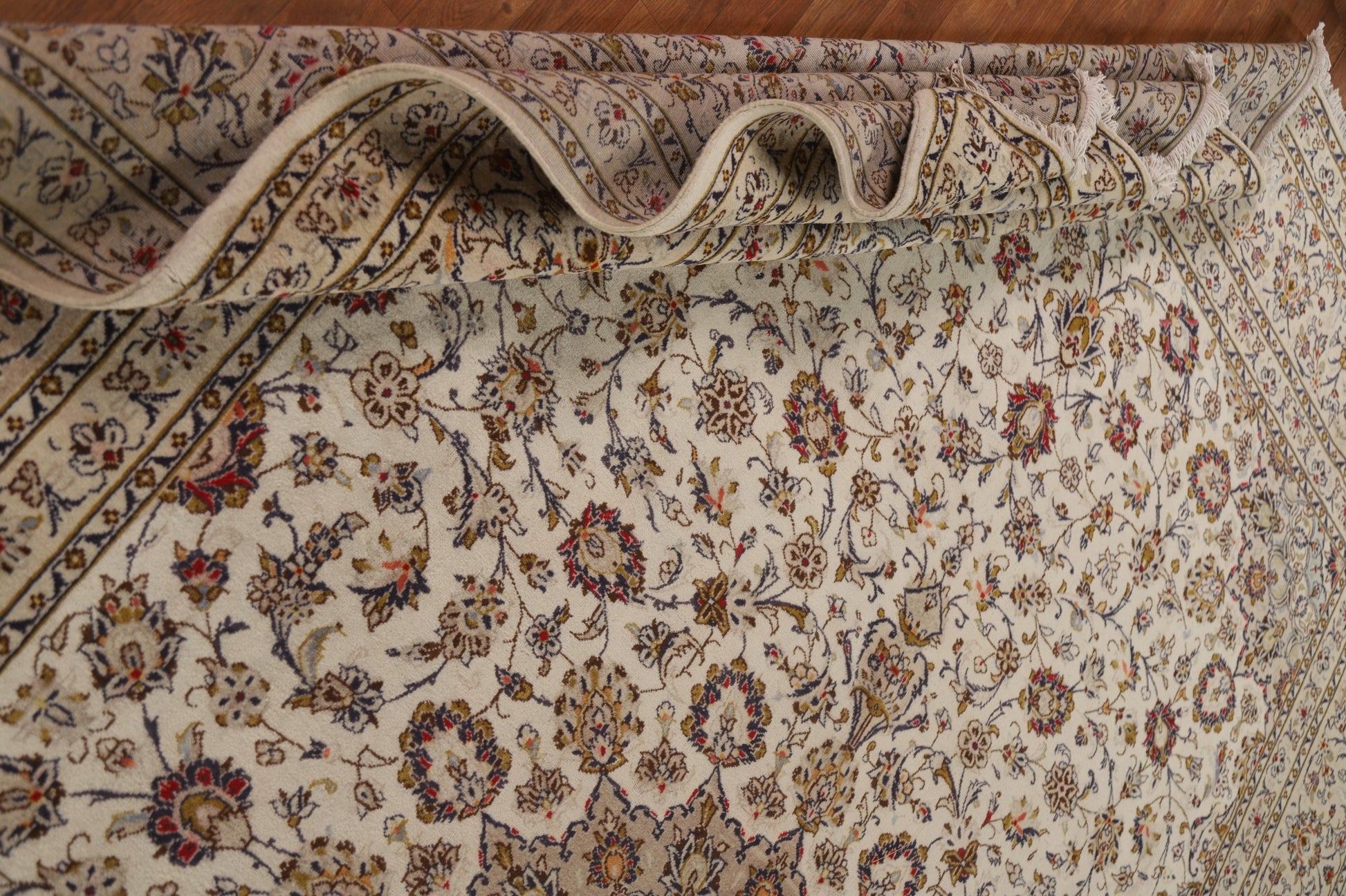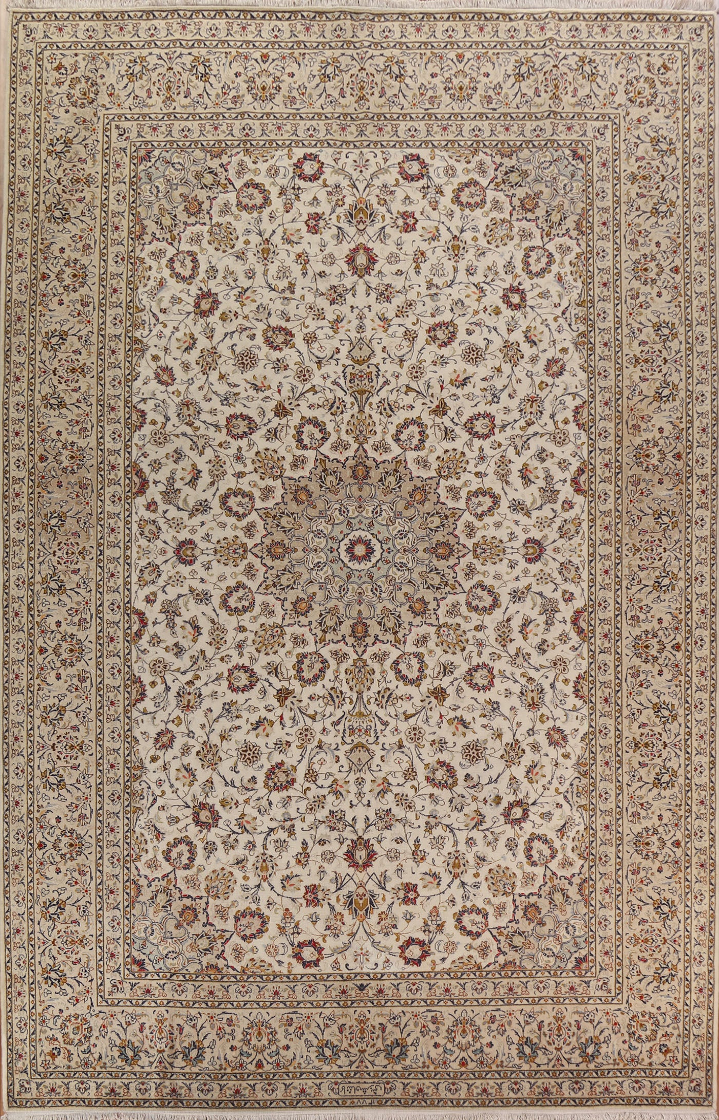 A Beautiful Genuine Persia ( Persia ) Kashan rug is Hand Knotted by skillful weavers in Persia ( Persia ) with 100% Wool Material. This rug is in Very Good condition. dimensions are 13' 1'' X 9' 5'' in foot and 399 X 287 in centimeter. the primary color is Beige & Ivories.