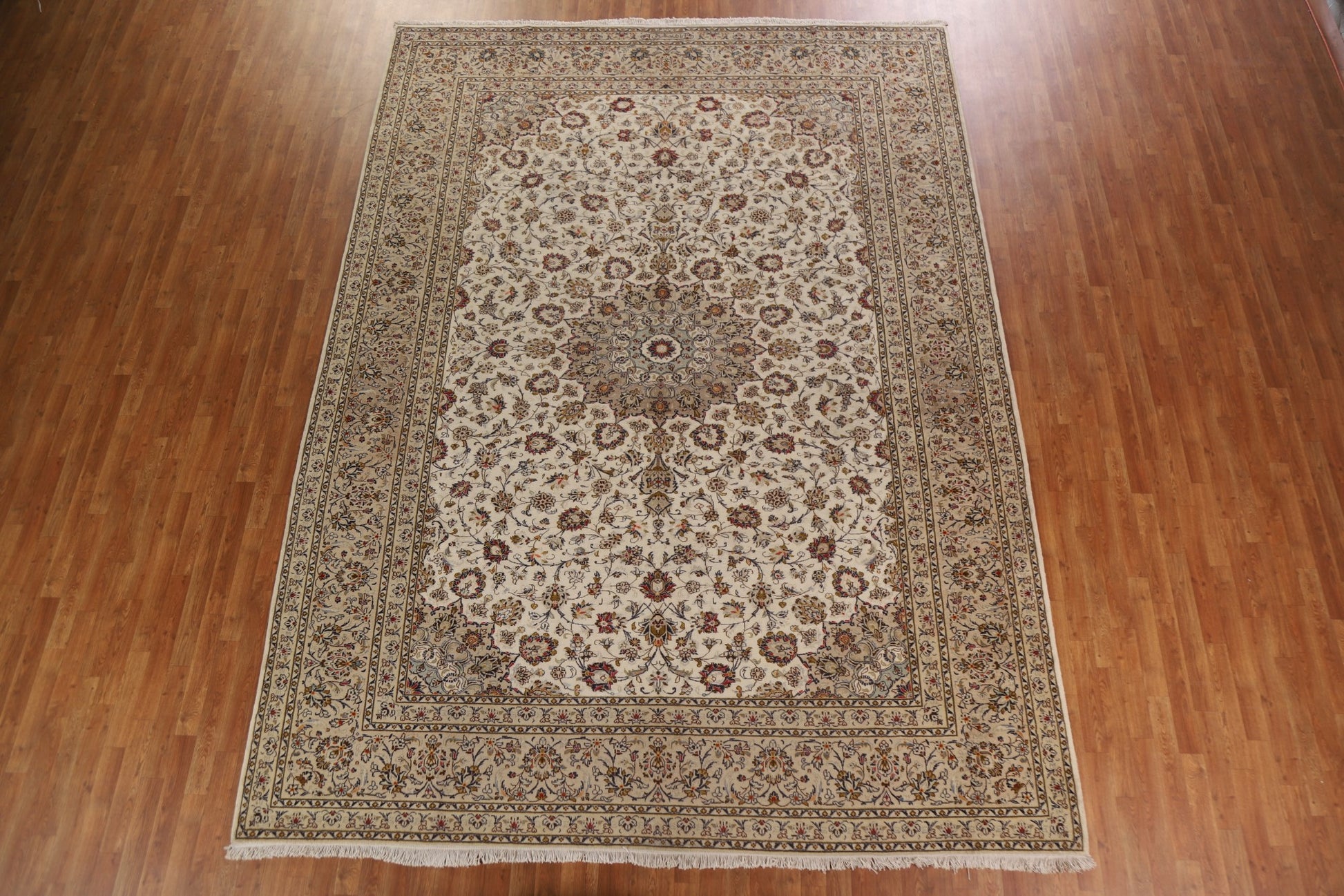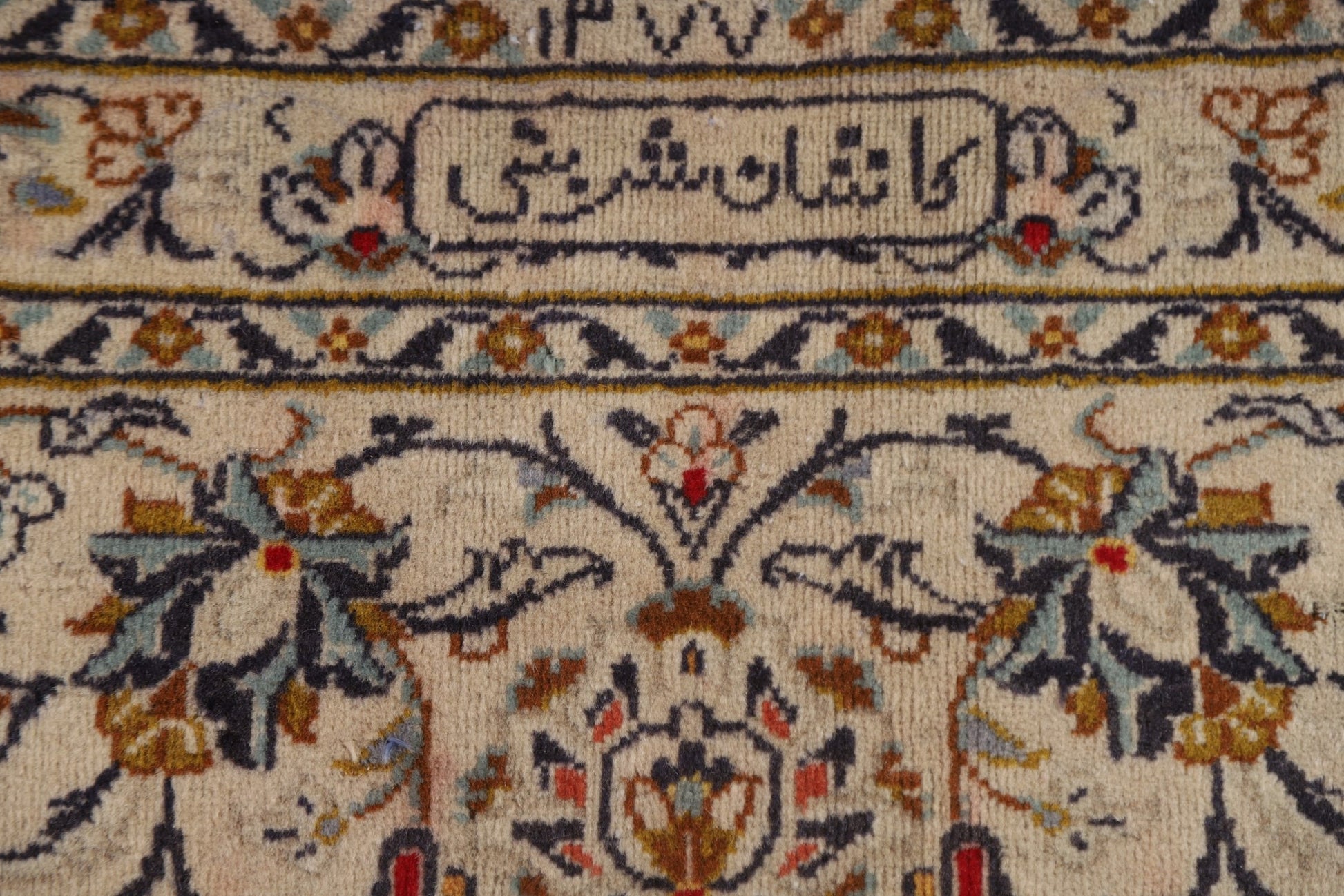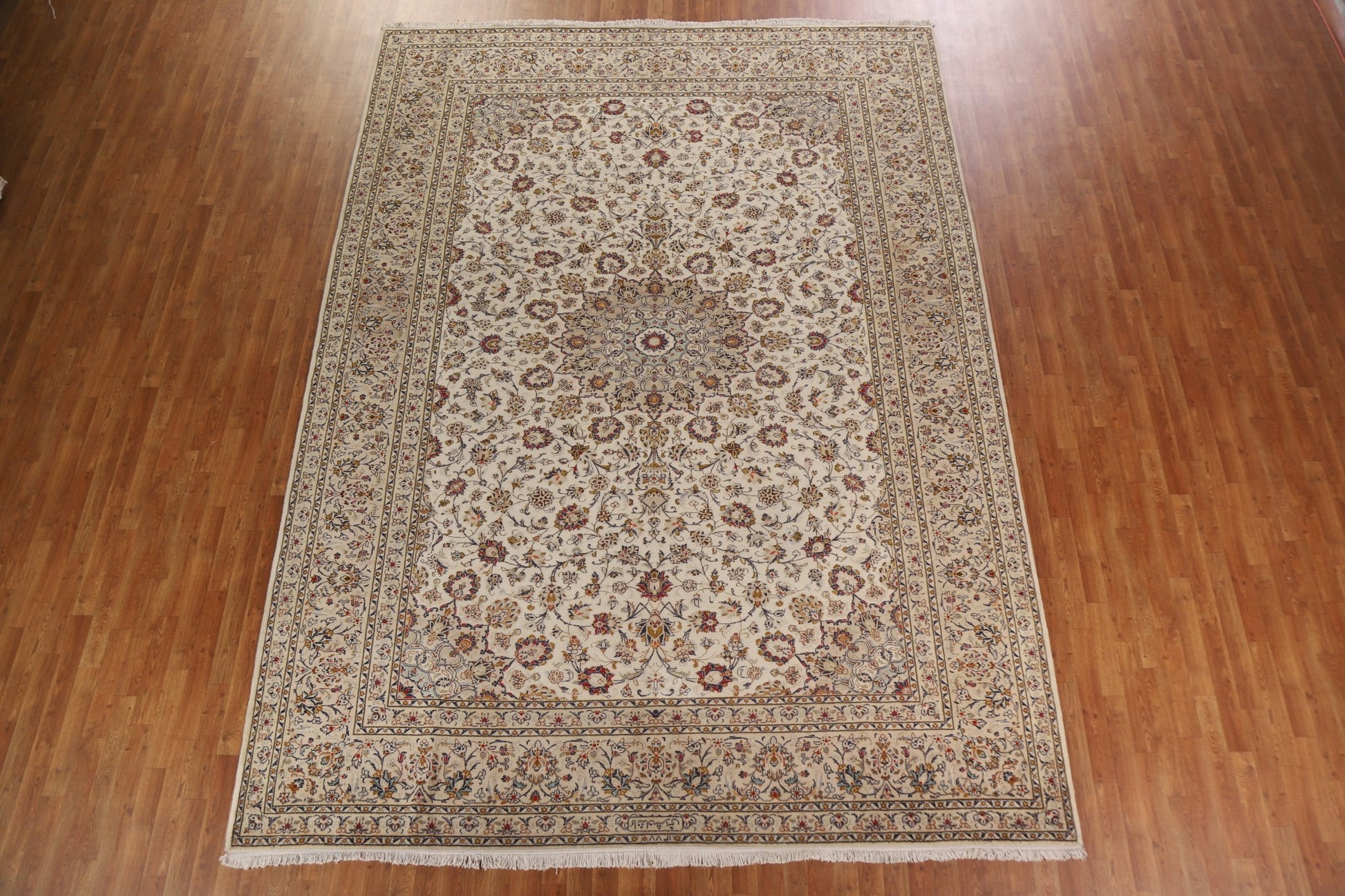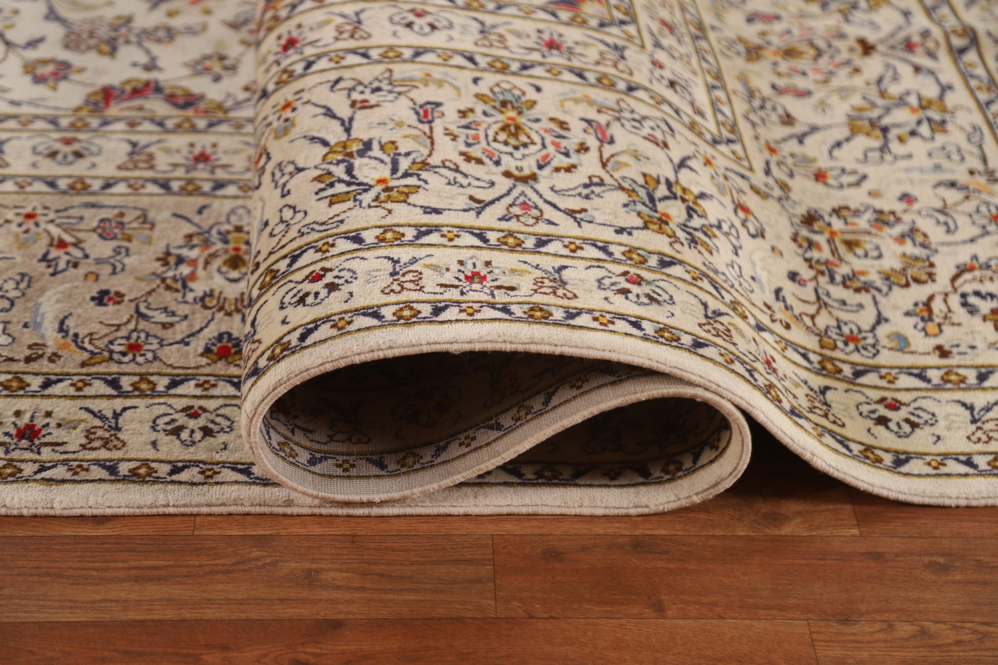 A Beautiful Genuine Persia ( Persia ) Kashan rug is Hand Knotted by skillful weavers in Persia ( Persia ) with 100% Wool Material. This rug is in Very Good condition. dimensions are 13' 1'' X 9' 5'' in foot and 399 X 287 in centimeter. the primary color is Beige & Ivories.