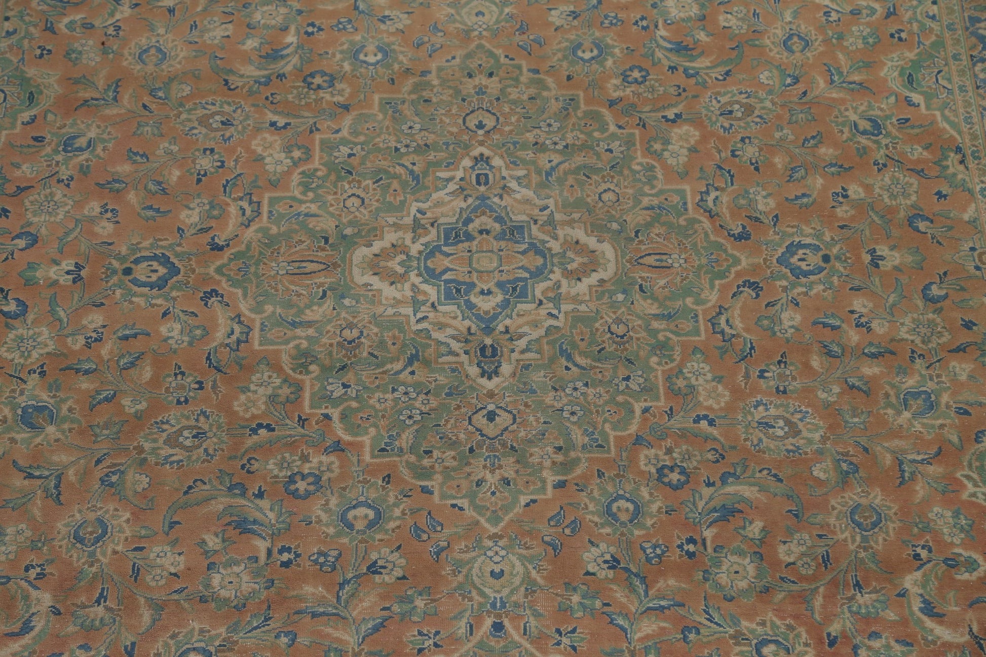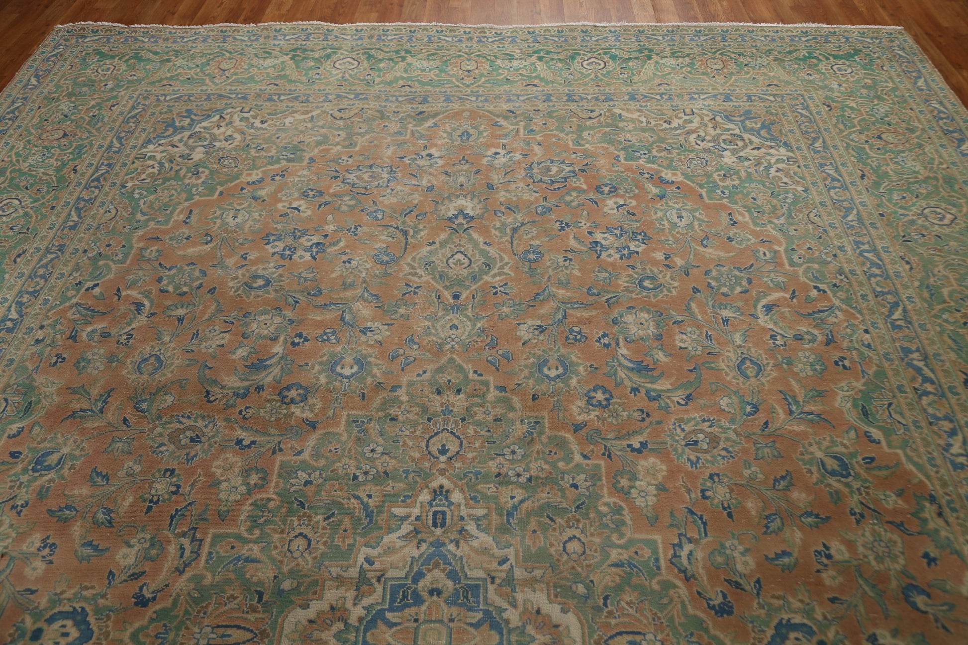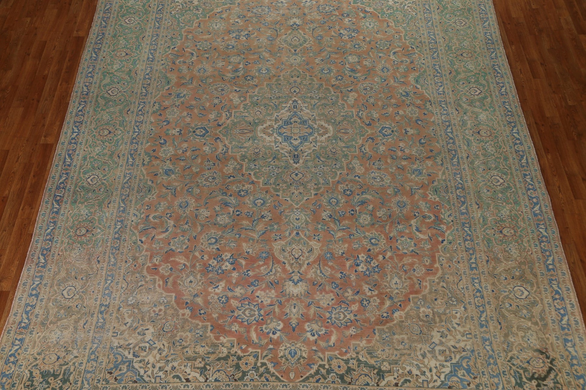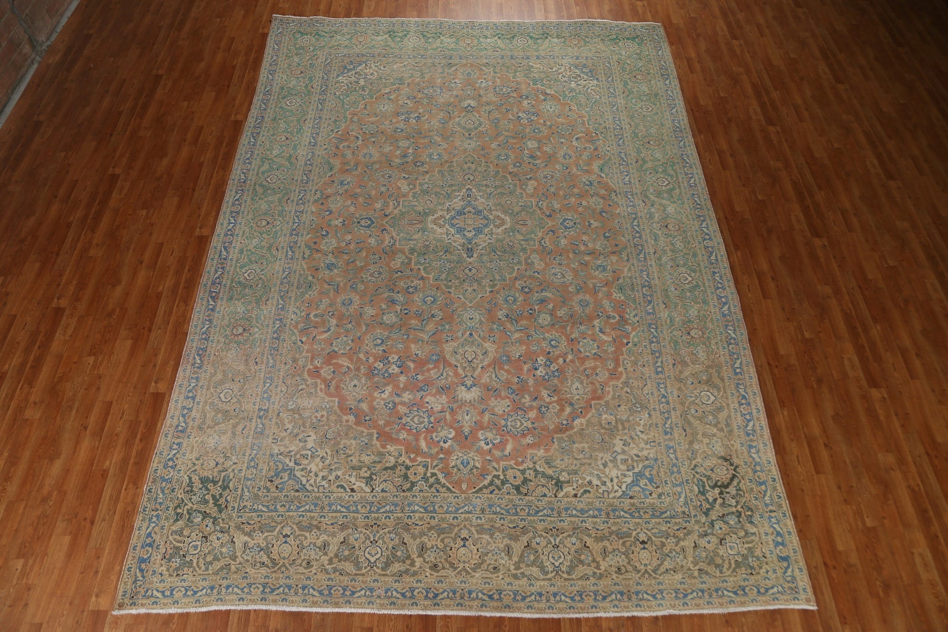 A Beautiful Genuine Persia ( Persia ) Kashan rug is Hand Knotted by skillful weavers in Persia ( Persia ) with 100% Wool Material. This rug is in Very Good (Evenly Low Pile) condition. dimensions are 13' 8'' X 9' 6'' in foot and 417 X 290 in centimeter. the primary color is Coral.