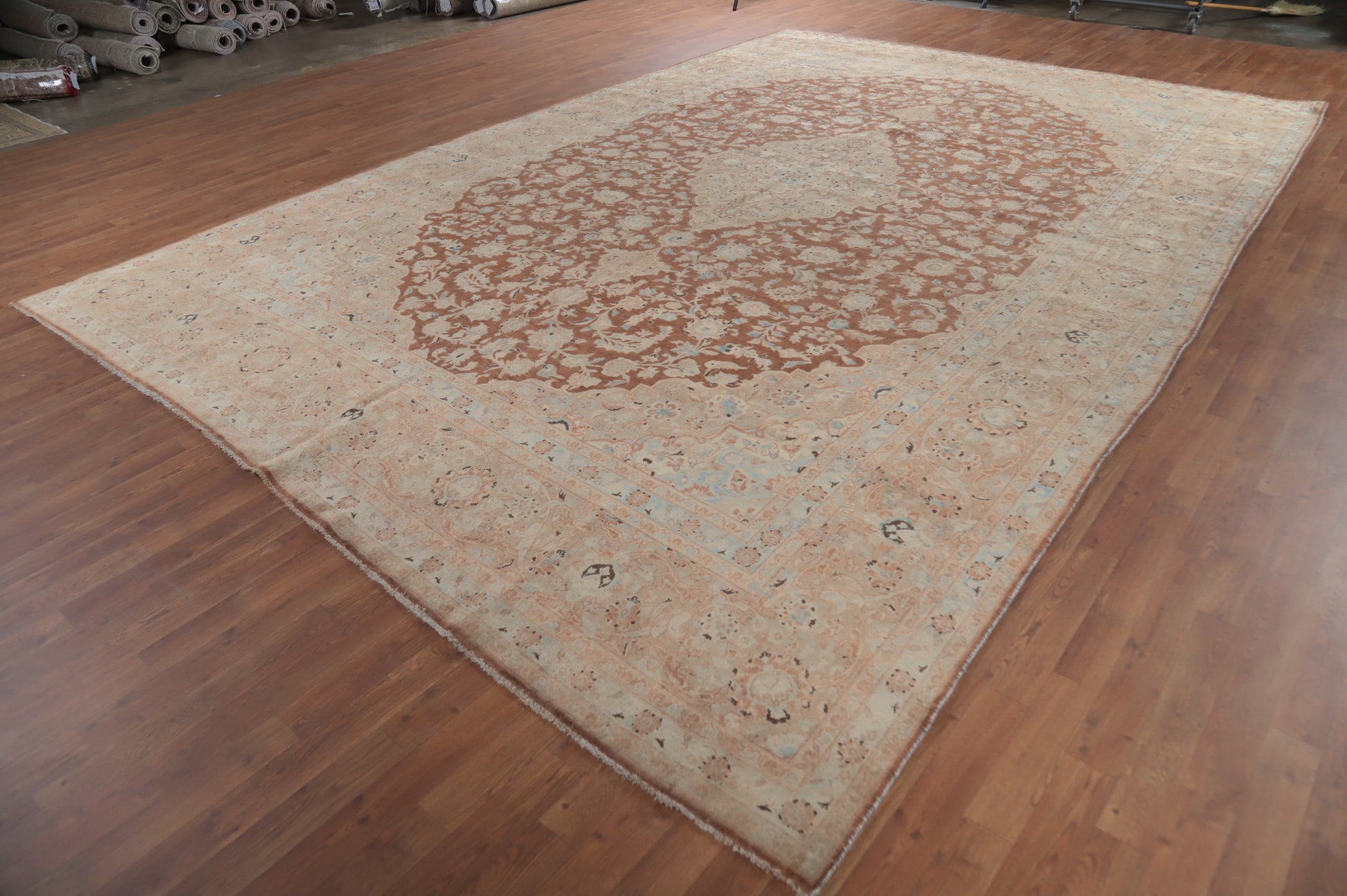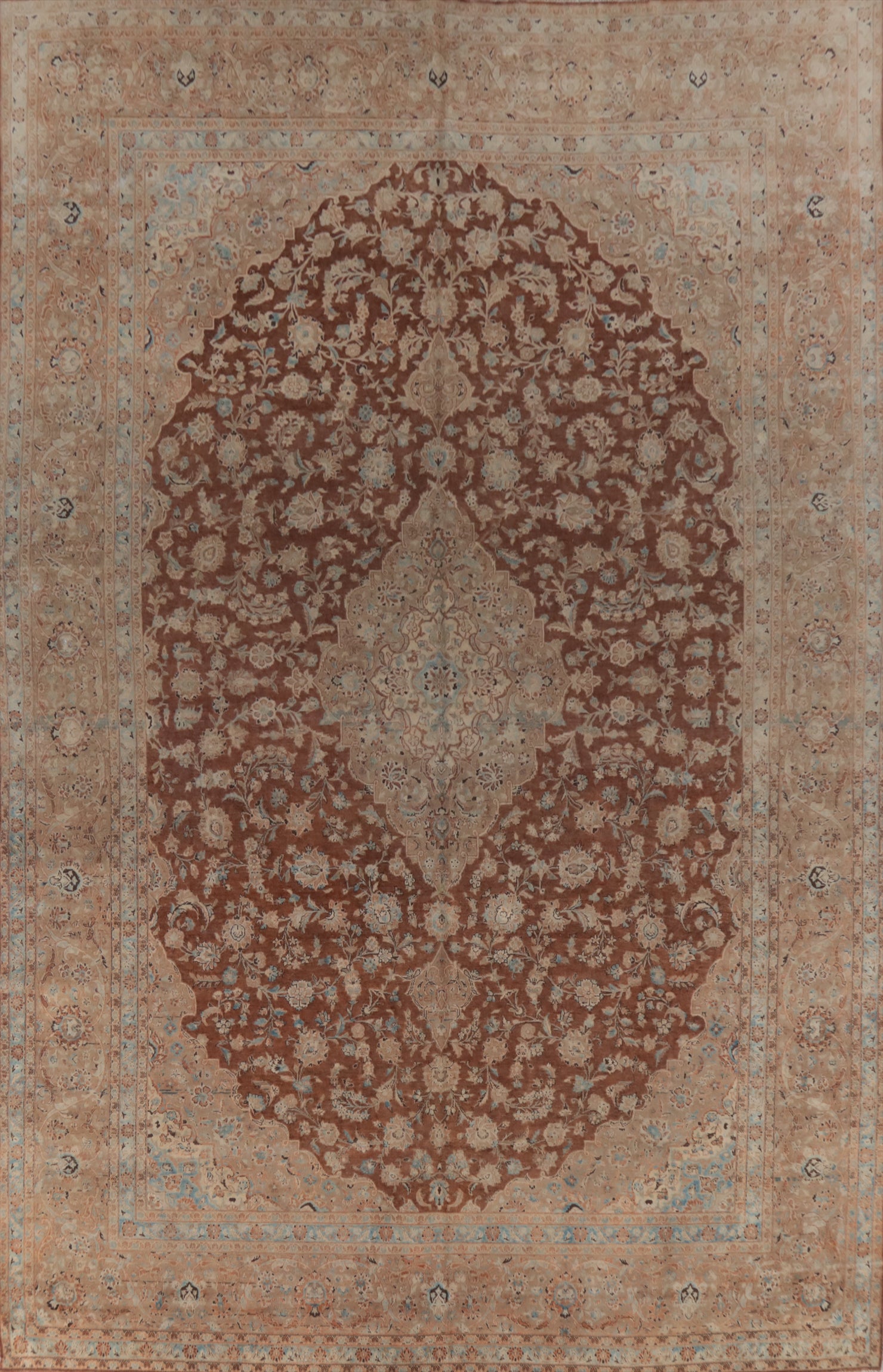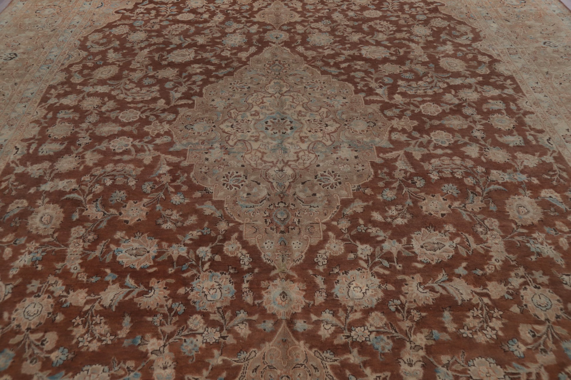 A Beautiful Genuine Persia ( Persia ) Kashan rug is Hand Knotted by skillful weavers in Persia ( Persia ) with 100% Wool Material. This rug is in Very Good (Abrash) condition. dimensions are 15' 4'' X 10' 4'' in foot and 467 X 315 in centimeter. the primary color is Brown.