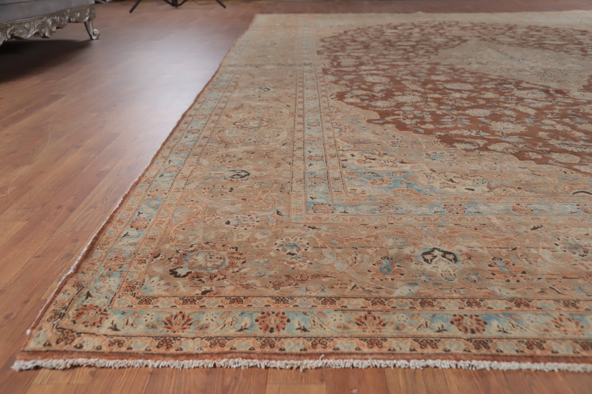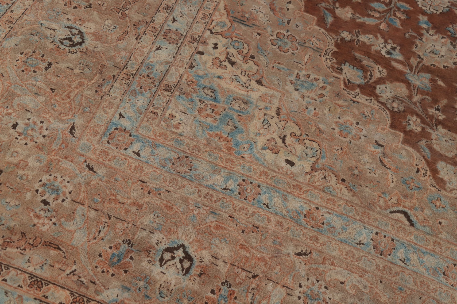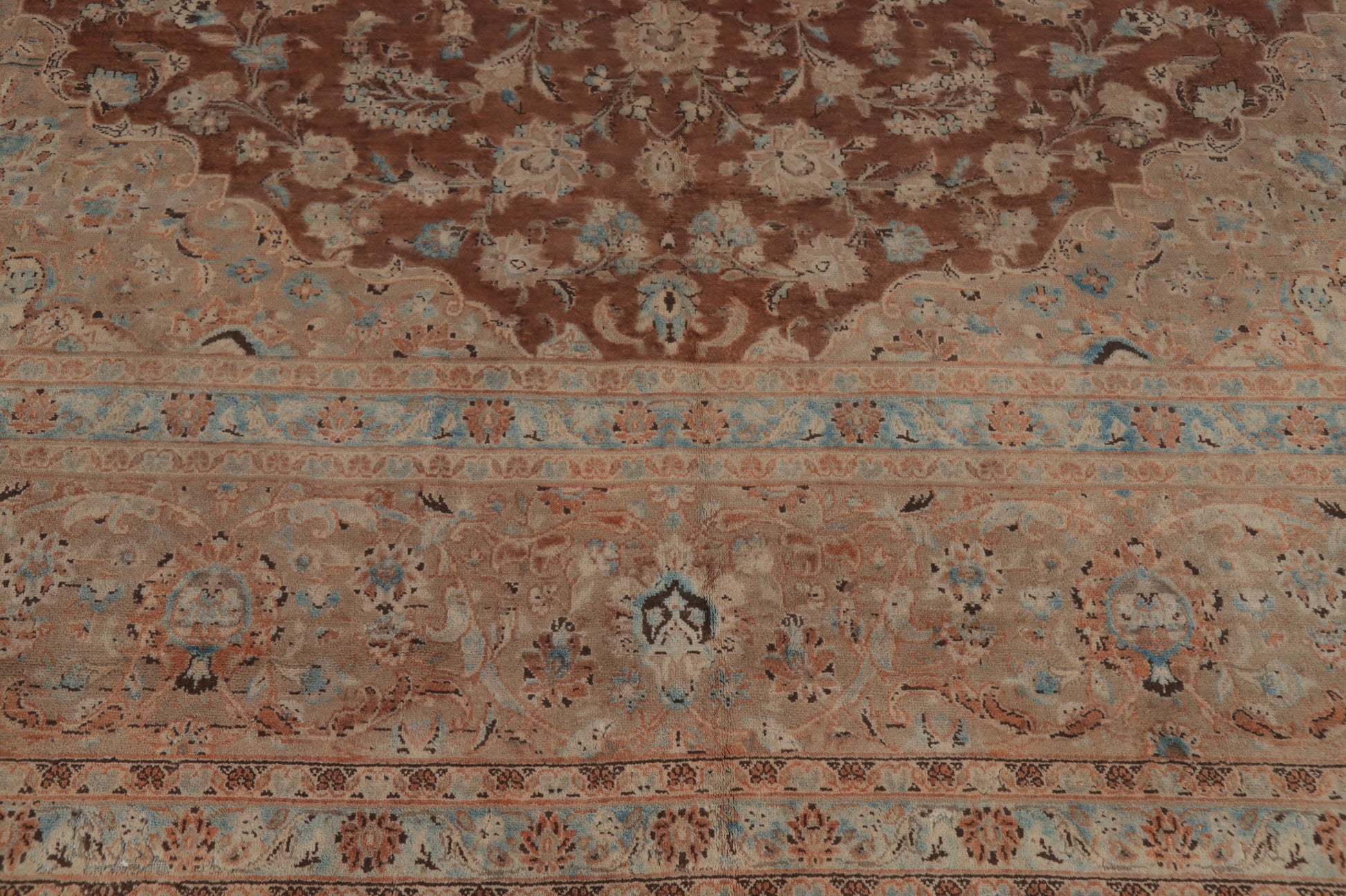 A Beautiful Genuine Persia ( Persia ) Kashan rug is Hand Knotted by skillful weavers in Persia ( Persia ) with 100% Wool Material. This rug is in Very Good (Abrash) condition. dimensions are 15' 4'' X 10' 4'' in foot and 467 X 315 in centimeter. the primary color is Brown.