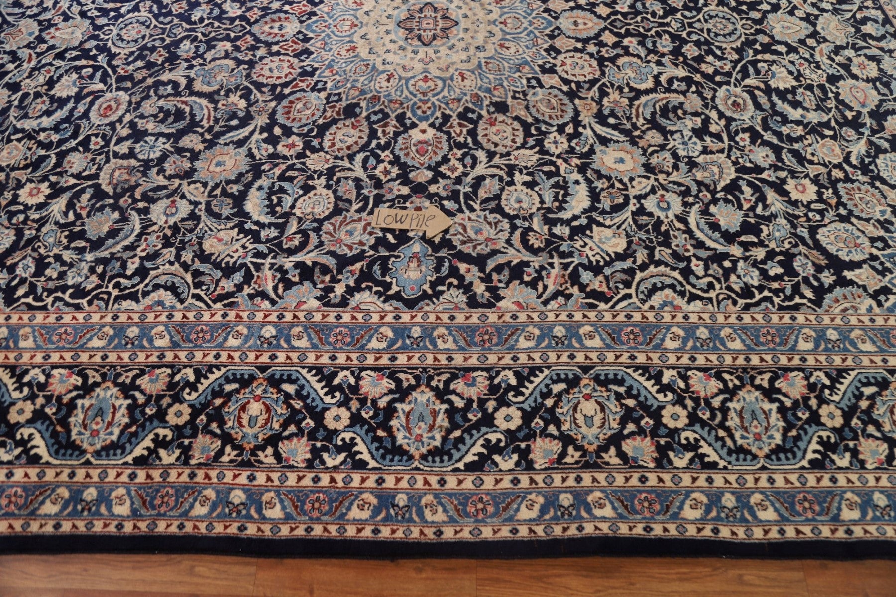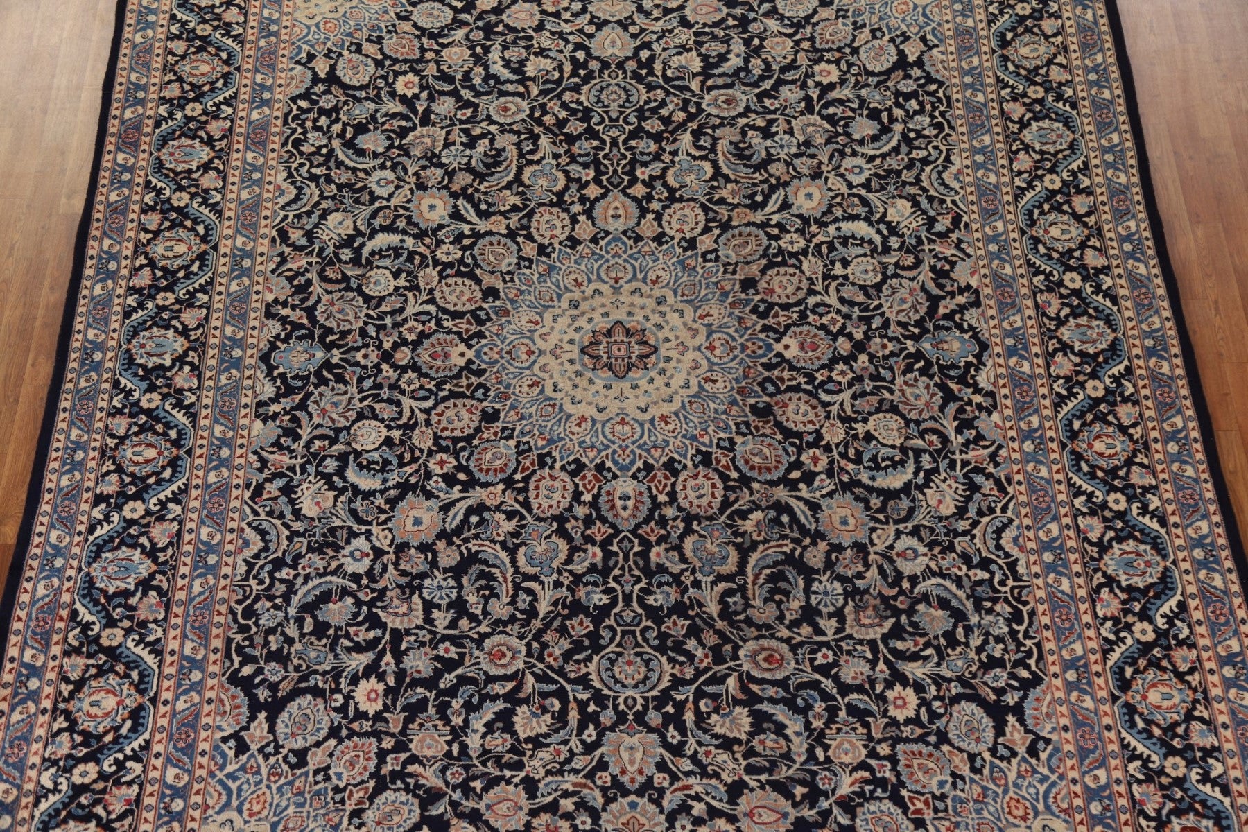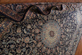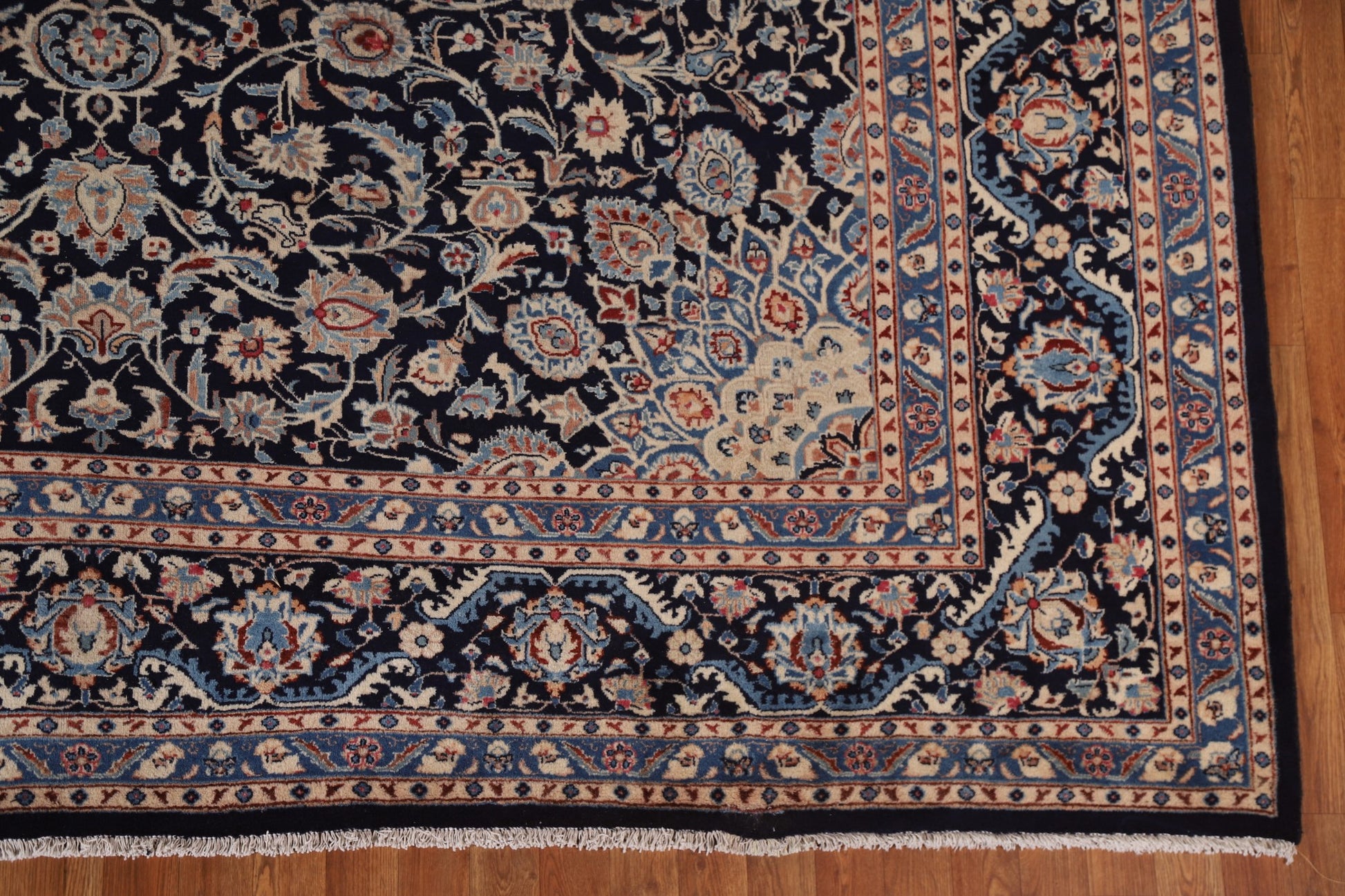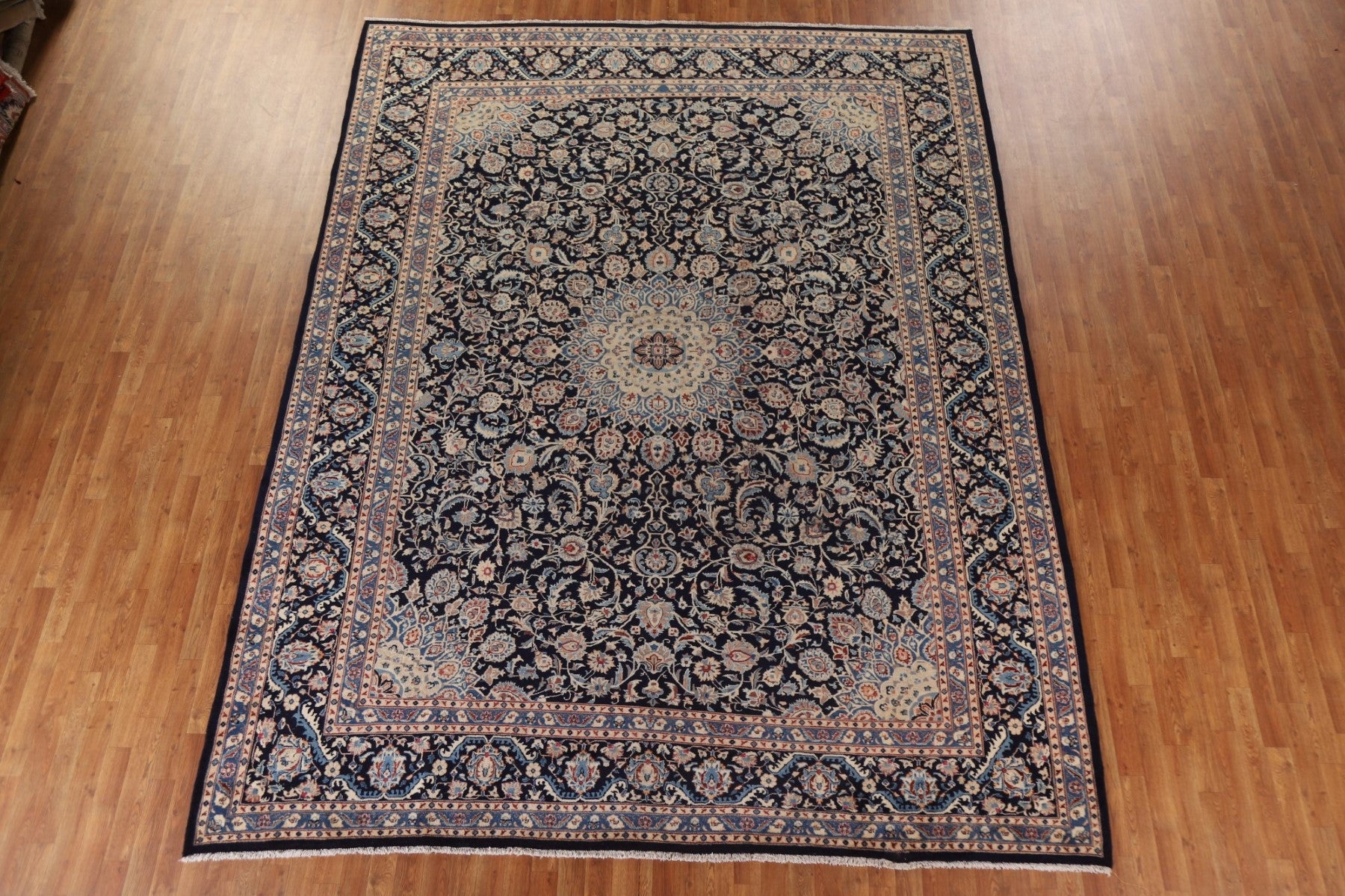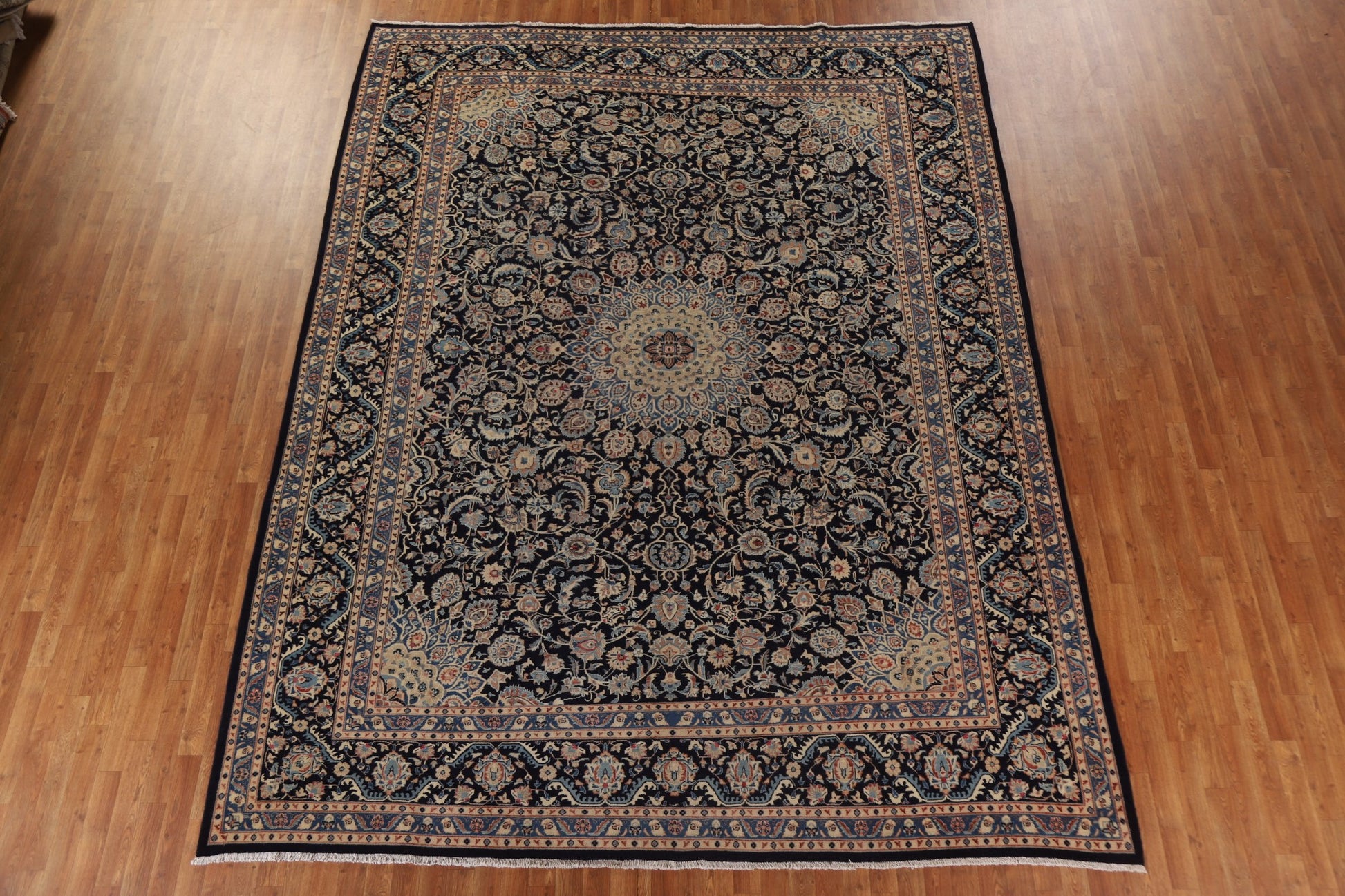 A Beautiful Genuine Persia ( Persia ) Kashmar rug is Hand Knotted by skillful weavers in Persia ( Persia ) with 100% Wool Material. This rug is in Very Good ( Low Pile ) condition. dimensions are 12' 5'' X 9' 7'' in foot and 378 X 292 in centimeter. the primary color is Navy Blue & Blues.