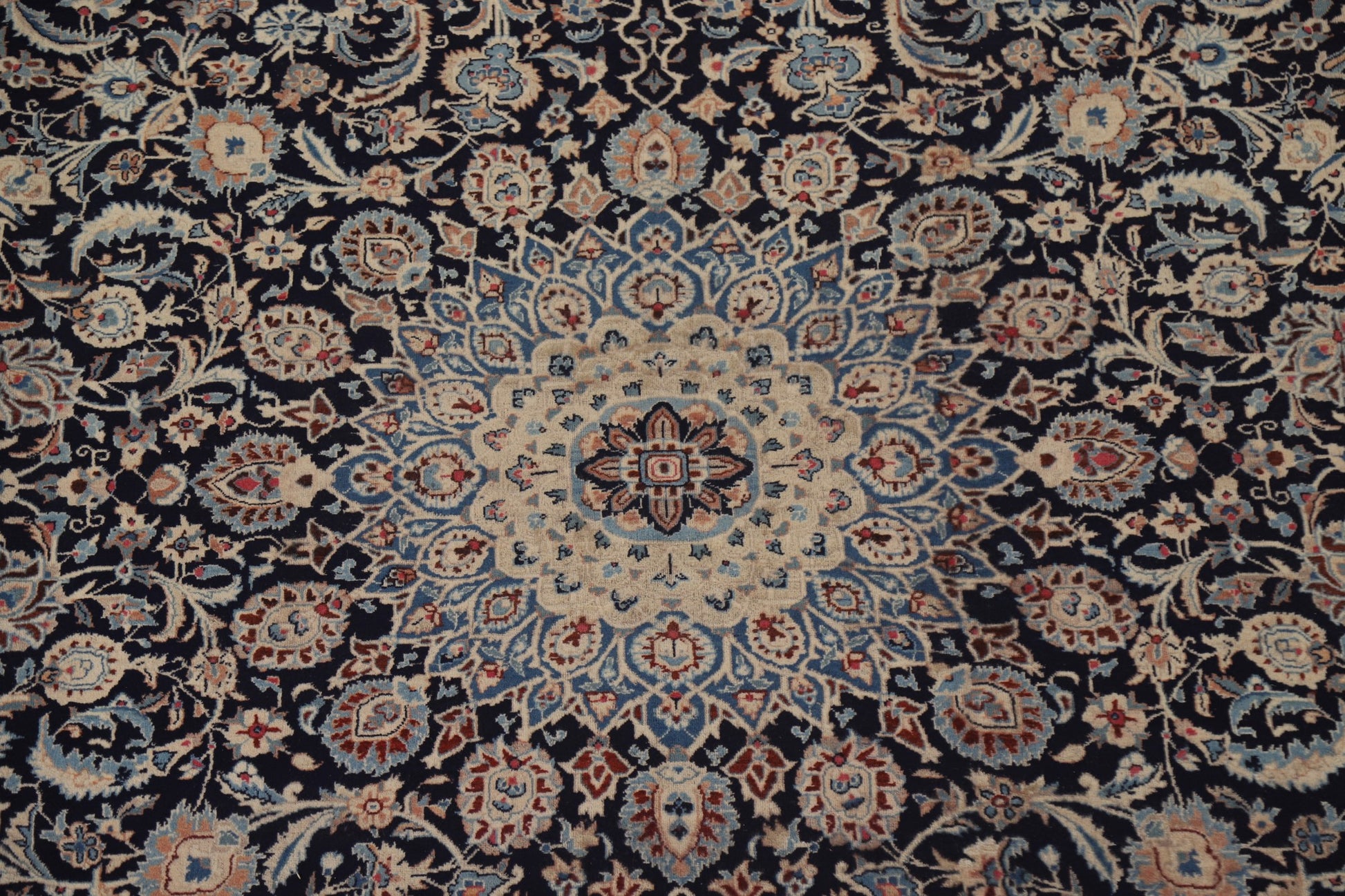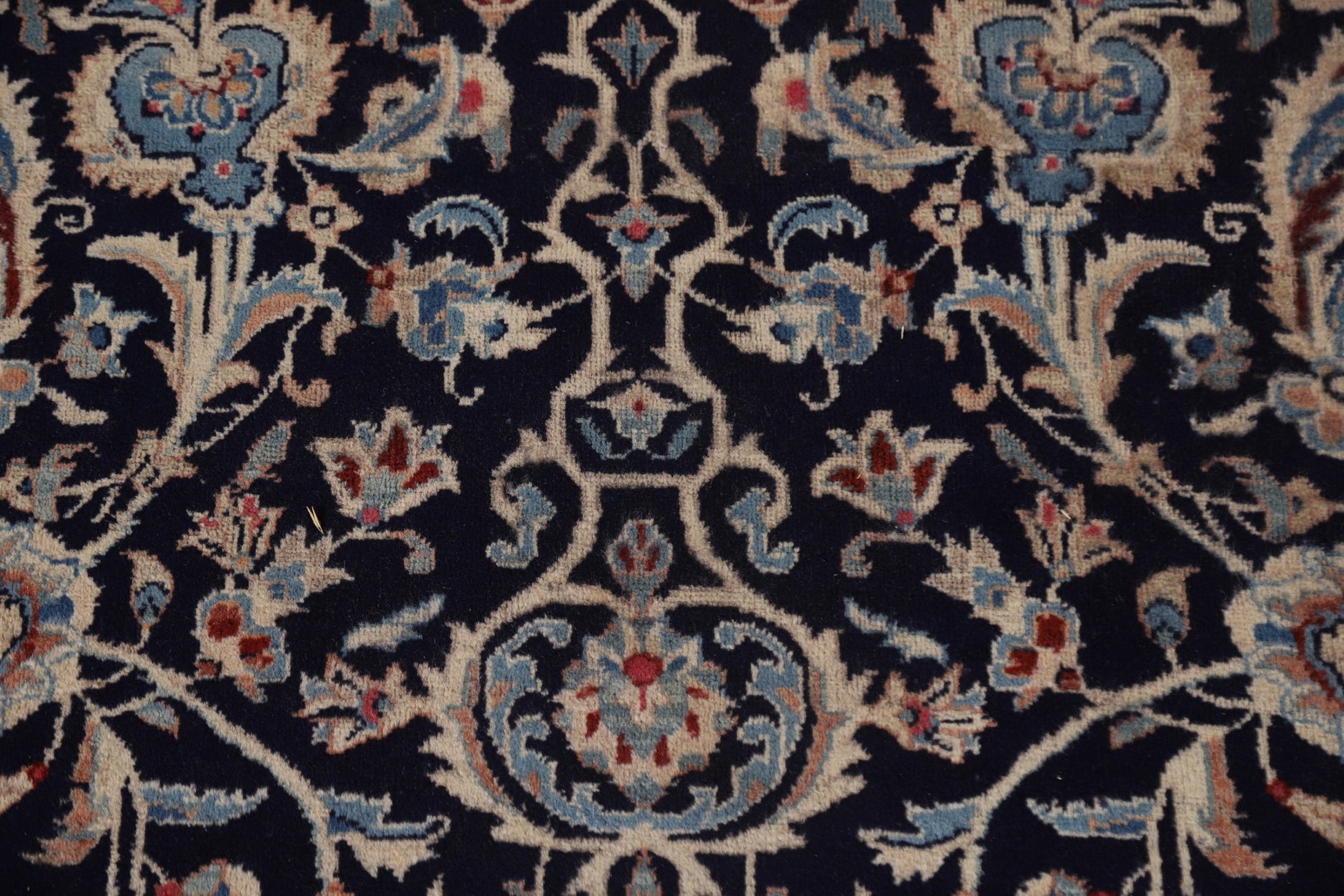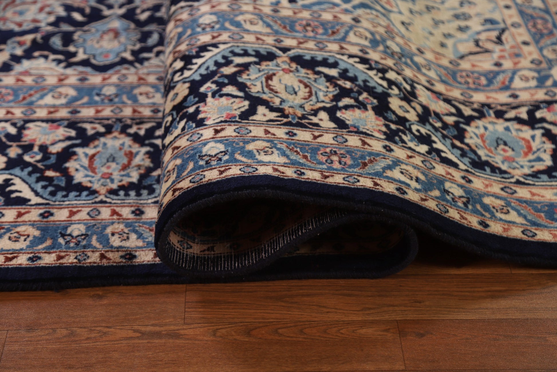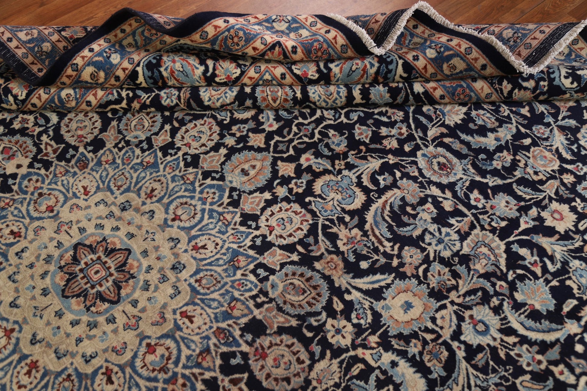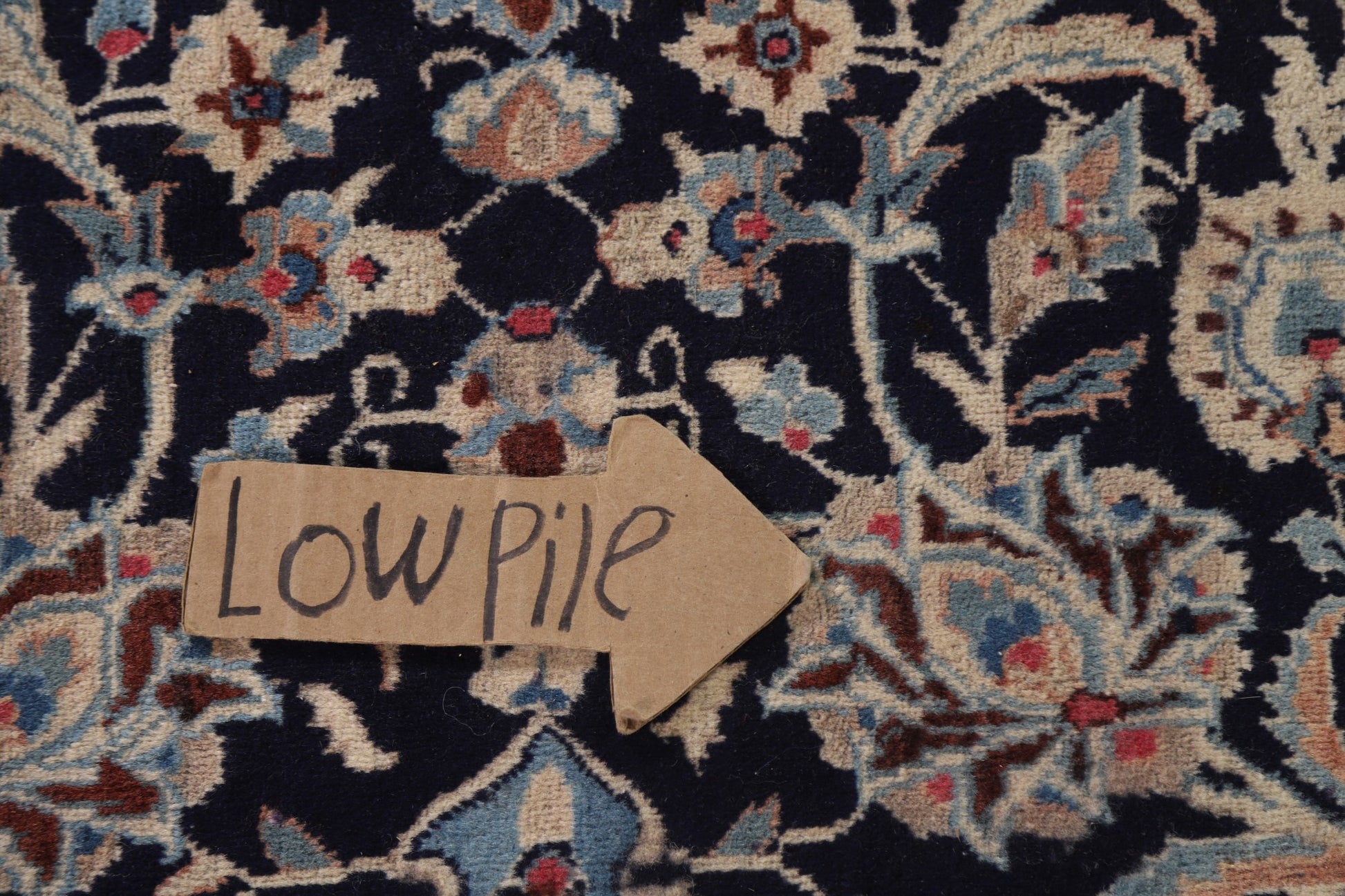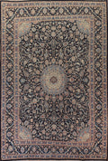A Beautiful Genuine Persia ( Persia ) Kashmar rug is Hand Knotted by skillful weavers in Persia ( Persia ) with 100% Wool Material. This rug is in Very Good ( Low Pile ) condition. dimensions are 12' 5'' X 9' 7'' in foot and 378 X 292 in centimeter. the primary color is Navy Blue & Blues.