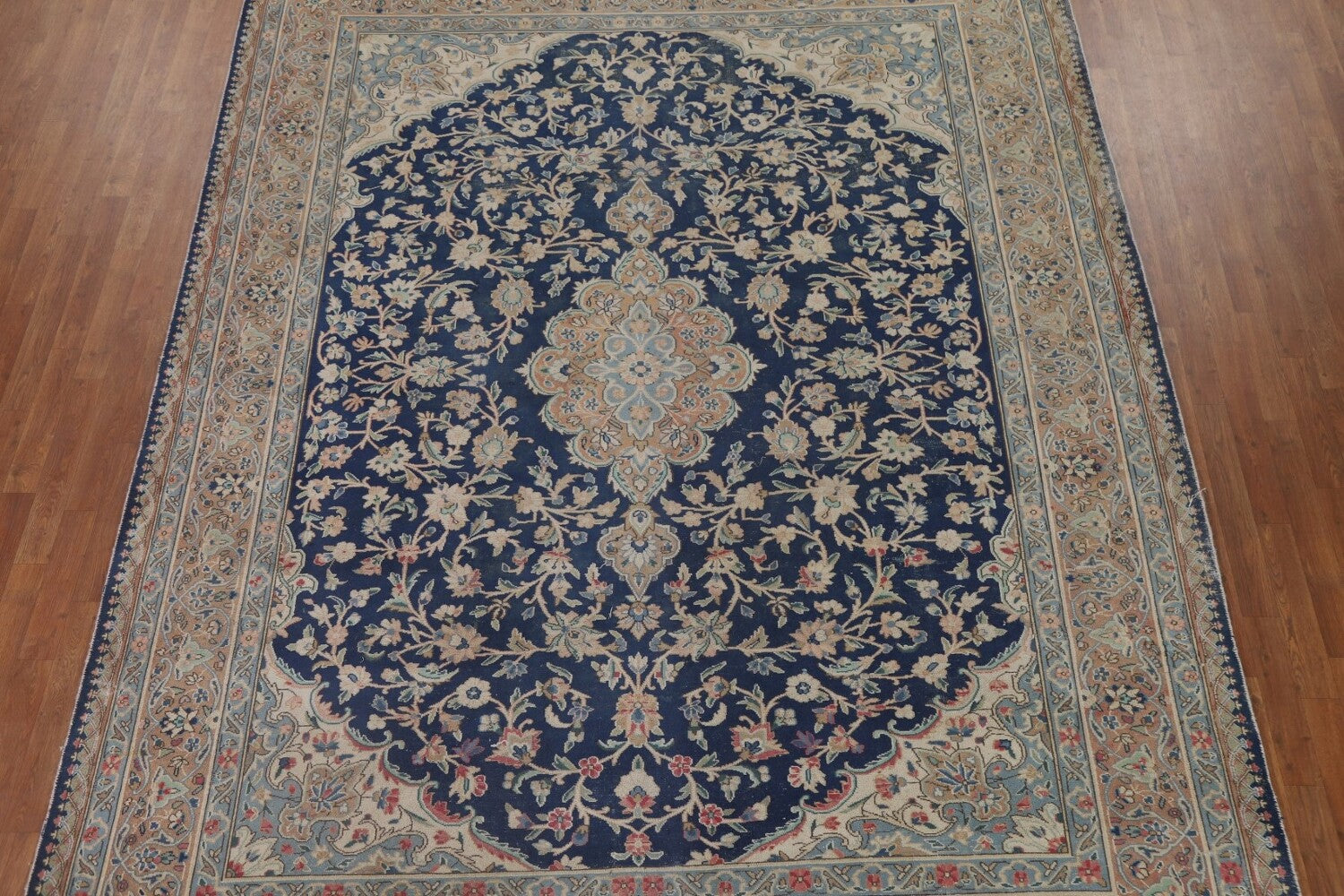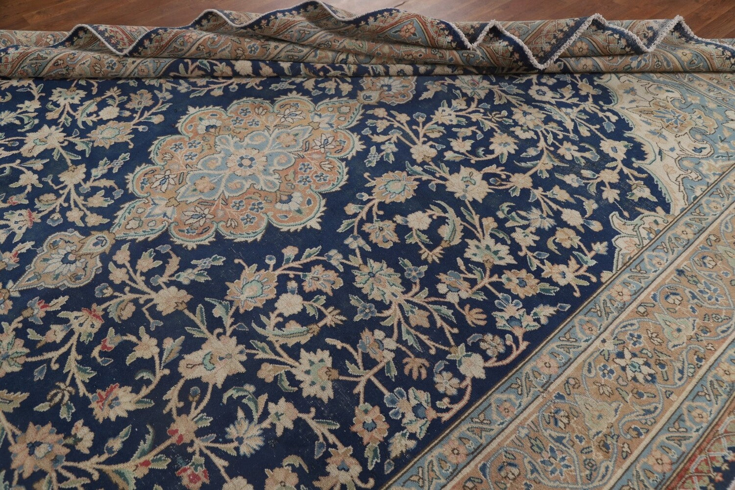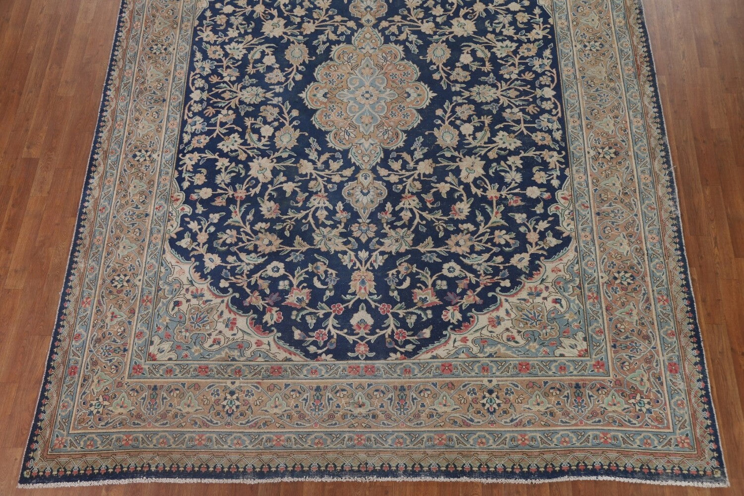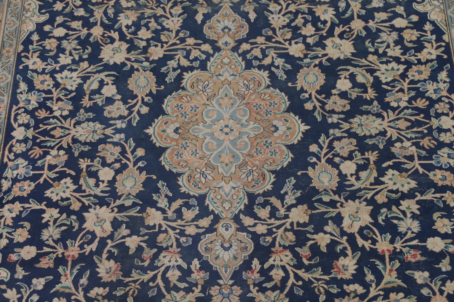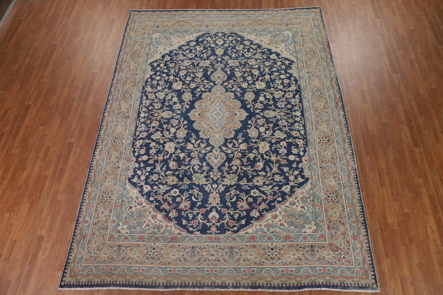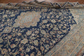 A Beautiful Genuine Persia ( Persia ) Kashmar rug is Hand Knotted by skillful weavers in Persia ( Persia ) with 100% Wool Material. This rug is in Very Good (Low Pile-Repair) condition. dimensions are 11' 8'' X 8' 9'' in foot and 356 X 267 in centimeter. the primary color is Navy Blue & Blues.