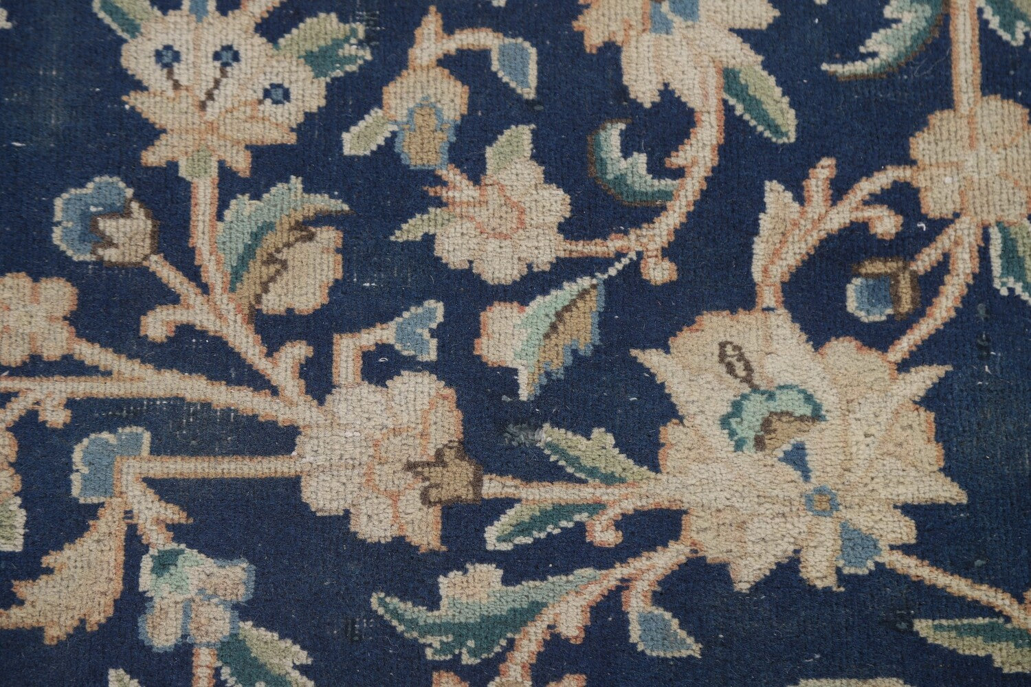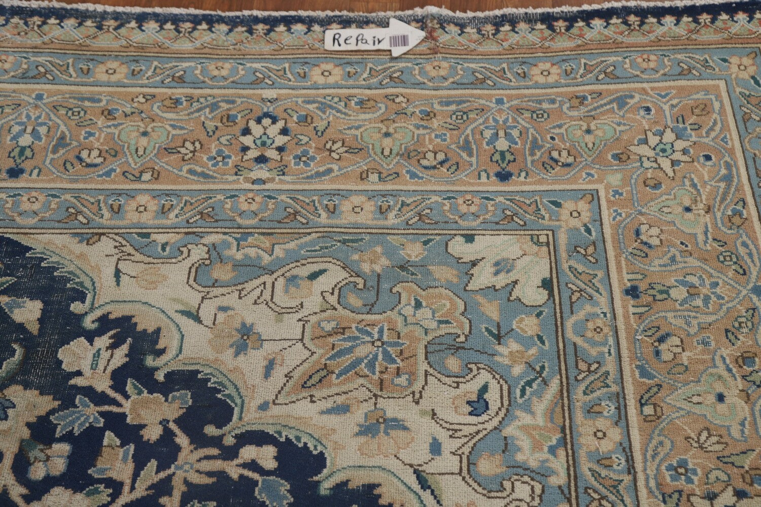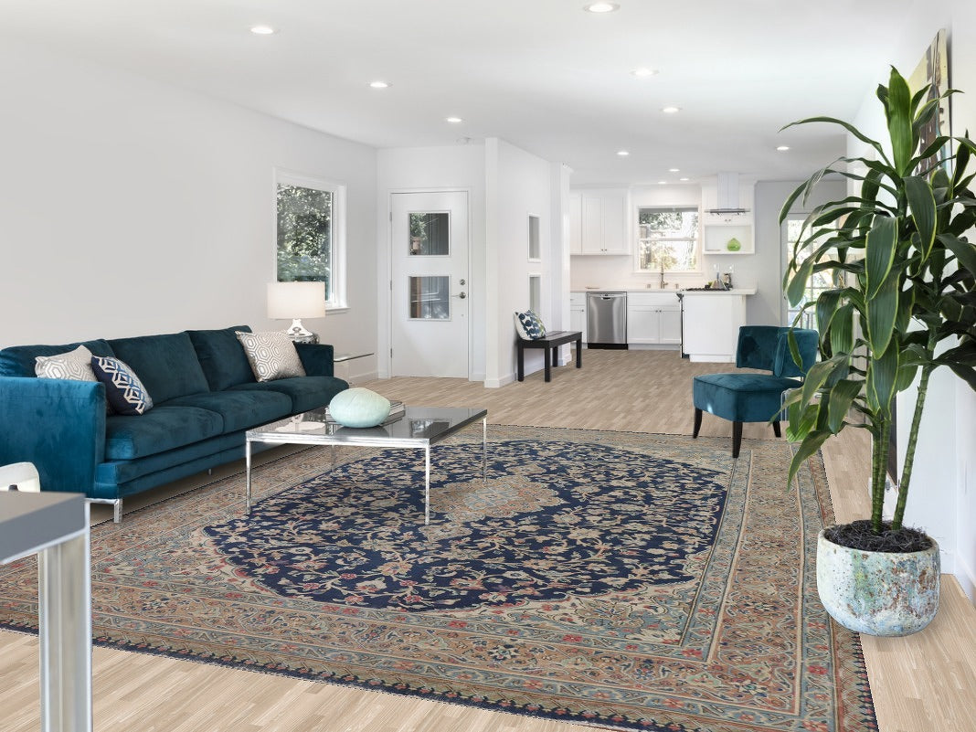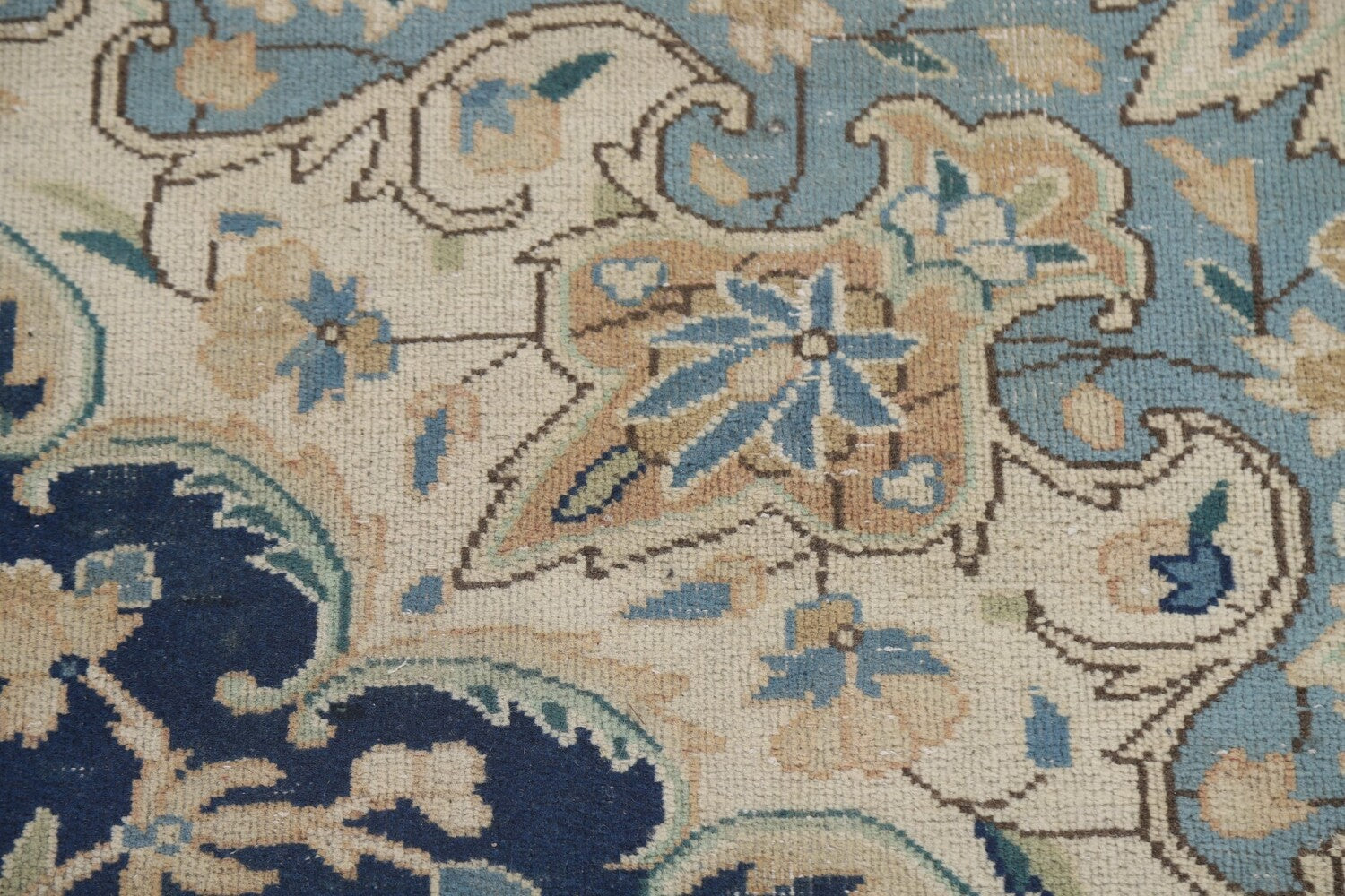 A Beautiful Genuine Persia ( Persia ) Kashmar rug is Hand Knotted by skillful weavers in Persia ( Persia ) with 100% Wool Material. This rug is in Very Good (Low Pile-Repair) condition. dimensions are 11' 8'' X 8' 9'' in foot and 356 X 267 in centimeter. the primary color is Navy Blue & Blues.
