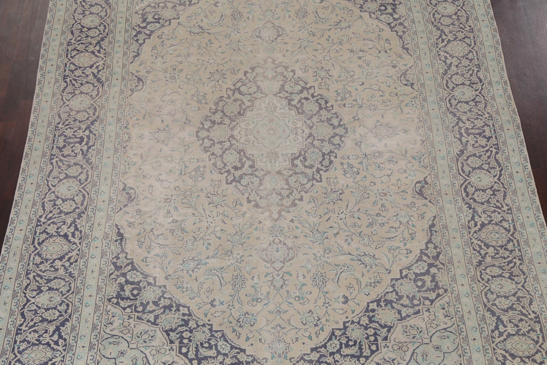A Beautiful Genuine Persia ( Persia ) Kerman rug is Hand Knotted by skillful weavers in Persia ( Persia ) with 100% Wool Material. This rug is in Very Good (Evenly Low Pile) condition. dimensions are 11' 2'' X 8' 1'' in foot and 340 X 246 in centimeter. the primary color is Beige & Ivories.