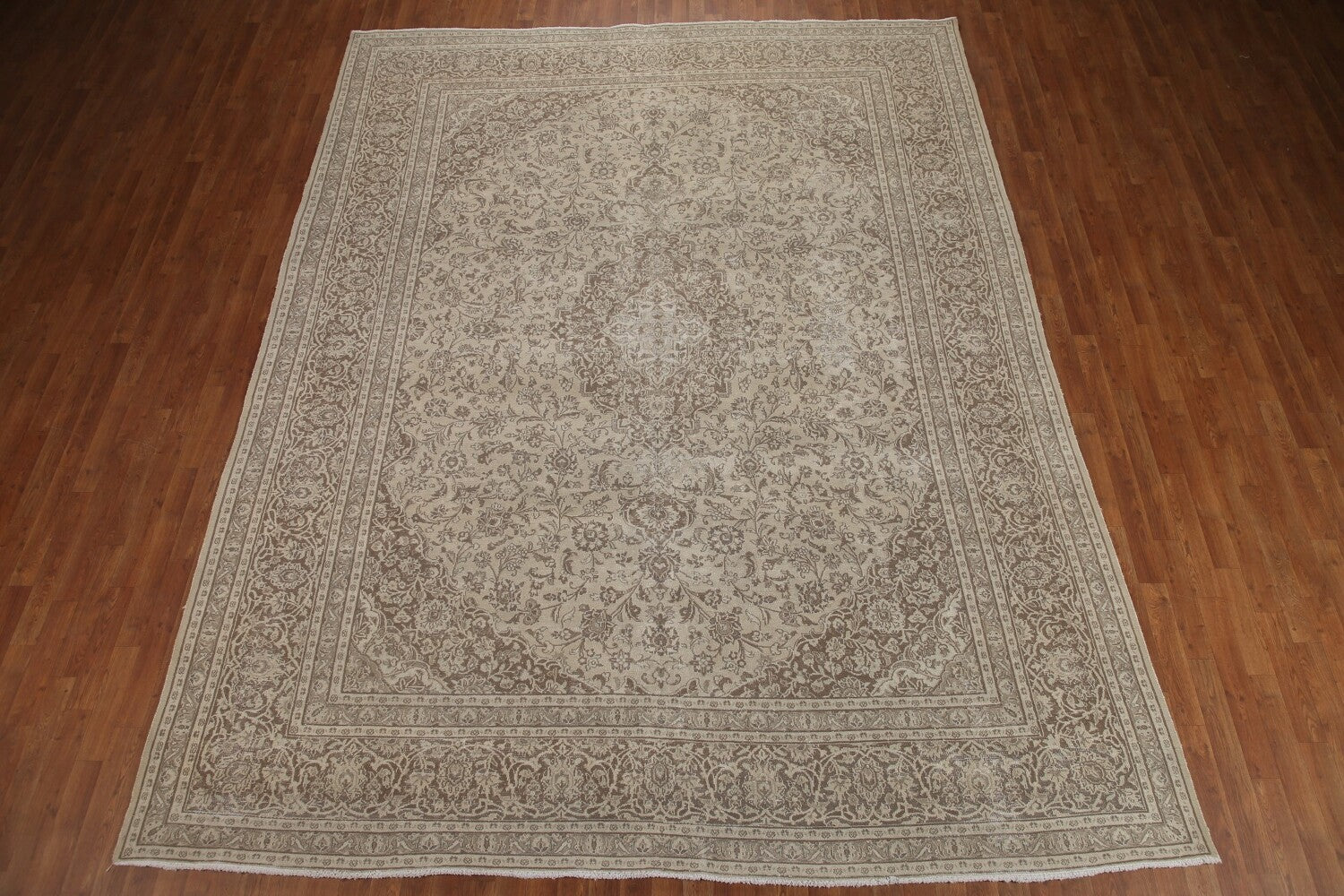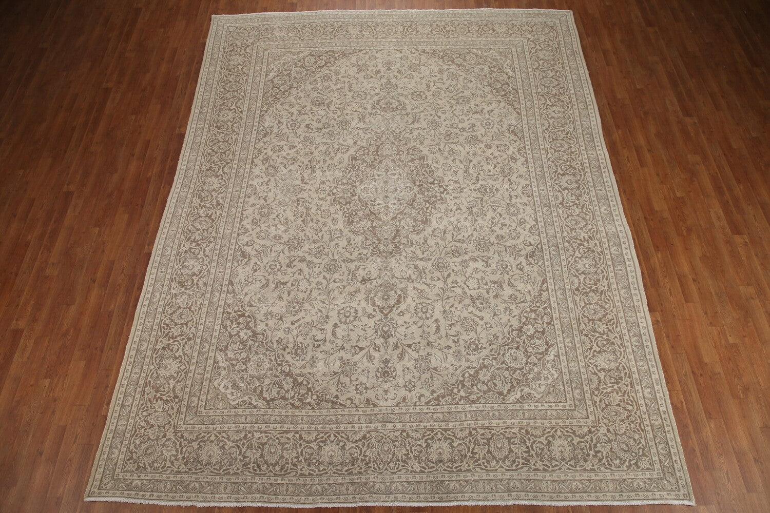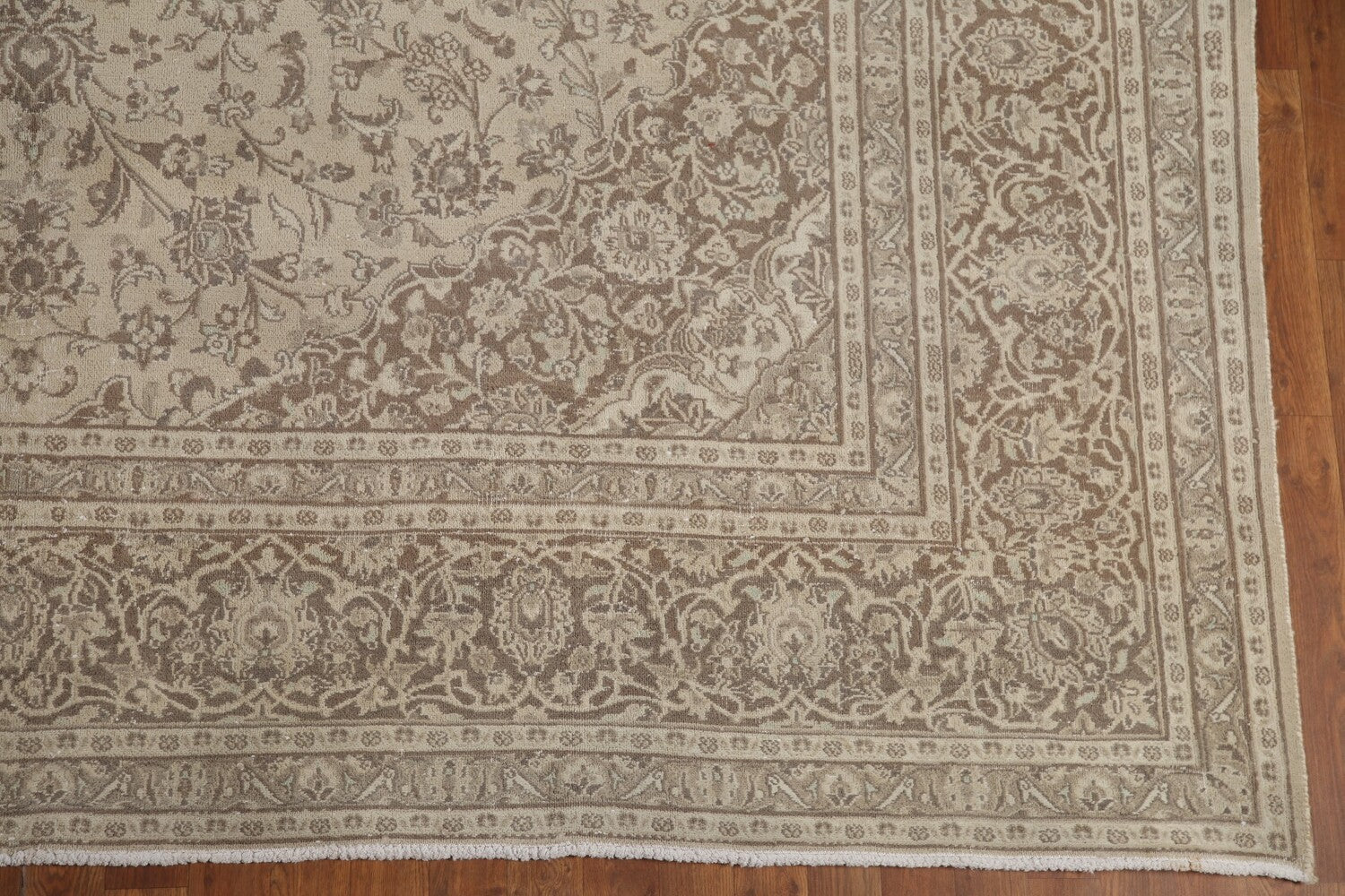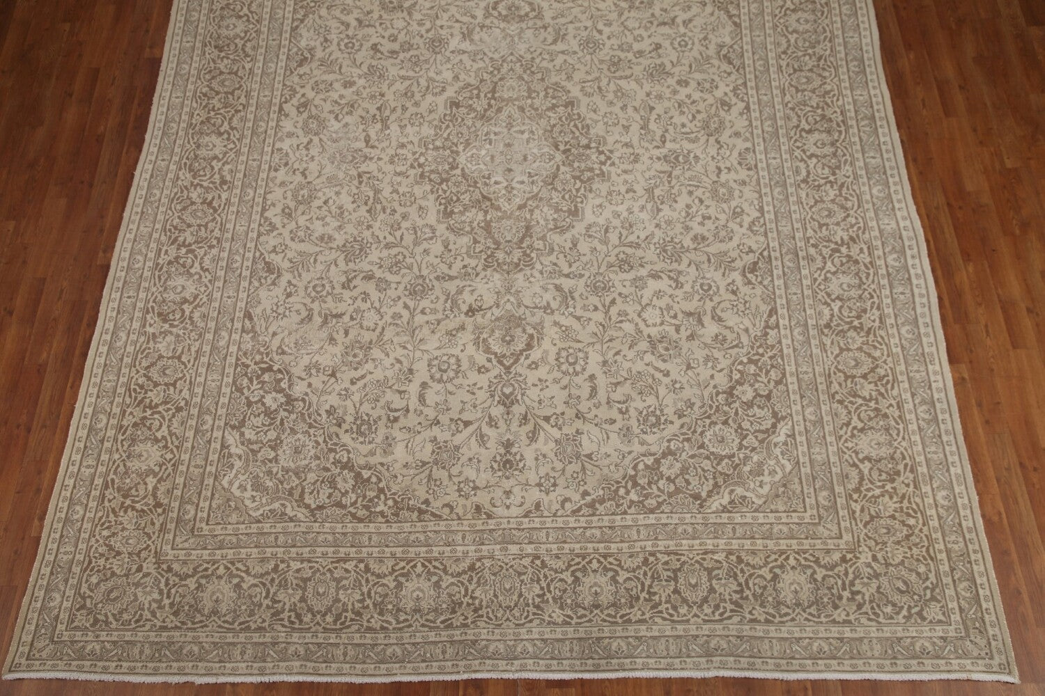 A Beautiful Genuine Persia ( Persia ) Mashad rug is Hand Knotted by skillful weavers in Persia ( Persia ) with 100% Wool Material. This rug is in Very Good ( Low Pile ) condition. dimensions are 12' 4'' X 9' 6'' in foot and 376 X 290 in centimeter. the primary color is Beige & Ivories.