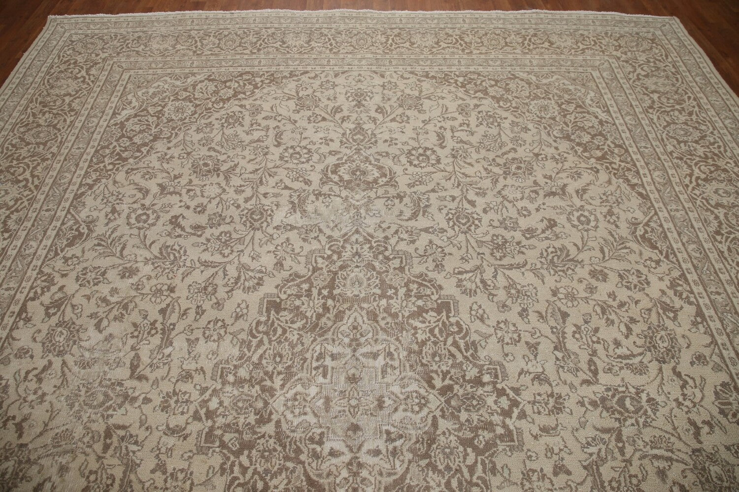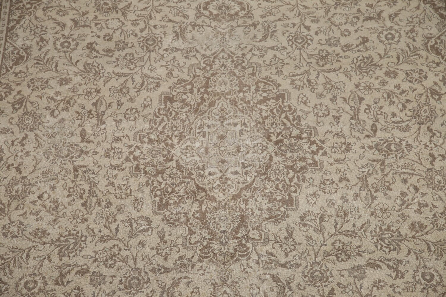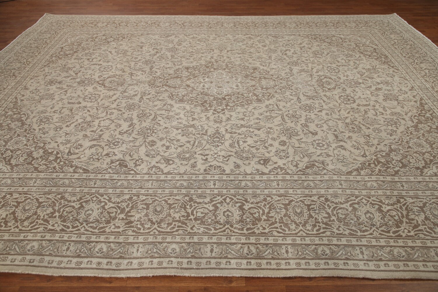 A Beautiful Genuine Persia ( Persia ) Mashad rug is Hand Knotted by skillful weavers in Persia ( Persia ) with 100% Wool Material. This rug is in Very Good ( Low Pile ) condition. dimensions are 12' 4'' X 9' 6'' in foot and 376 X 290 in centimeter. the primary color is Beige & Ivories.
