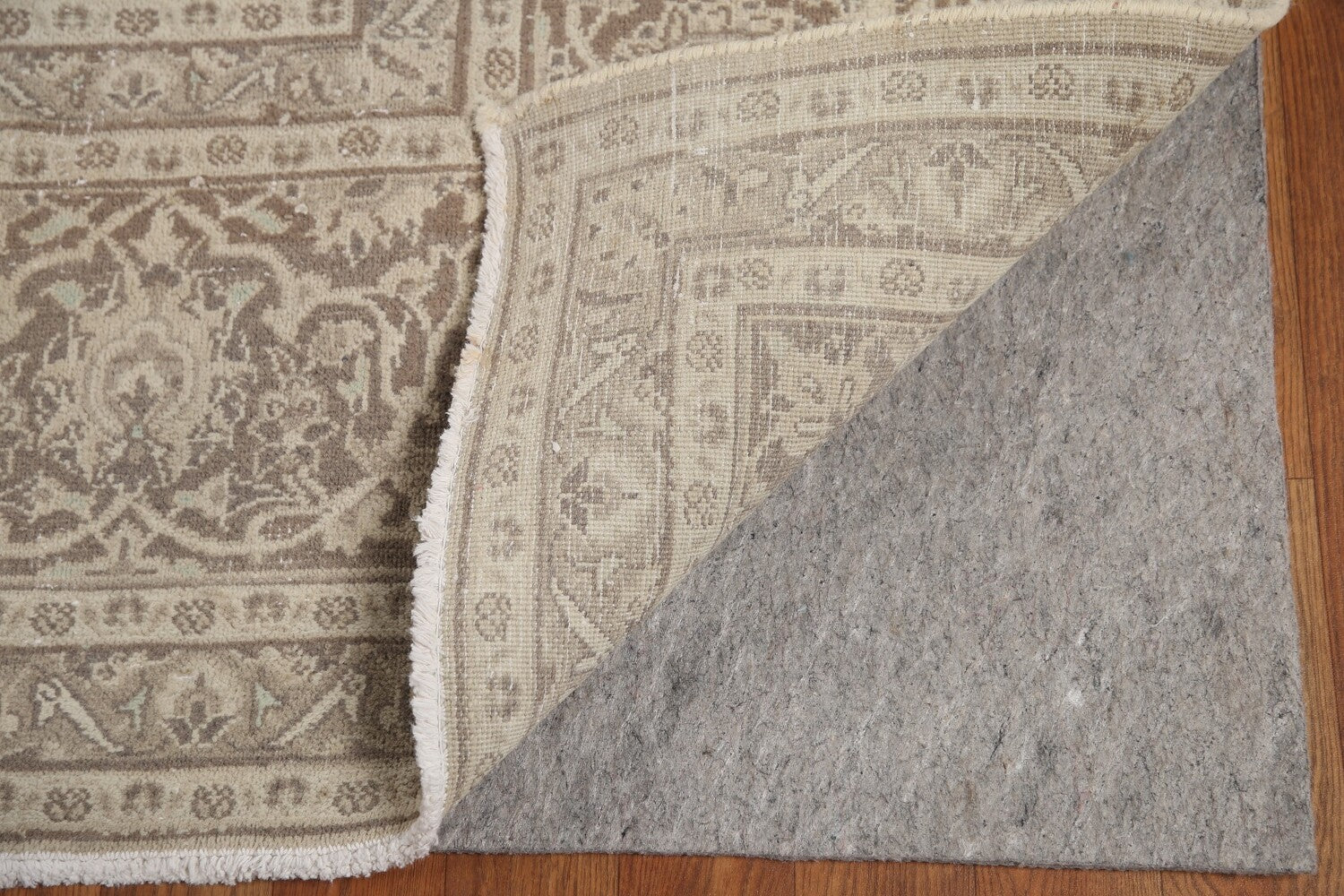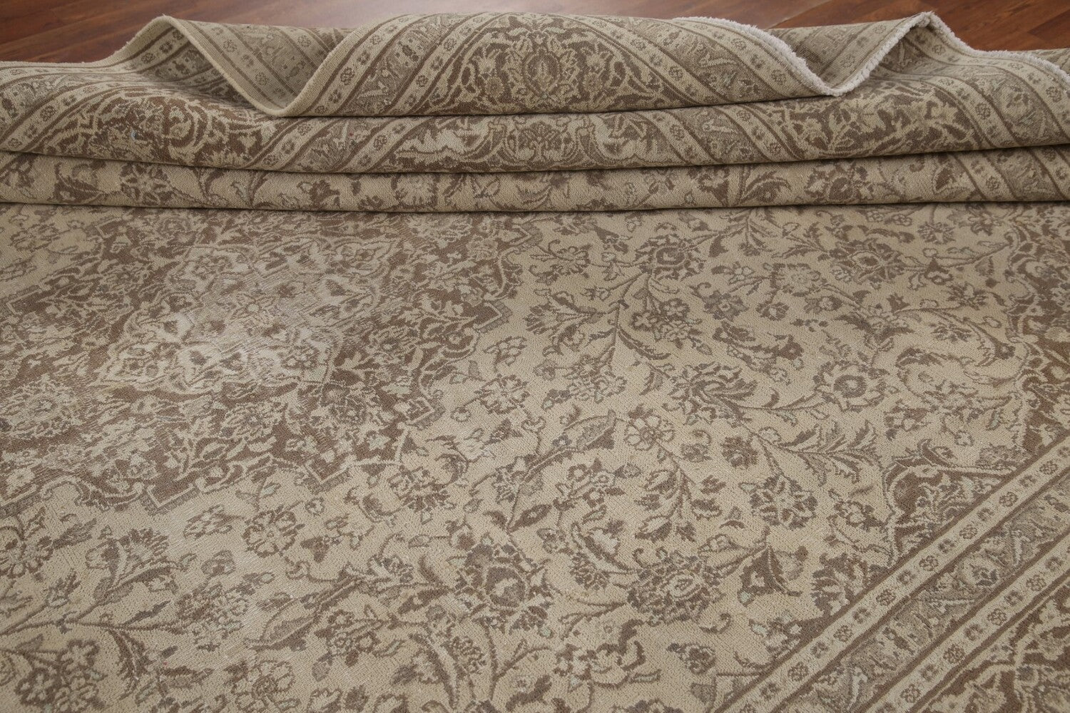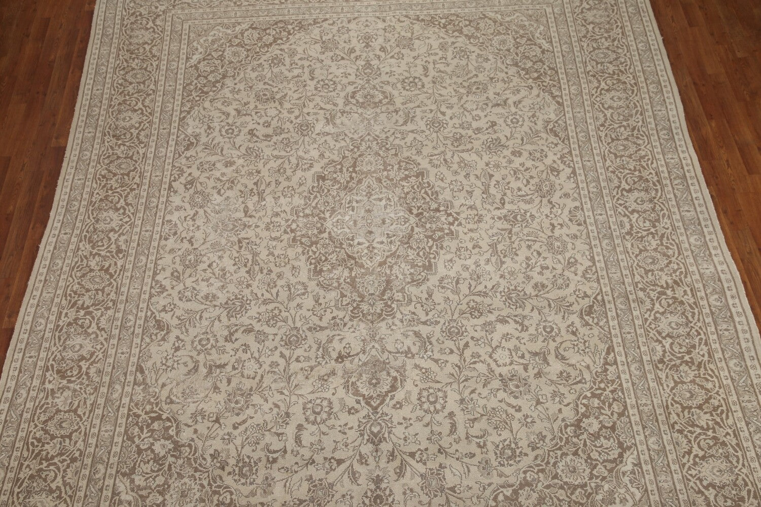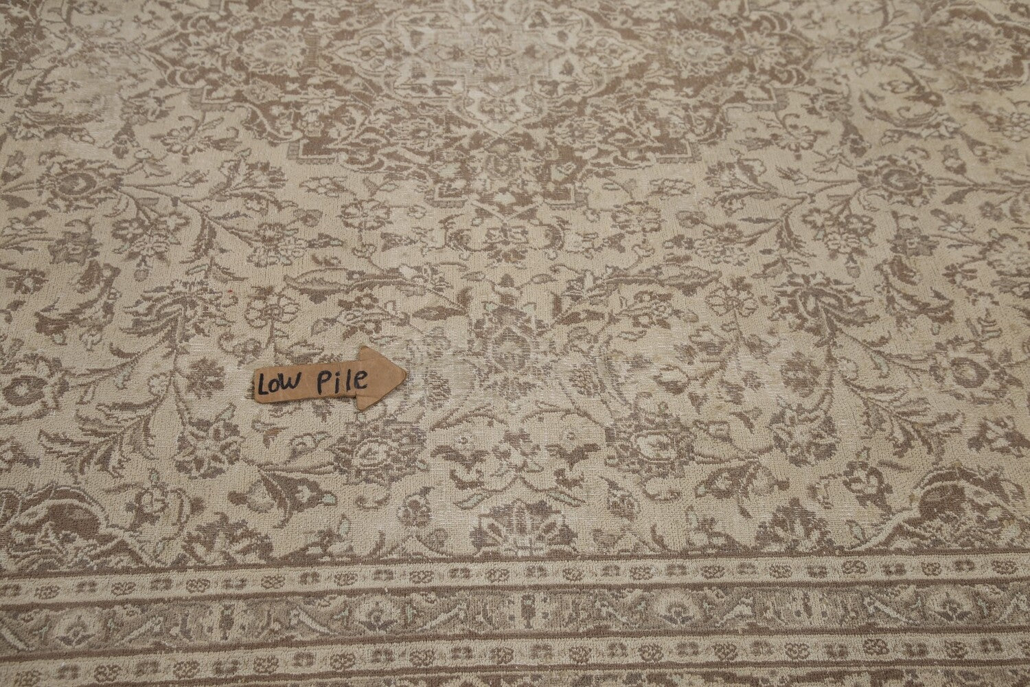 A Beautiful Genuine Persia ( Persia ) Mashad rug is Hand Knotted by skillful weavers in Persia ( Persia ) with 100% Wool Material. This rug is in Very Good ( Low Pile ) condition. dimensions are 12' 4'' X 9' 6'' in foot and 376 X 290 in centimeter. the primary color is Beige & Ivories.