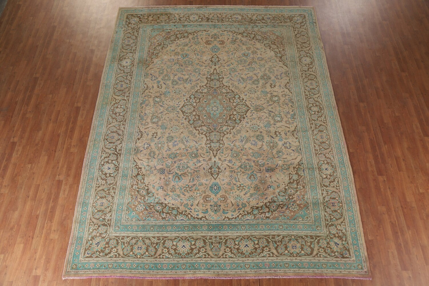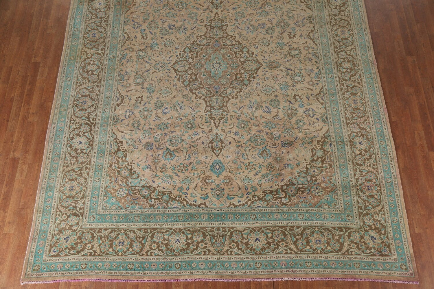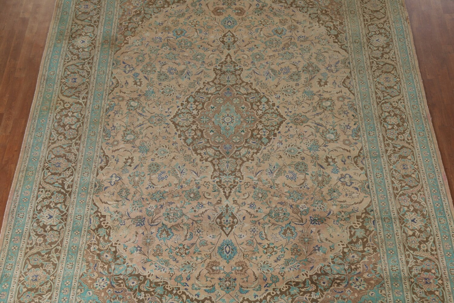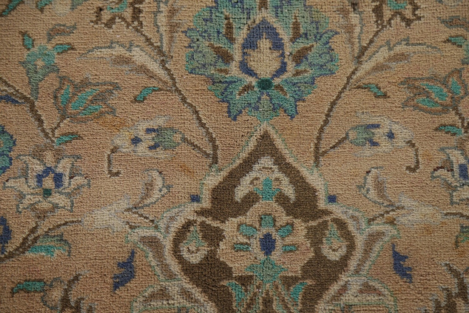 A Beautiful Genuine Persia ( Persia ) Mashad rug is Hand Knotted by skillful weavers in Persia ( Persia ) with 100% Wool Material. This rug is in Good (Evenly Low Pile-Missing Pile) condition. dimensions are 12' 9'' X 9' 10'' in foot and 389 X 300 in centimeter. the primary color is Peach.