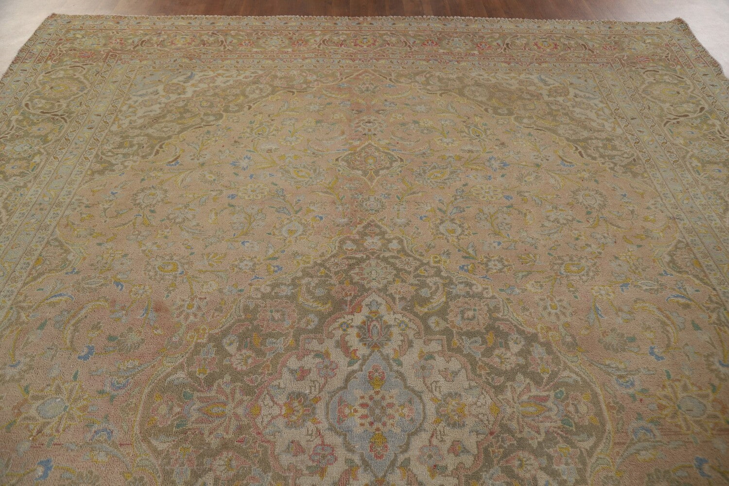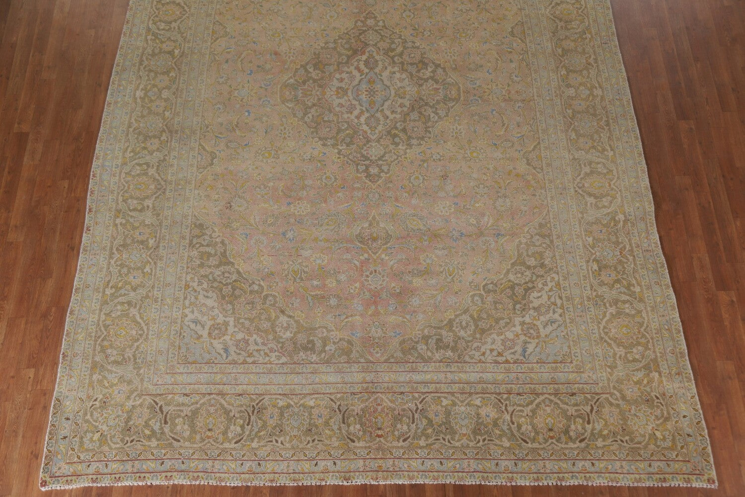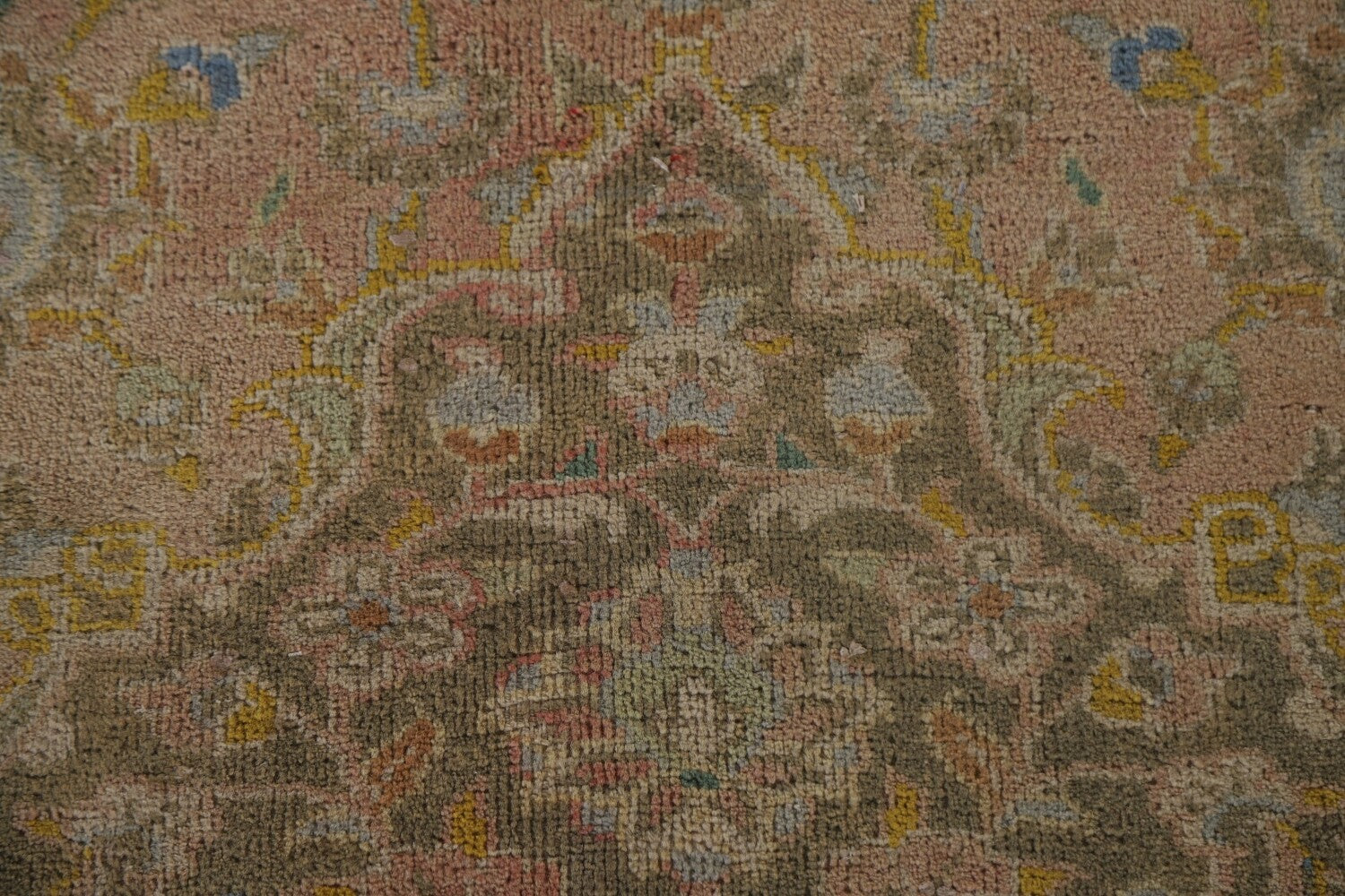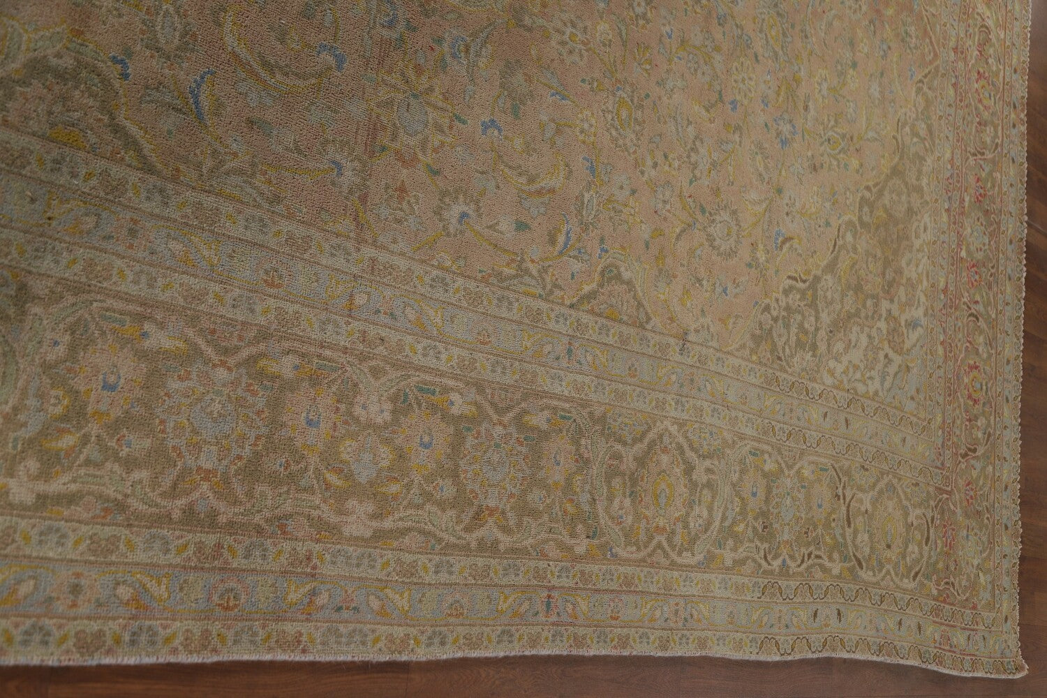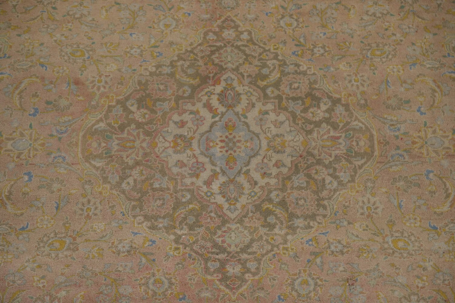 A Beautiful Genuine Persia ( Persia ) Mashad rug is Hand Knotted by skillful weavers in Persia ( Persia ) with 100% Wool Material. This rug is in Very Good (Evenly Low Pile-small Repair) condition. dimensions are 13' 0'' X 9' 6'' in foot and 396 X 290 in centimeter. the primary color is Pink.
