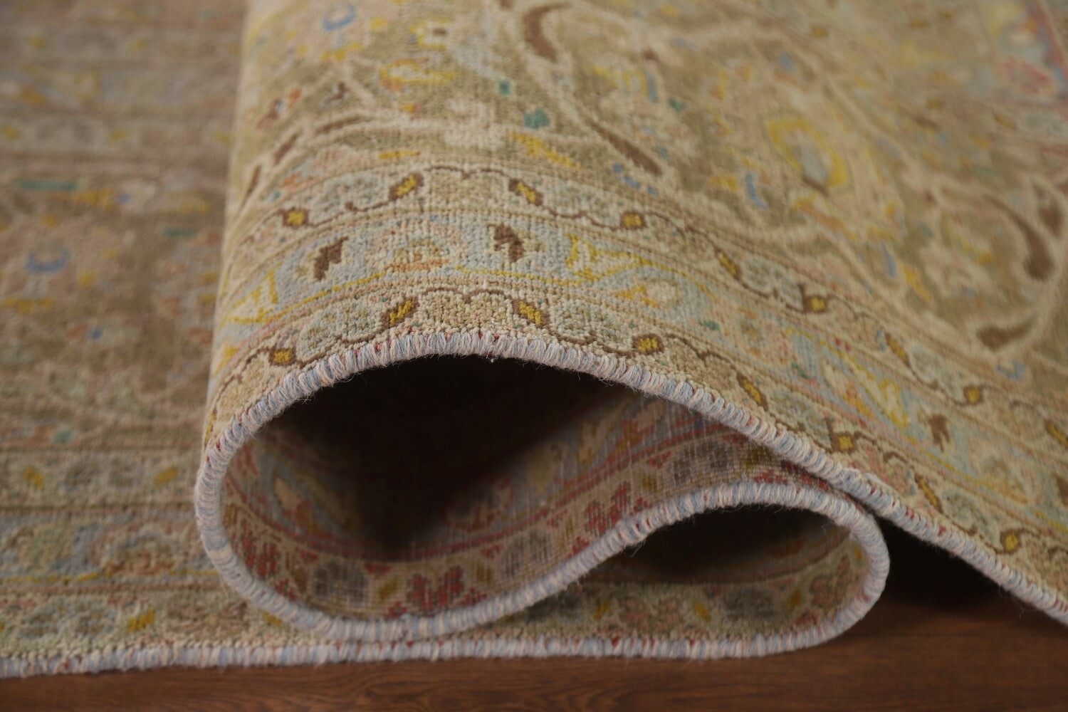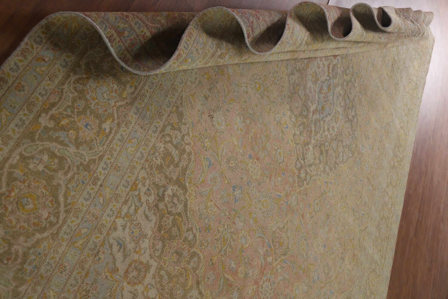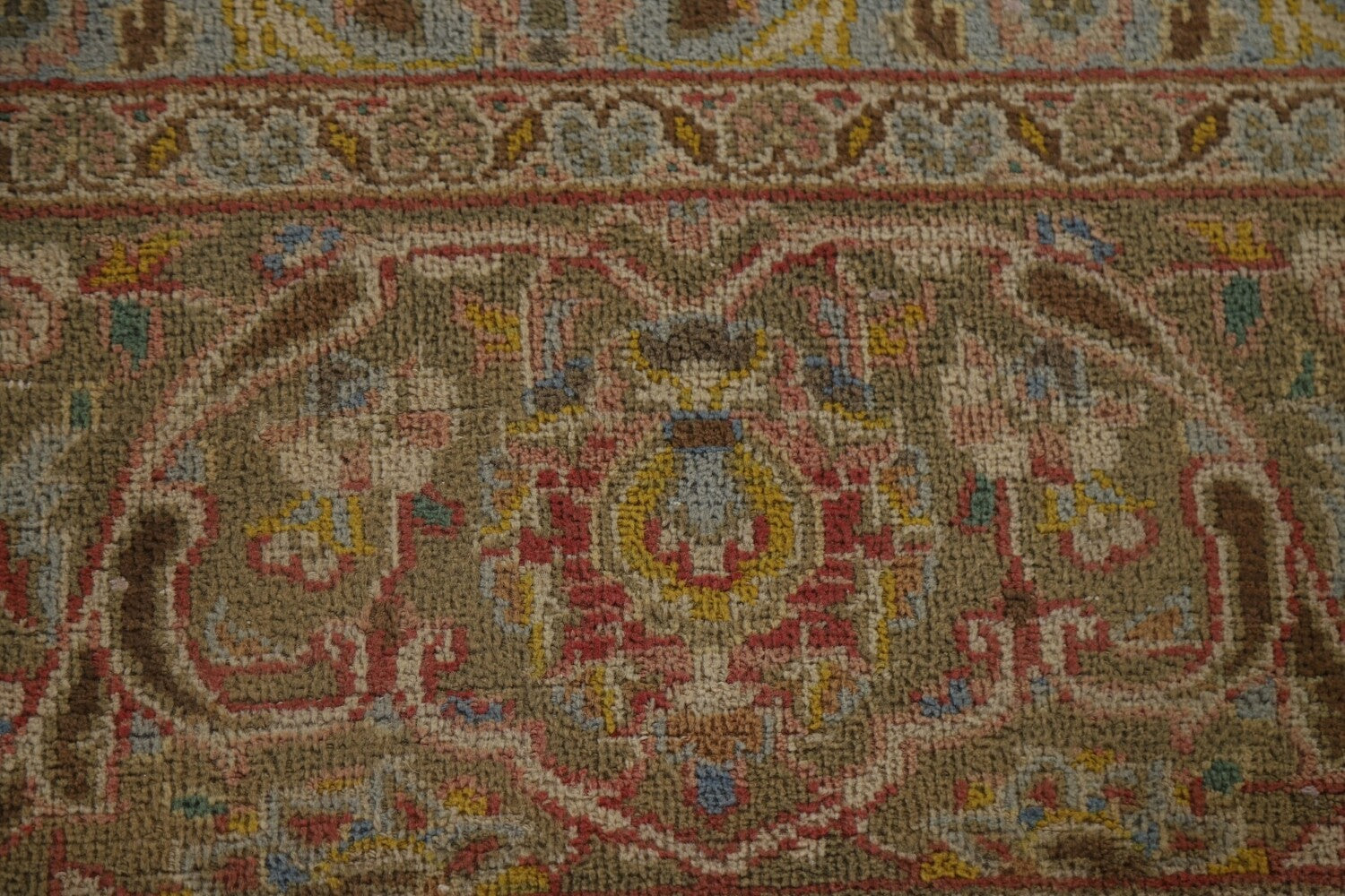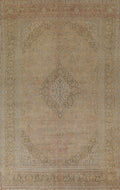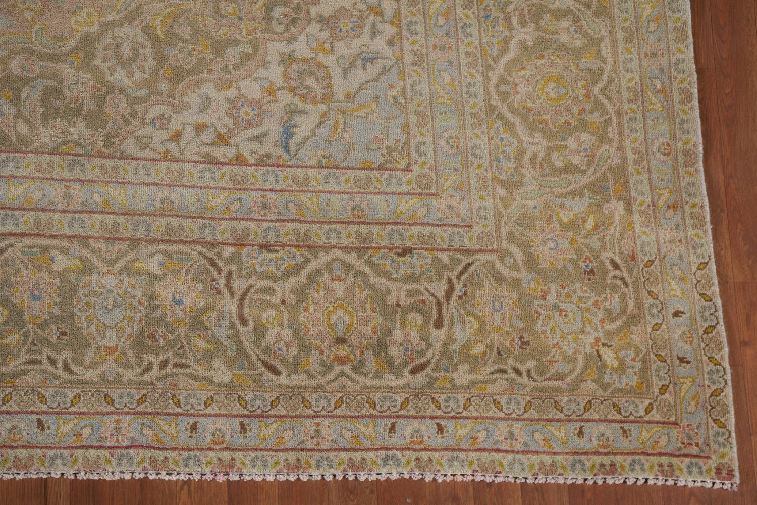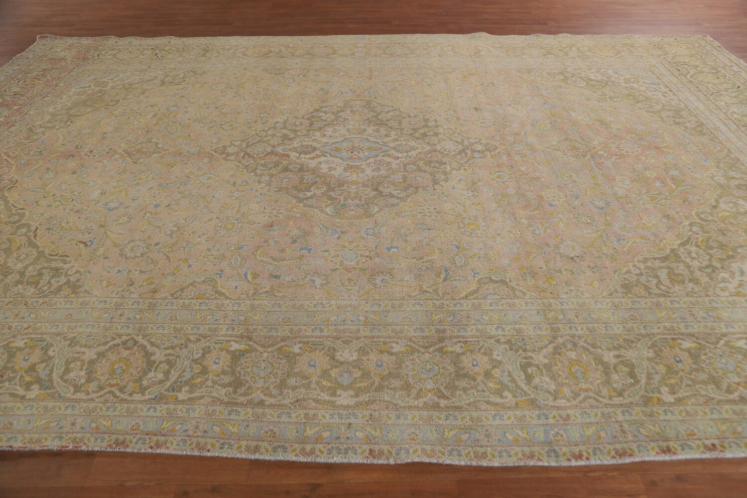 A Beautiful Genuine Persia ( Persia ) Mashad rug is Hand Knotted by skillful weavers in Persia ( Persia ) with 100% Wool Material. This rug is in Very Good (Evenly Low Pile-small Repair) condition. dimensions are 13' 0'' X 9' 6'' in foot and 396 X 290 in centimeter. the primary color is Pink.
