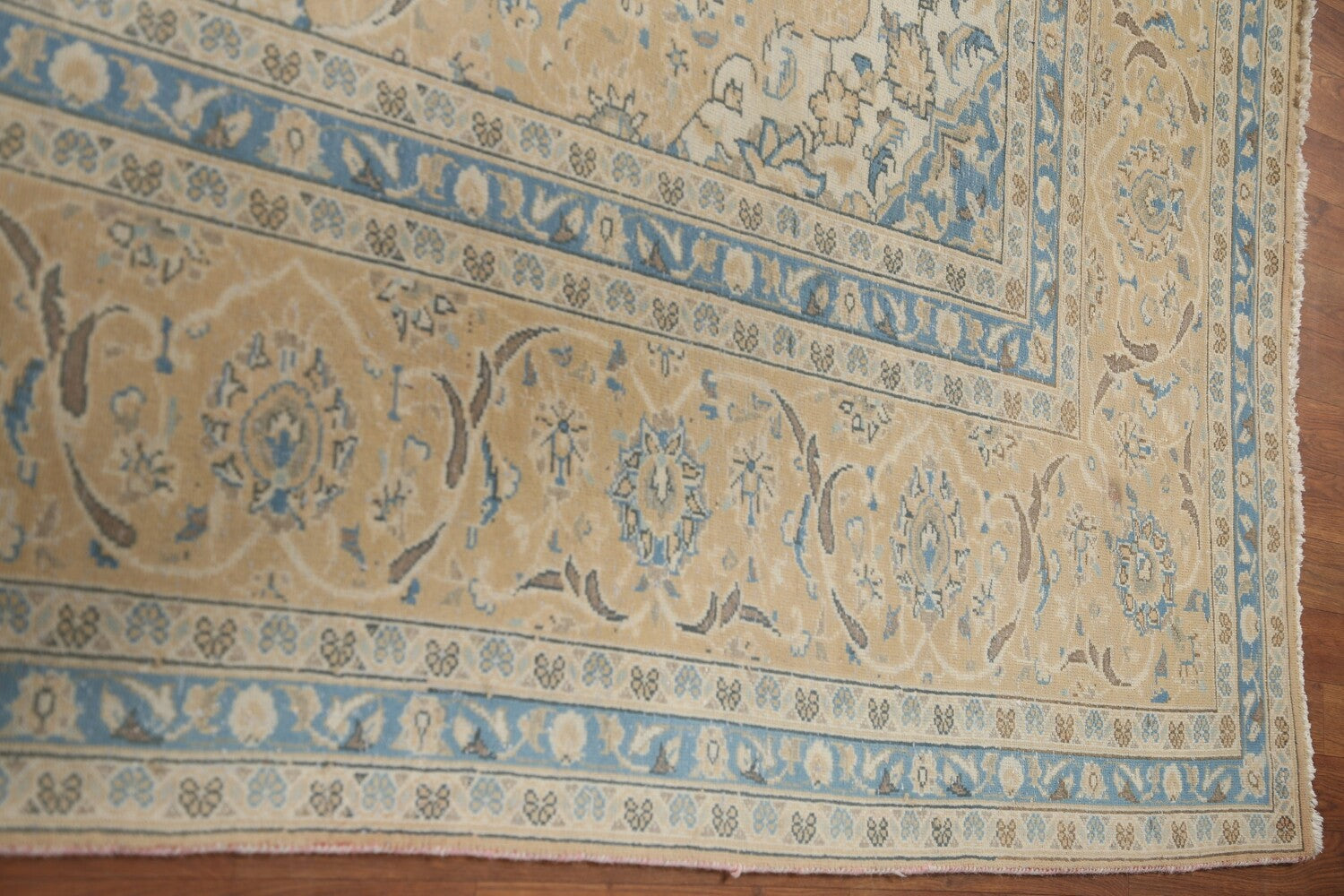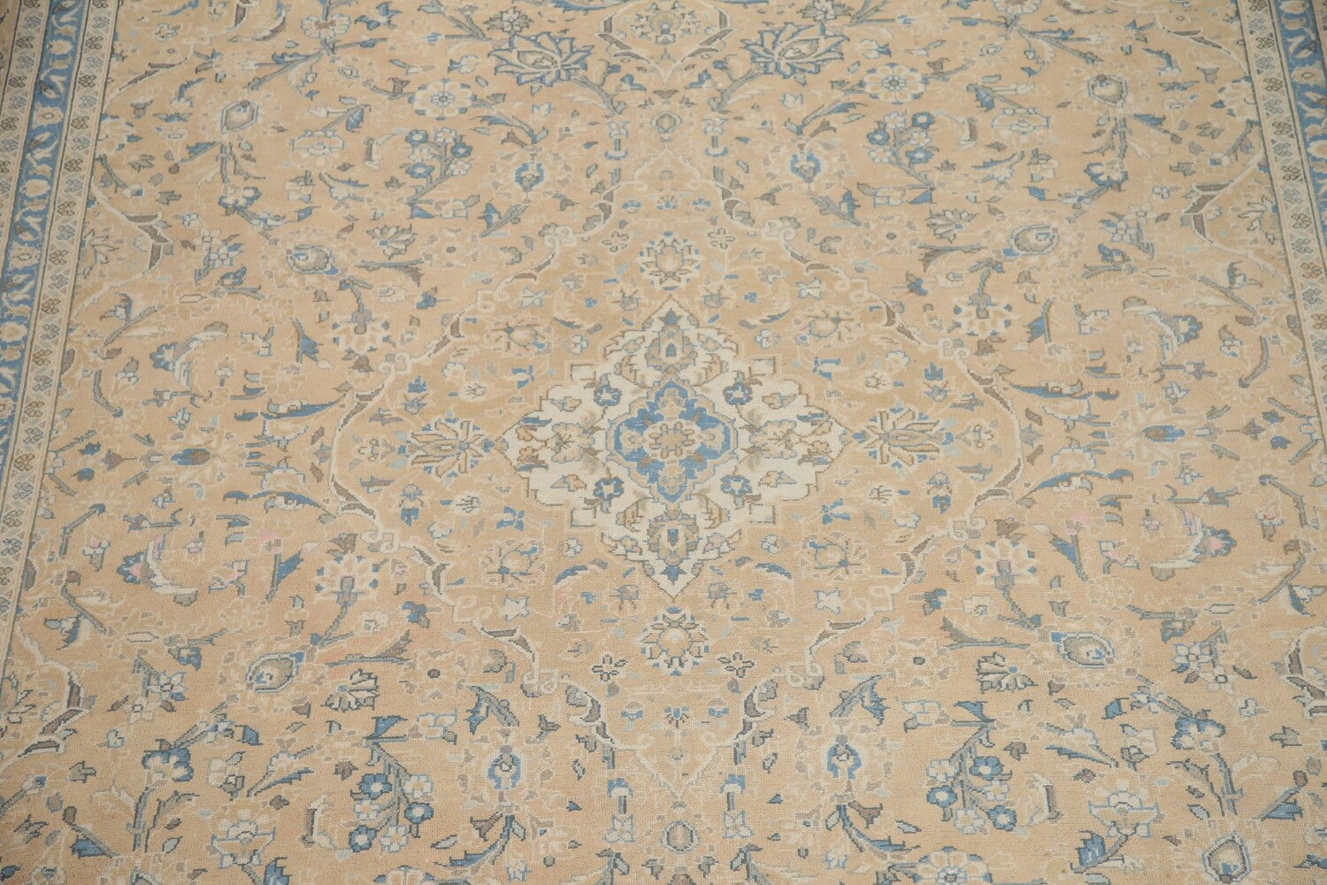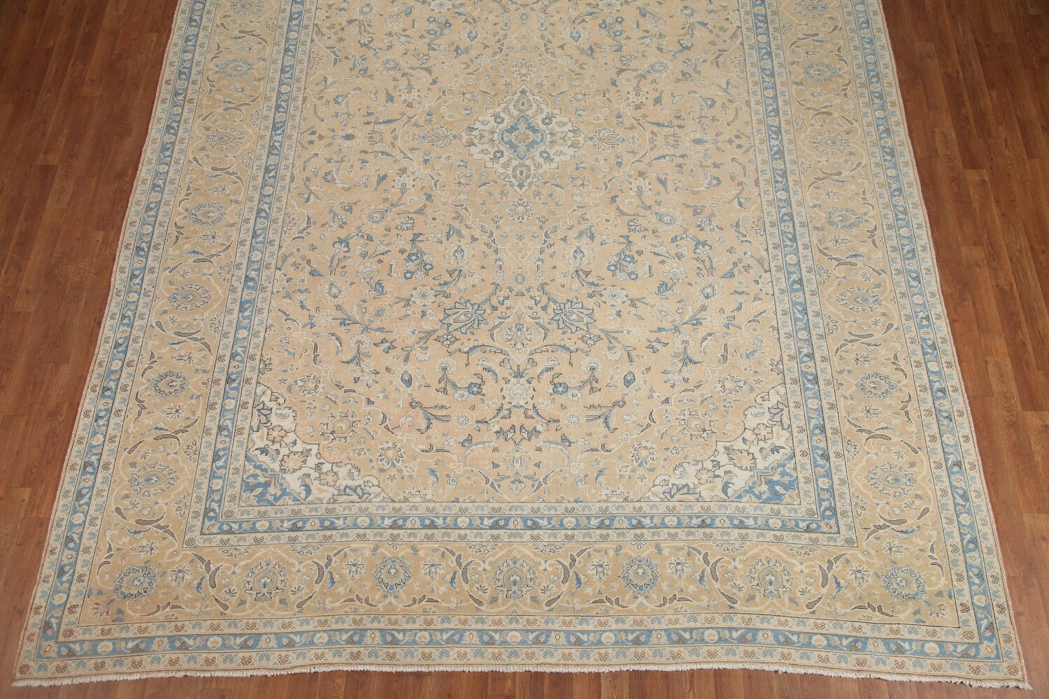 A Beautiful Genuine Persia ( Persia ) Mashad rug is Hand Knotted by skillful weavers in Persia ( Persia ) with 100% Wool Material. This rug is in Very Good (Evenly Low Pile) condition. dimensions are 13' 1'' X 9' 11'' in foot and 399 X 302 in centimeter. the primary color is Peach.