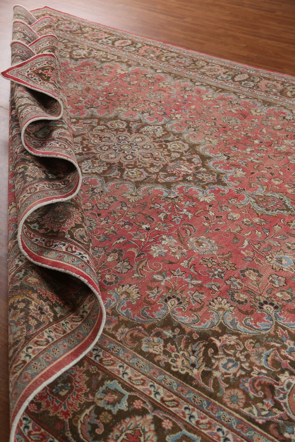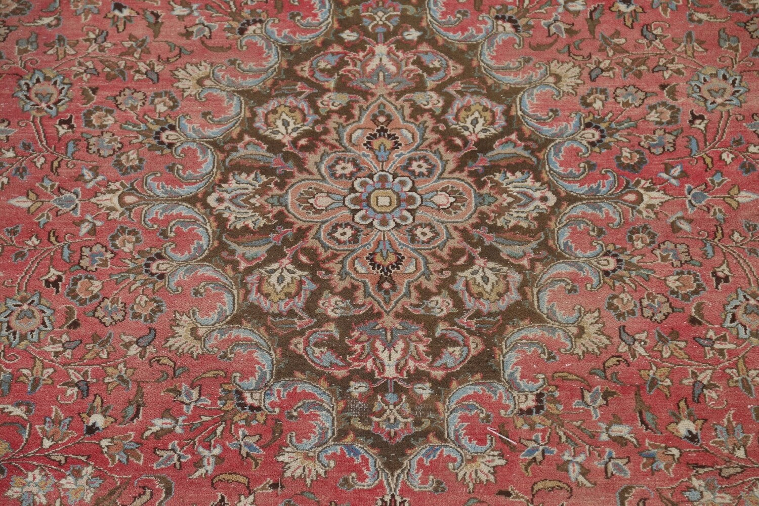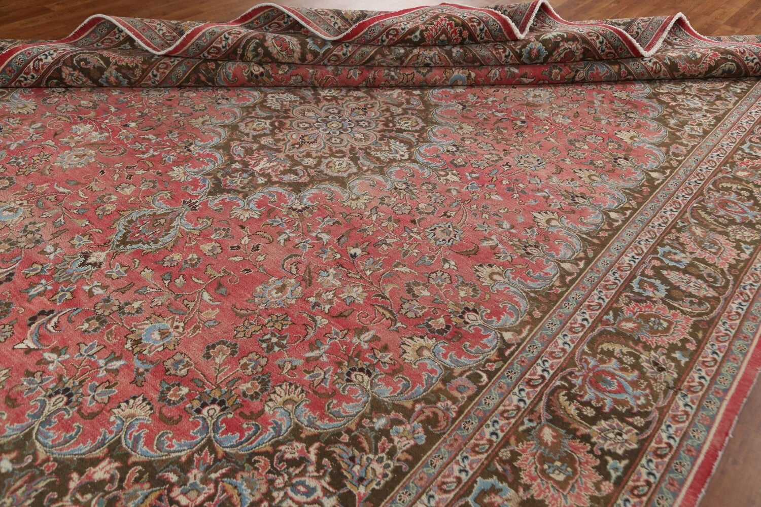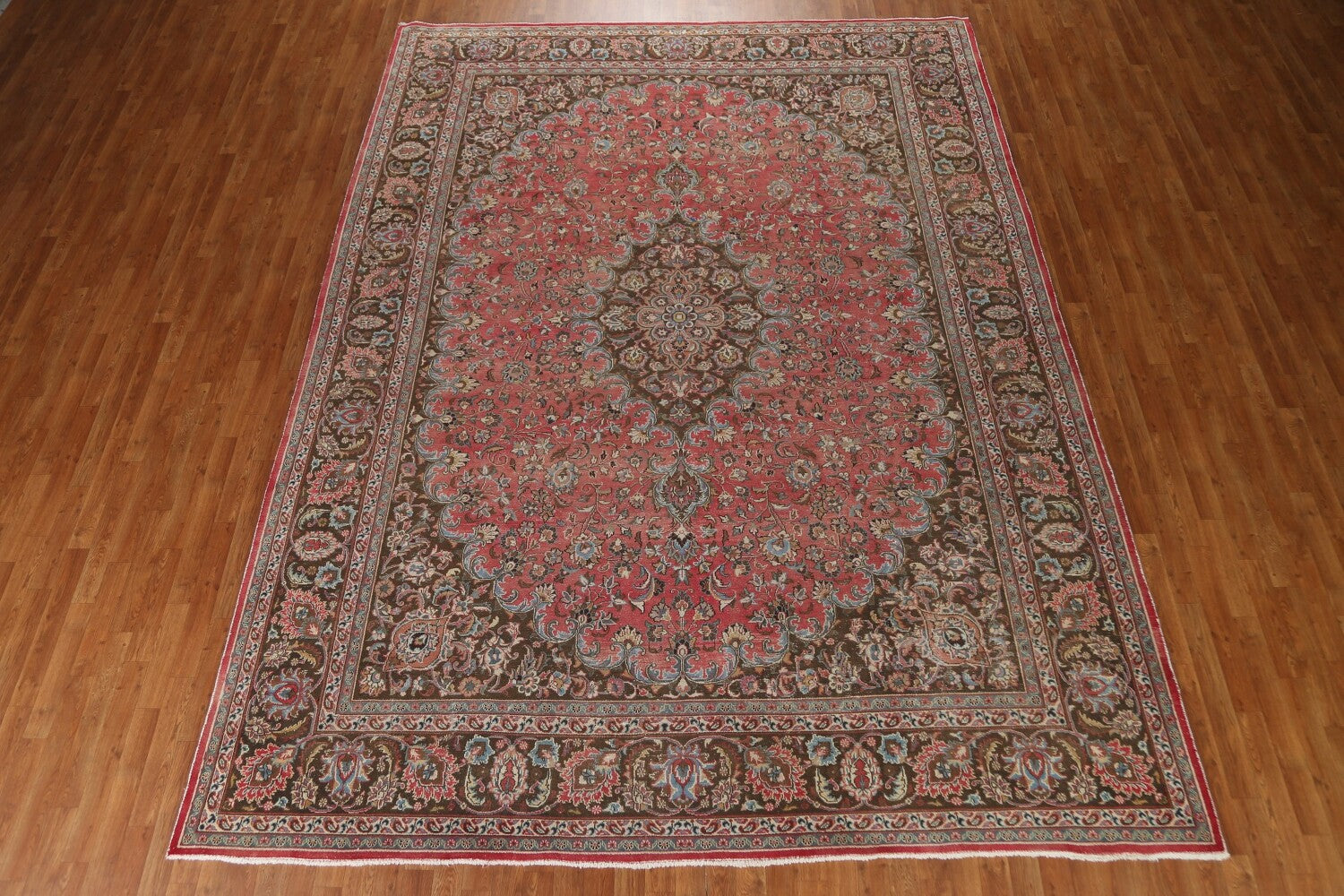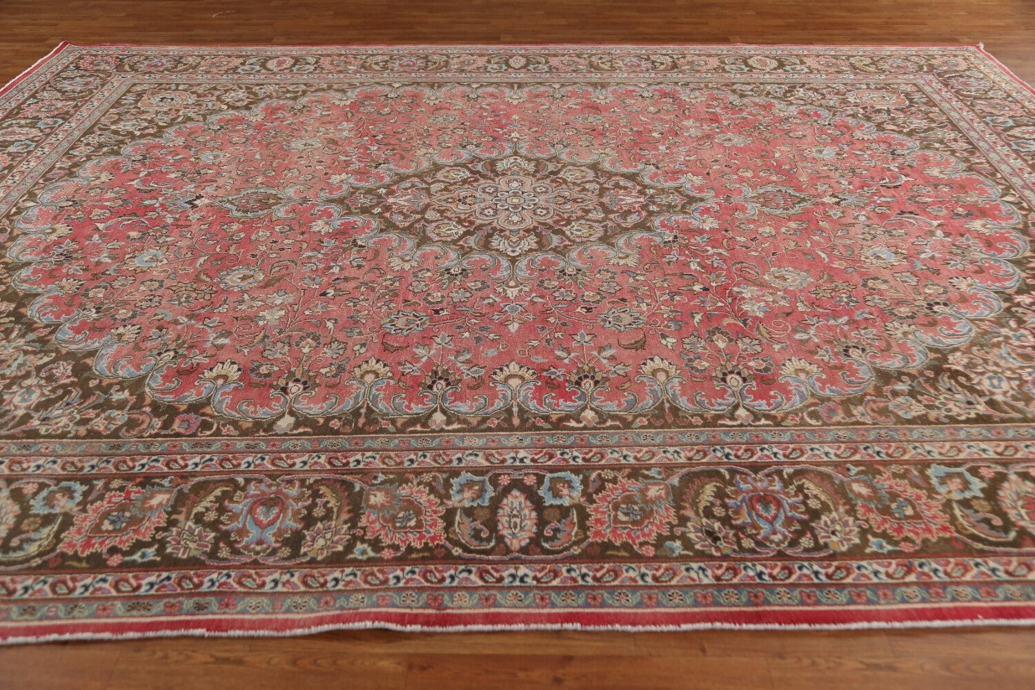 A Beautiful Genuine Persia ( Persia ) Mashad rug is Hand Knotted by skillful weavers in Persia ( Persia ) with 100% Wool Material. This rug is in Very Good (Evenly Low Pile) condition. dimensions are 12' 8'' X 9' 6'' in foot and 386 X 290 in centimeter. the primary color is Pink.