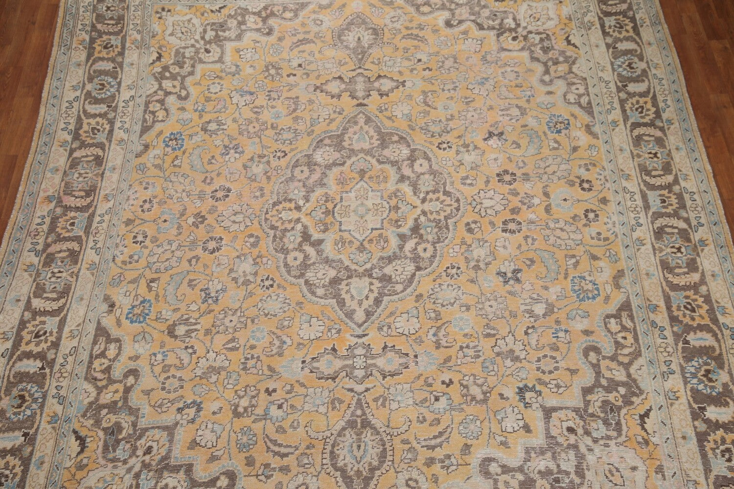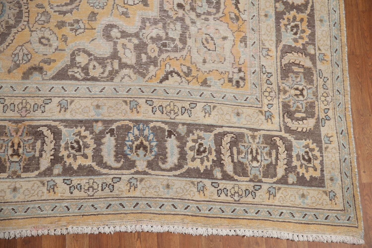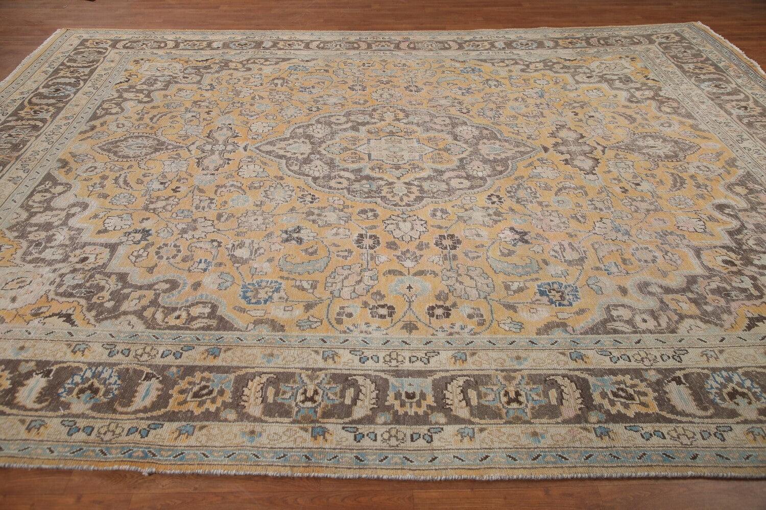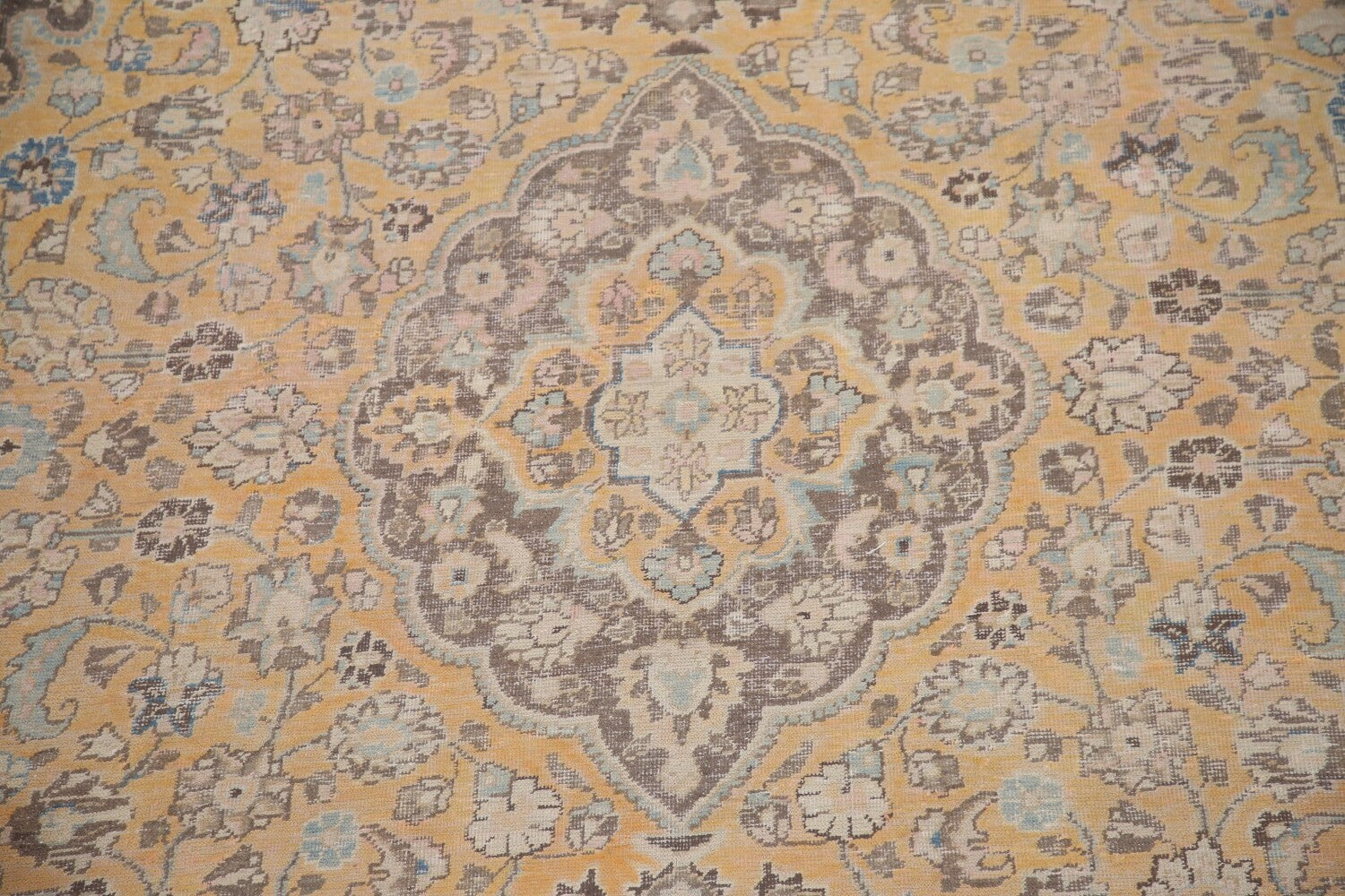 A Beautiful Genuine Persia ( Persia ) Mashad rug is Hand Knotted by skillful weavers in Persia ( Persia ) with 100% Wool Material. This rug is in Very Good (Evenly Low Pile) condition. dimensions are 12' 5'' X 9' 4'' in foot and 378 X 284 in centimeter. the primary color is Yellow & Gold.
