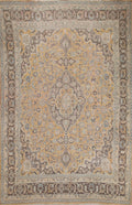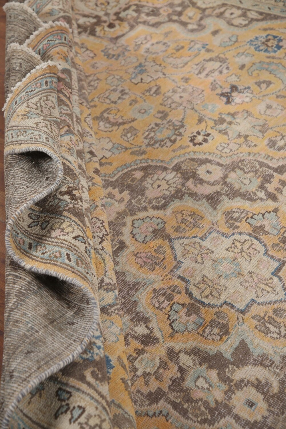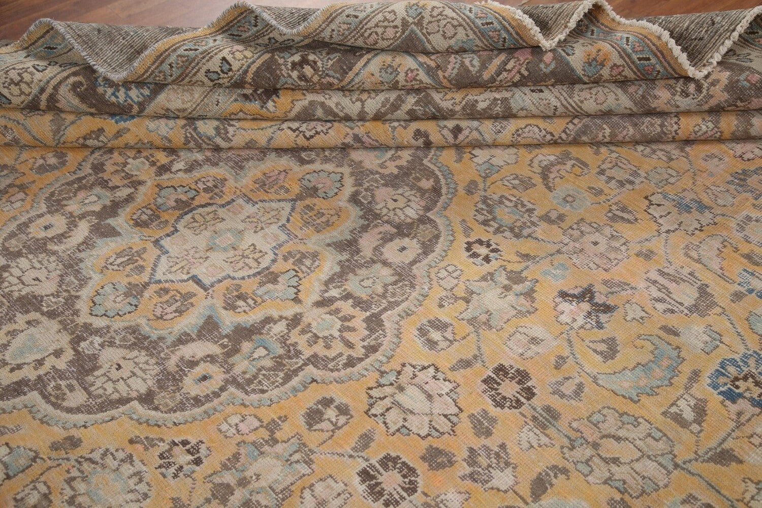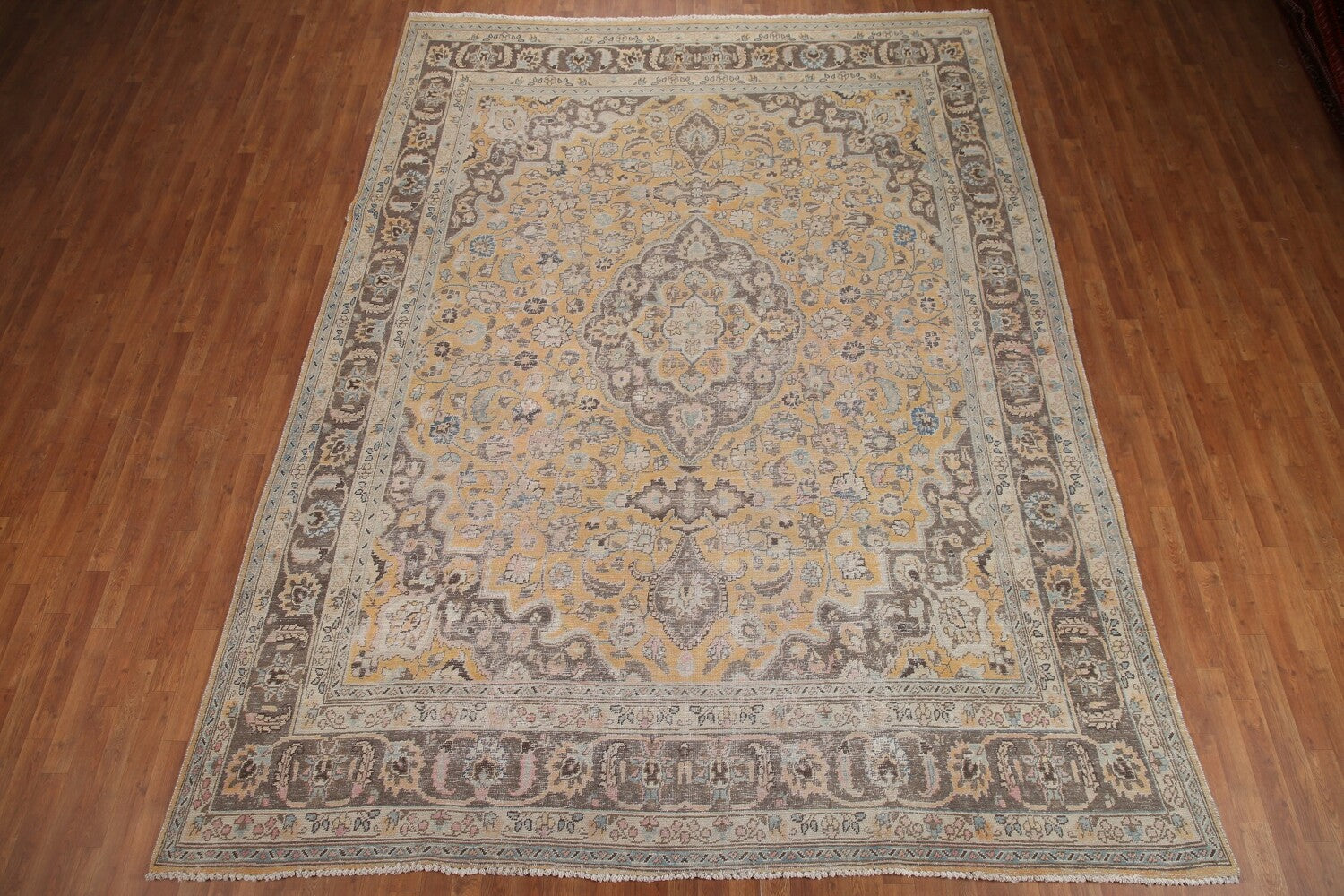 A Beautiful Genuine Persia ( Persia ) Mashad rug is Hand Knotted by skillful weavers in Persia ( Persia ) with 100% Wool Material. This rug is in Very Good (Evenly Low Pile) condition. dimensions are 12' 5'' X 9' 4'' in foot and 378 X 284 in centimeter. the primary color is Yellow & Gold.