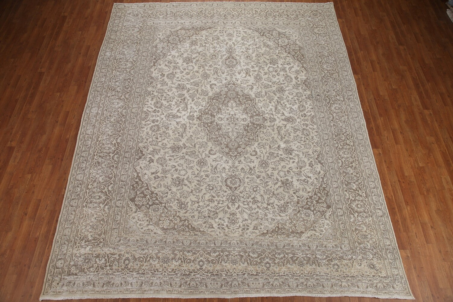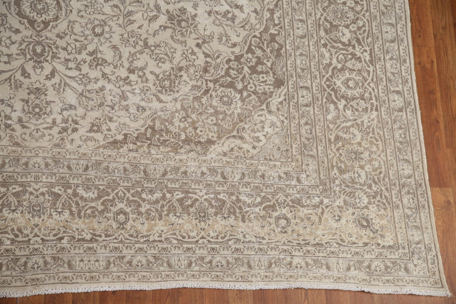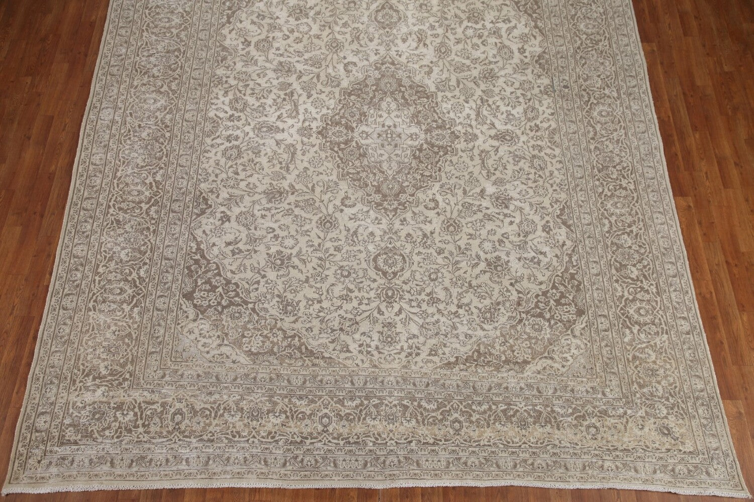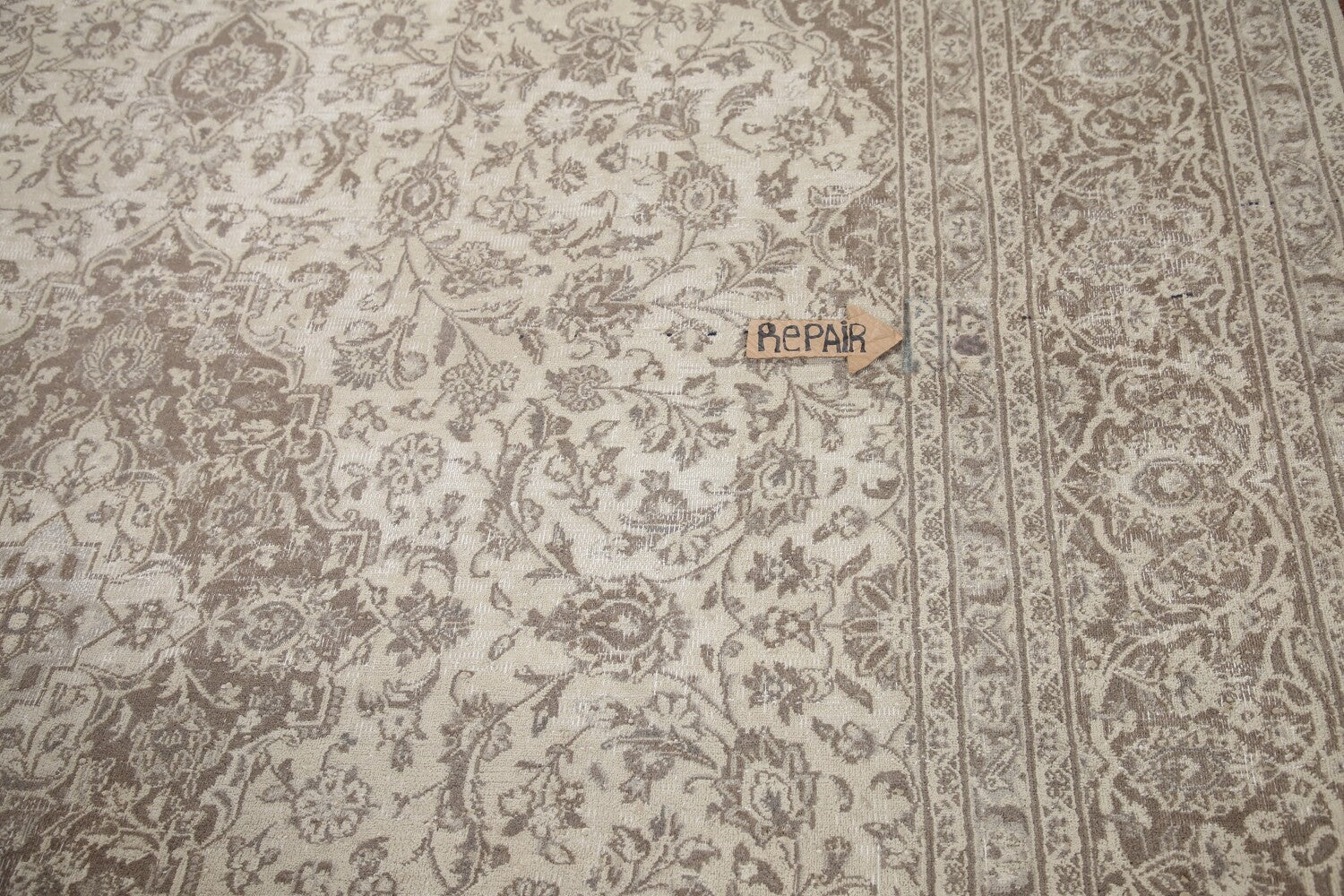 A Beautiful Genuine Persia ( Persia ) Mashad rug is Hand Knotted by skillful weavers in Persia ( Persia ) with 100% Wool Material. This rug is in Very Good (Evenly Low Pile-Repair) condition. dimensions are 12' 1'' X 9' 5'' in foot and 368 X 287 in centimeter. the primary color is Beige & Ivories.