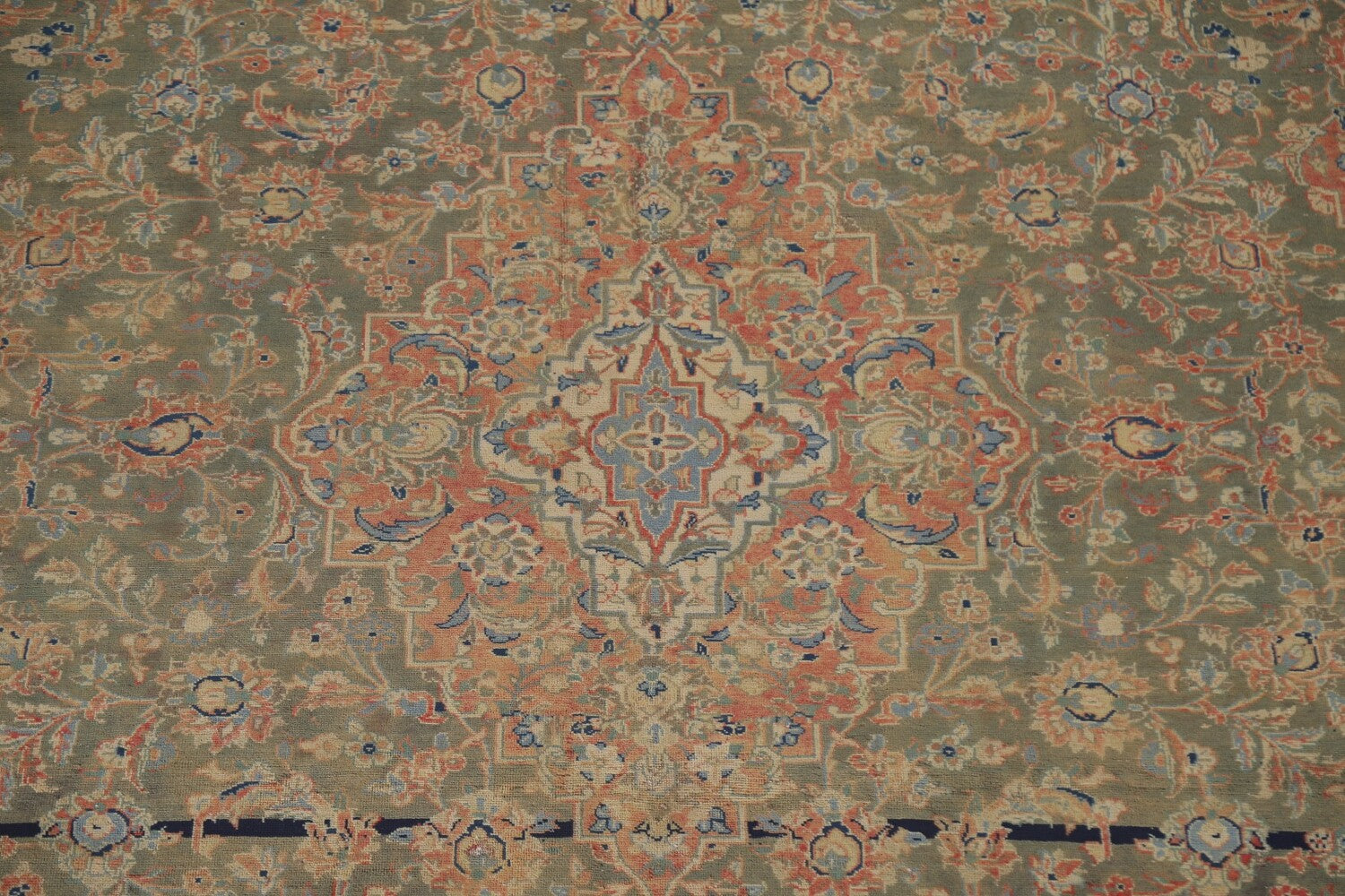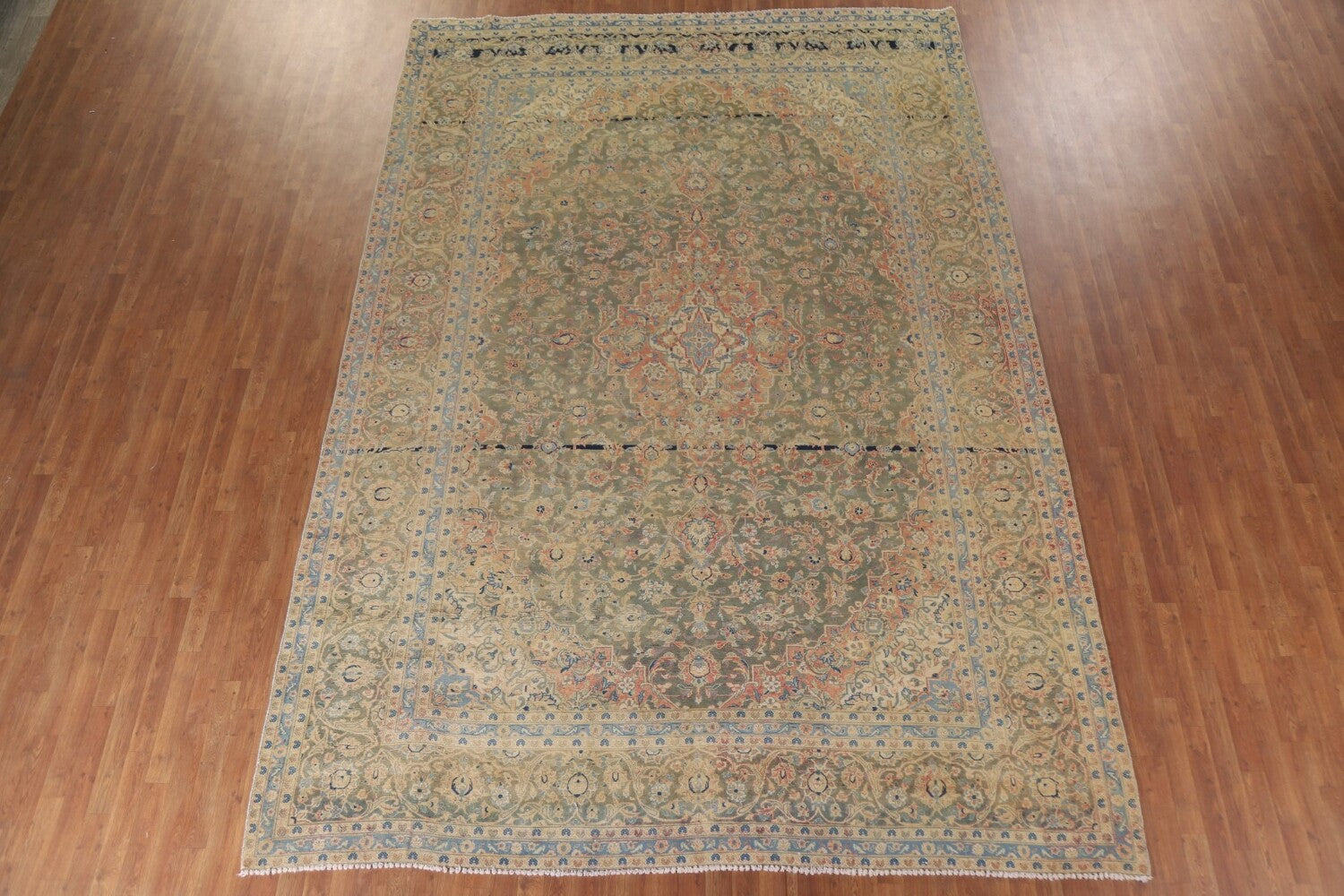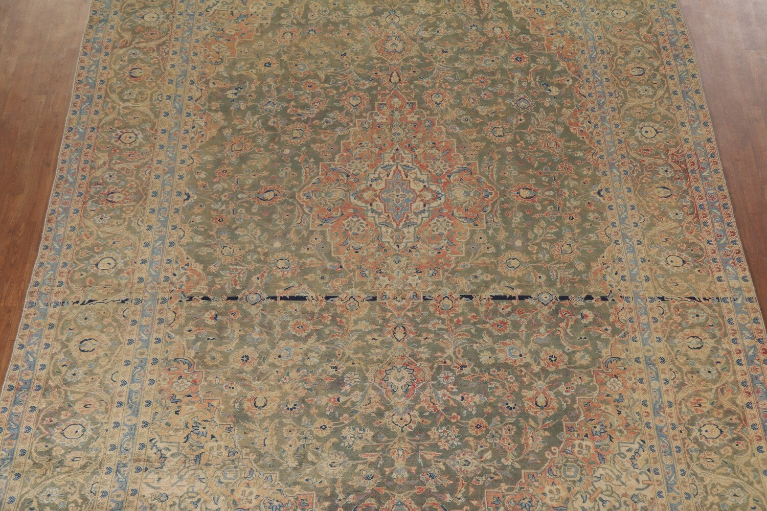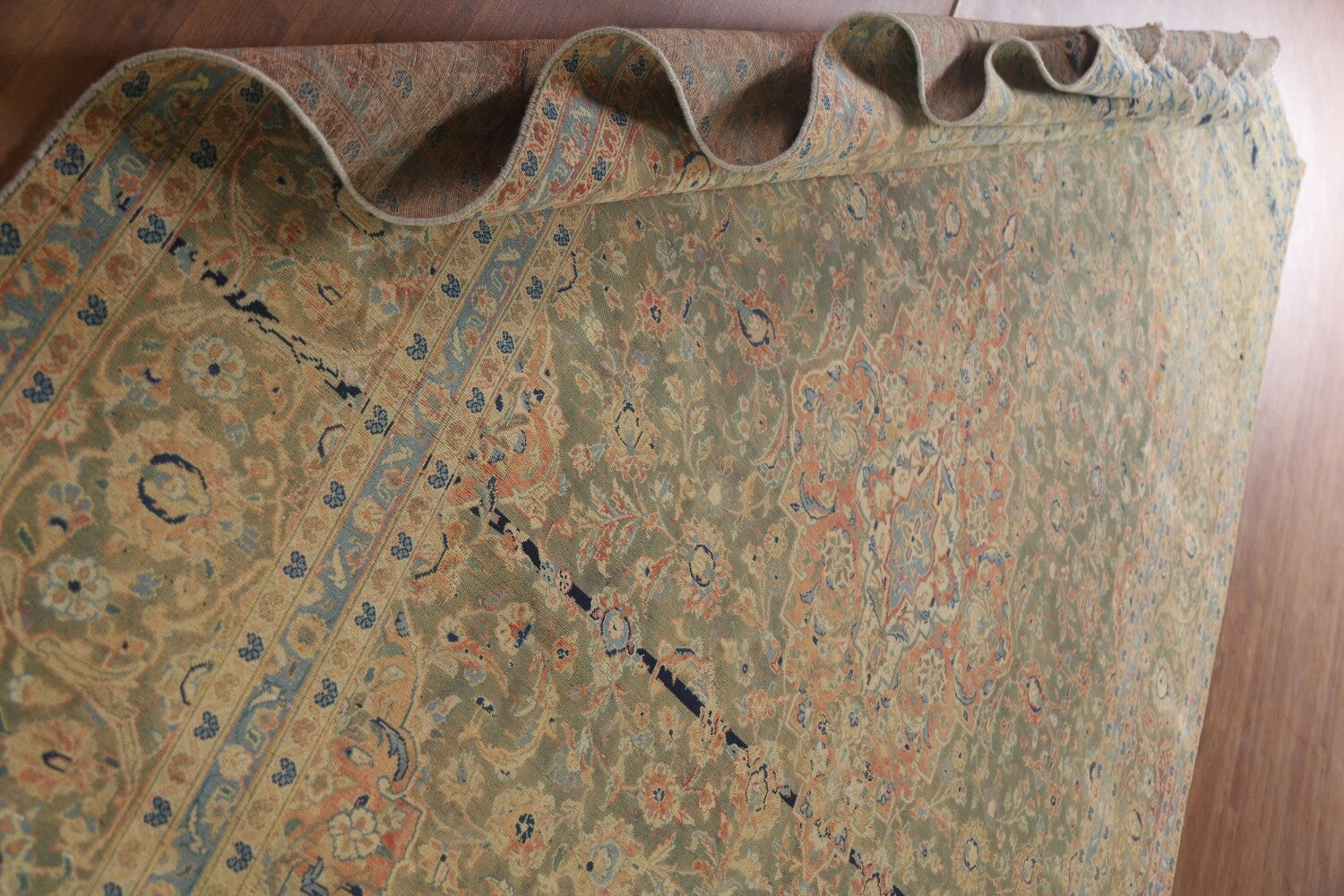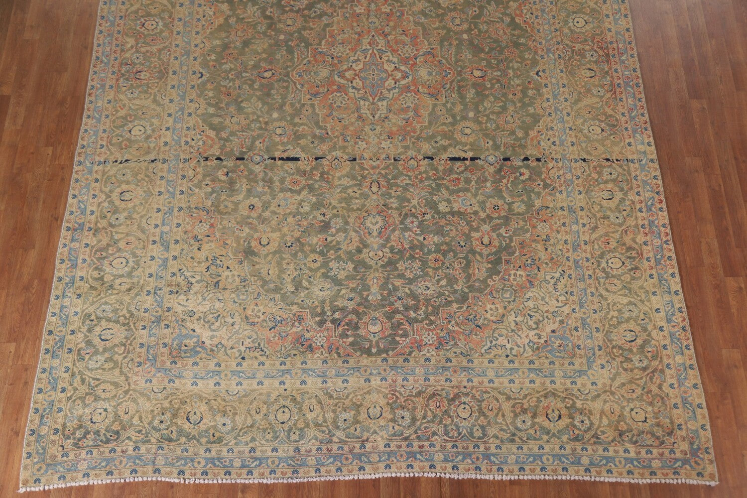 A Beautiful Genuine Persia ( Persia ) Mashad rug is Hand Knotted by skillful weavers in Persia ( Persia ) with 100% Wool Material. This rug is in Very Good (Evenly Low Pile-Abrash) condition. dimensions are 13' 7'' X 9' 4'' in foot and 414 X 284 in centimeter. the primary color is Green.