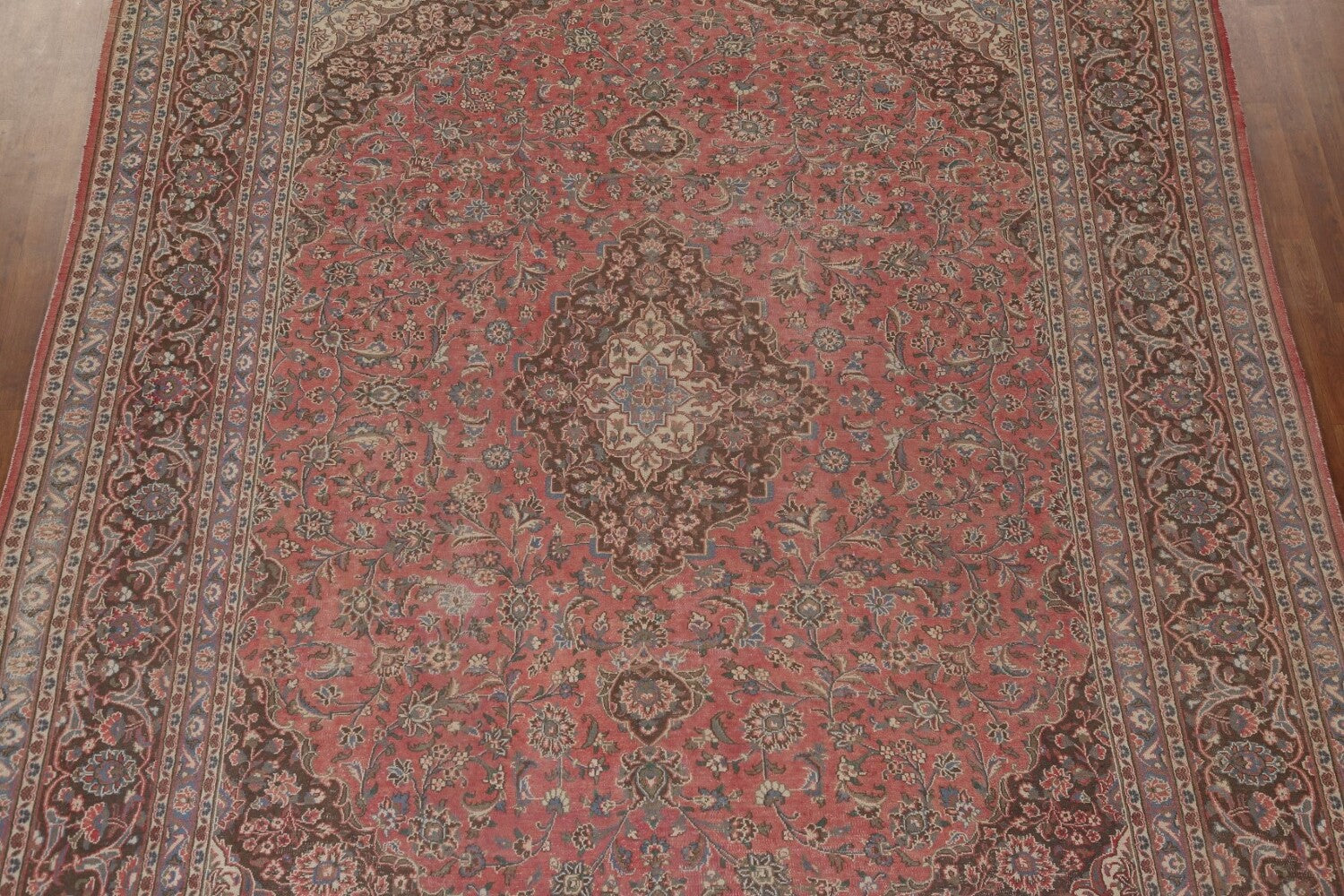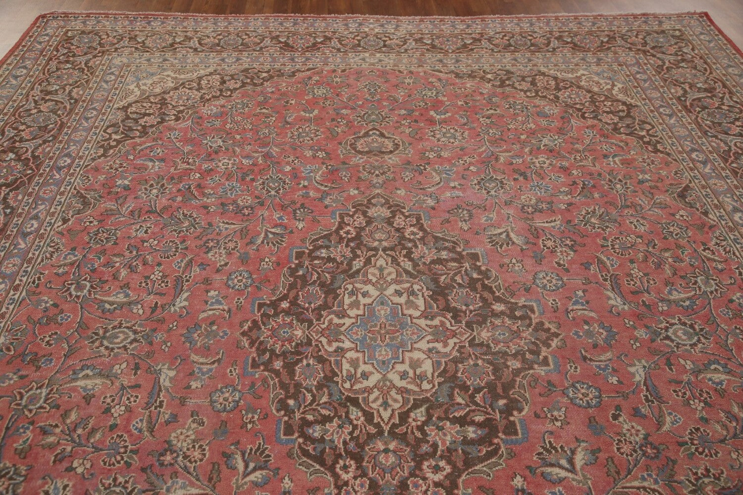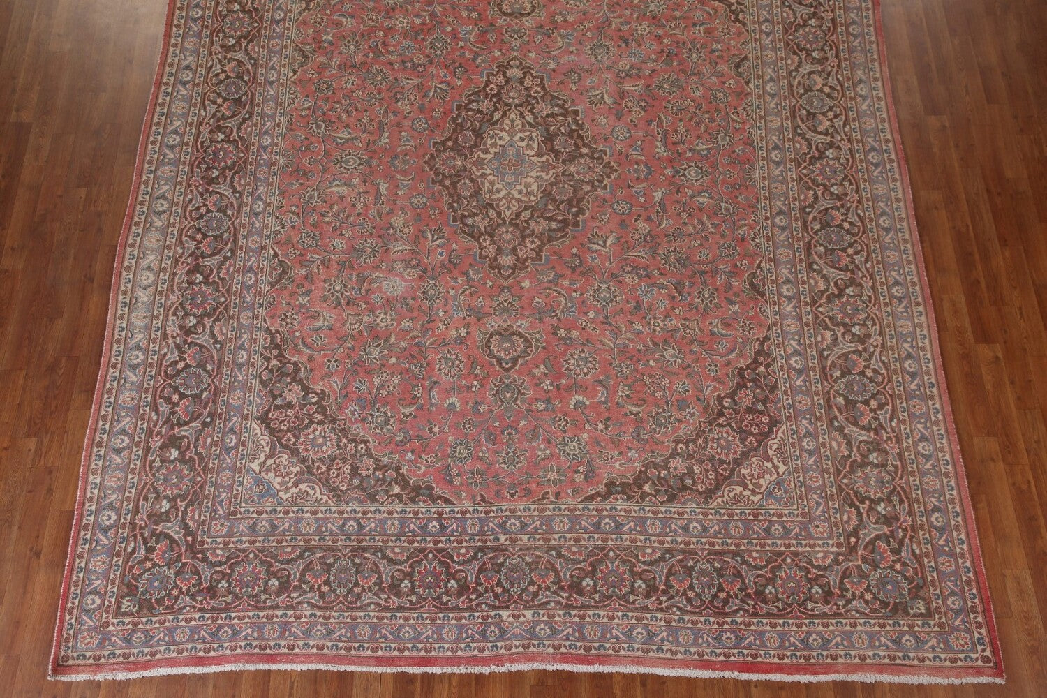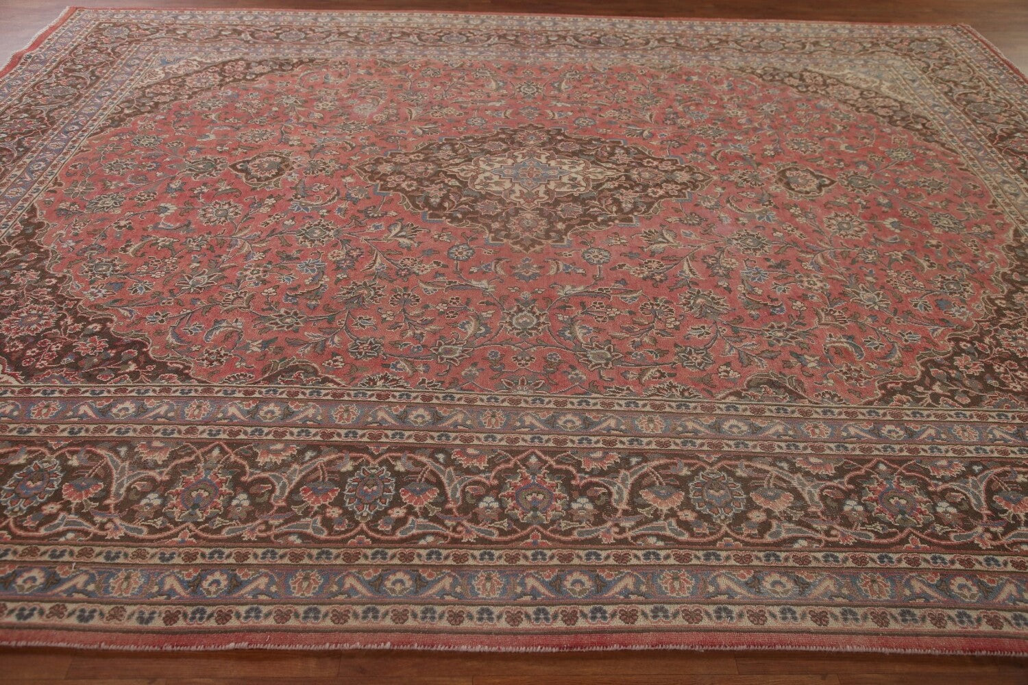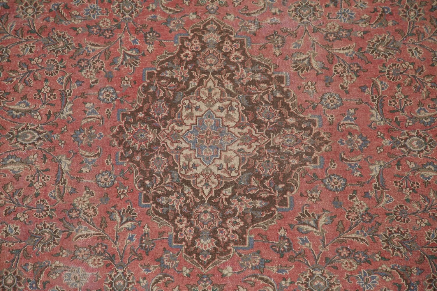 A Beautiful Genuine Persia ( Persia ) Kashan rug is Hand Knotted by skillful weavers in Persia ( Persia ) with 100% Wool Material. This rug is in Very Good (Low Pile) condition. dimensions are 12' 1'' X 9' 8'' in foot and 368 X 295 in centimeter. the primary color is Pink.