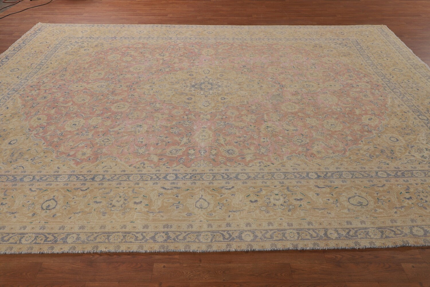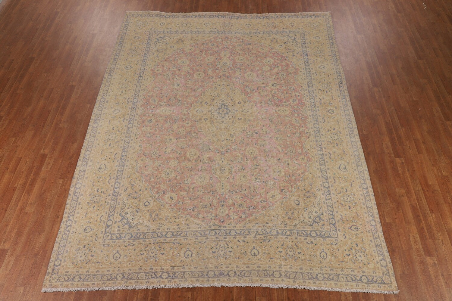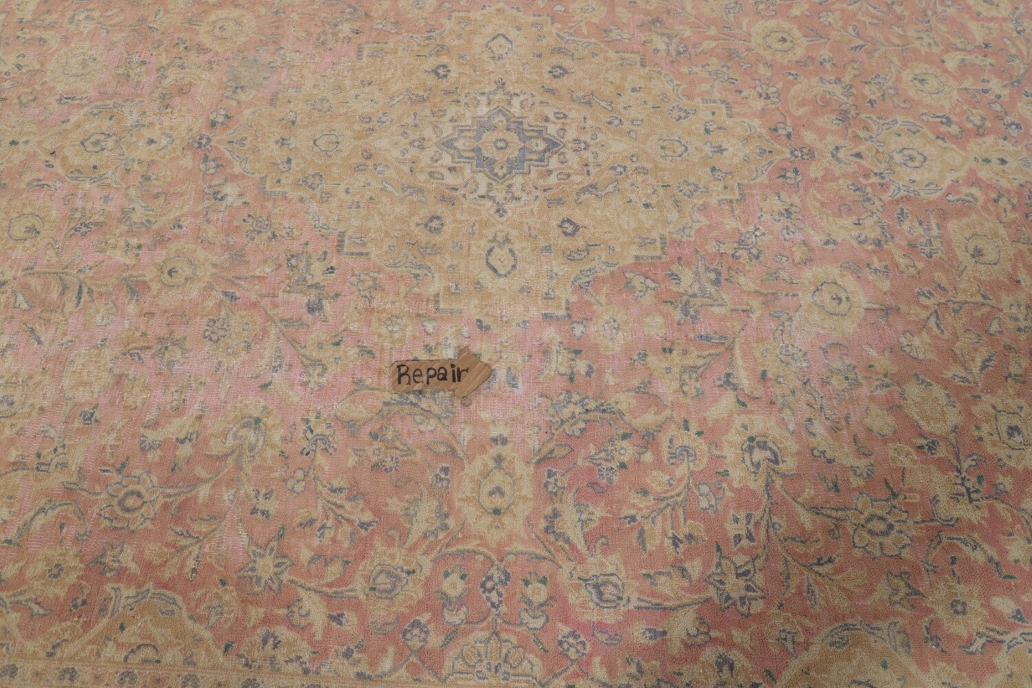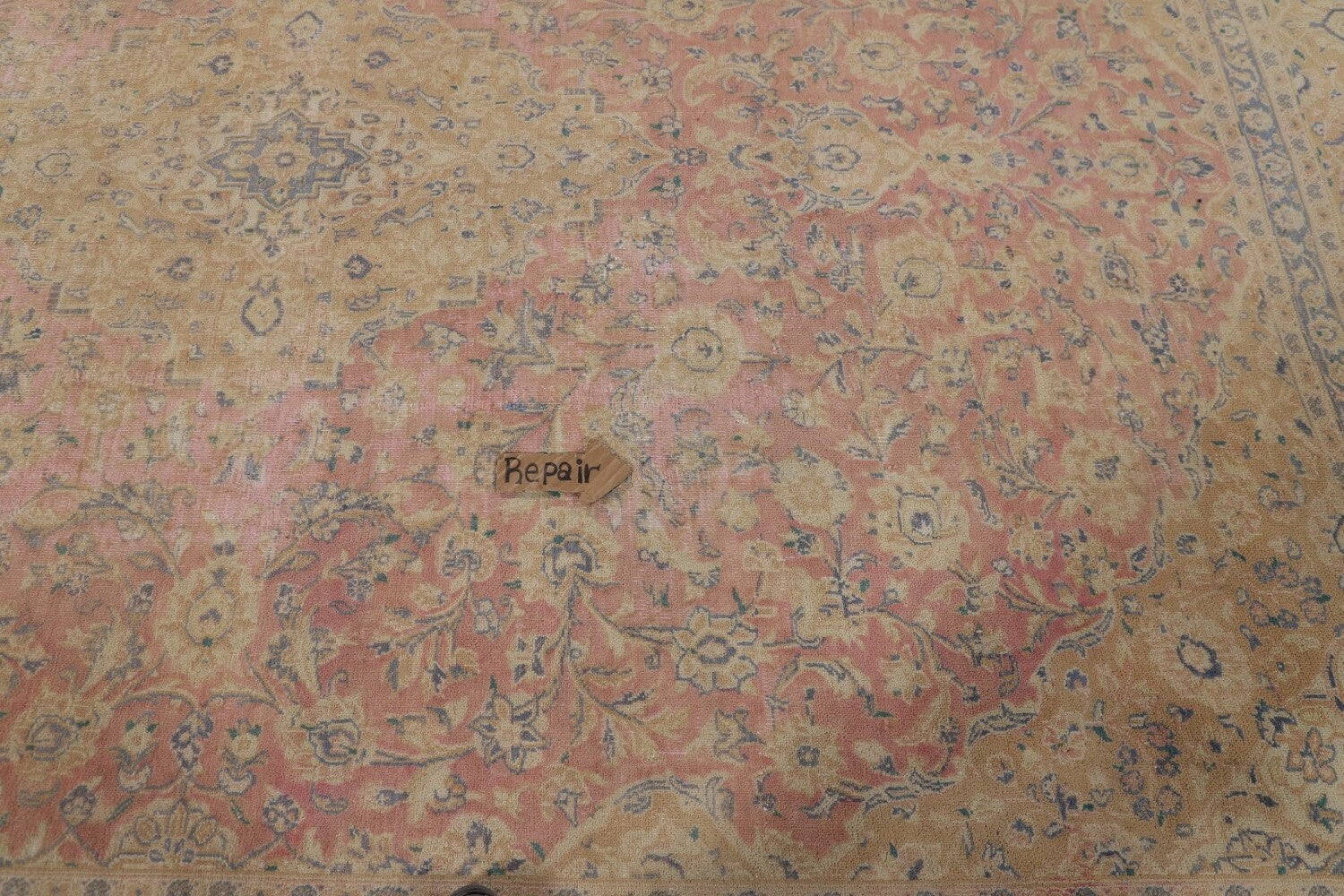 A Beautiful Genuine Persia ( Persia ) Mashad rug is Hand Knotted by skillful weavers in Persia ( Persia ) with 100% Wool Material. This rug is in Very Good ( Low Pile, Worn area, Repair ) condition. dimensions are 12' 2'' X 9' 7'' in foot and 371 X 292 in centimeter. the primary color is Pink.