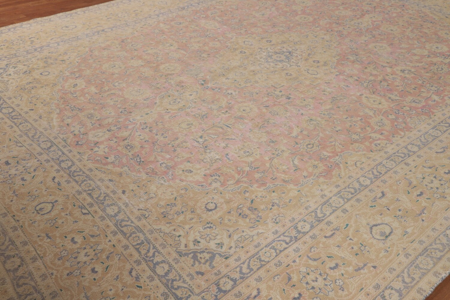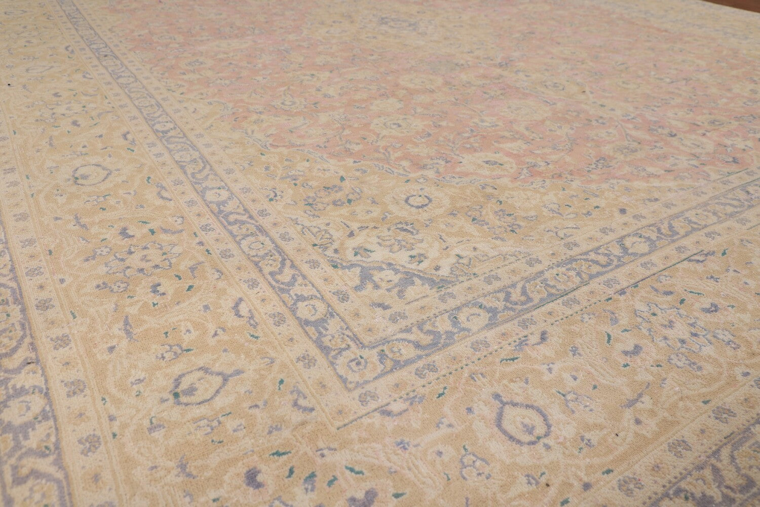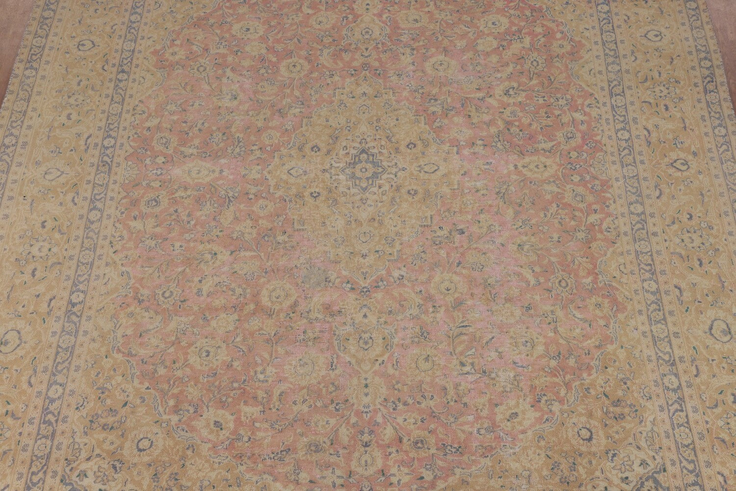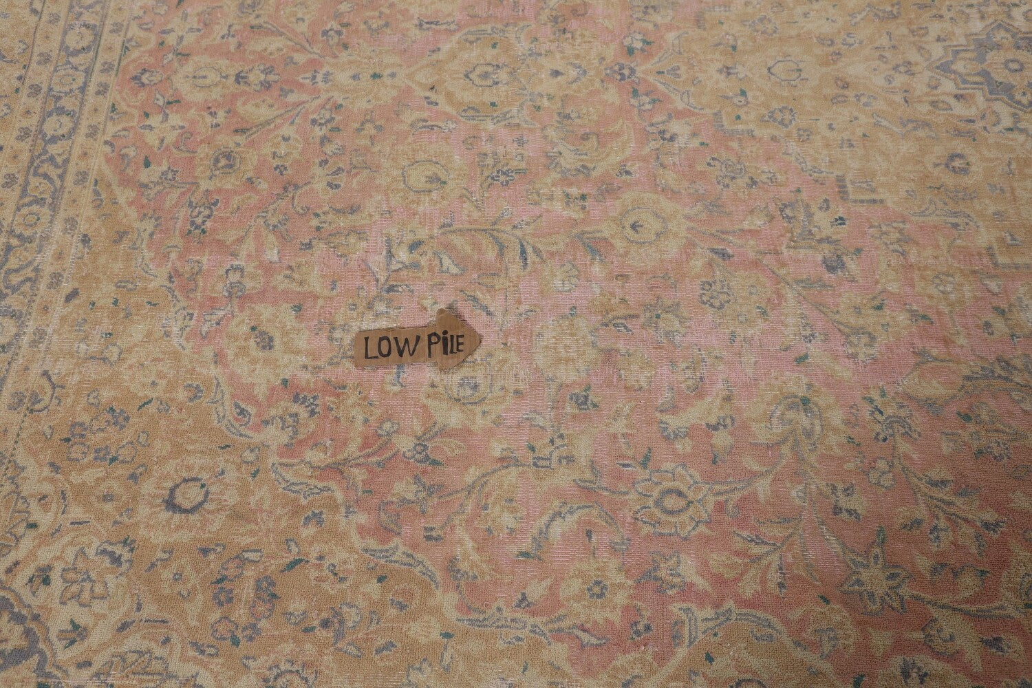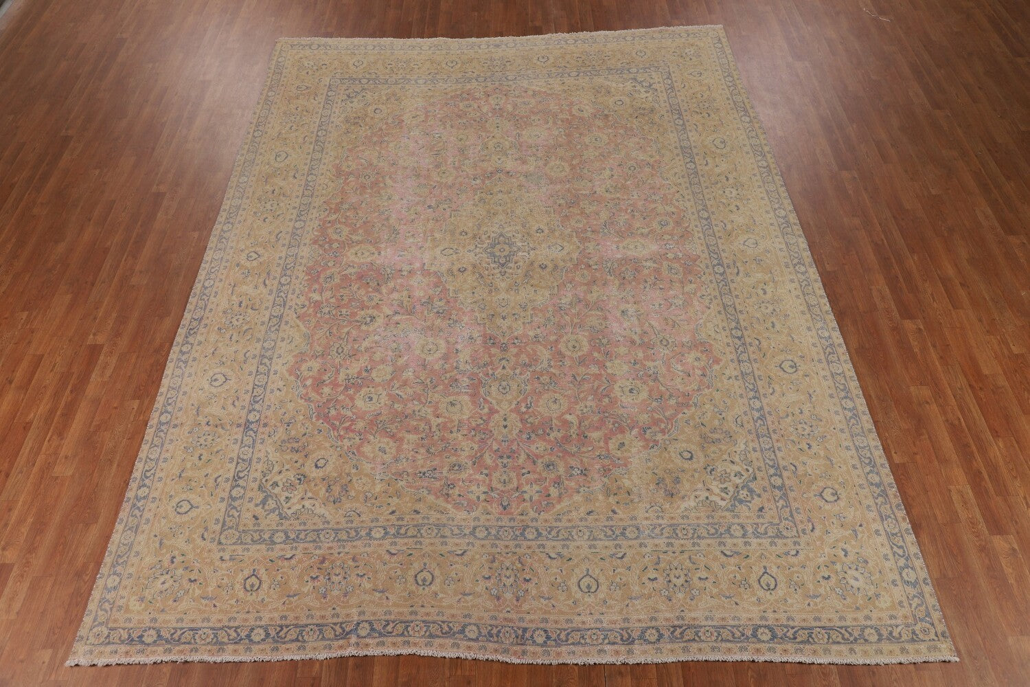 A Beautiful Genuine Persia ( Persia ) Mashad rug is Hand Knotted by skillful weavers in Persia ( Persia ) with 100% Wool Material. This rug is in Very Good ( Low Pile, Worn area, Repair ) condition. dimensions are 12' 2'' X 9' 7'' in foot and 371 X 292 in centimeter. the primary color is Pink.