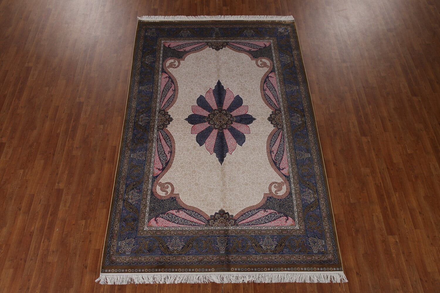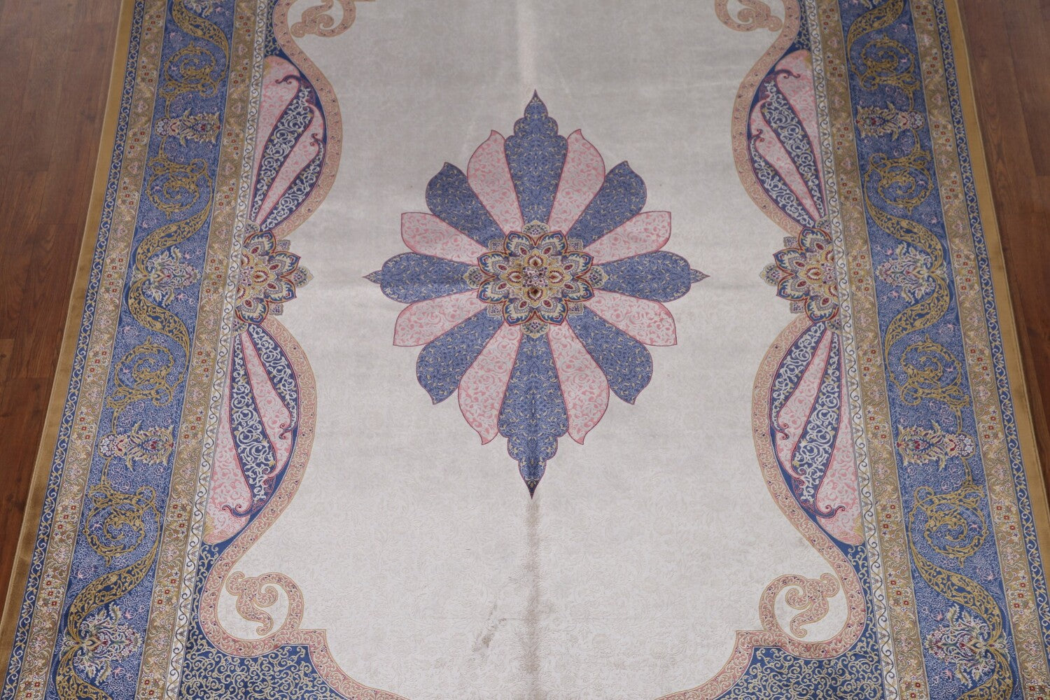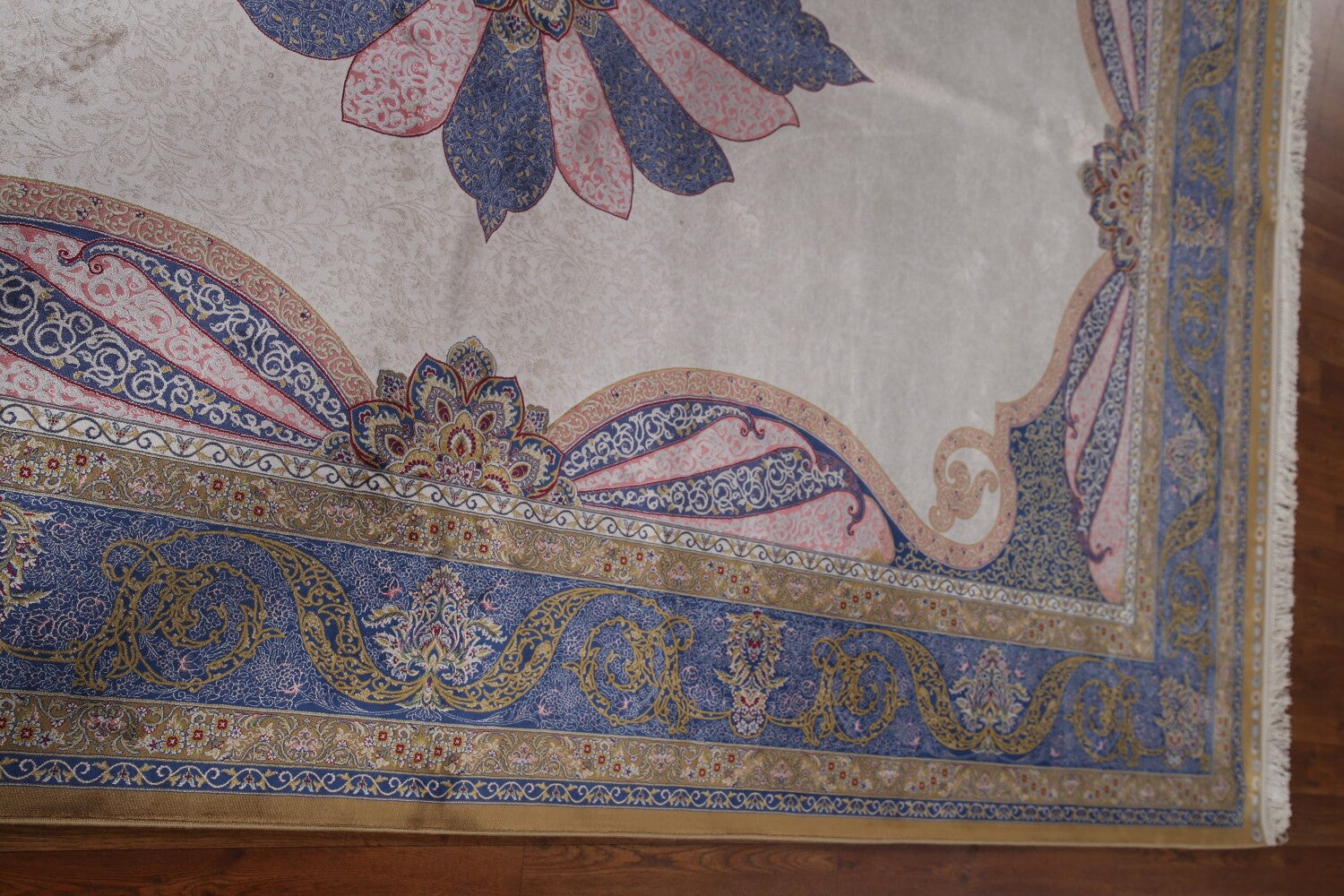 A Beautiful Genuine Turkey Qum rug is Machine Made by skillful weavers in Turkey with 90% Silk - 10% Polyester Material. This rug is in condition. dimensions are 10' 0'' X 6' 5'' in foot and 305 X 196 in centimeter. the primary color is Beige & Ivories.