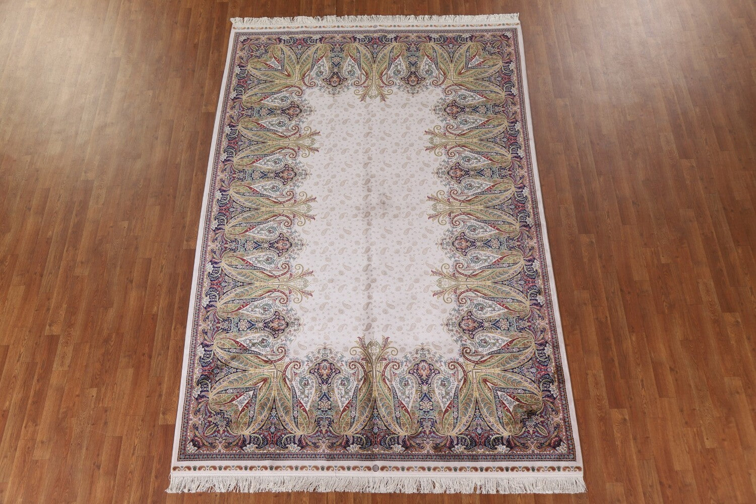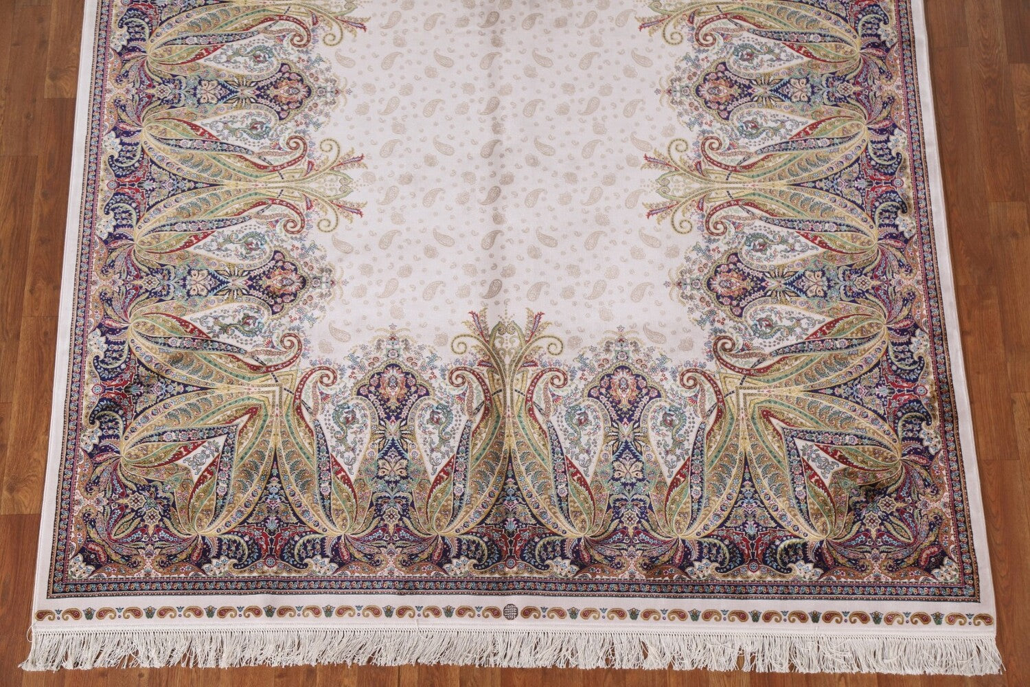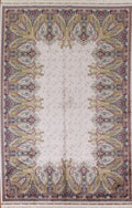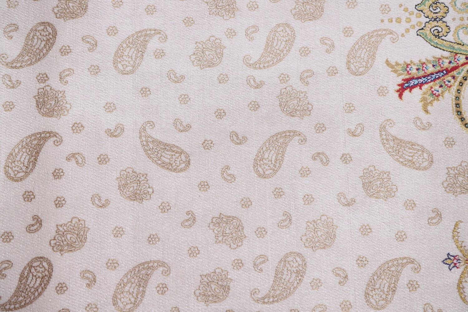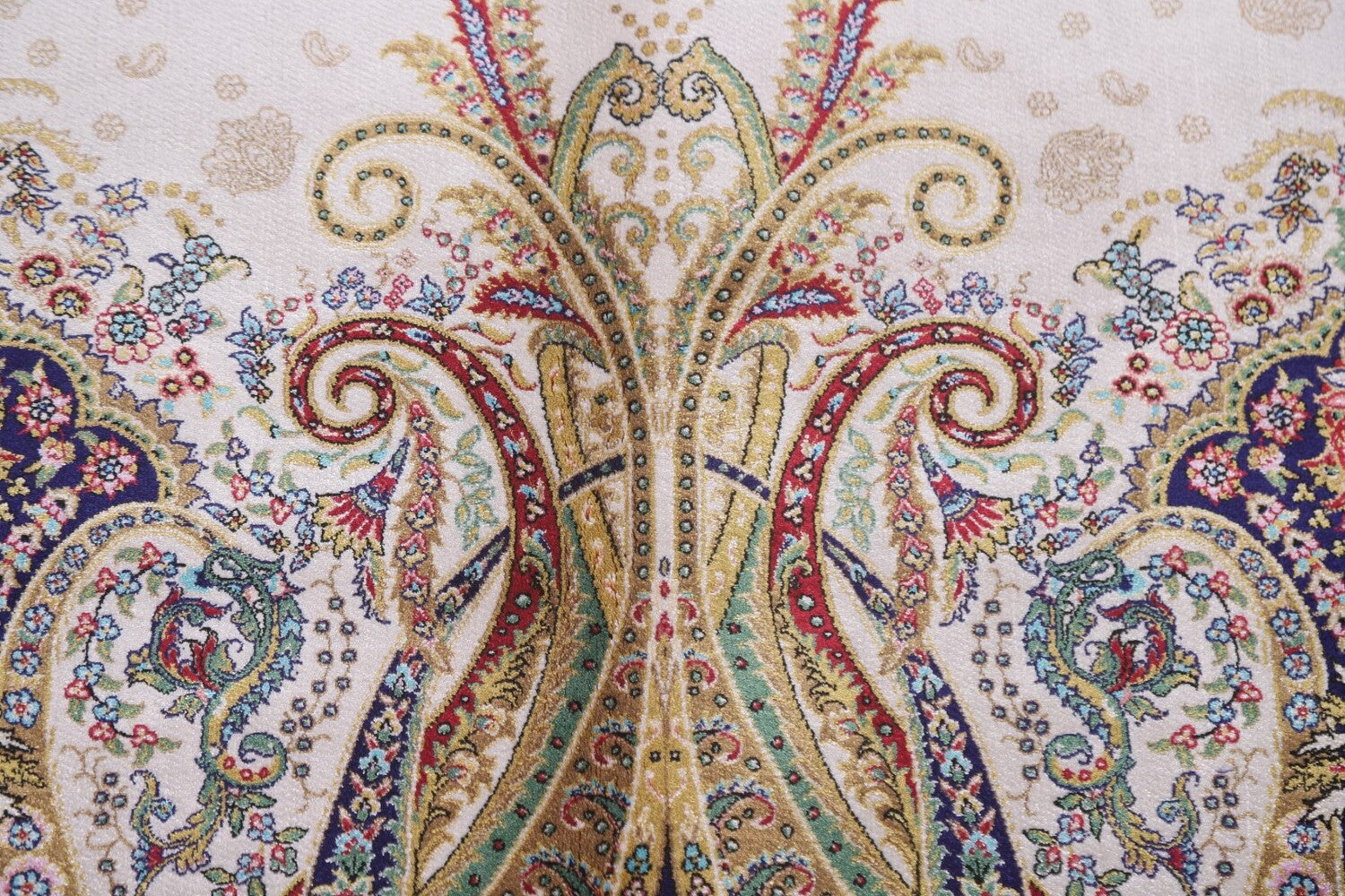 A Beautiful Genuine Turkey Qum rug is Machine Made by skillful weavers in Turkey with 90% Silk - 10% Polyester Material. This rug is in condition. dimensions are 9' 11'' X 6' 5'' in foot and 302 X 196 in centimeter. the primary color is Beige & Ivories.