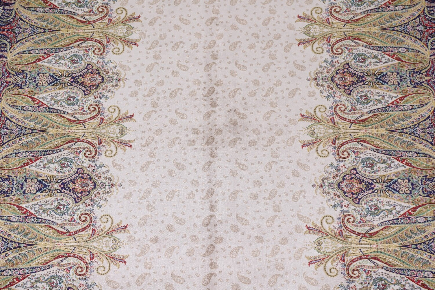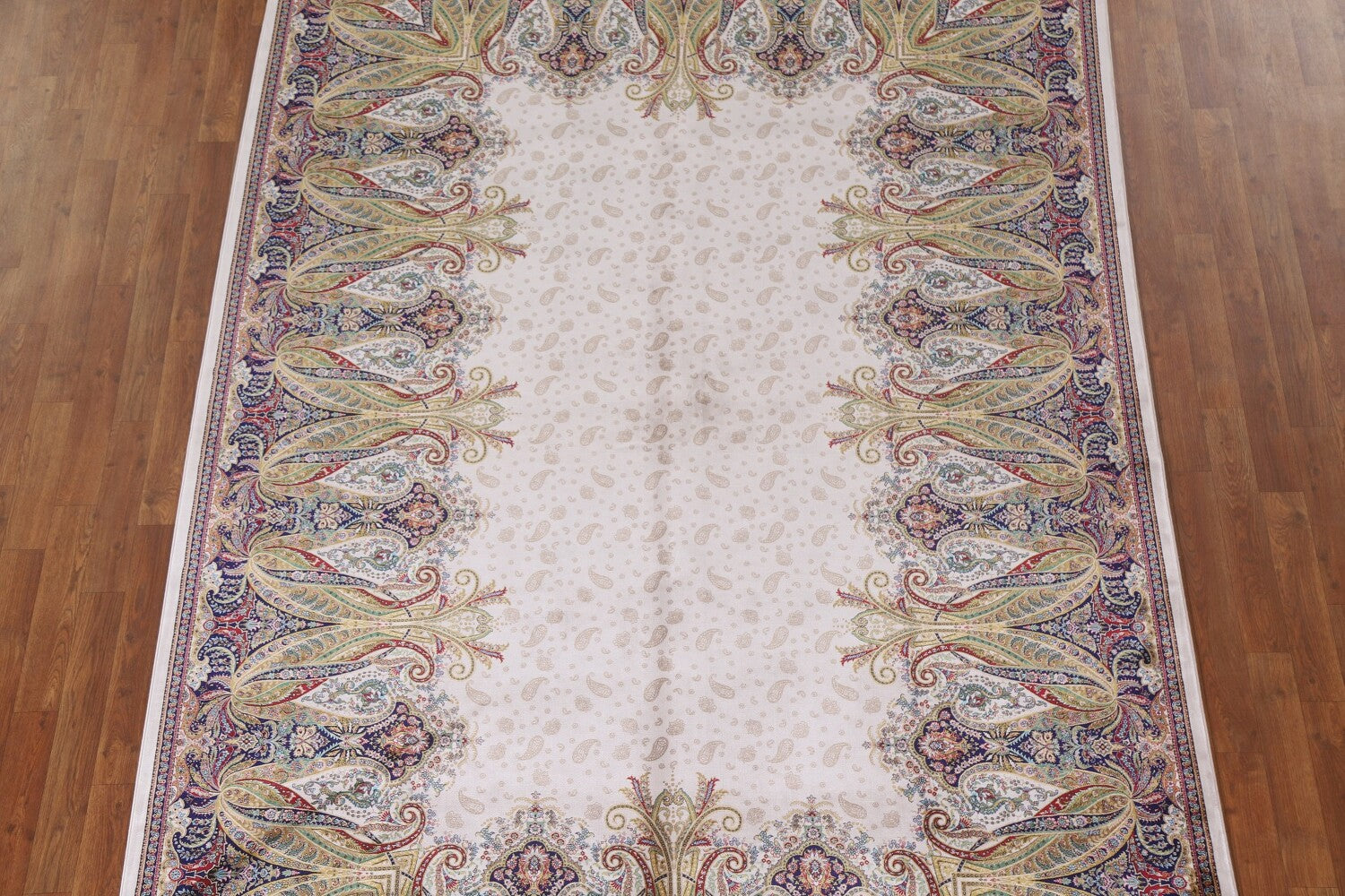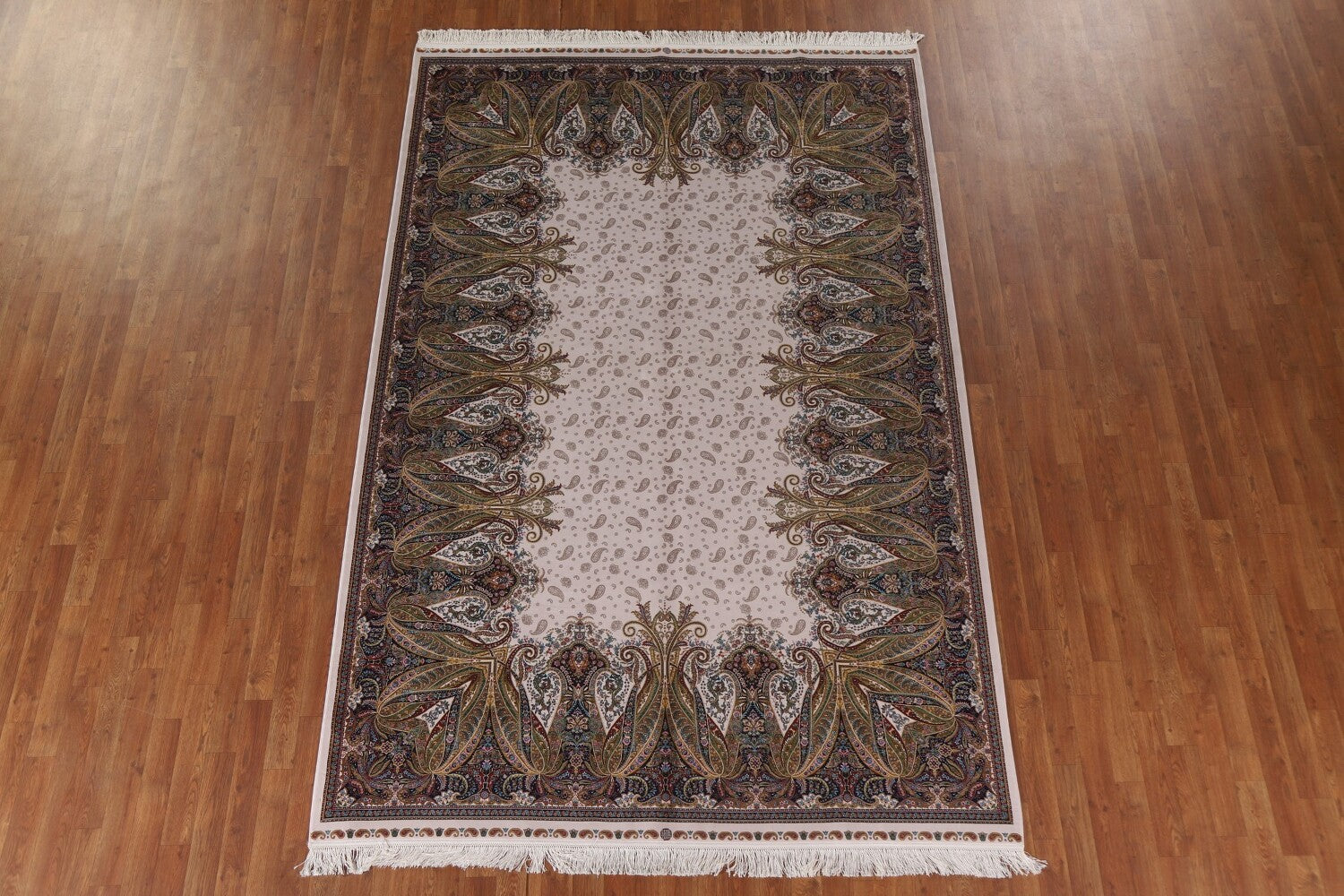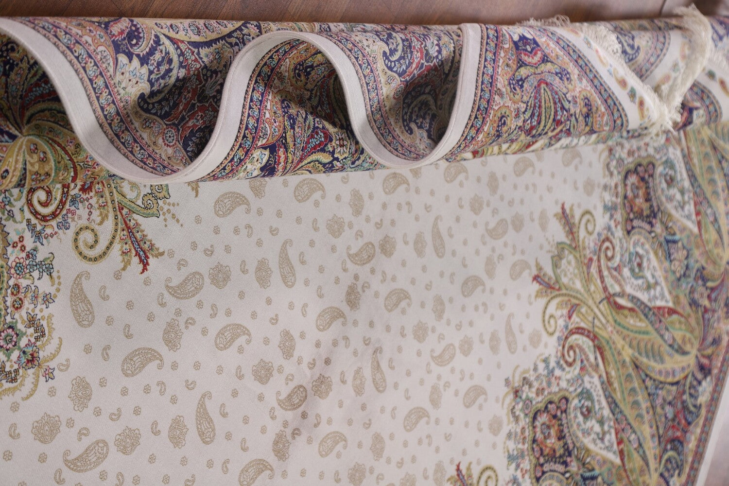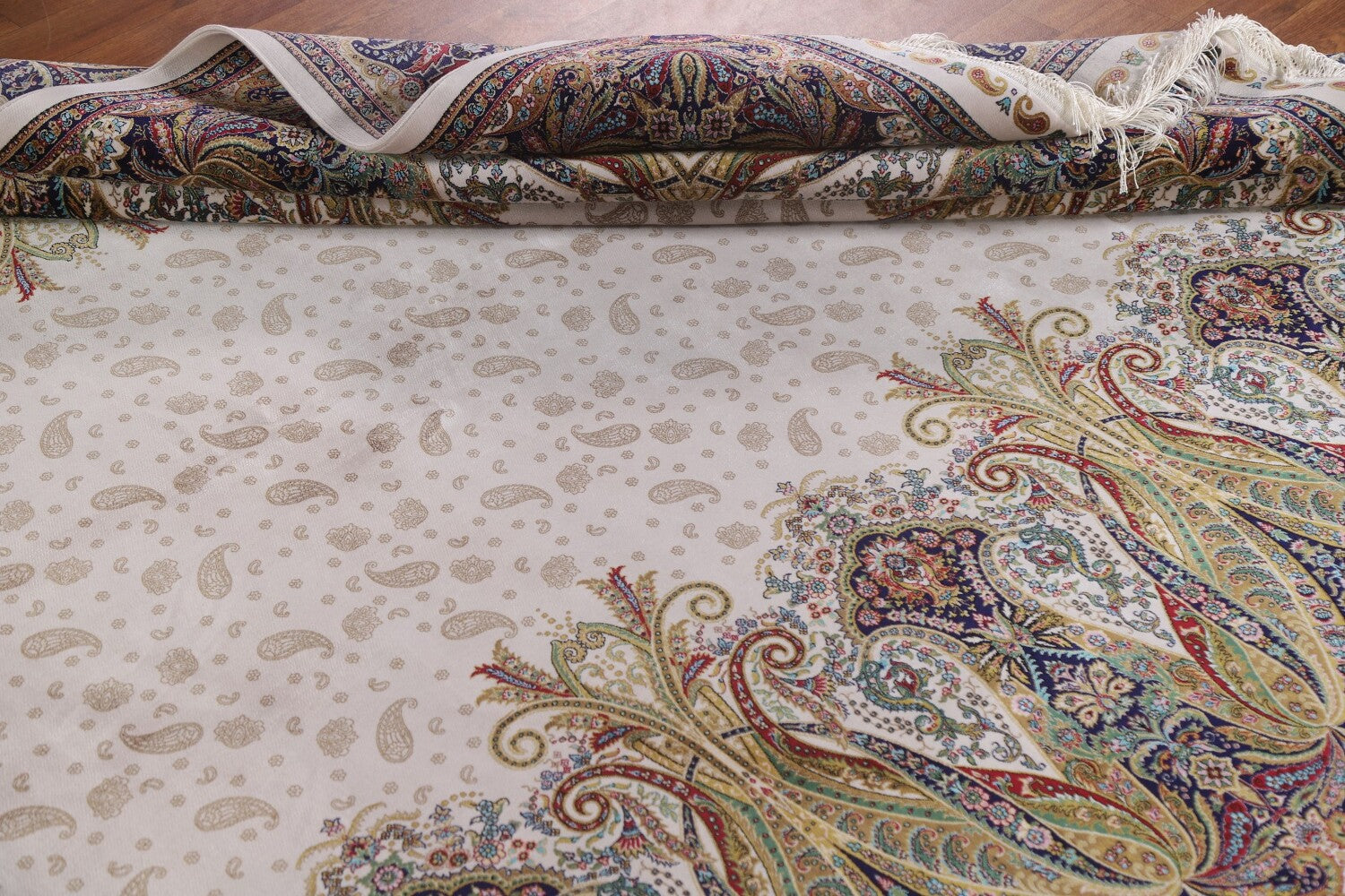 A Beautiful Genuine Turkey Qum rug is Machine Made by skillful weavers in Turkey with 90% Silk - 10% Polyester Material. This rug is in condition. dimensions are 9' 11'' X 6' 5'' in foot and 302 X 196 in centimeter. the primary color is Beige & Ivories.