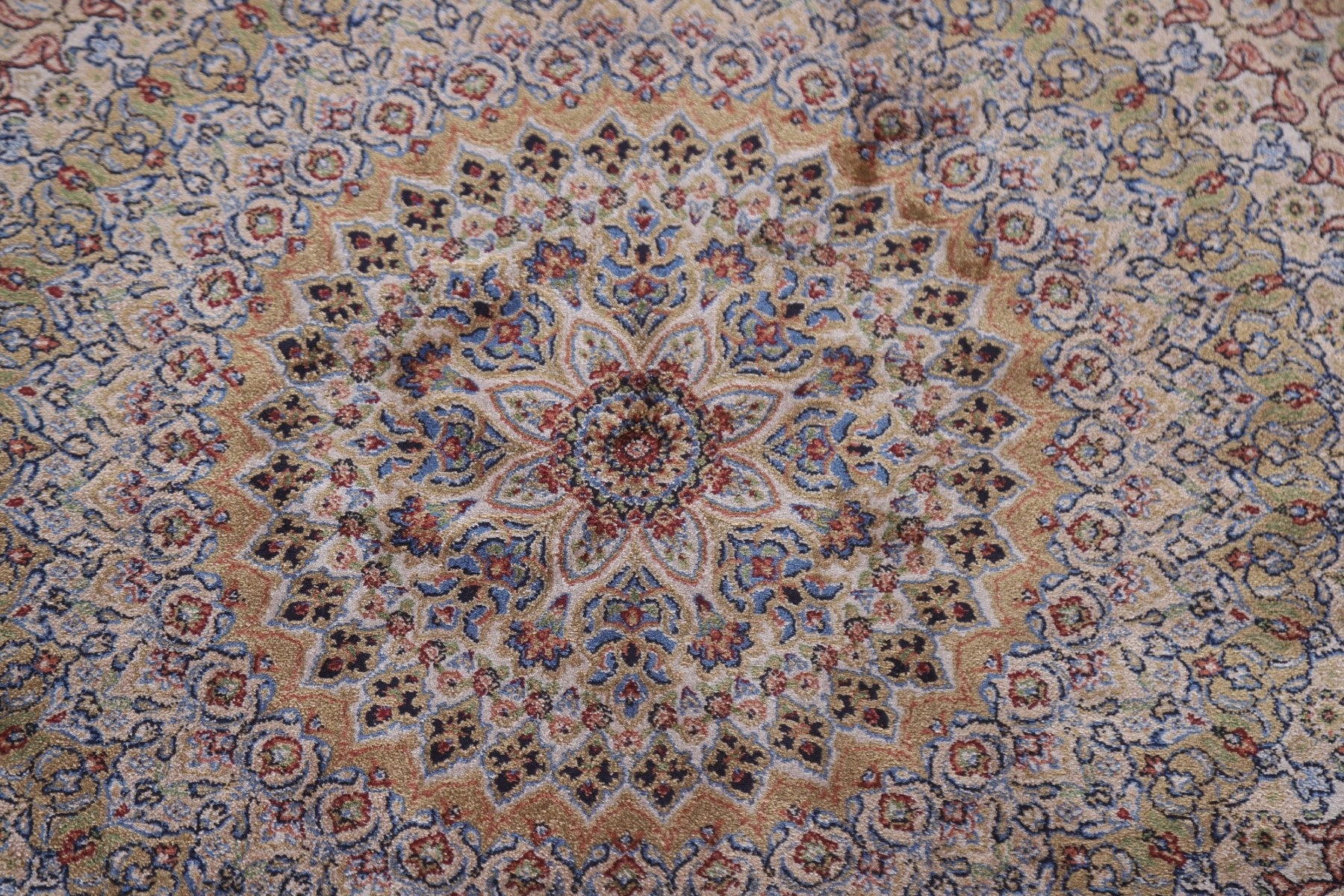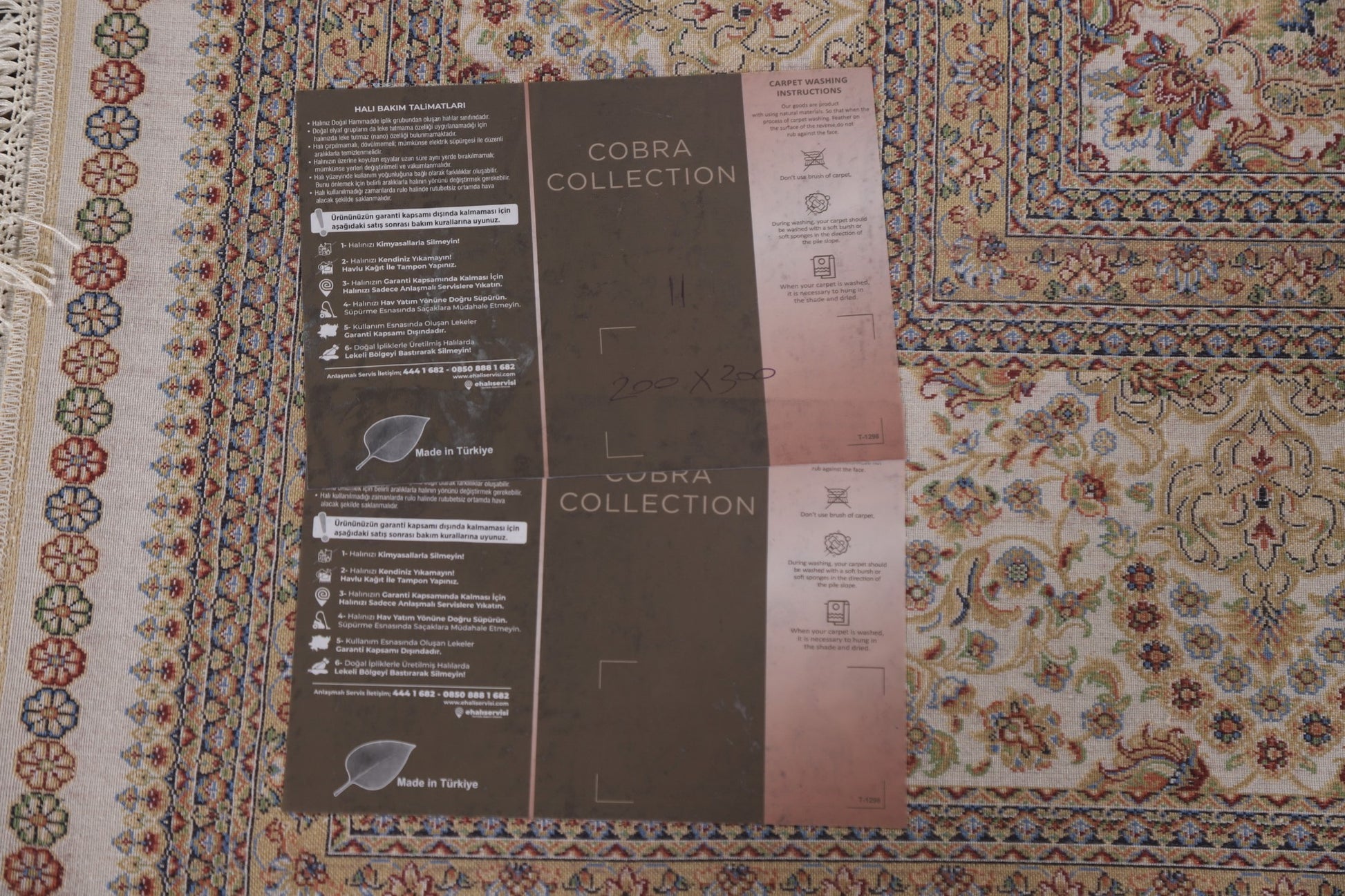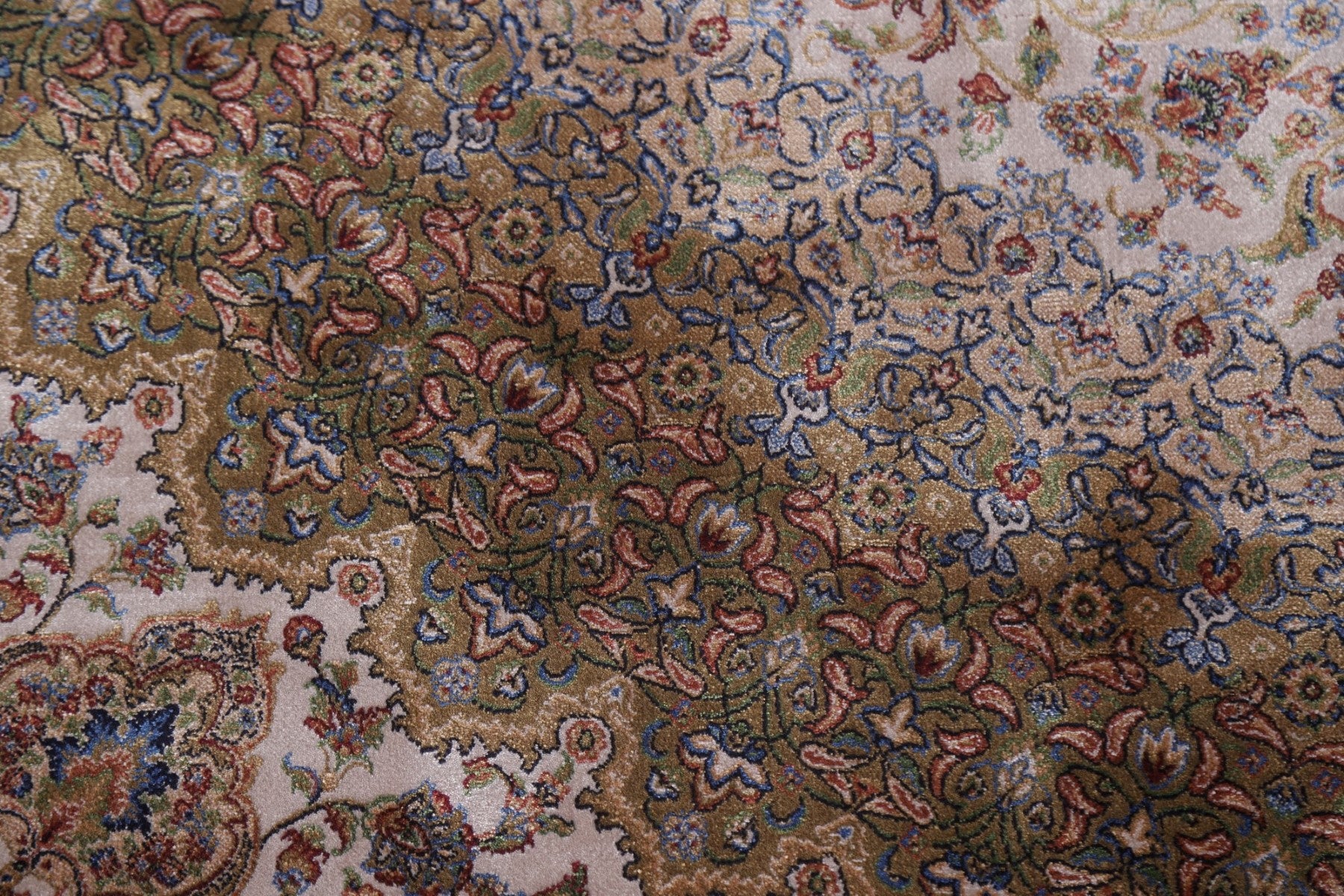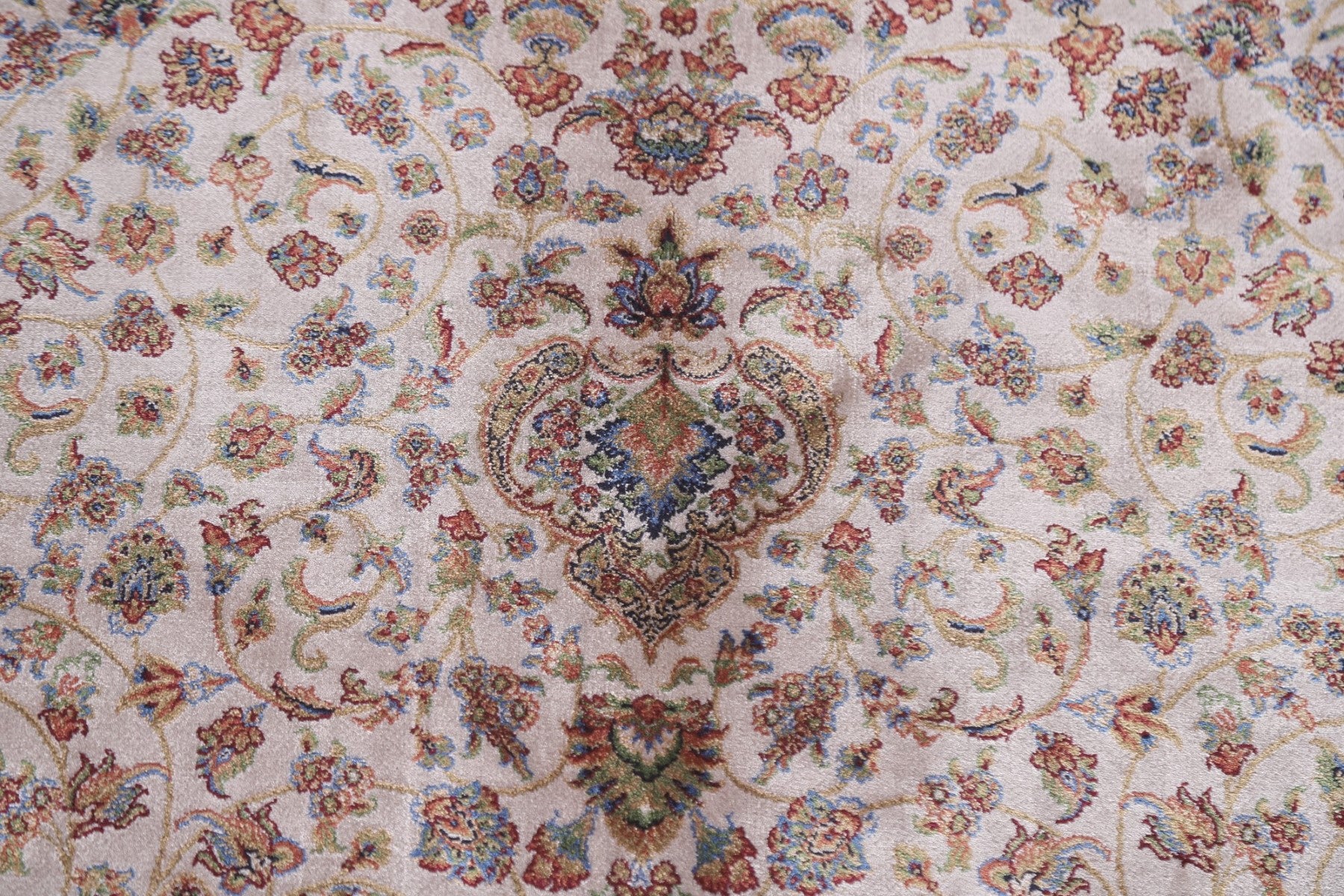 A Beautiful Genuine Turkey Qum rug is Machine Made by skillful weavers in Turkey with 90% Silk - 10% Polyester Material. This rug is in condition. dimensions are 9' 11'' X 6' 7'' in foot and 302 X 201 in centimeter. the primary color is Beige & Ivories.