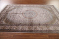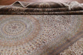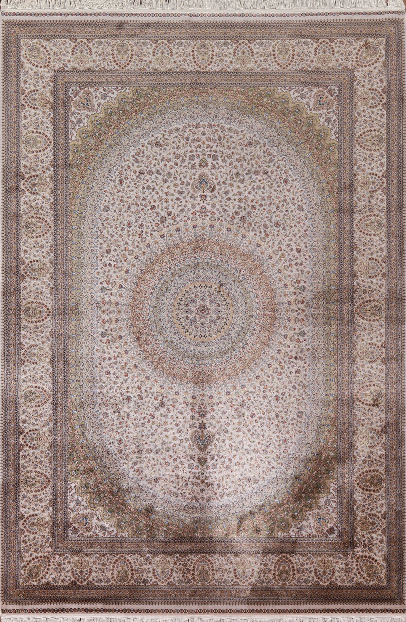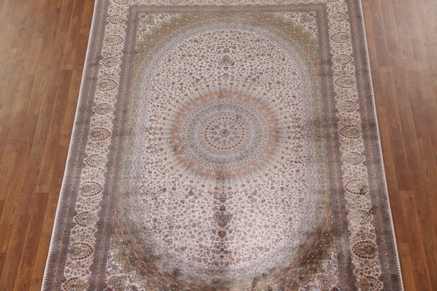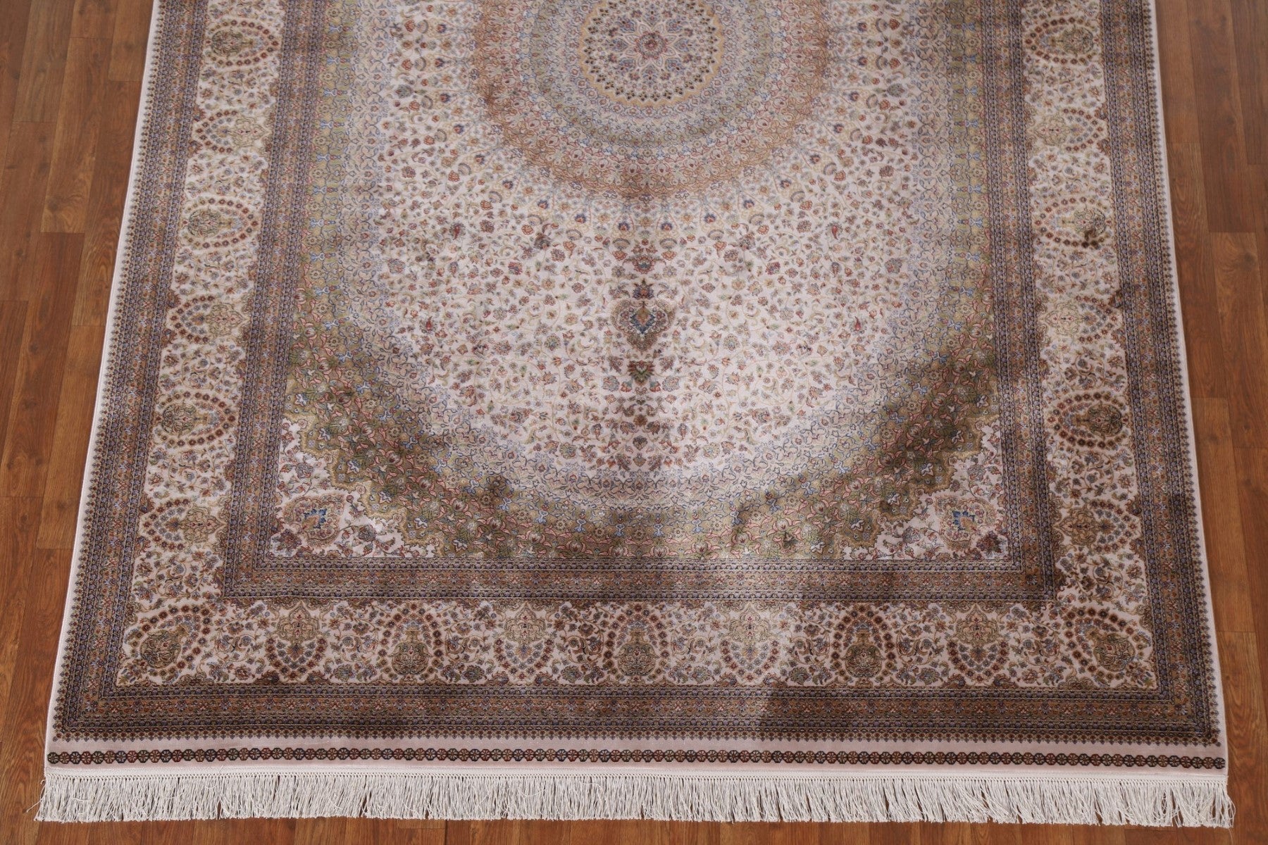 A Beautiful Genuine Turkey Qum rug is Machine Made by skillful weavers in Turkey with 90% Silk - 10% Polyester Material. This rug is in condition. dimensions are 9' 11'' X 6' 7'' in foot and 302 X 201 in centimeter. the primary color is Beige & Ivories.