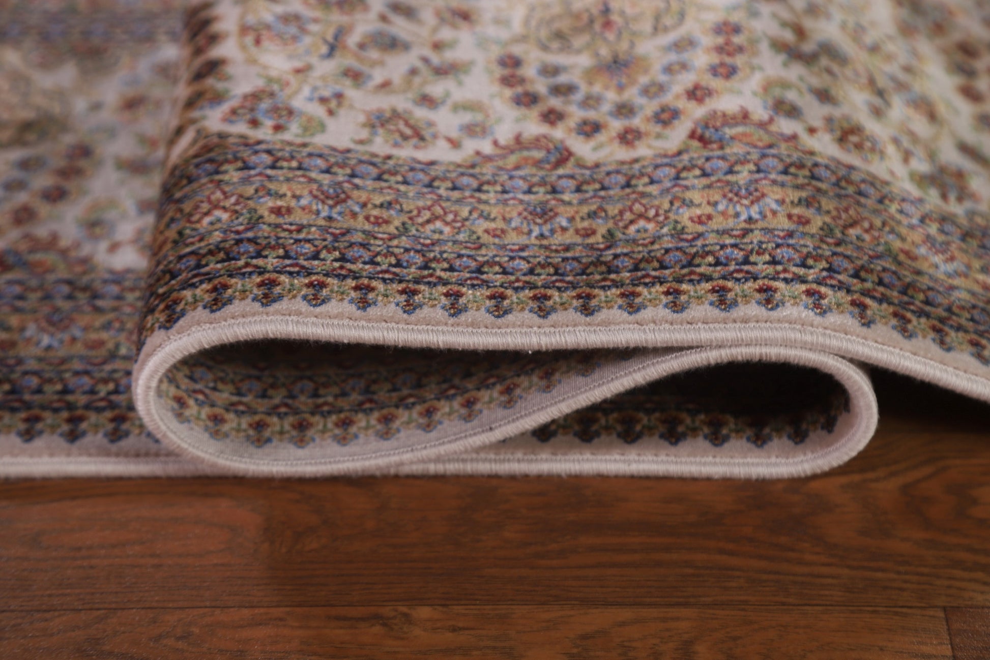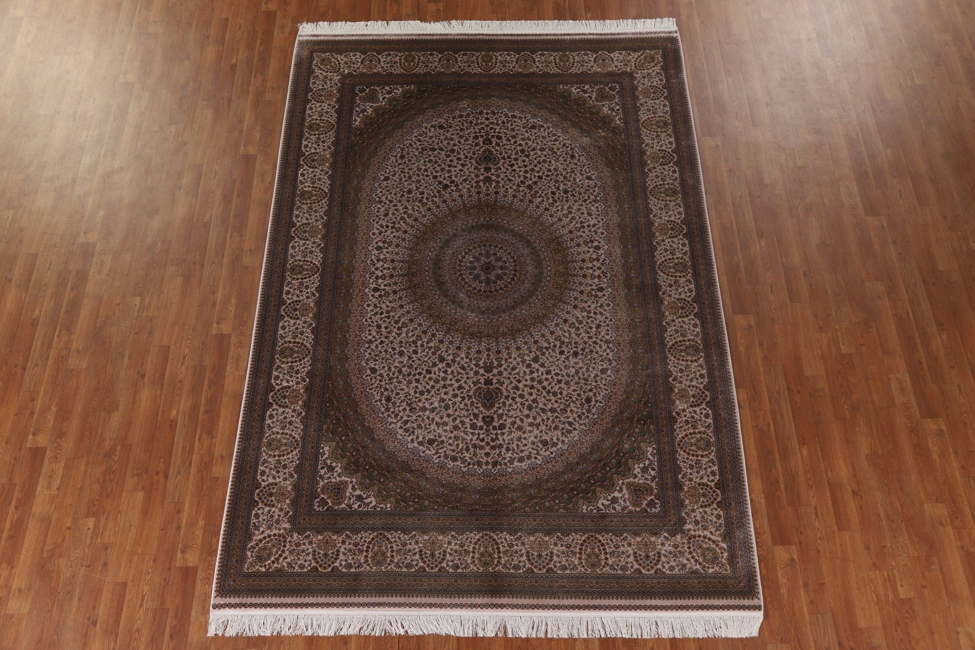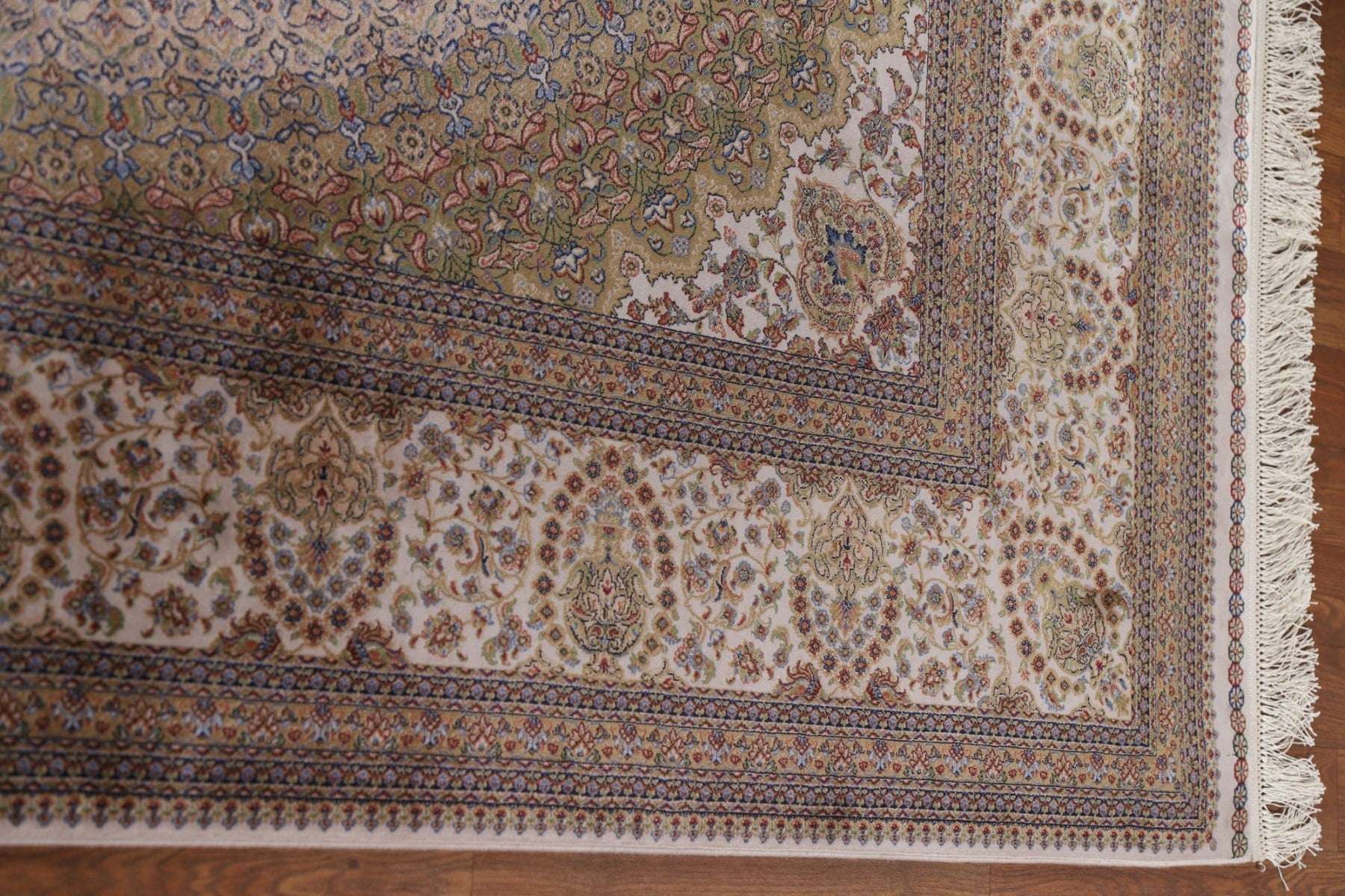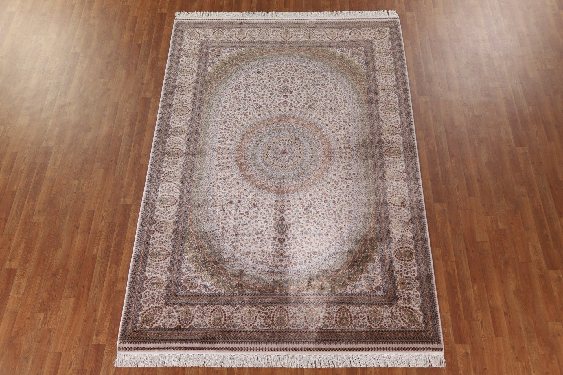 A Beautiful Genuine Turkey Qum rug is Machine Made by skillful weavers in Turkey with 90% Silk - 10% Polyester Material. This rug is in condition. dimensions are 9' 11'' X 6' 7'' in foot and 302 X 201 in centimeter. the primary color is Beige & Ivories.