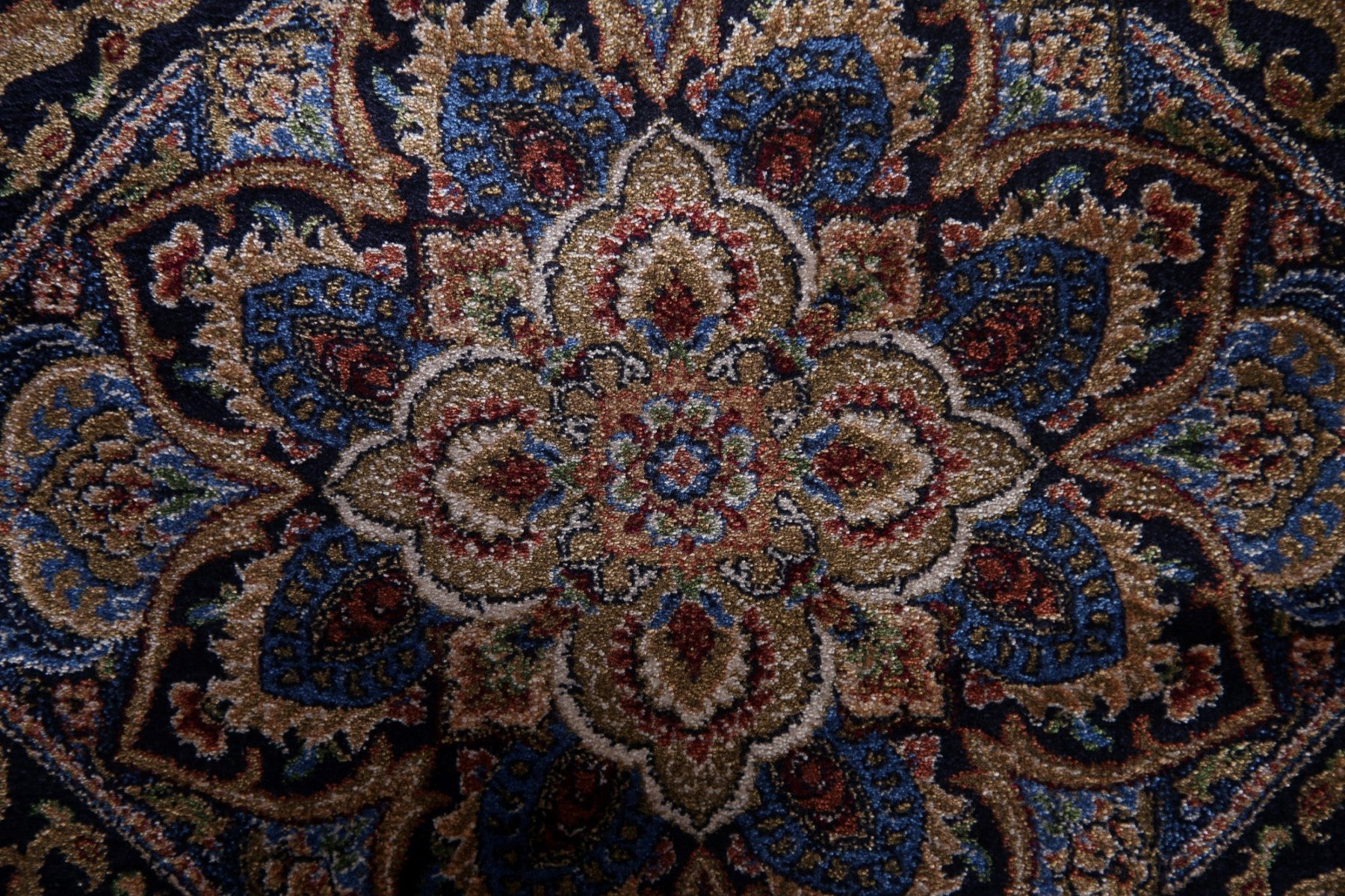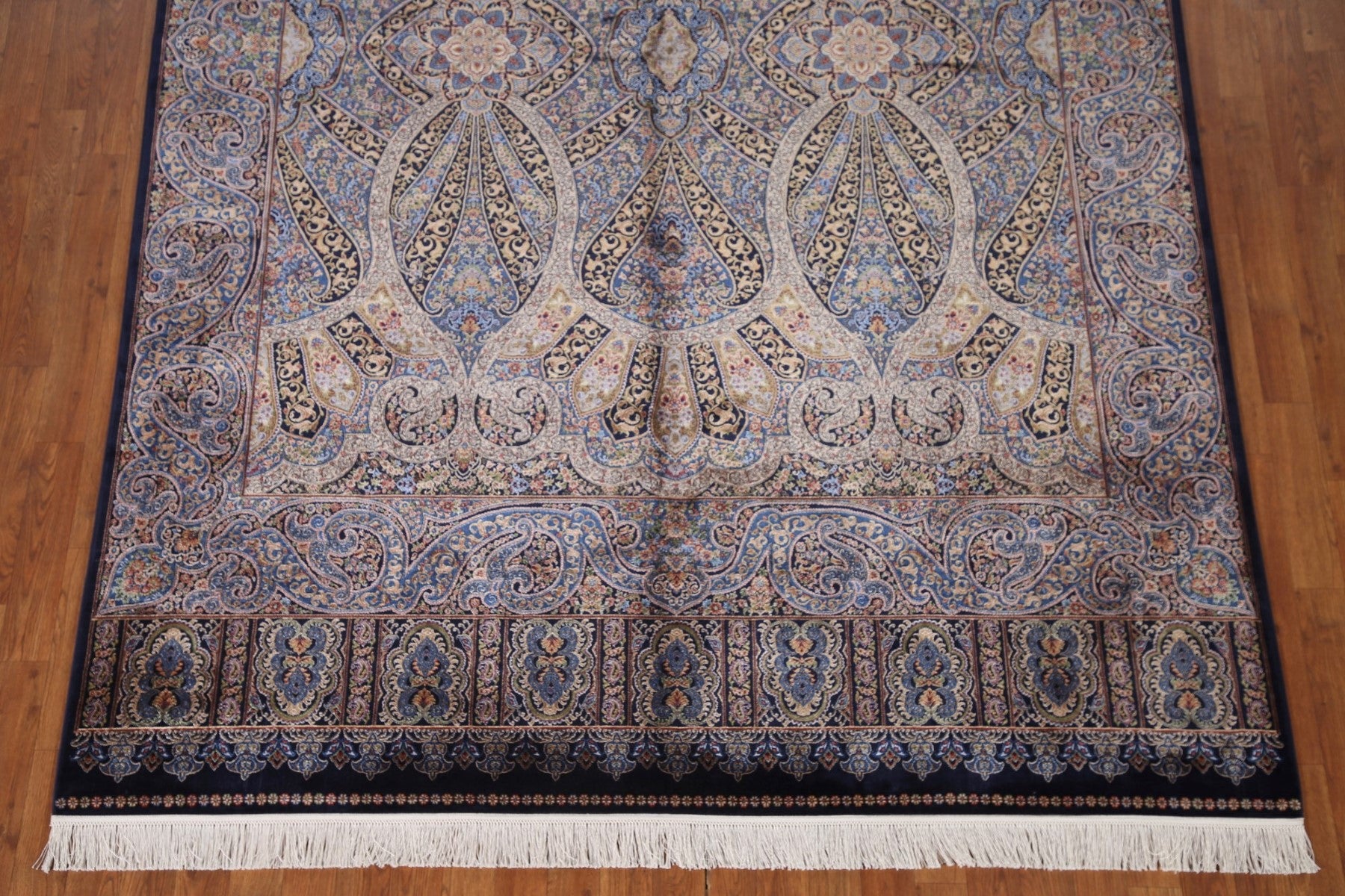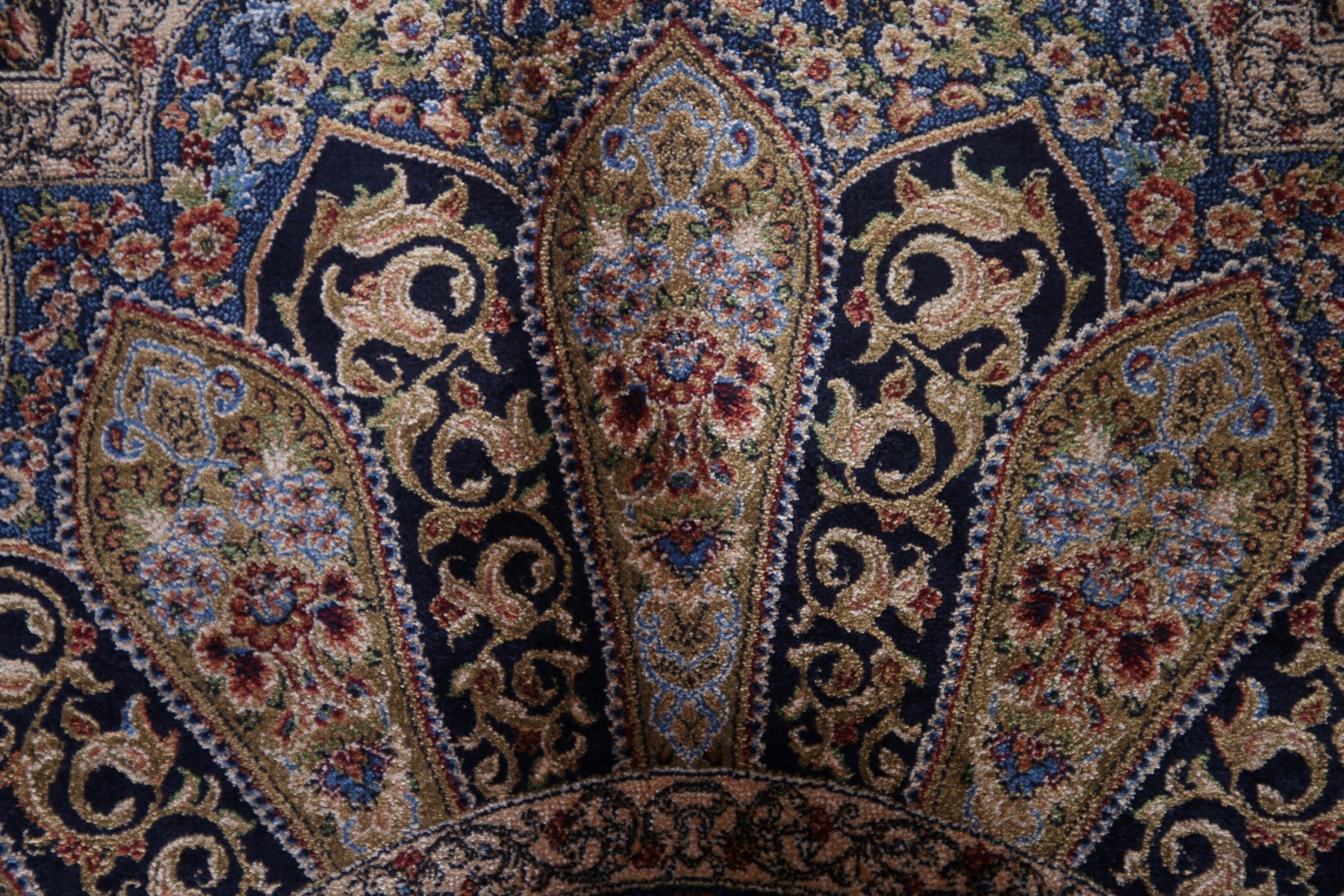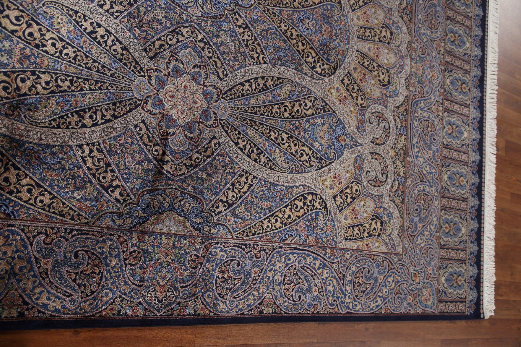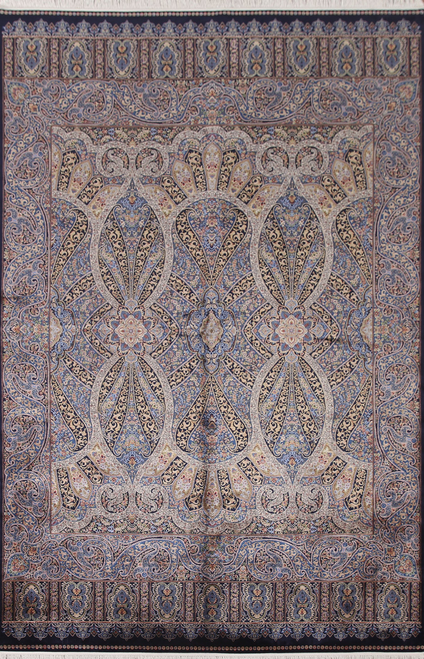 A Beautiful Genuine Turkey Qum rug is Machine Made by skillful weavers in Turkey with 90% Silk - 10% Polyester Material. This rug is in New, First Quality condition. dimensions are 10' 0'' X 6' 7'' in foot and 305 X 201 in centimeter. the primary color is Navy Blue & Blues.