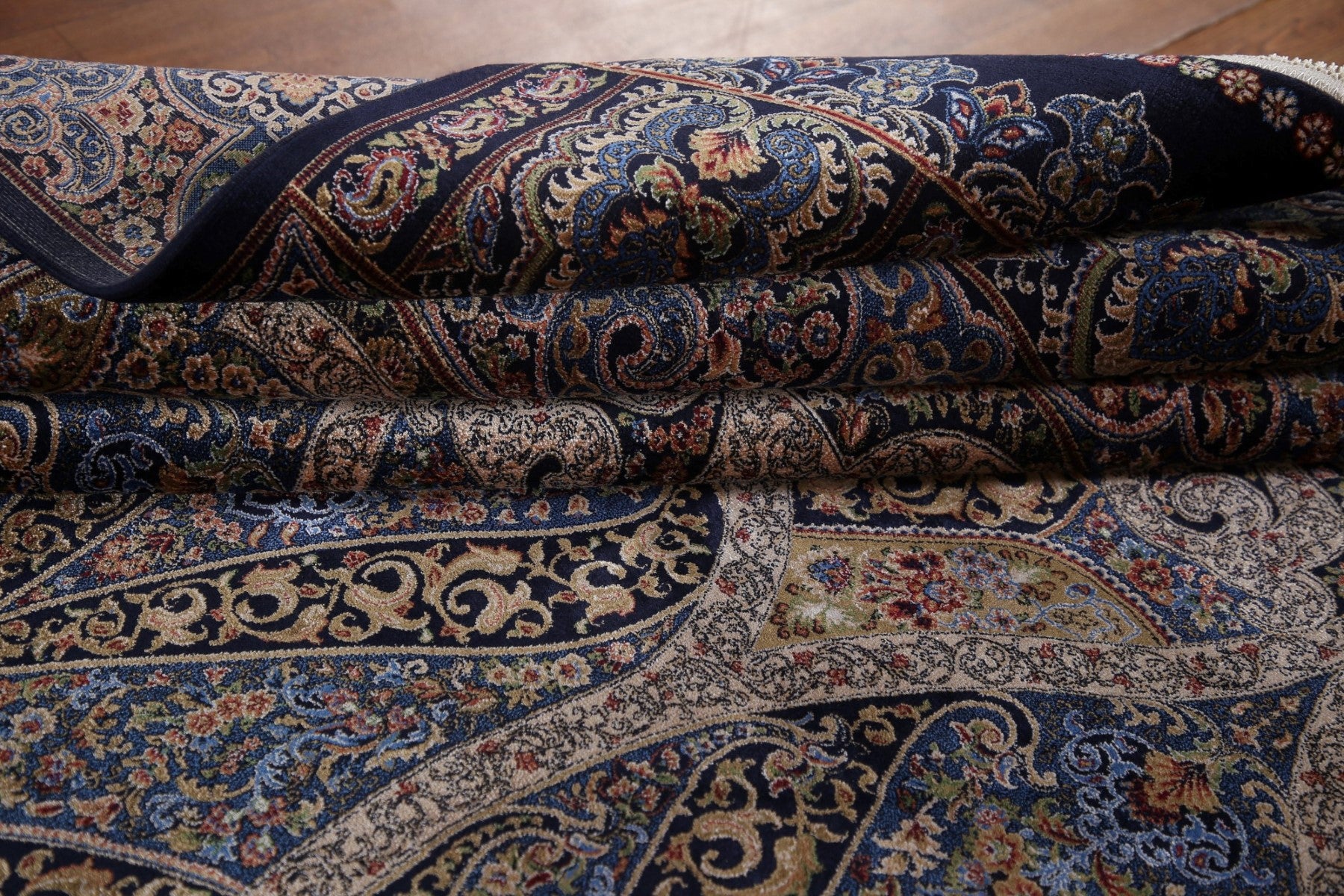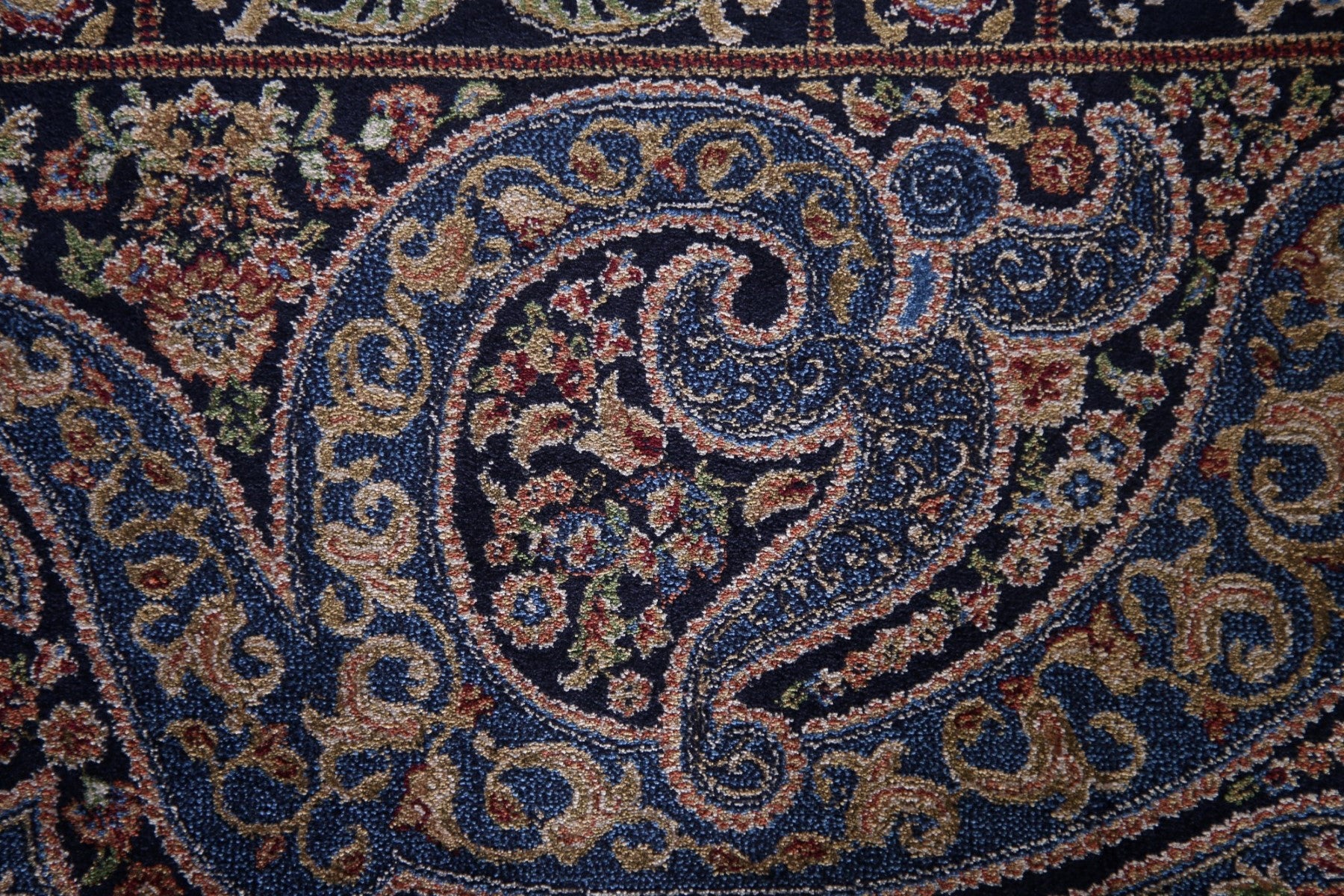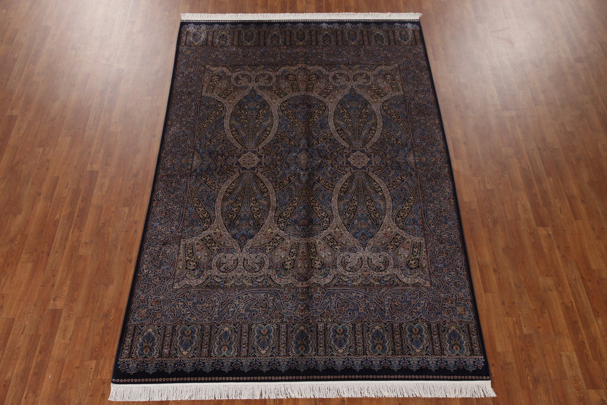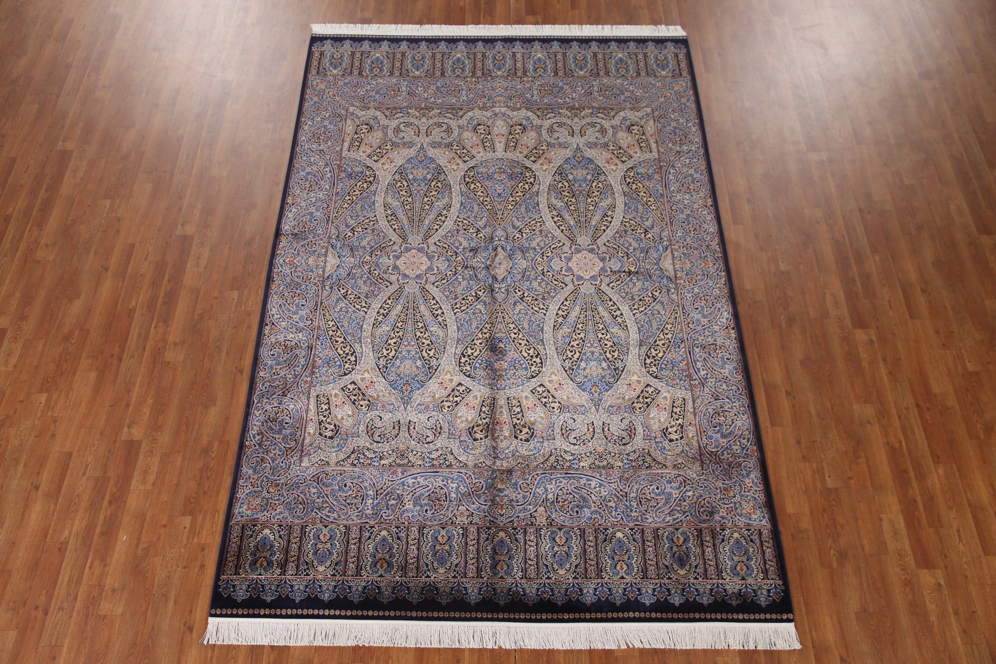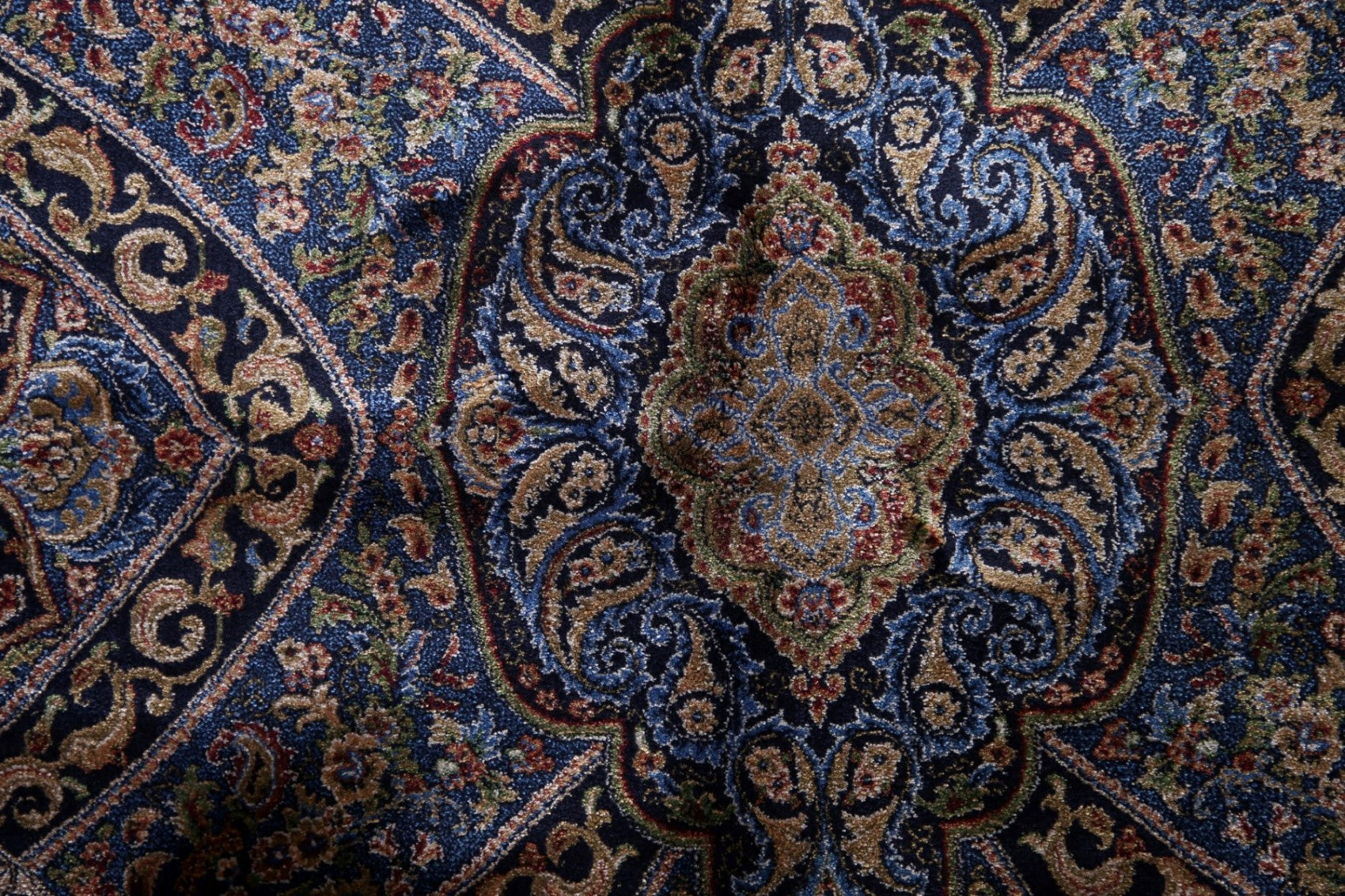 A Beautiful Genuine Turkey Qum rug is Machine Made by skillful weavers in Turkey with 90% Silk - 10% Polyester Material. This rug is in New, First Quality condition. dimensions are 10' 0'' X 6' 7'' in foot and 305 X 201 in centimeter. the primary color is Navy Blue & Blues.