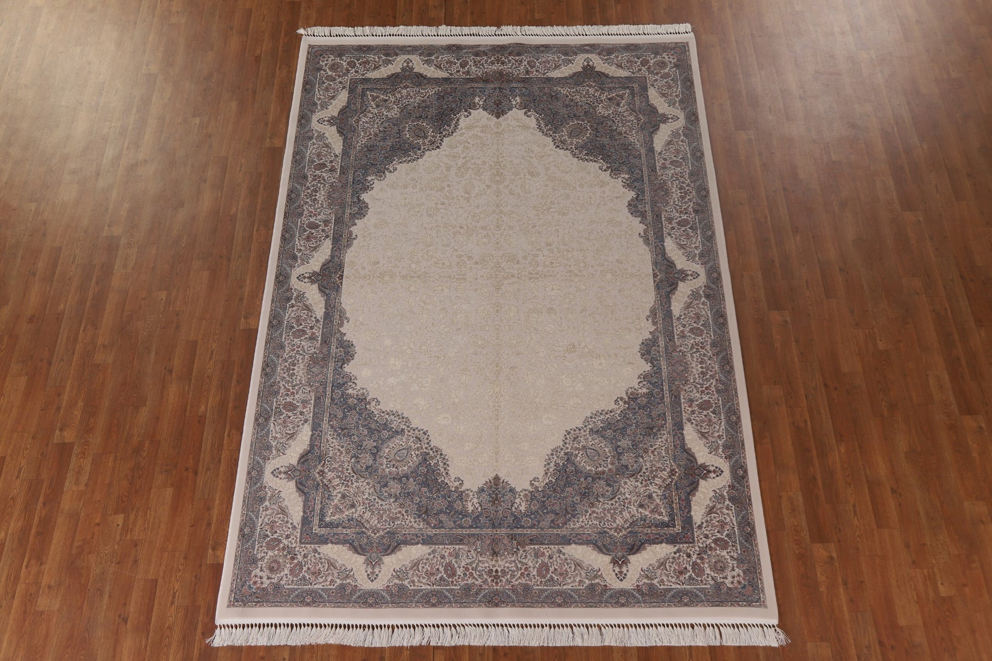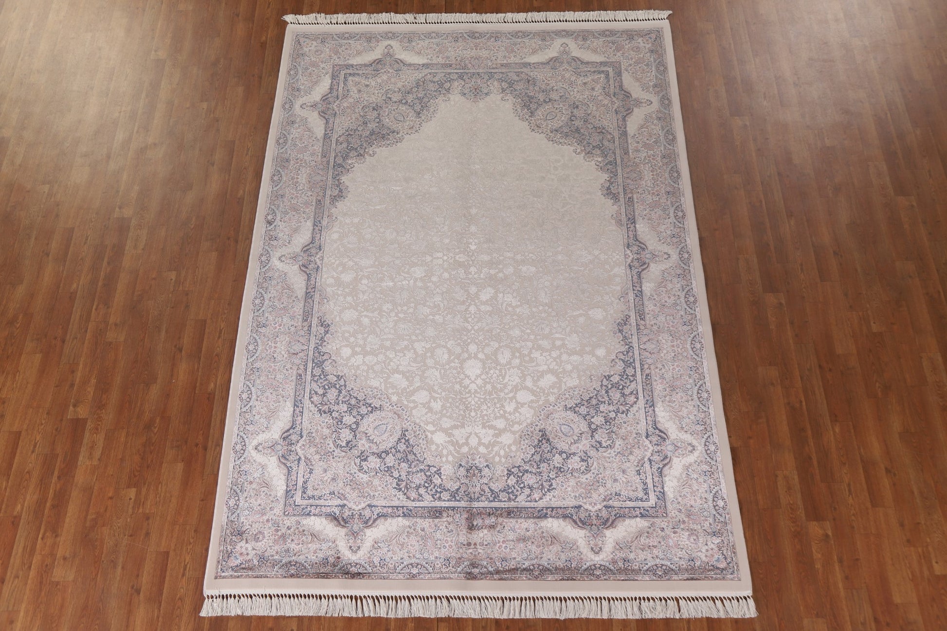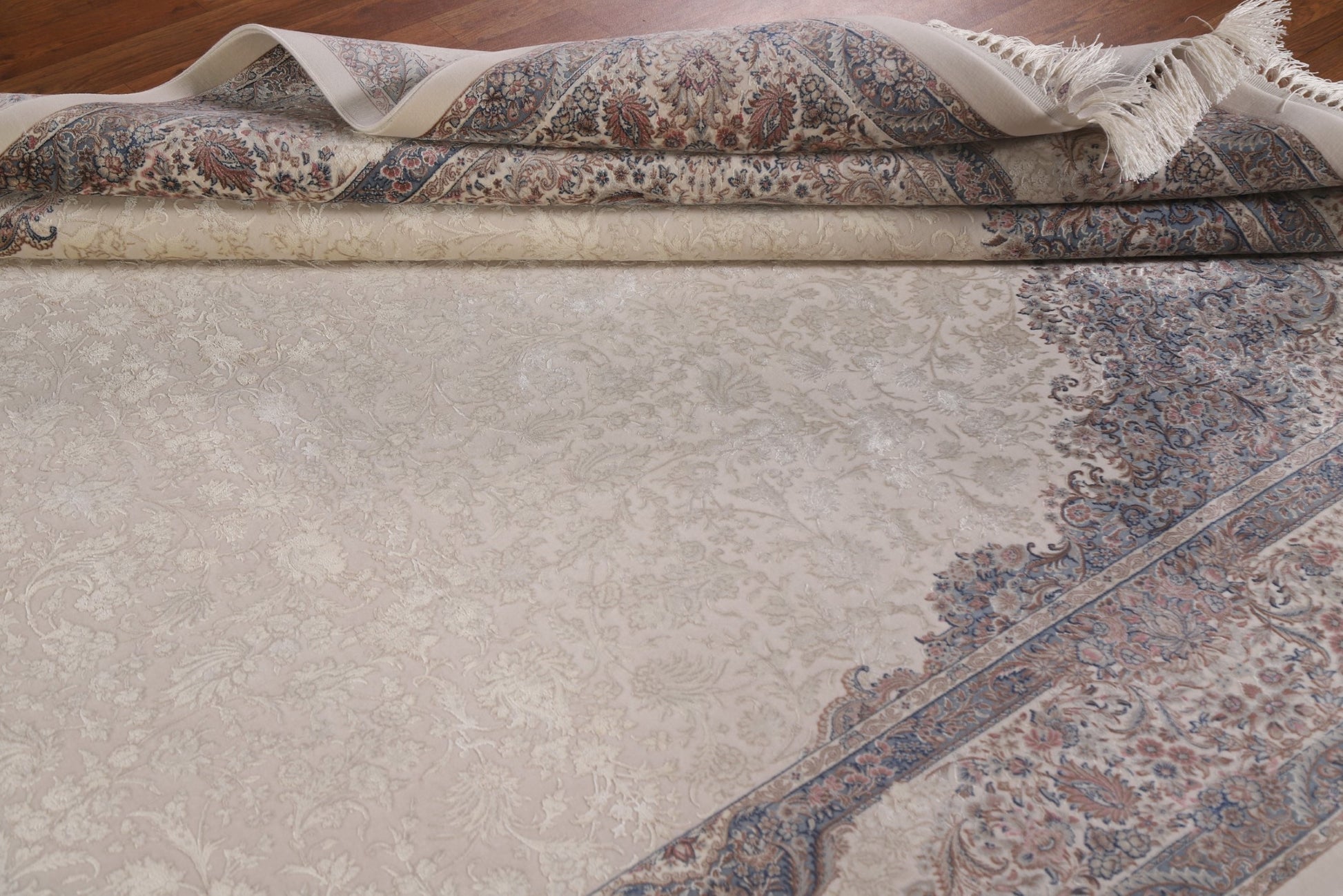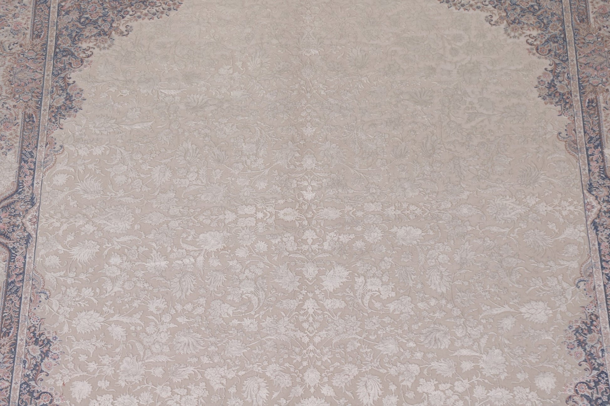 A Beautiful Genuine Turkey Qum rug is Machine Made by skillful weavers in Turkey with 90% Silk - 10% Polyester Material. This rug is in condition. dimensions are 9' 7'' X 6' 7'' in foot and 292 X 201 in centimeter. the primary color is Beige & Ivories.