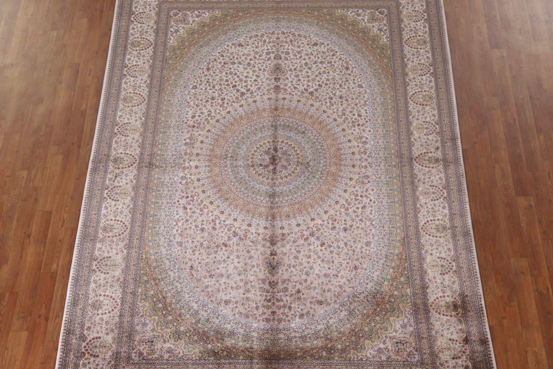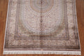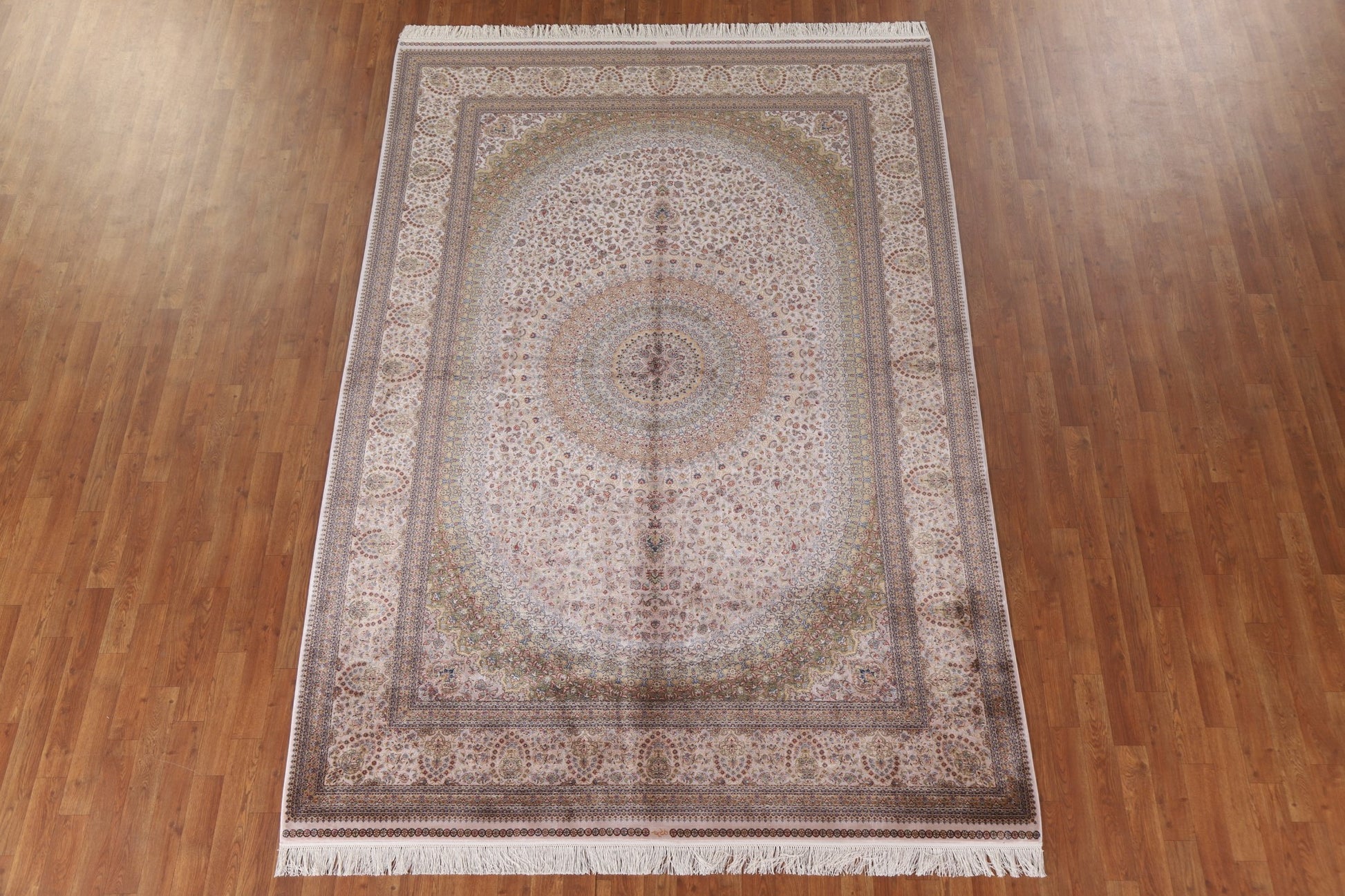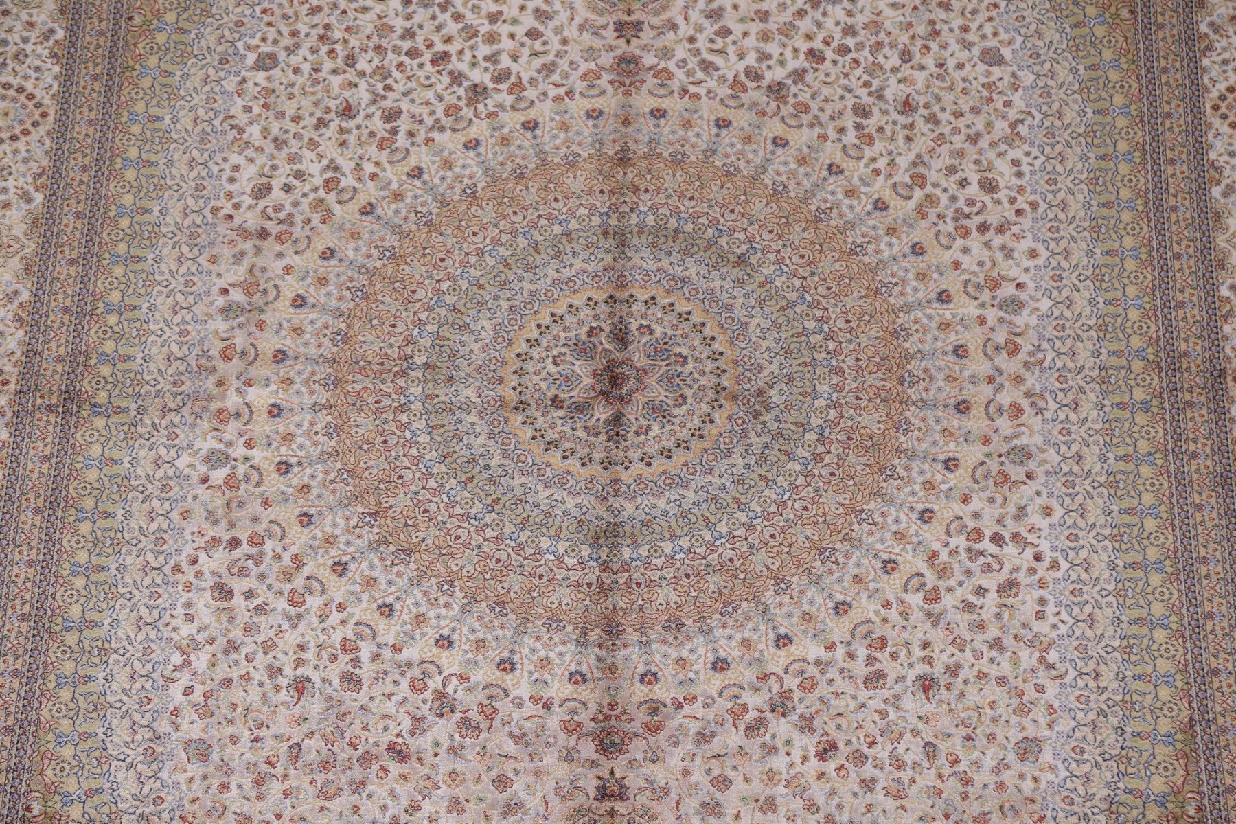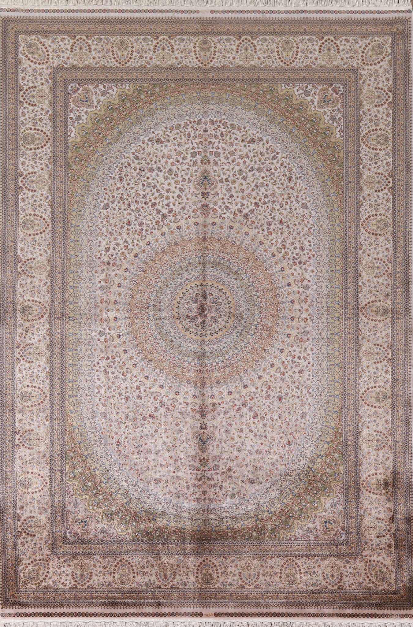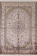 A Beautiful Genuine Turkey Qum rug is Machine Made by skillful weavers in Turkey with 90% Silk - 10% Polyester Material. This rug is in condition. dimensions are 9' 10'' X 6' 7'' in foot and 300 X 201 in centimeter. the primary color is Beige & Ivories.