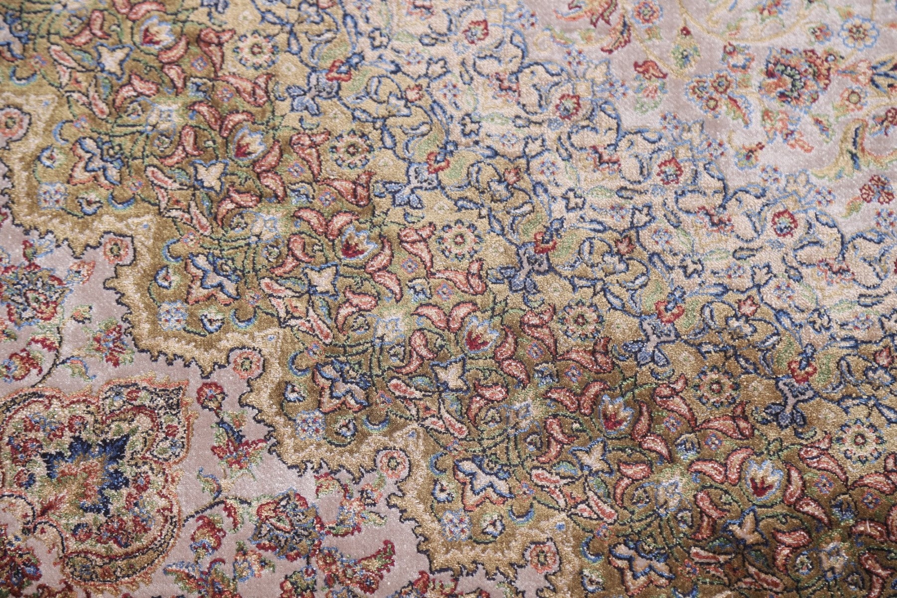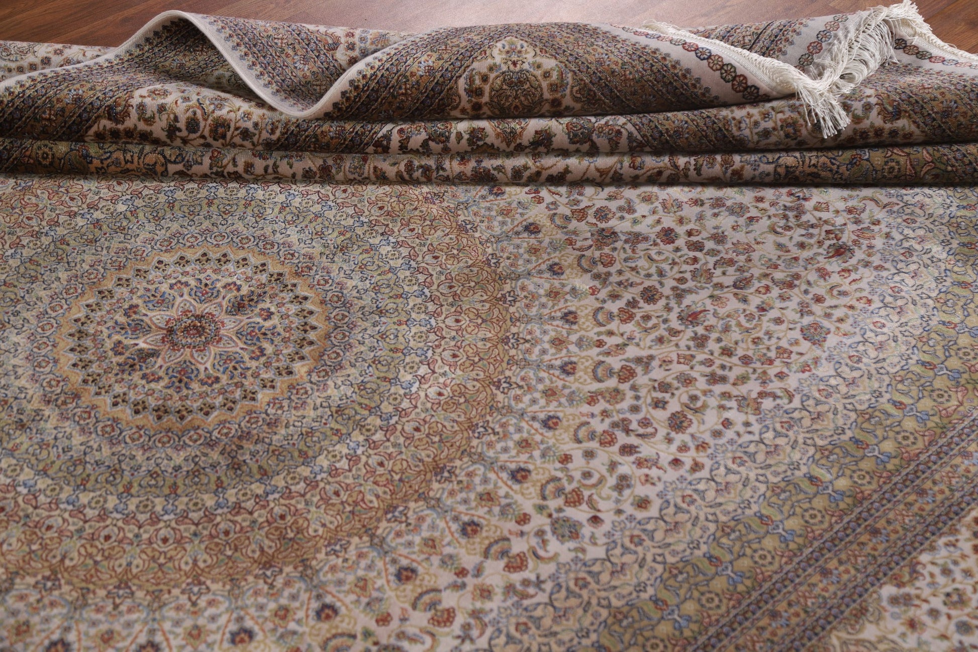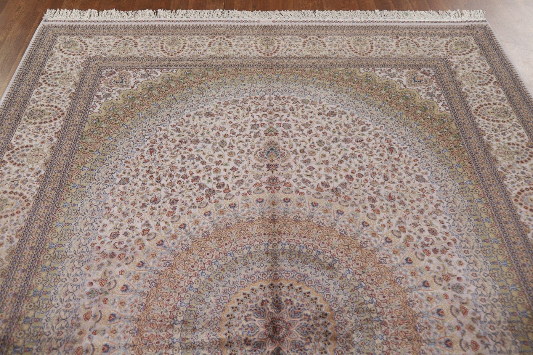 A Beautiful Genuine Turkey Qum rug is Machine Made by skillful weavers in Turkey with 90% Silk - 10% Polyester Material. This rug is in condition. dimensions are 9' 10'' X 6' 7'' in foot and 300 X 201 in centimeter. the primary color is Beige & Ivories.