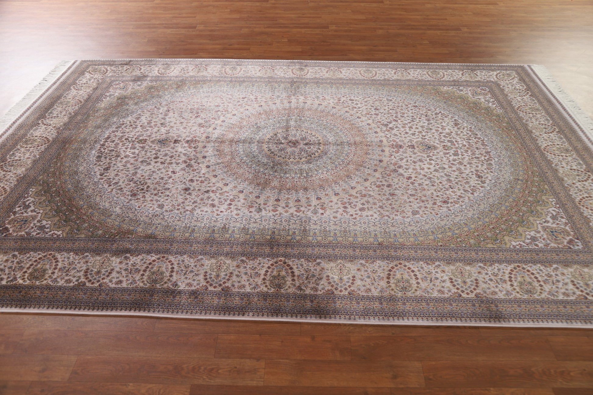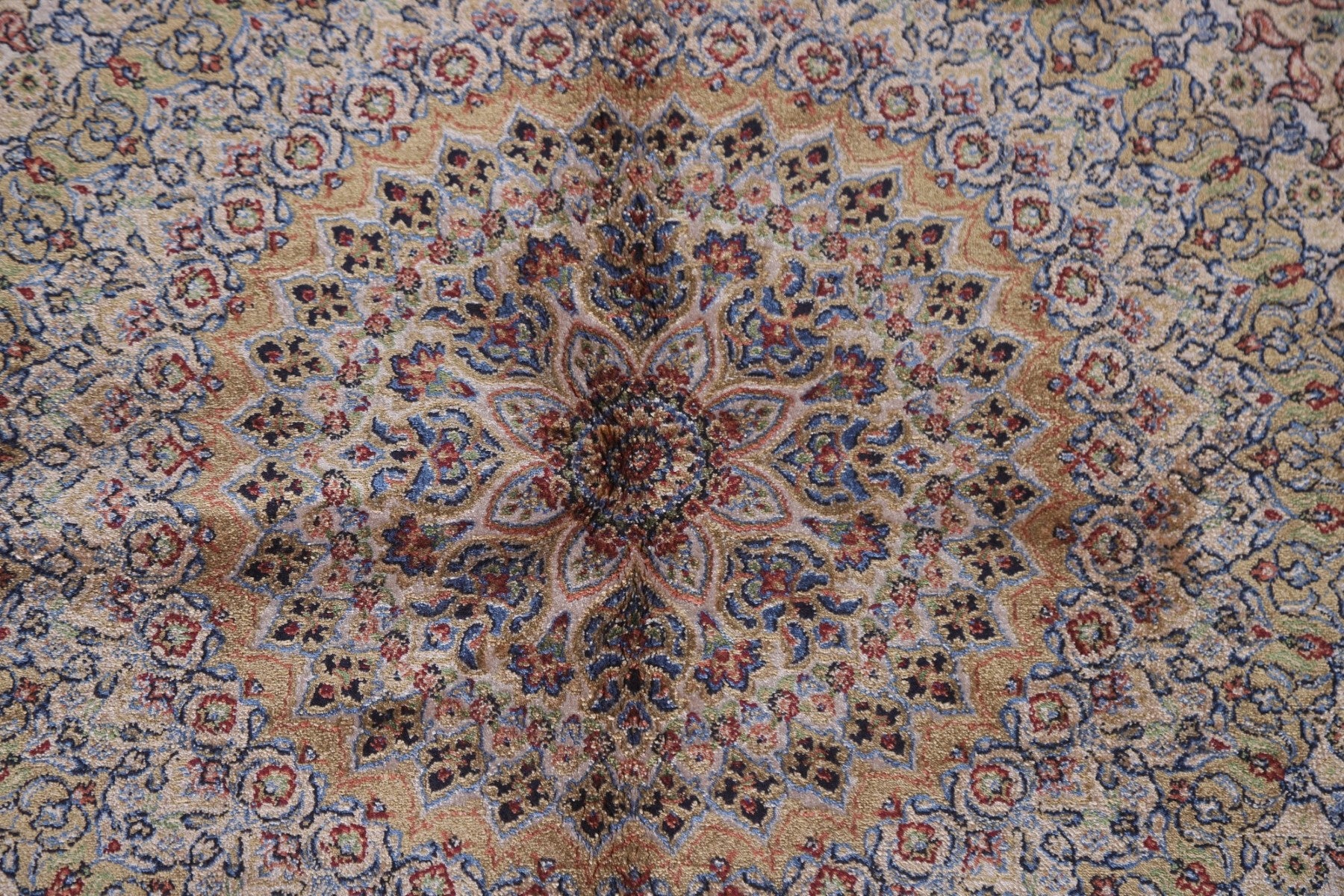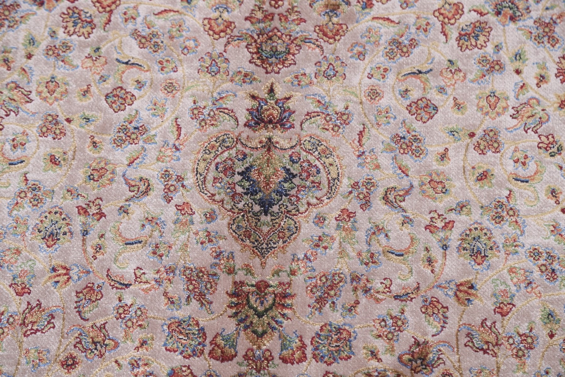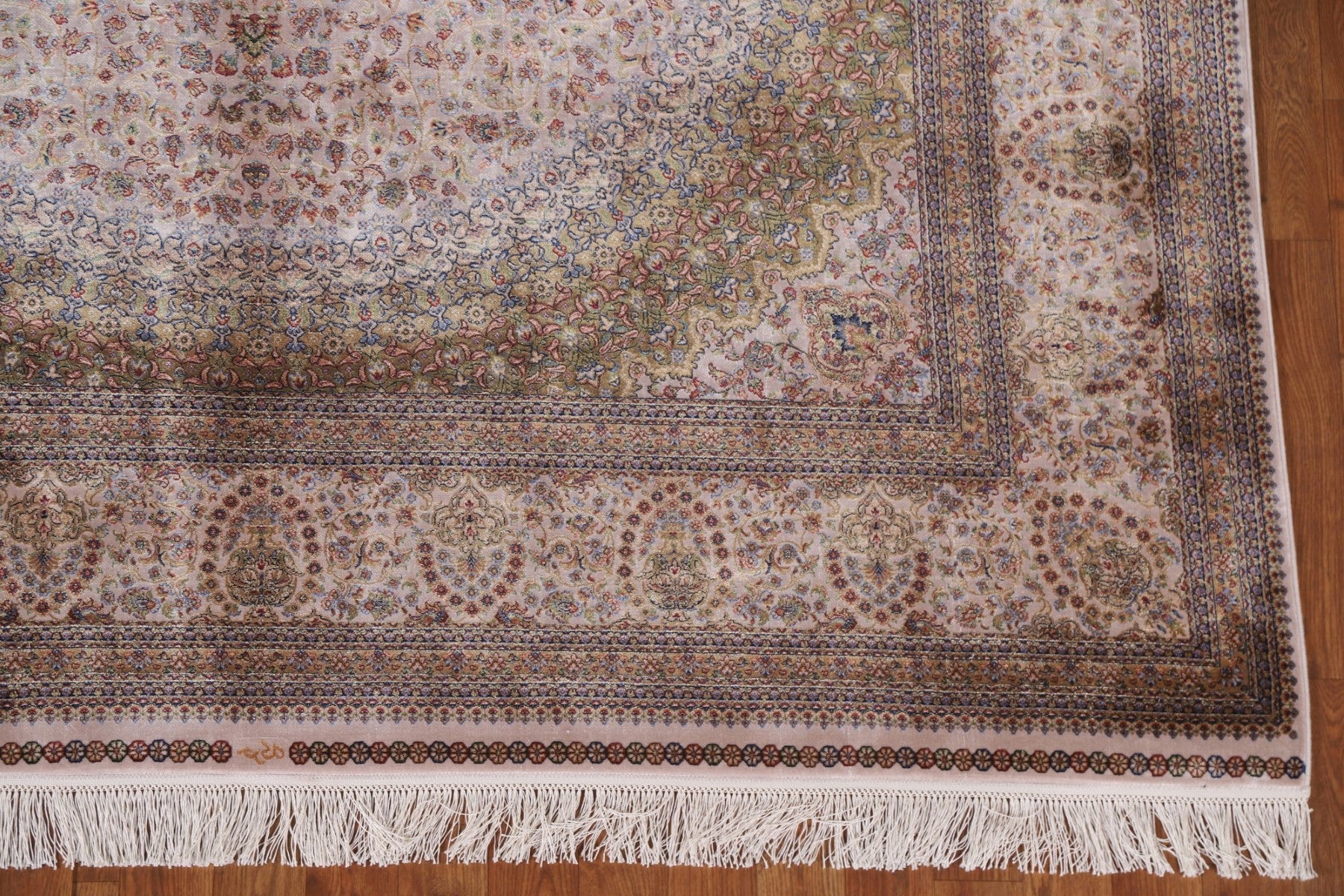 A Beautiful Genuine Turkey Qum rug is Machine Made by skillful weavers in Turkey with 90% Silk - 10% Polyester Material. This rug is in condition. dimensions are 9' 10'' X 6' 7'' in foot and 300 X 201 in centimeter. the primary color is Beige & Ivories.