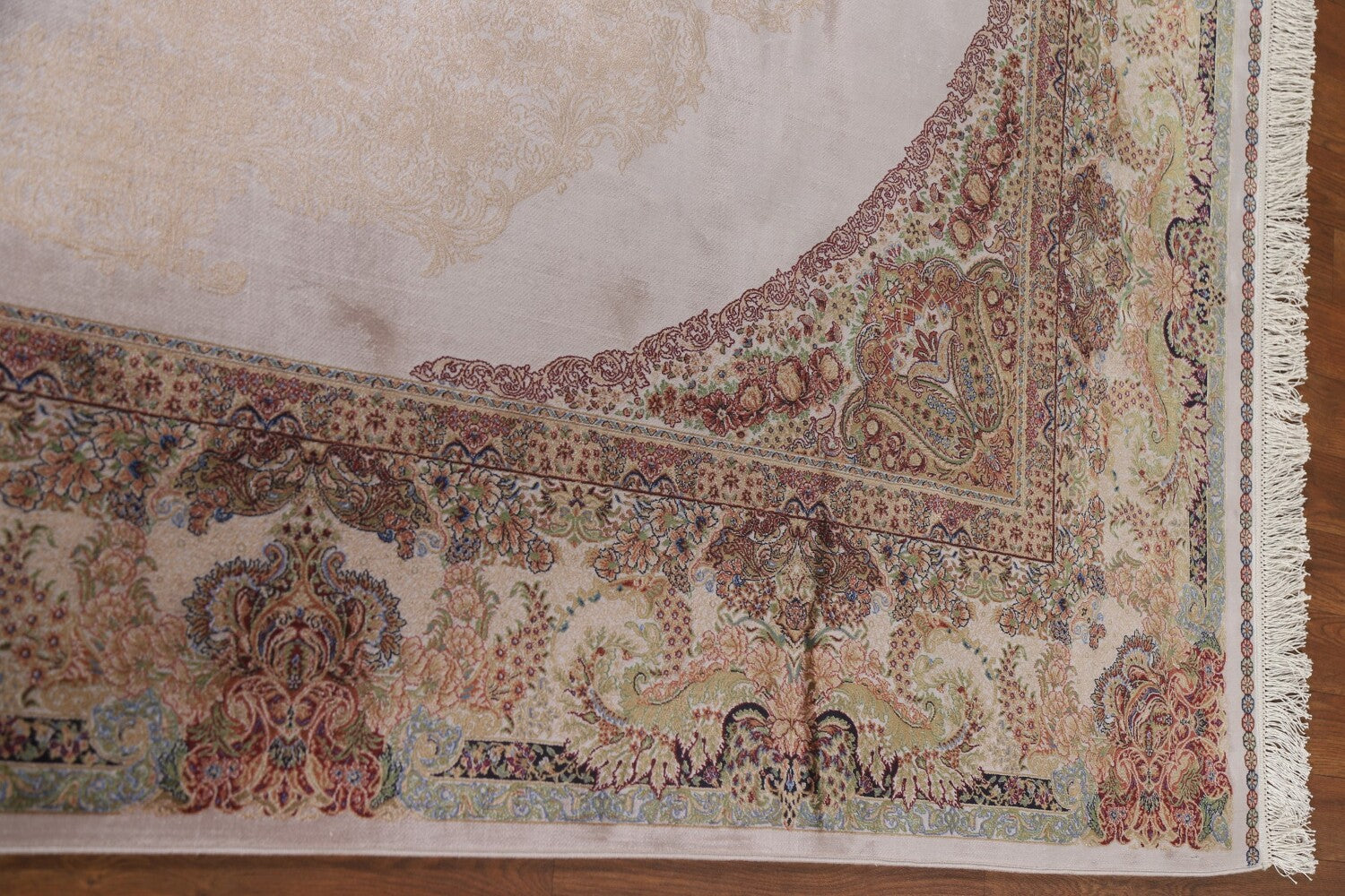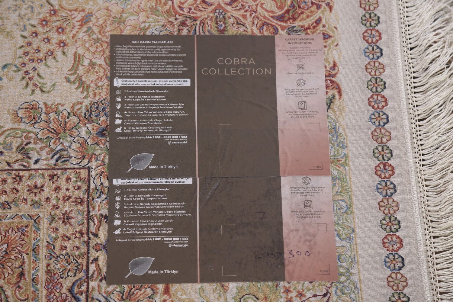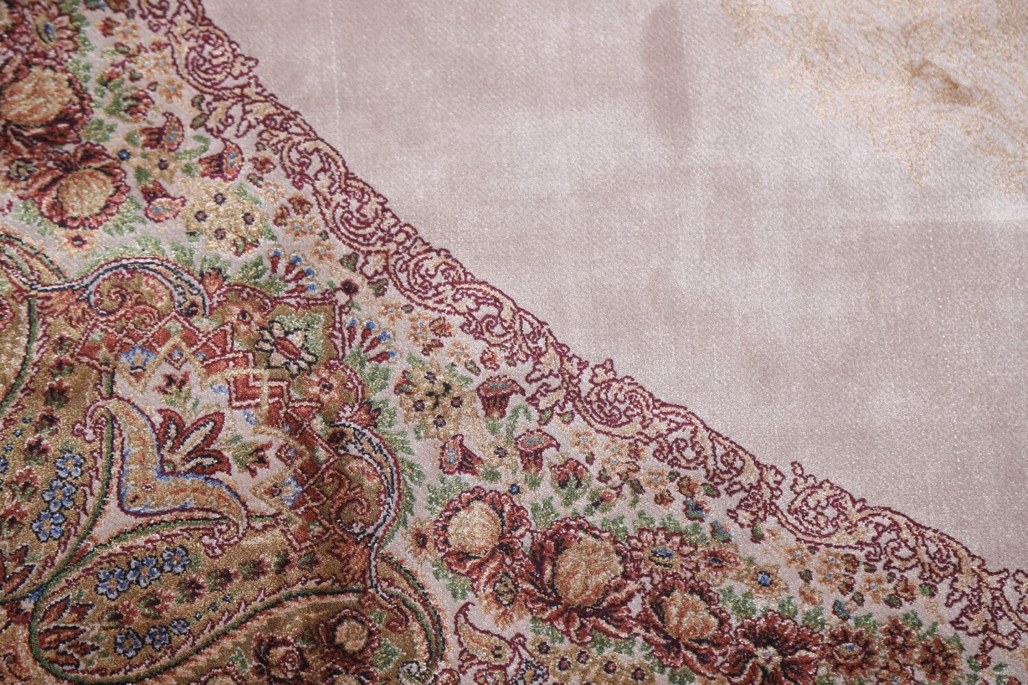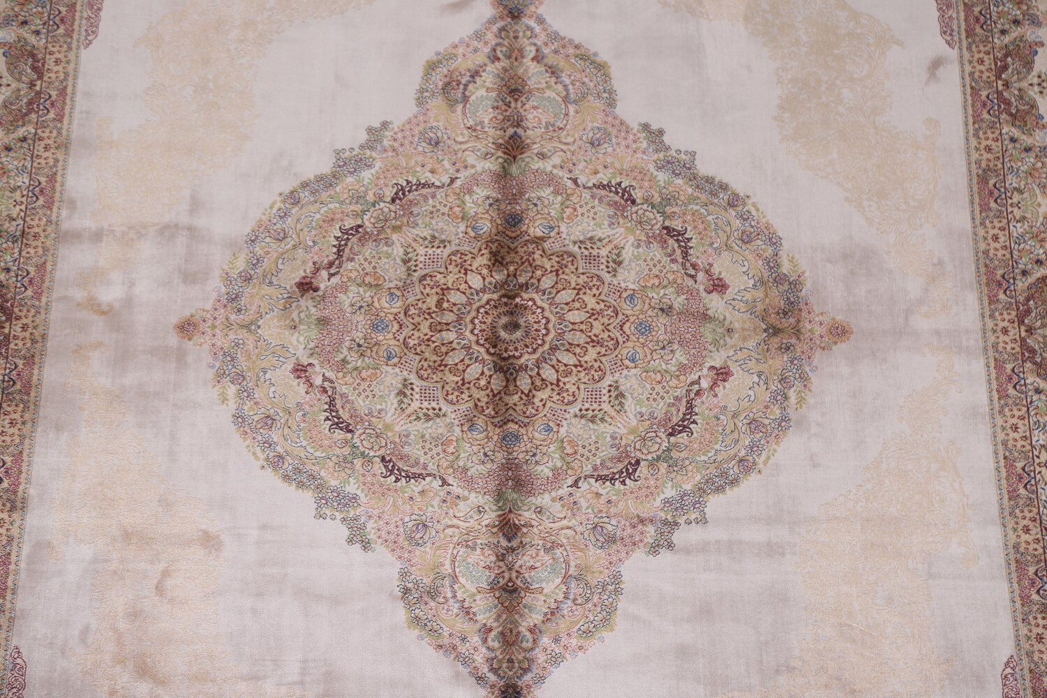 A Beautiful Genuine Turkey Qum rug is Machine Made by skillful weavers in Turkey with 90% Silk - 10% Polyester Material. This rug is in condition. dimensions are 9' 11'' X 6' 7'' in foot and 302 X 201 in centimeter. the primary color is Beige & Ivories.