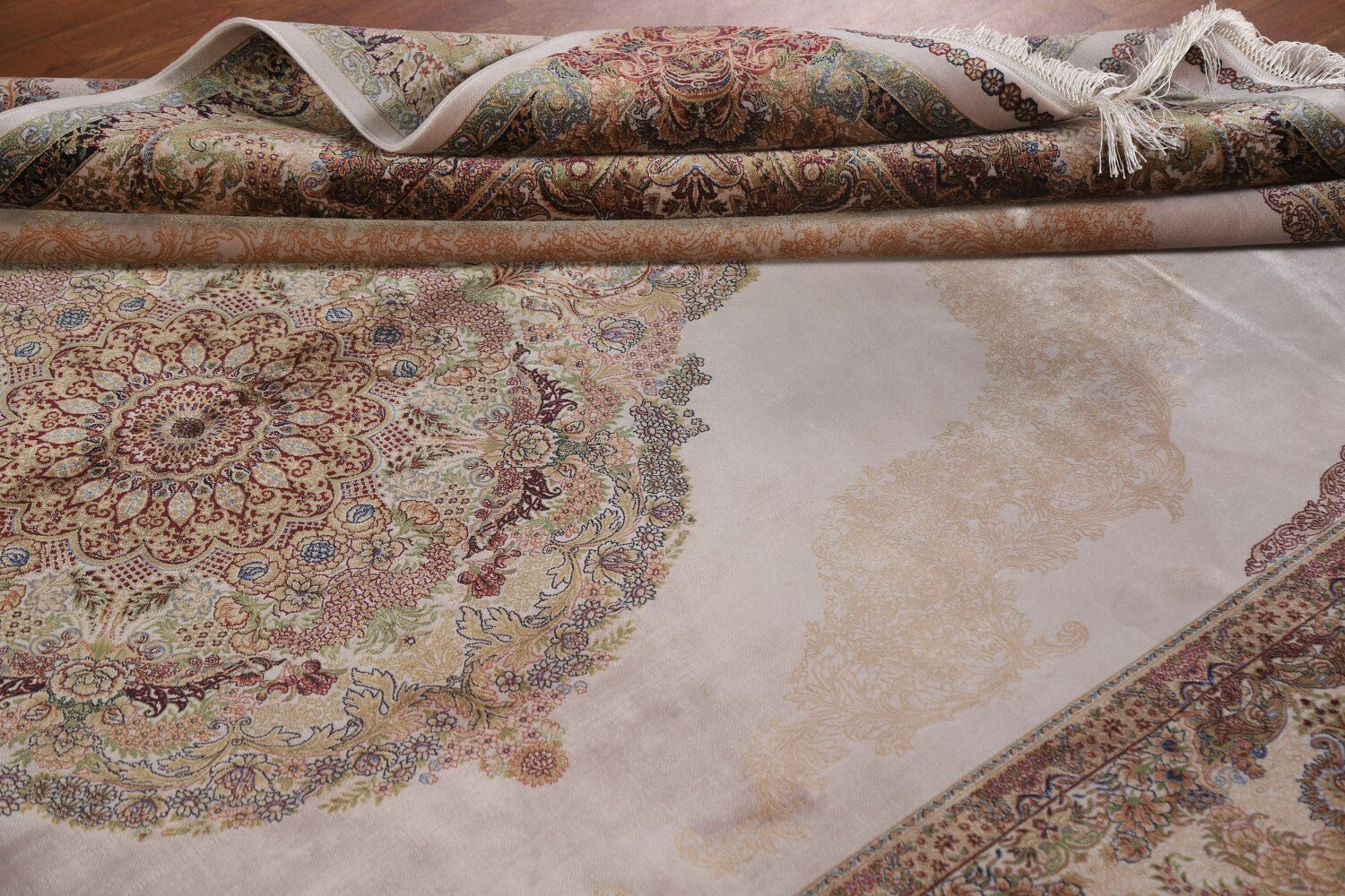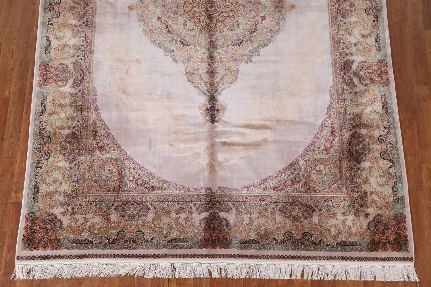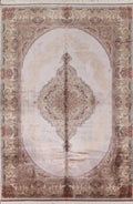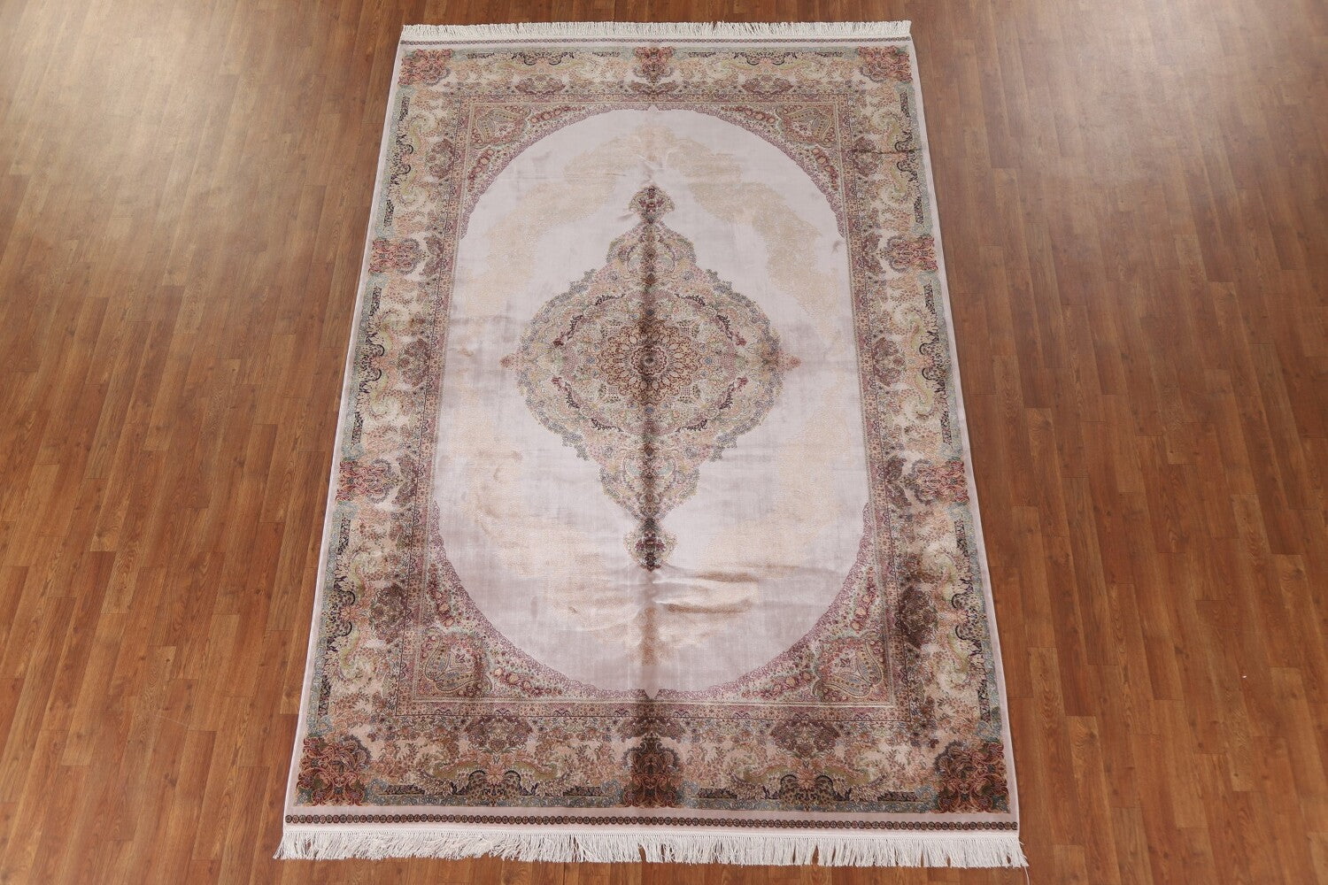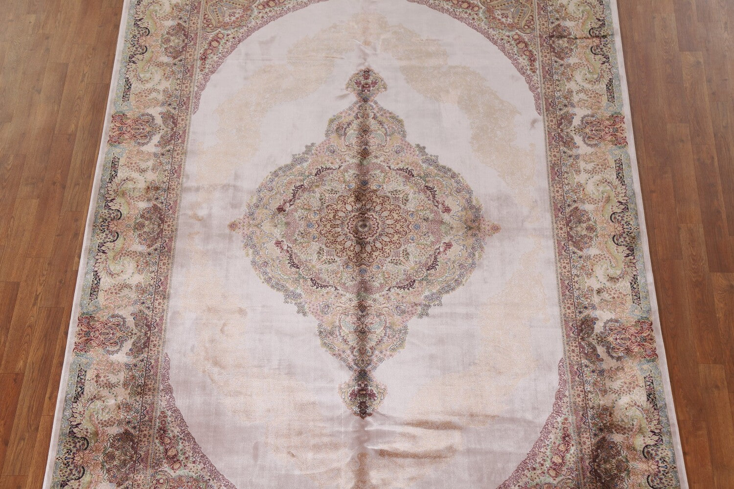A Beautiful Genuine Turkey Qum rug is Machine Made by skillful weavers in Turkey with 90% Silk - 10% Polyester Material. This rug is in condition. dimensions are 9' 11'' X 6' 7'' in foot and 302 X 201 in centimeter. the primary color is Beige & Ivories.