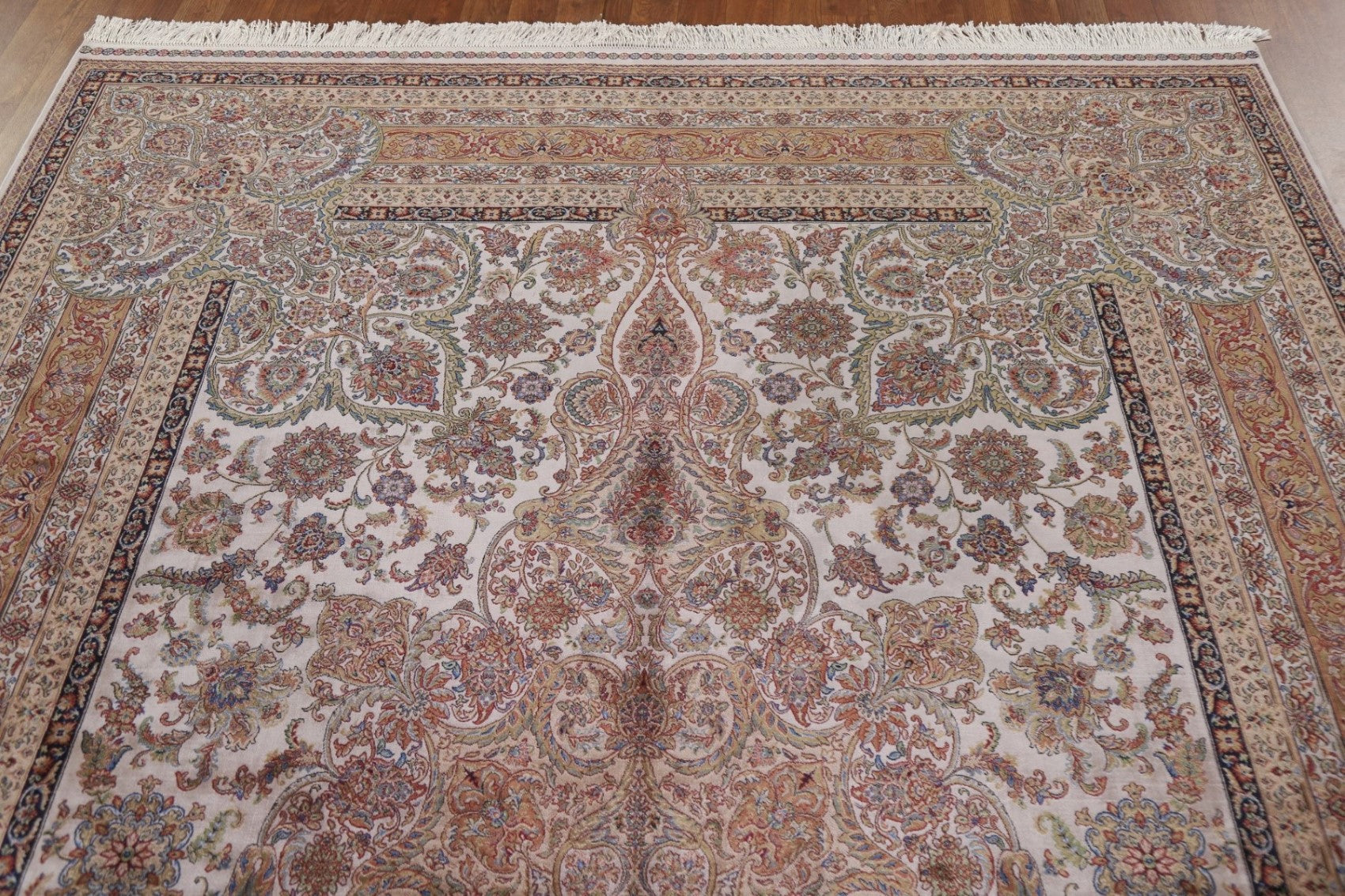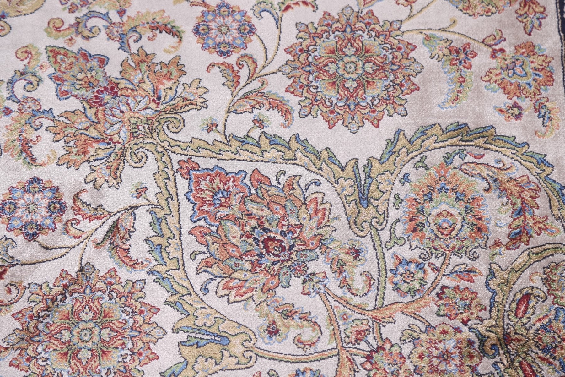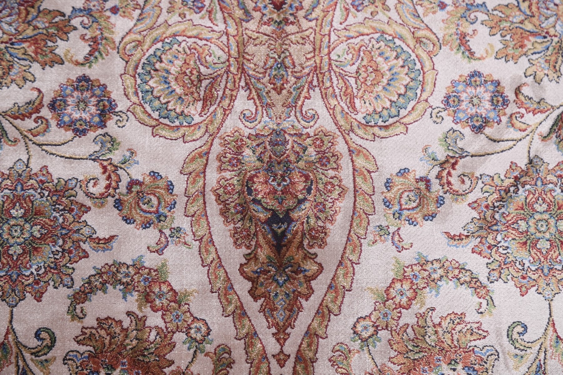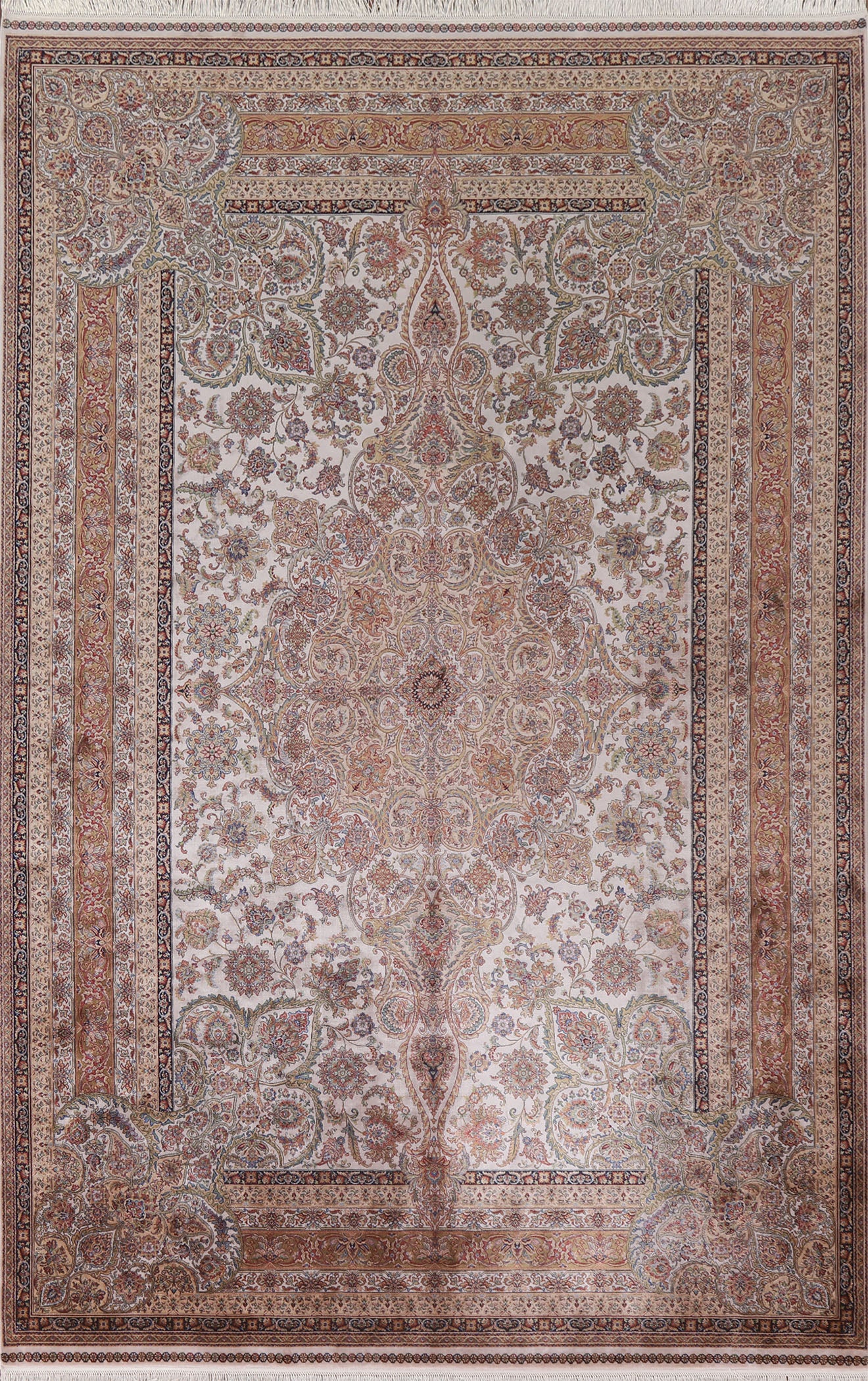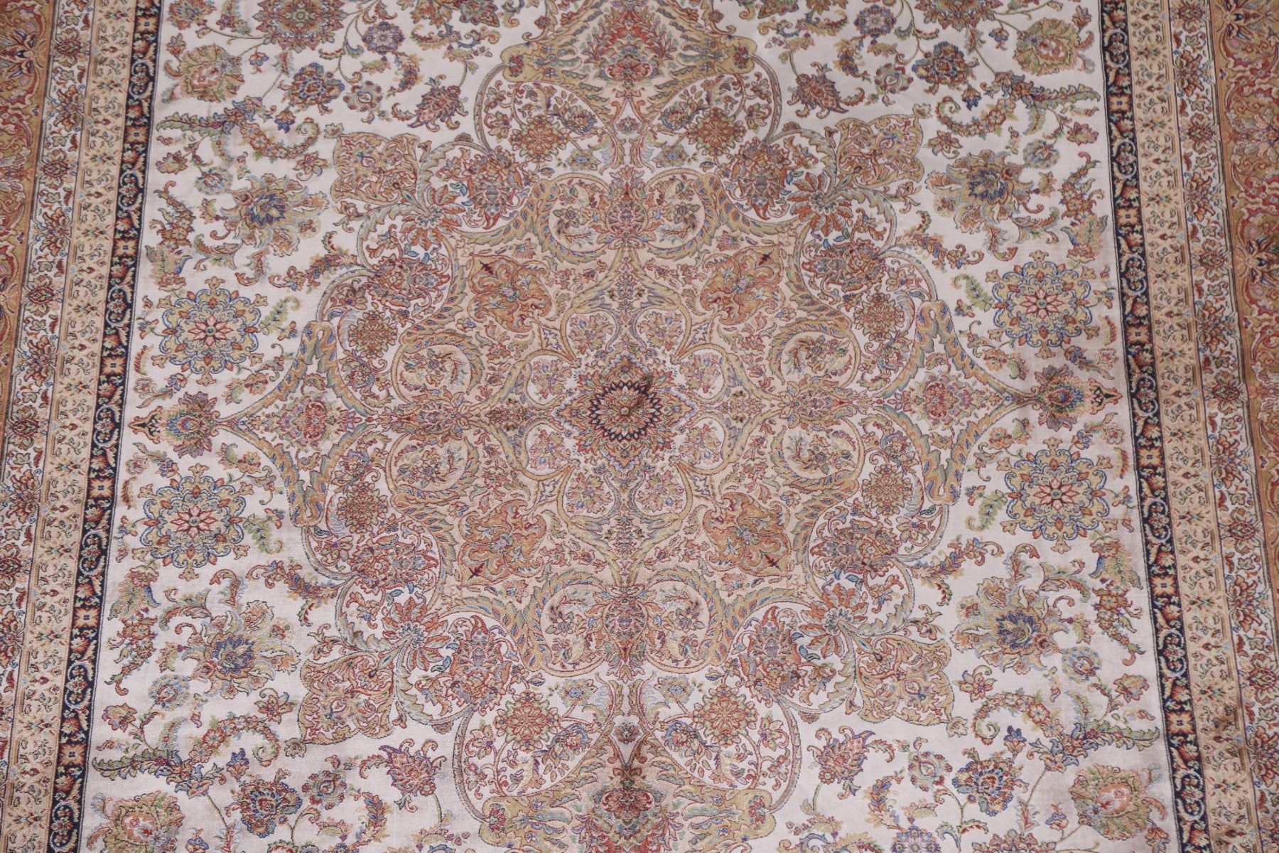 A Beautiful Genuine Turkey Qum rug is Machine Made by skillful weavers in Turkey with 90% Silk - 10% Polyester Material. This rug is in condition. dimensions are 10' 1'' X 6' 7'' in foot and 307 X 201 in centimeter. the primary color is Beige & Ivories.
