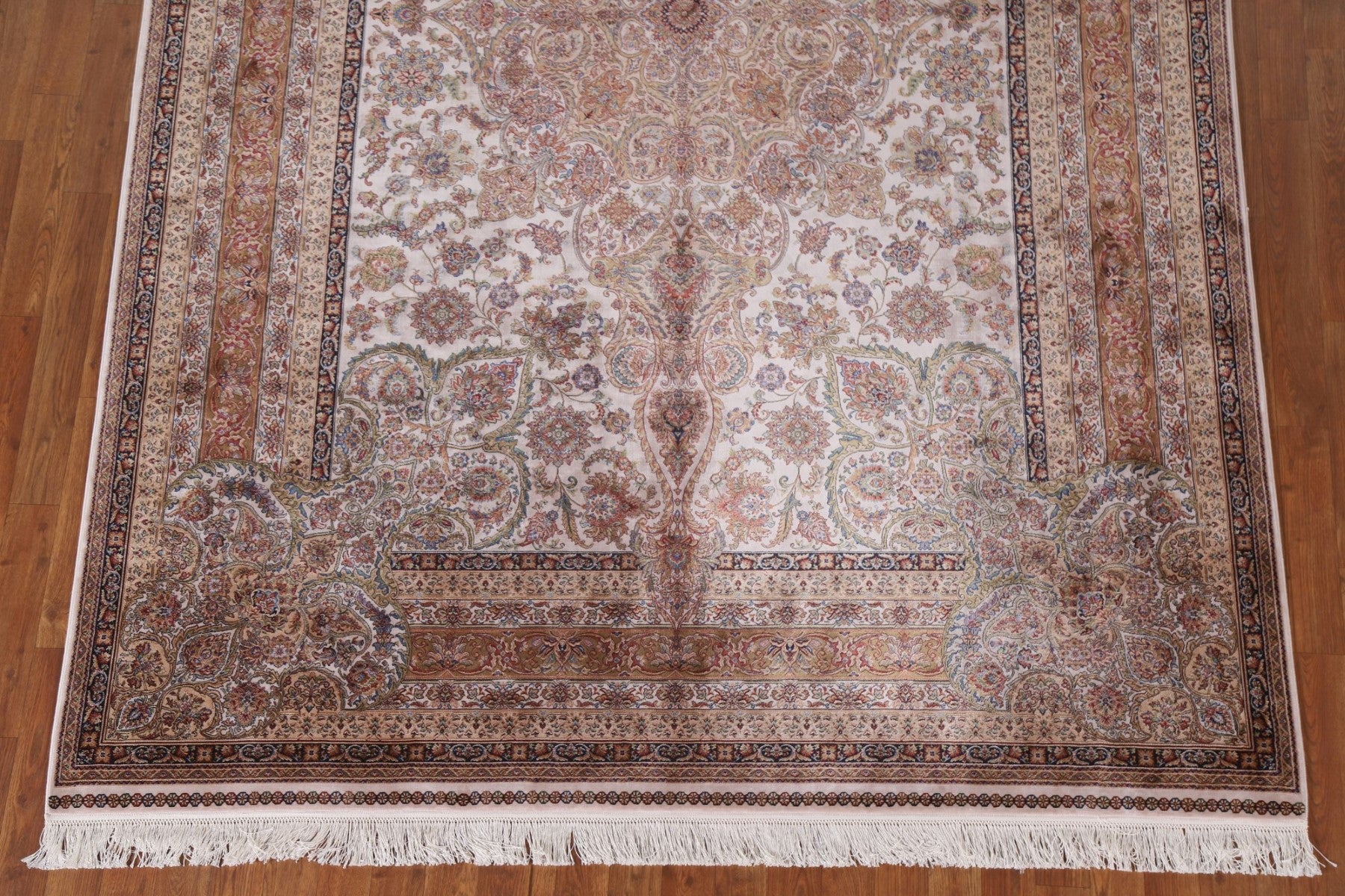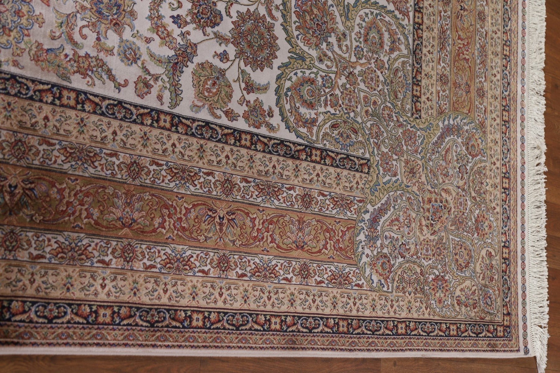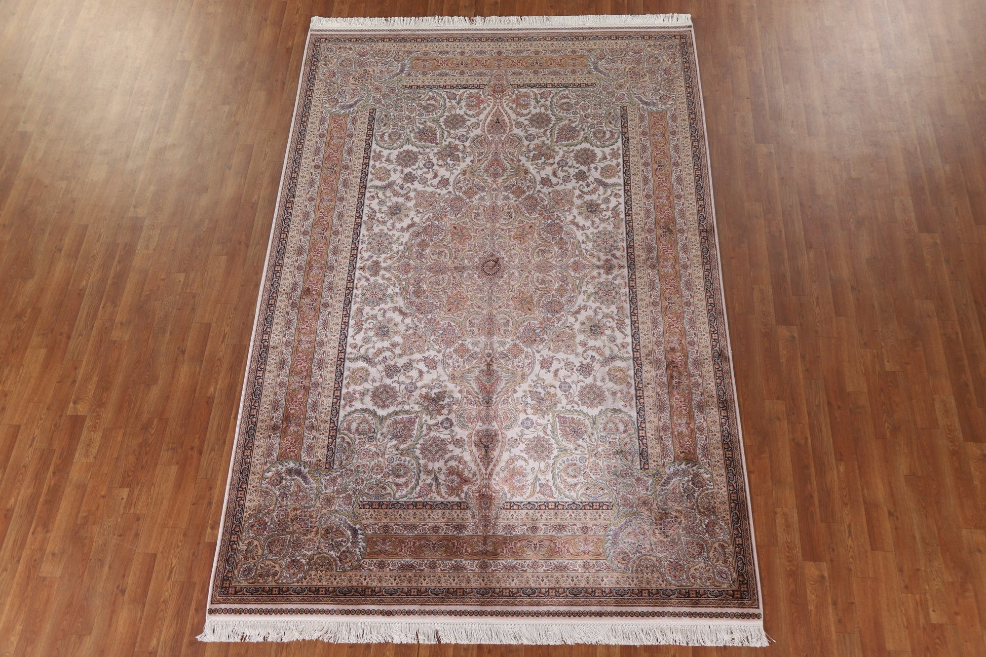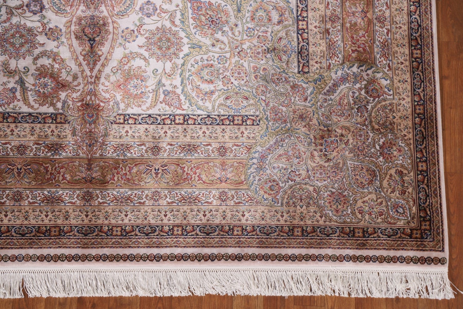 A Beautiful Genuine Turkey Qum rug is Machine Made by skillful weavers in Turkey with 90% Silk - 10% Polyester Material. This rug is in condition. dimensions are 10' 1'' X 6' 7'' in foot and 307 X 201 in centimeter. the primary color is Beige & Ivories.