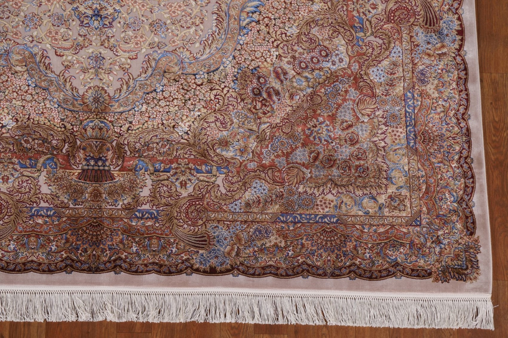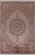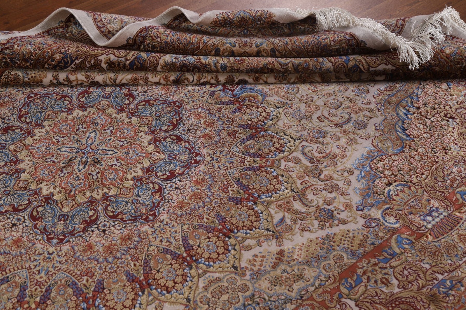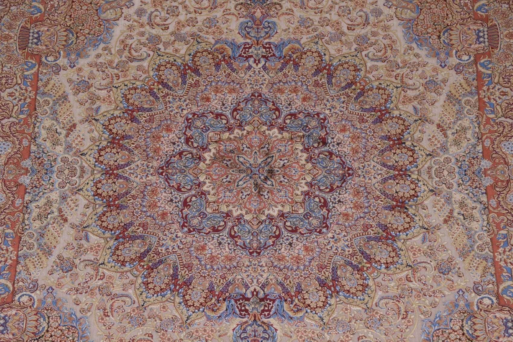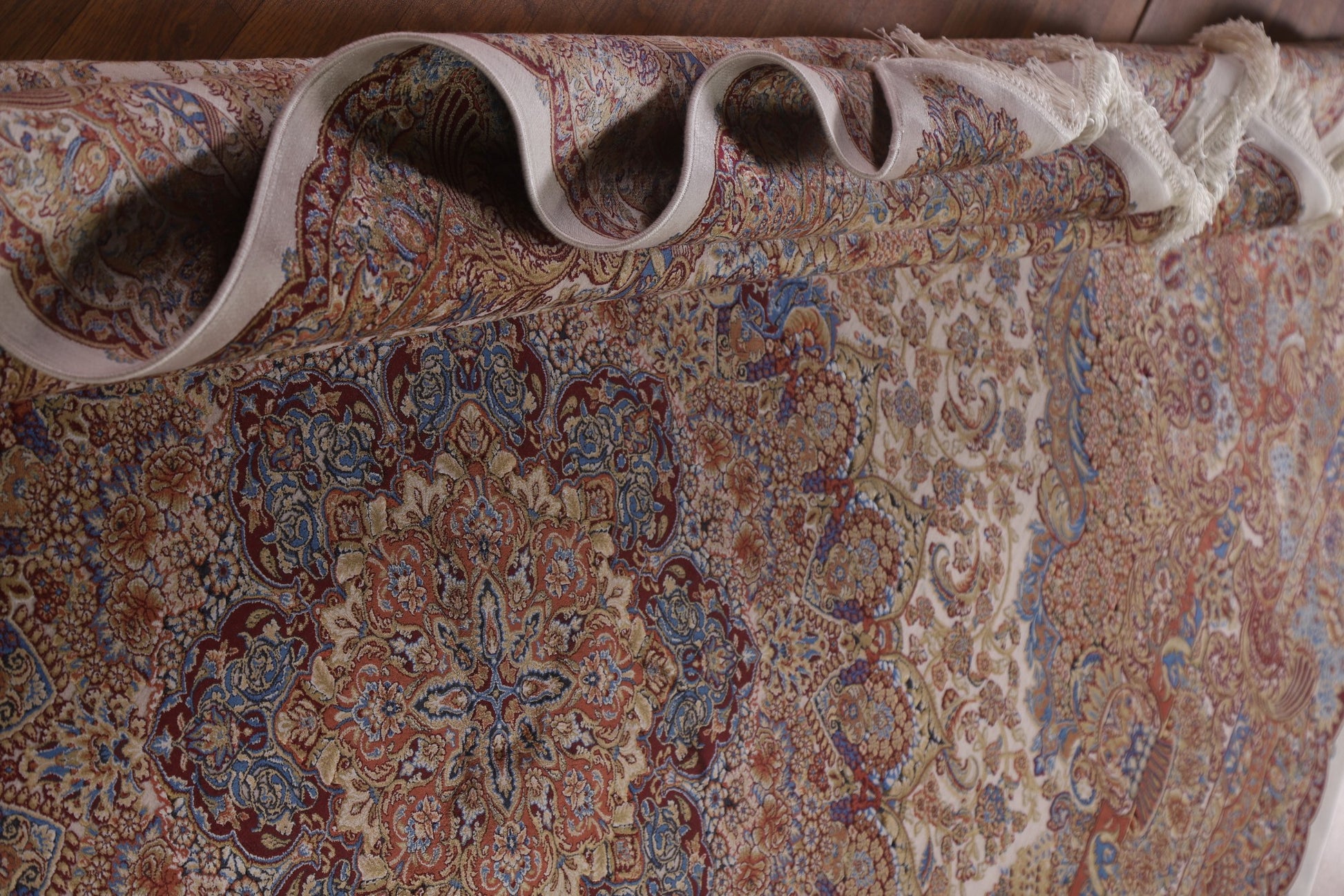A Beautiful Genuine Turkey Qum rug is Machine Made by skillful weavers in Turkey with 90% Silk - 10% Polyester Material. This rug is in condition. dimensions are 9' 8'' X 6' 6'' in foot and 295 X 198 in centimeter. the primary color is Beige & Ivories.
